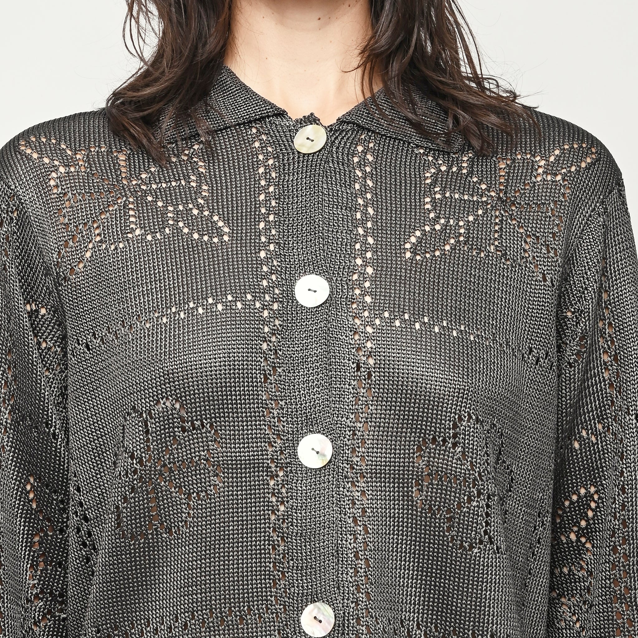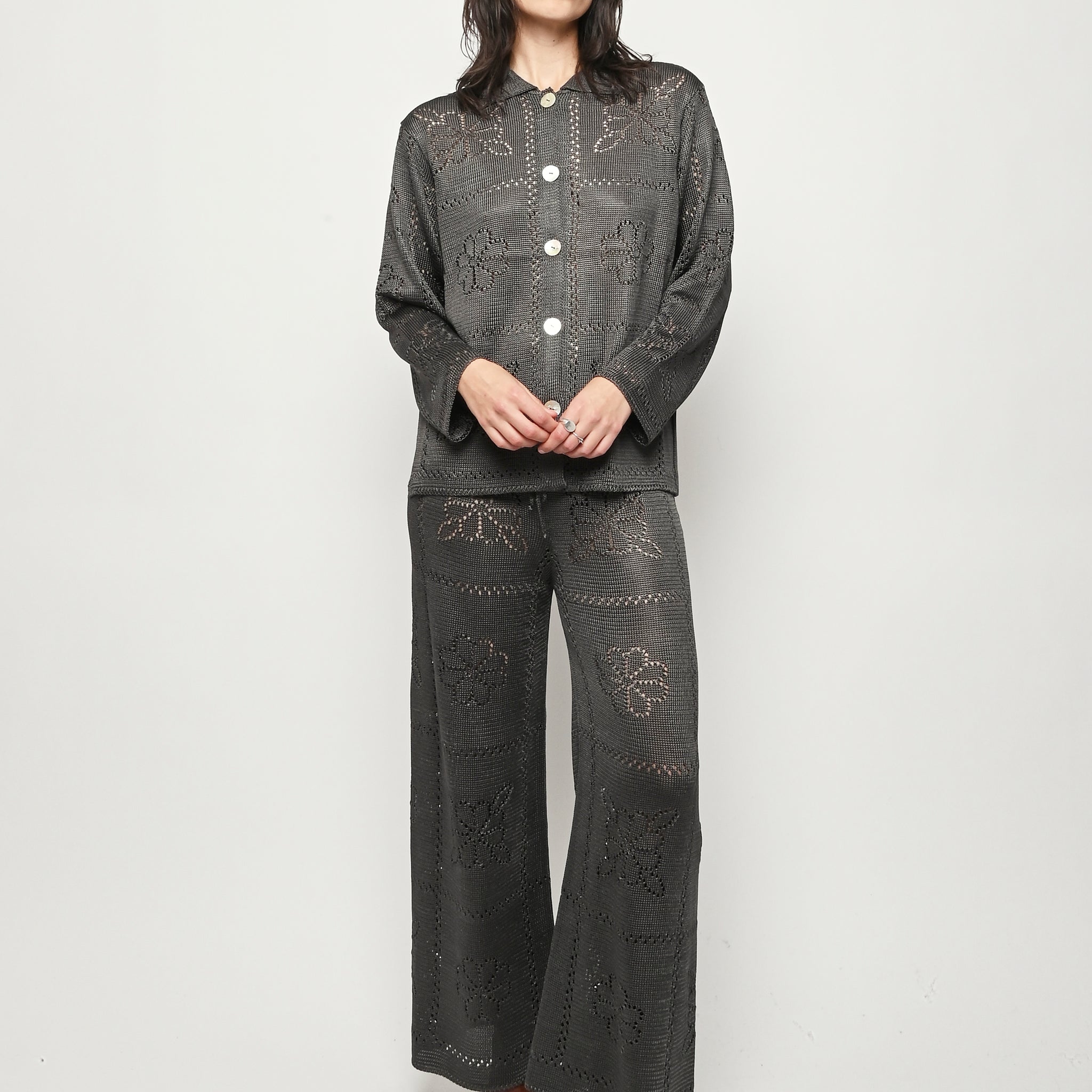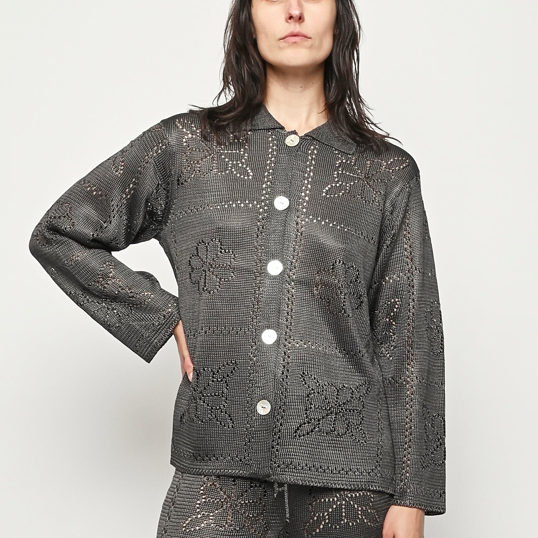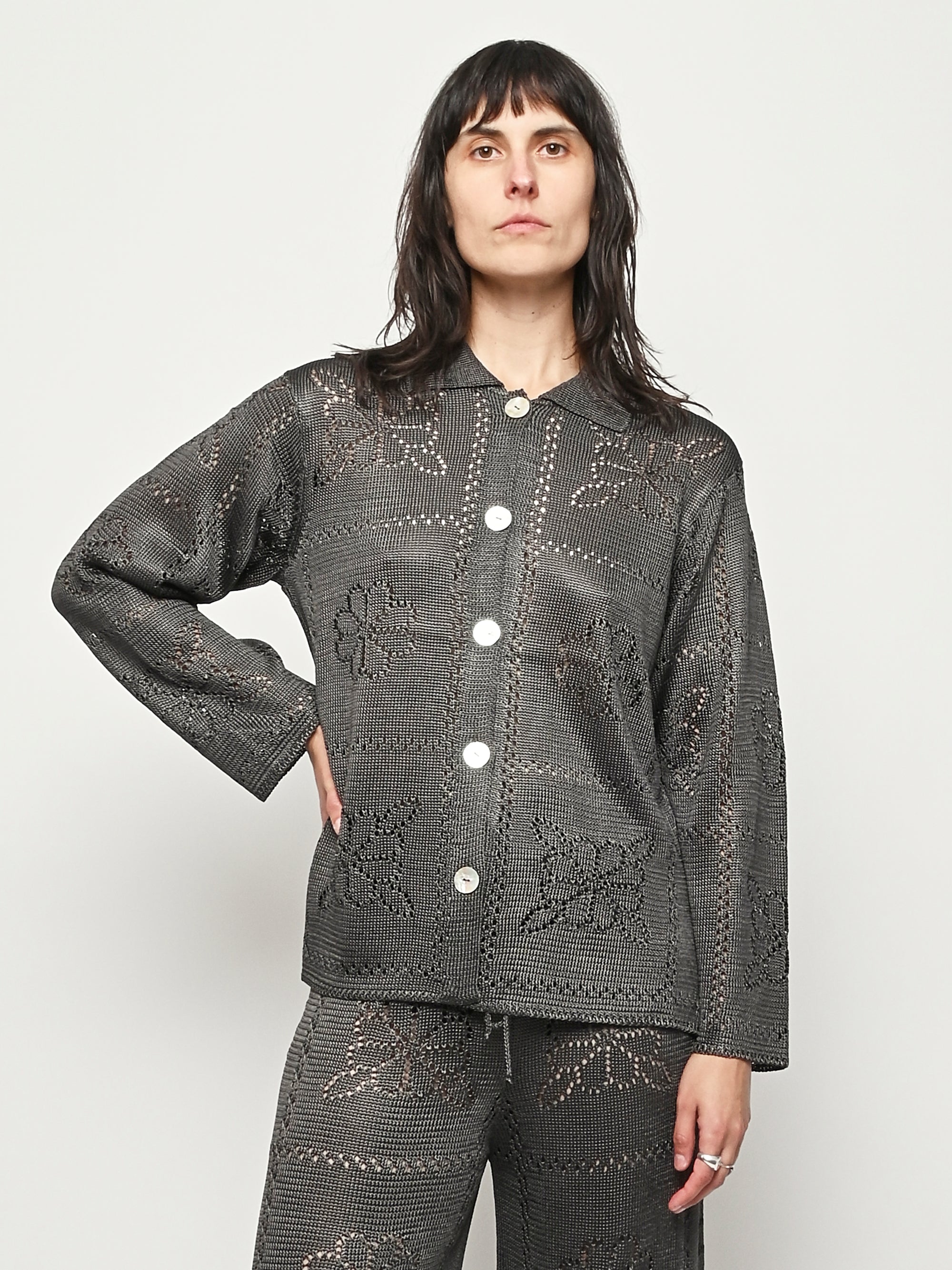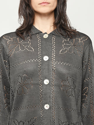 Calle Del Mar's Floral Tile Long Sleeve Shirt is crafted with an intricate pointelle stitch in their signature yarn, featuring floral tile motifs inspired by heirloom crochet tablecloths made by founder Aza’s great-grandmother—adding a touch of nostalgia and charm. Complete with a classic pointed collar, center front placket, and iridescent shell buttons, it offers a polished yet romantic look.