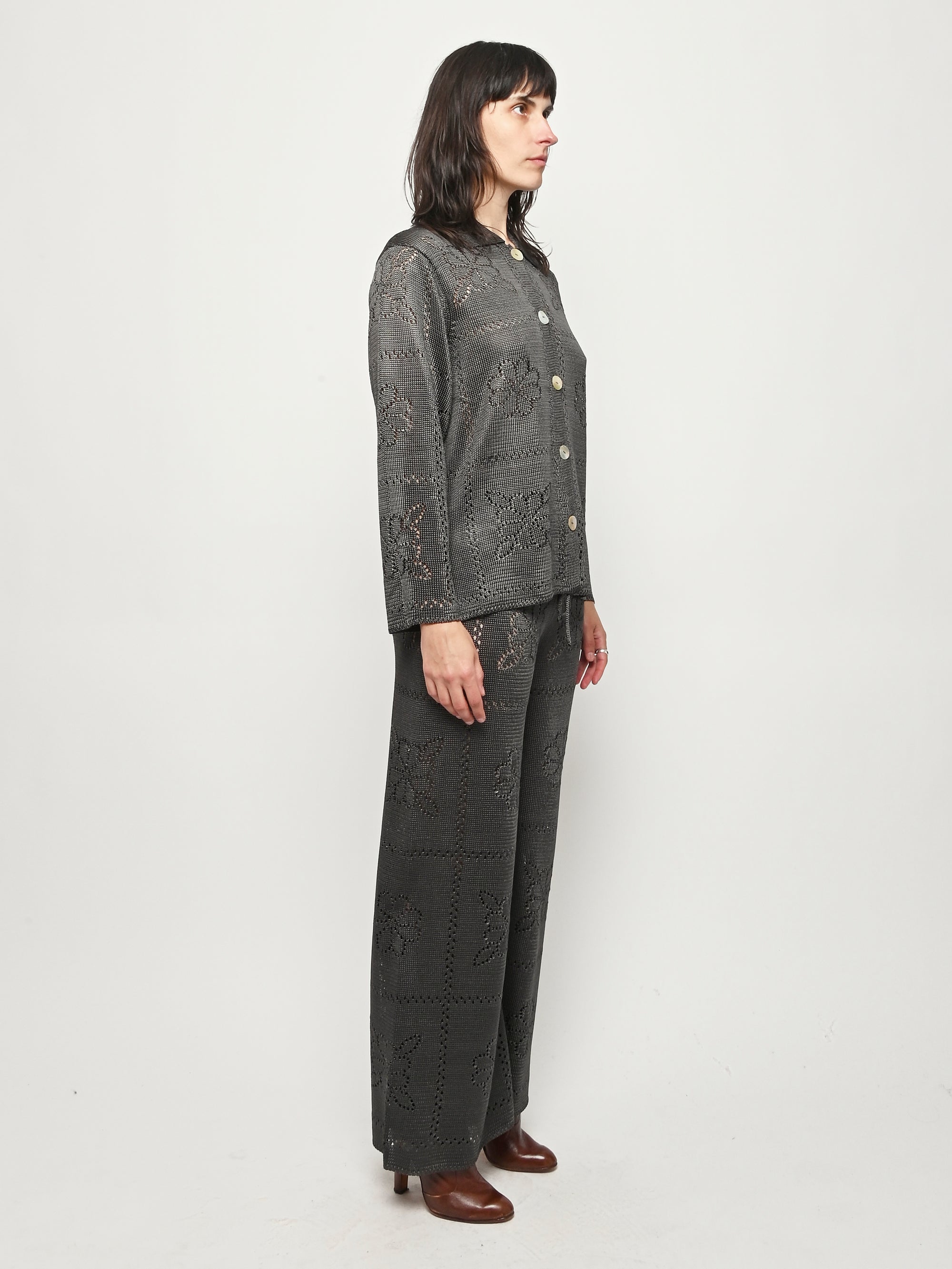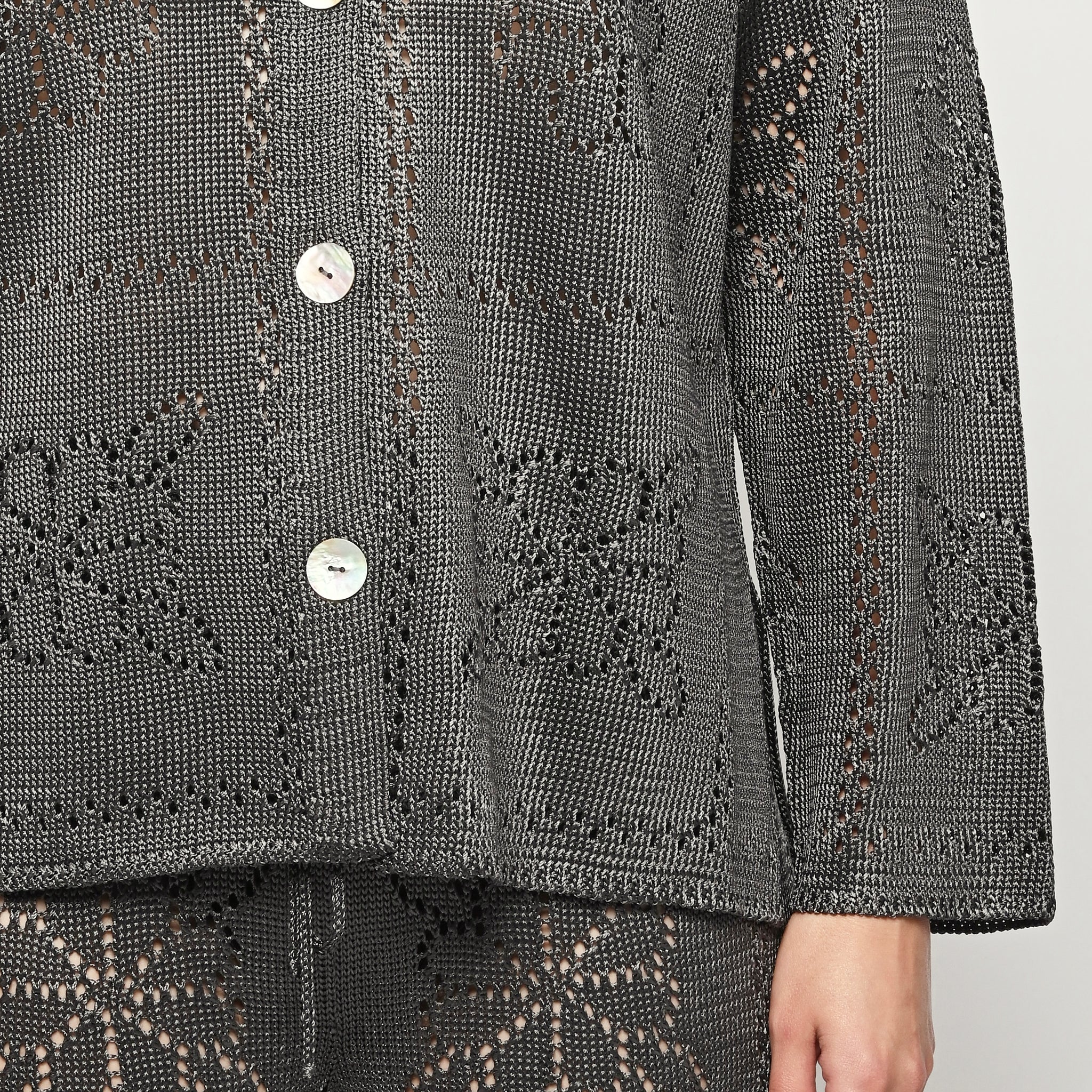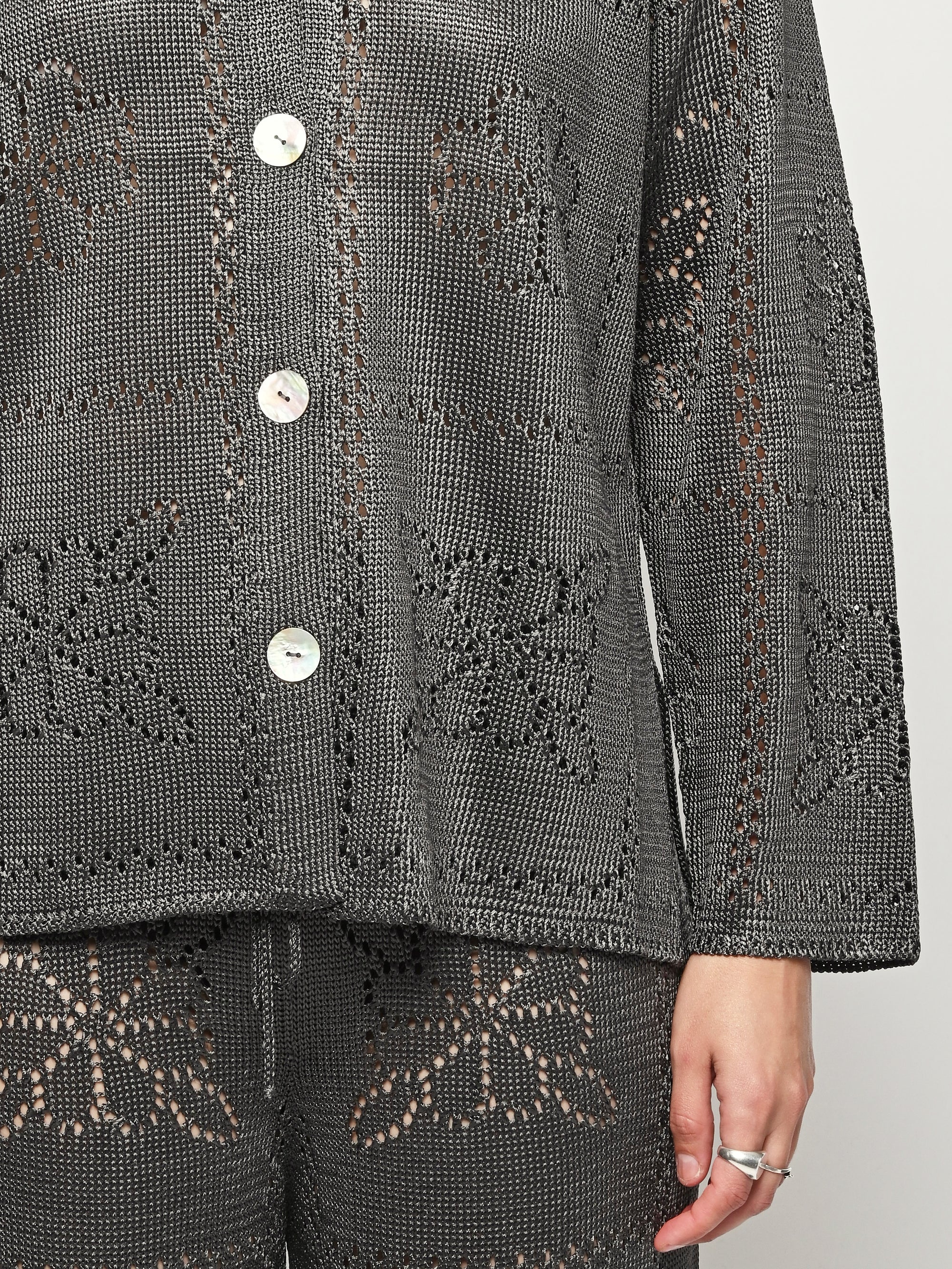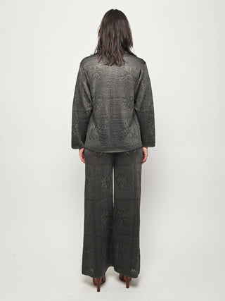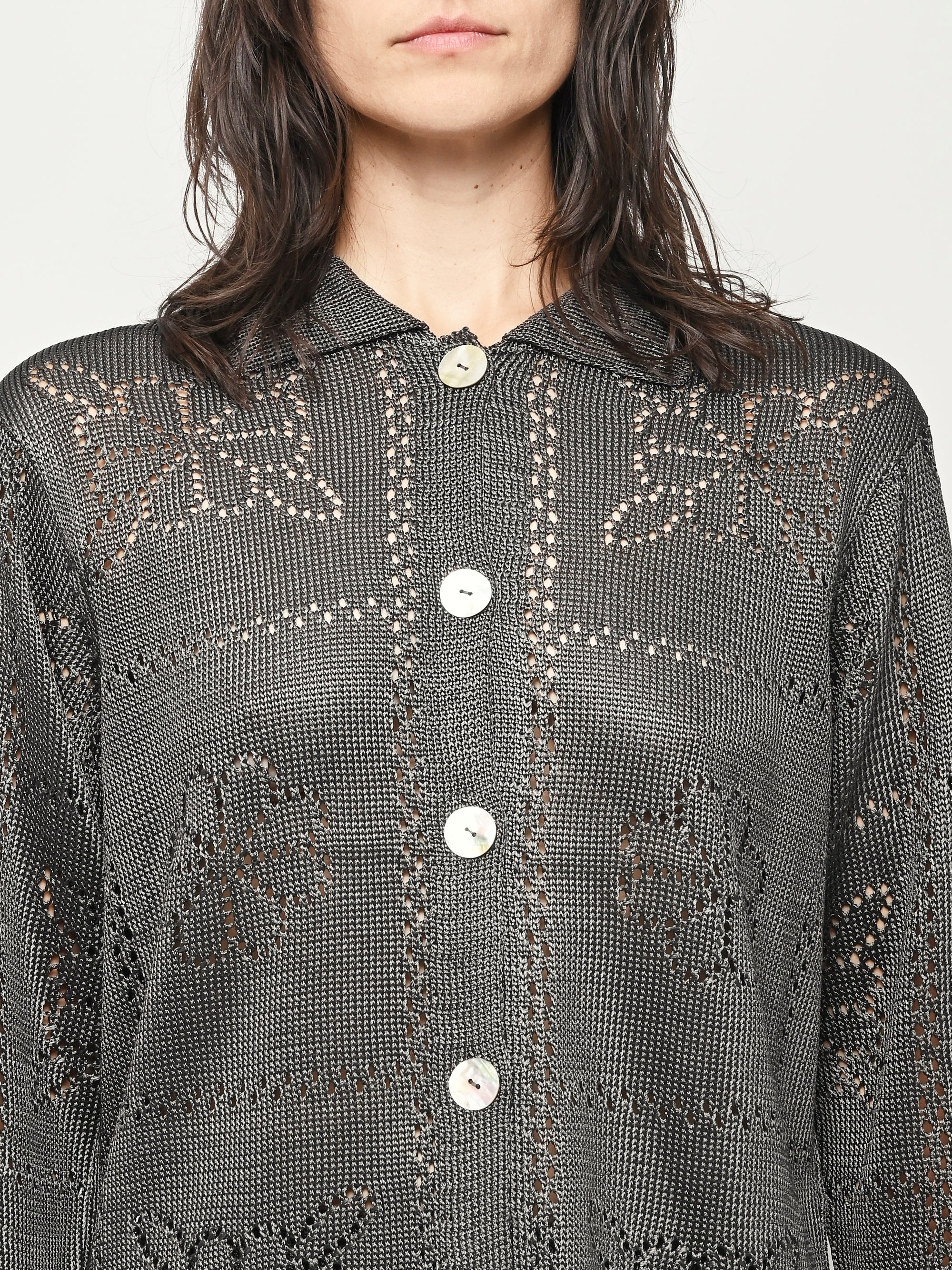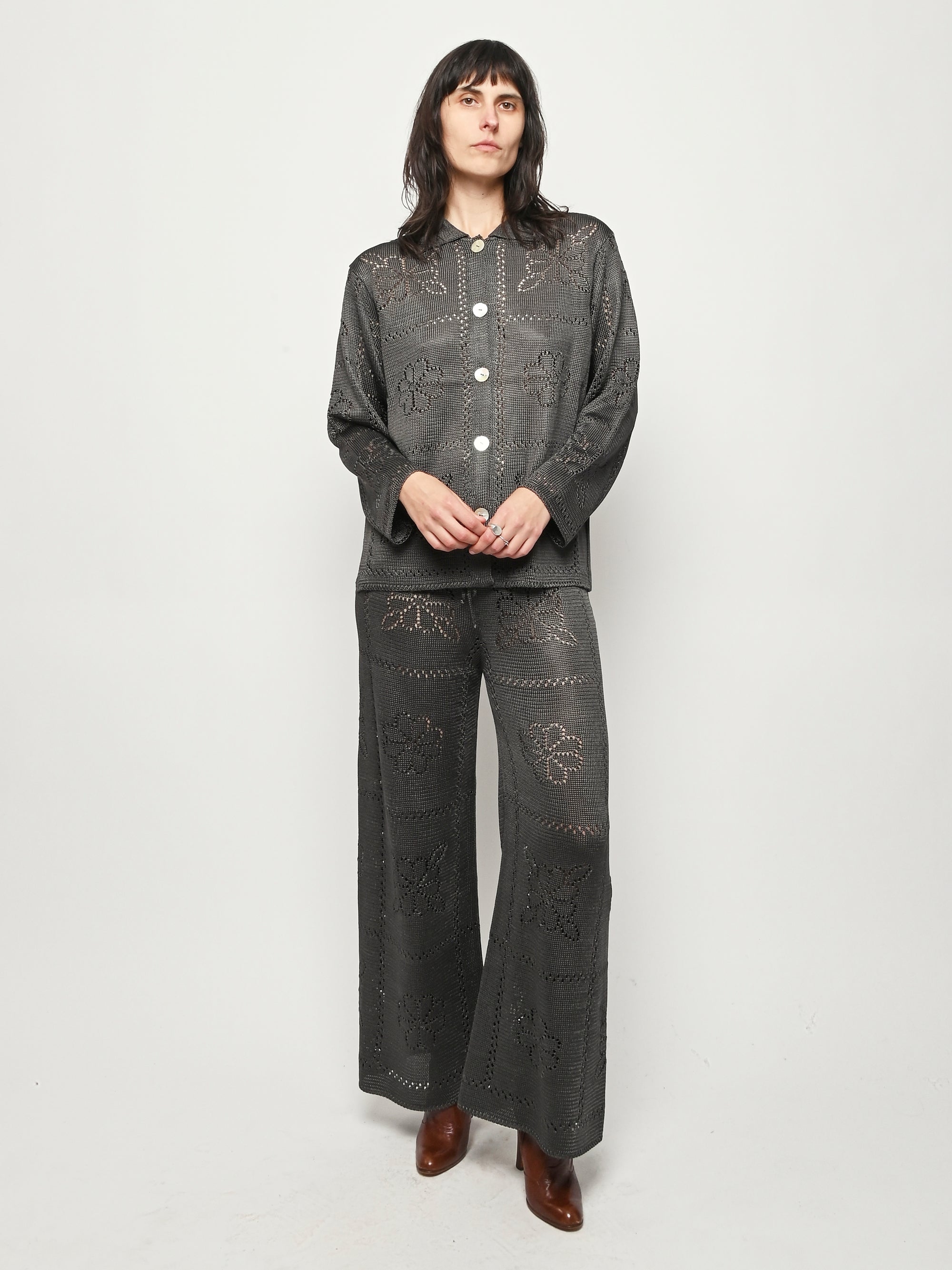 Calle Del Mar's Floral Tile Long Sleeve Shirt is crafted with an intricate pointelle stitch in their signature yarn, featuring floral tile motifs inspired by heirloom crochet tablecloths made by founder Aza’s great-grandmother—adding a touch of nostalgia and charm. Complete with a classic pointed collar, center front placket, and iridescent shell buttons, it offers a polished yet romantic look.