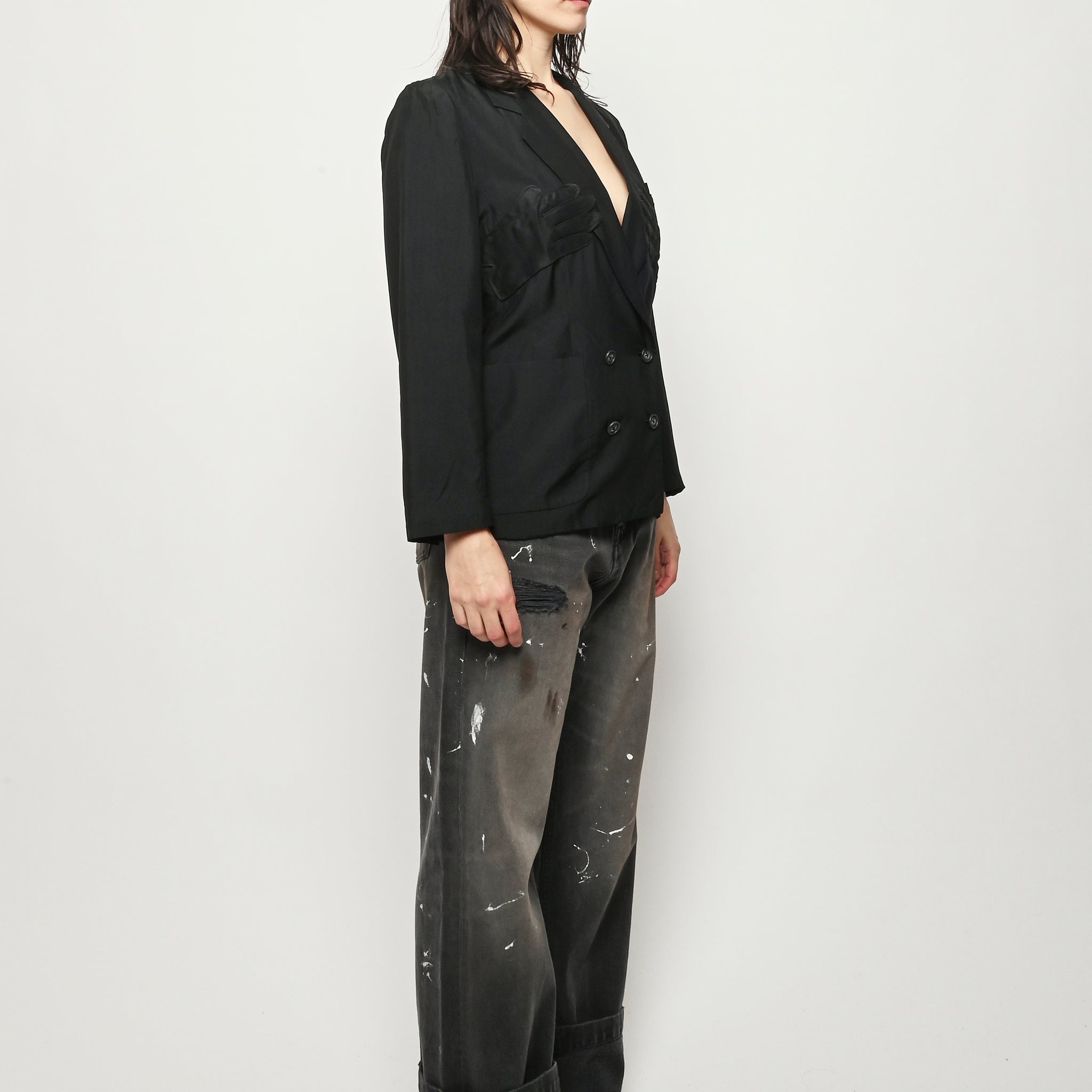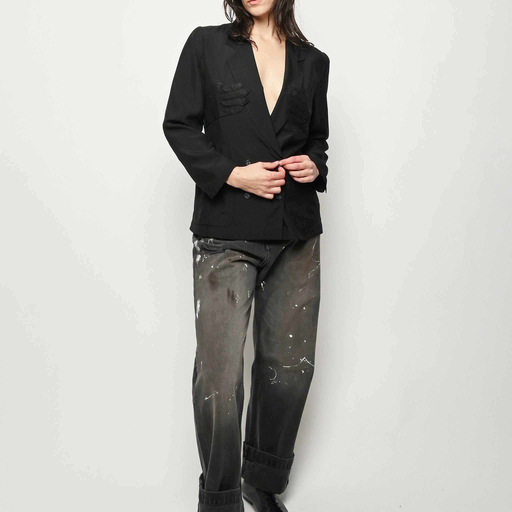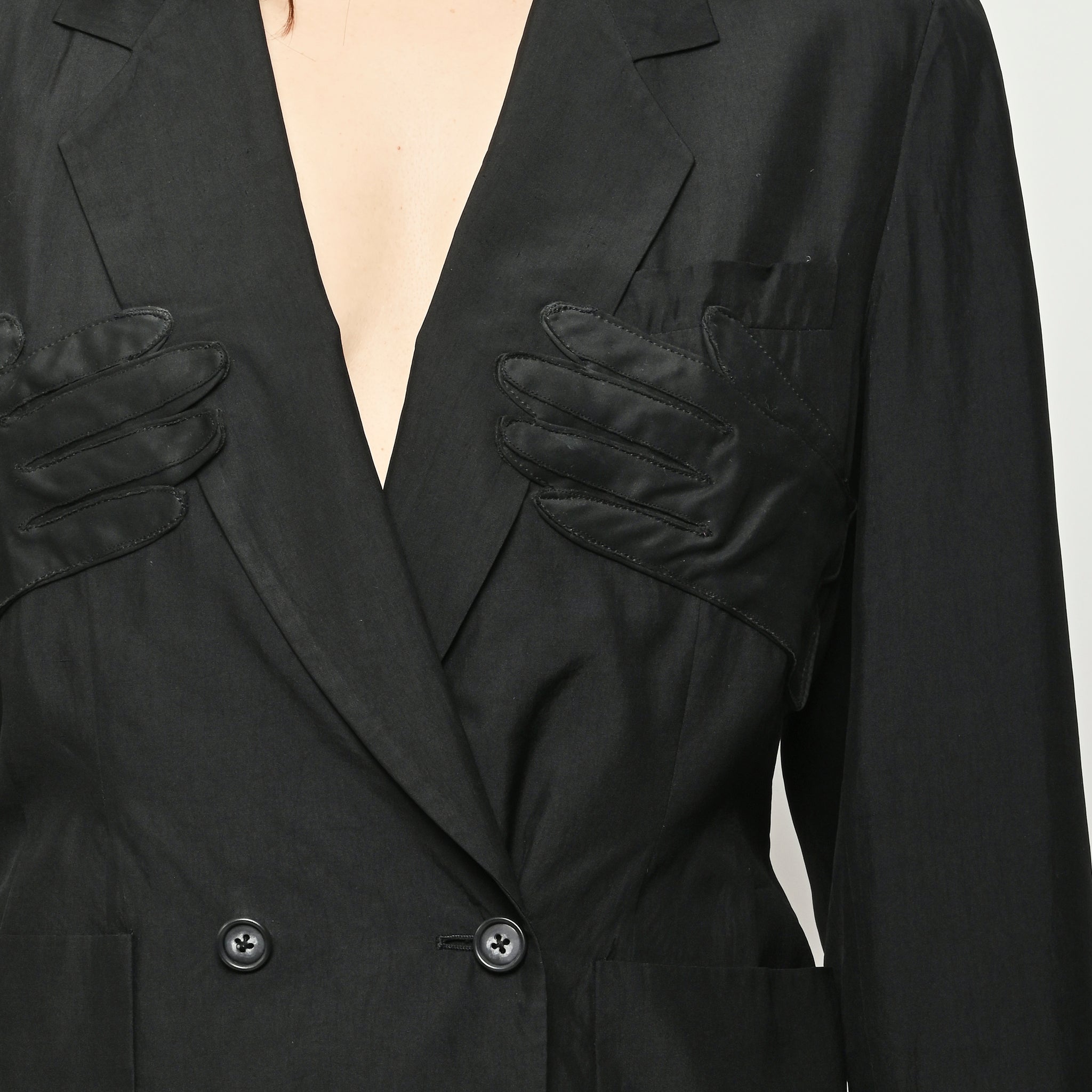 Black re-worked silk, double breasted blazer with tonal black gloves detail at the bust. By local artist/designer, Laurs Kemp.