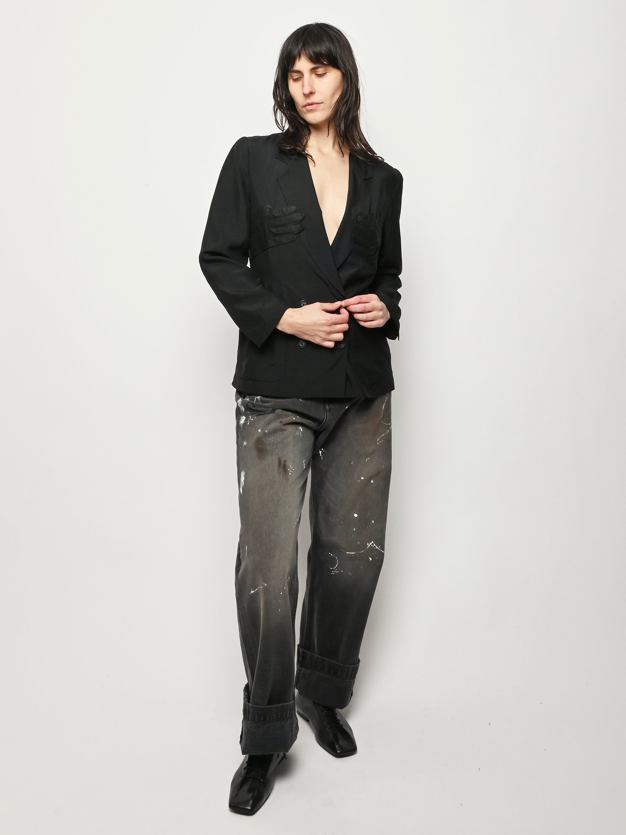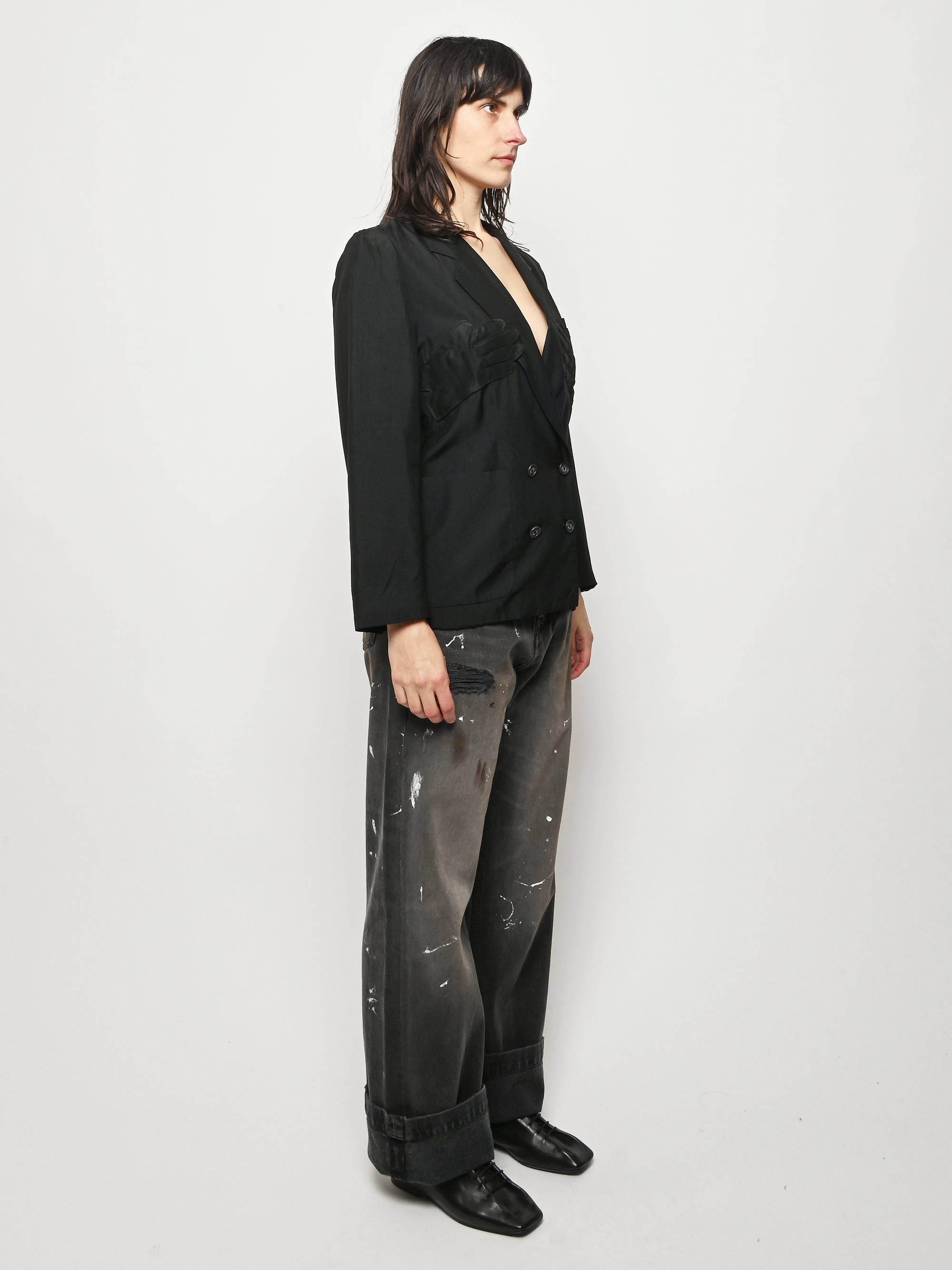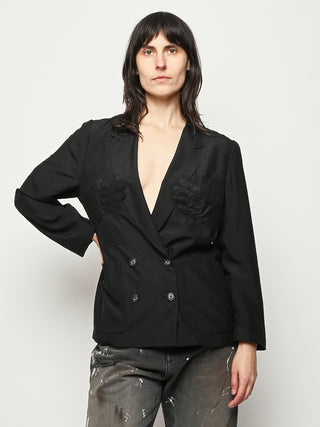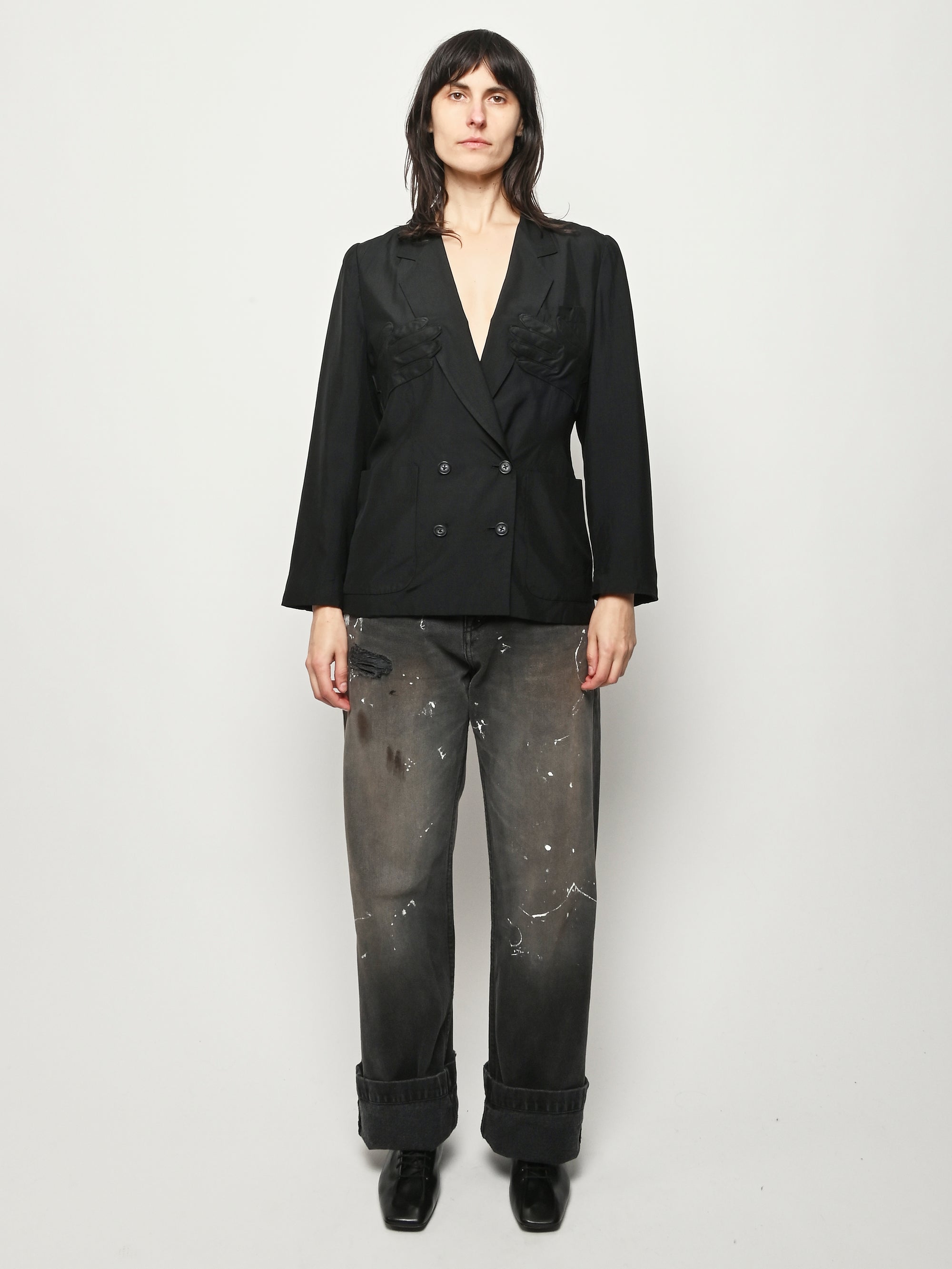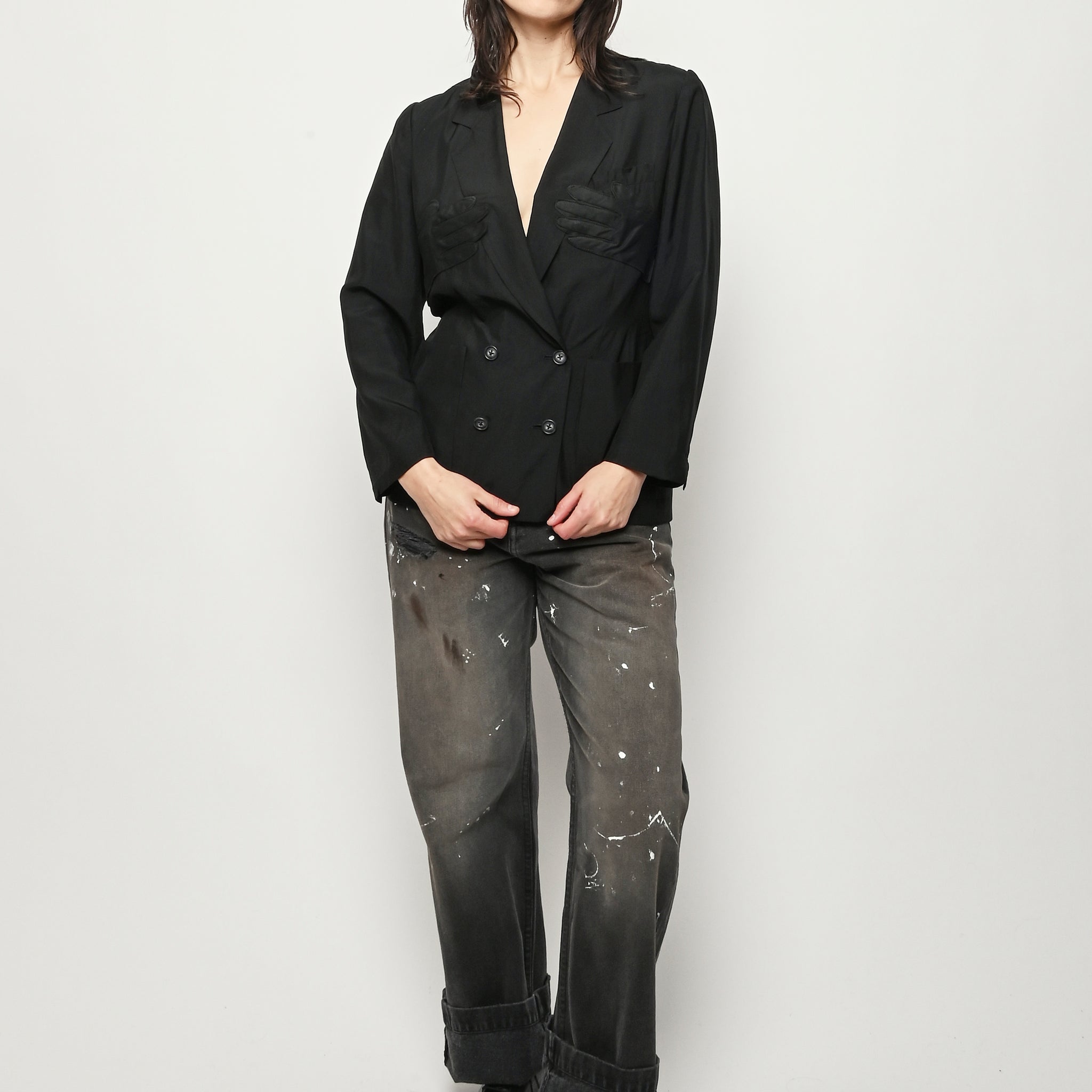 Black re-worked silk, double breasted blazer with tonal black gloves detail at the bust. By local artist/designer, Laurs Kemp.