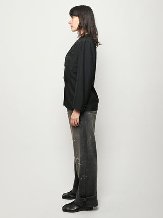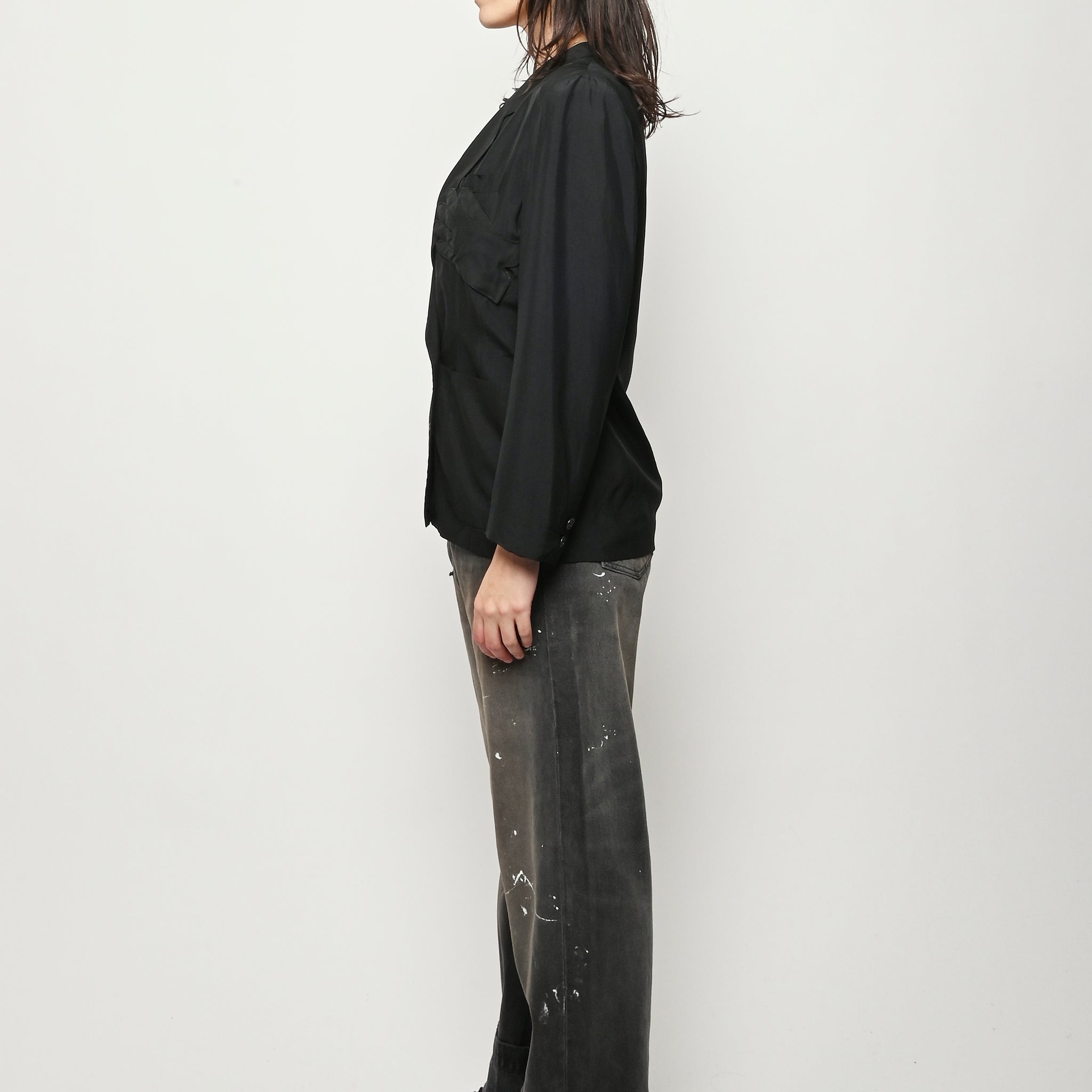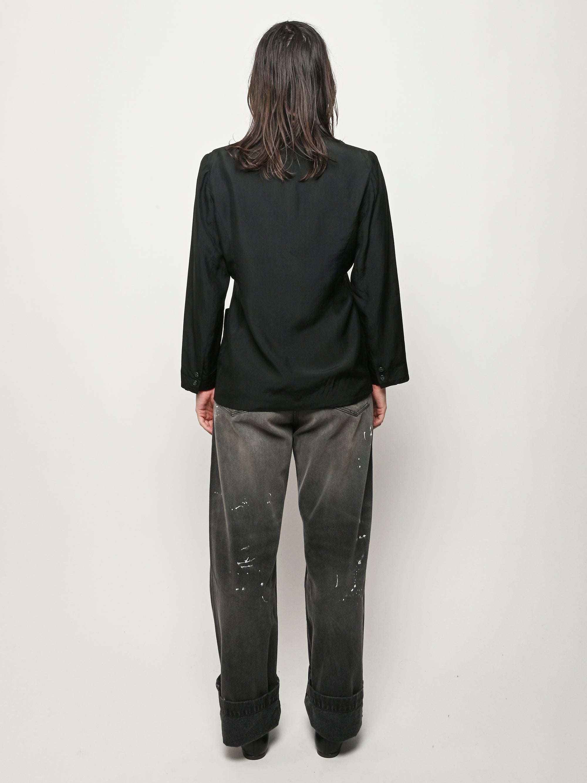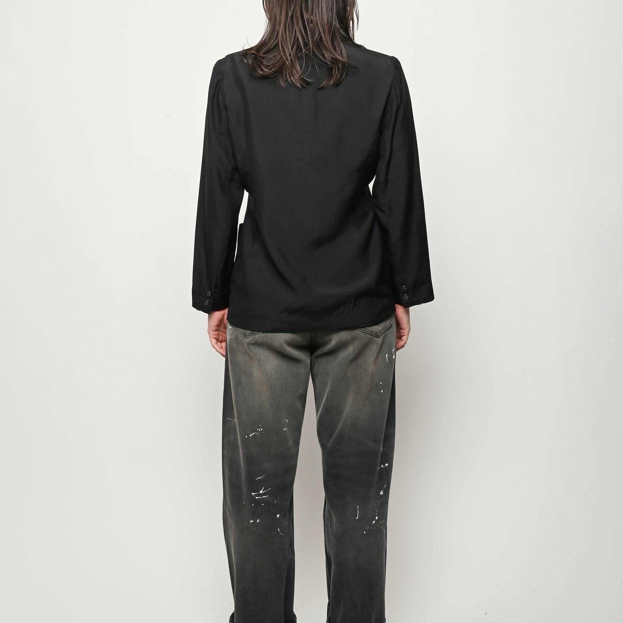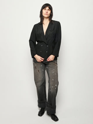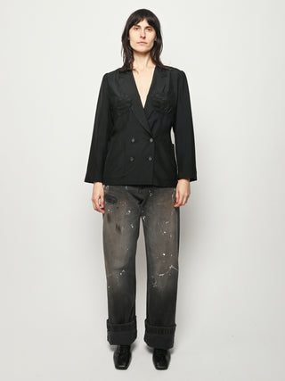 Black re-worked silk, double breasted blazer with tonal black gloves detail at the bust. By local artist/designer, Laurs Kemp.