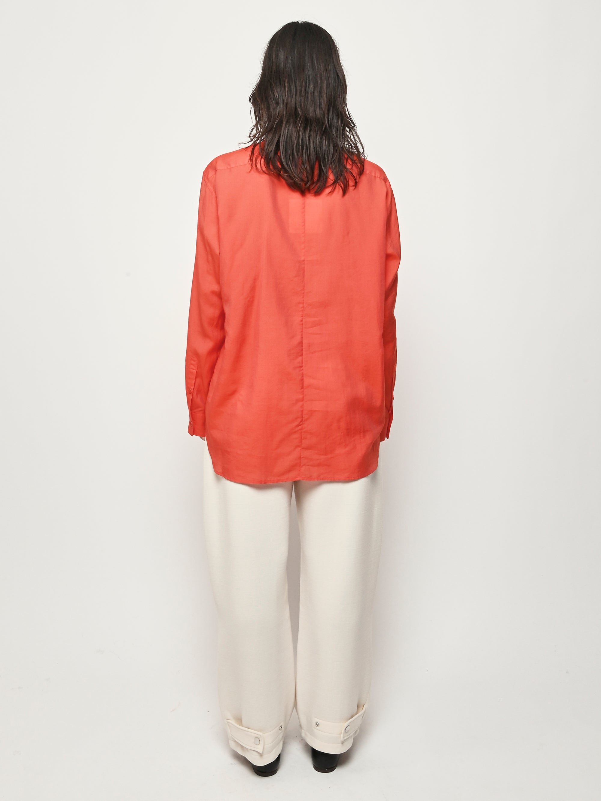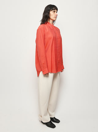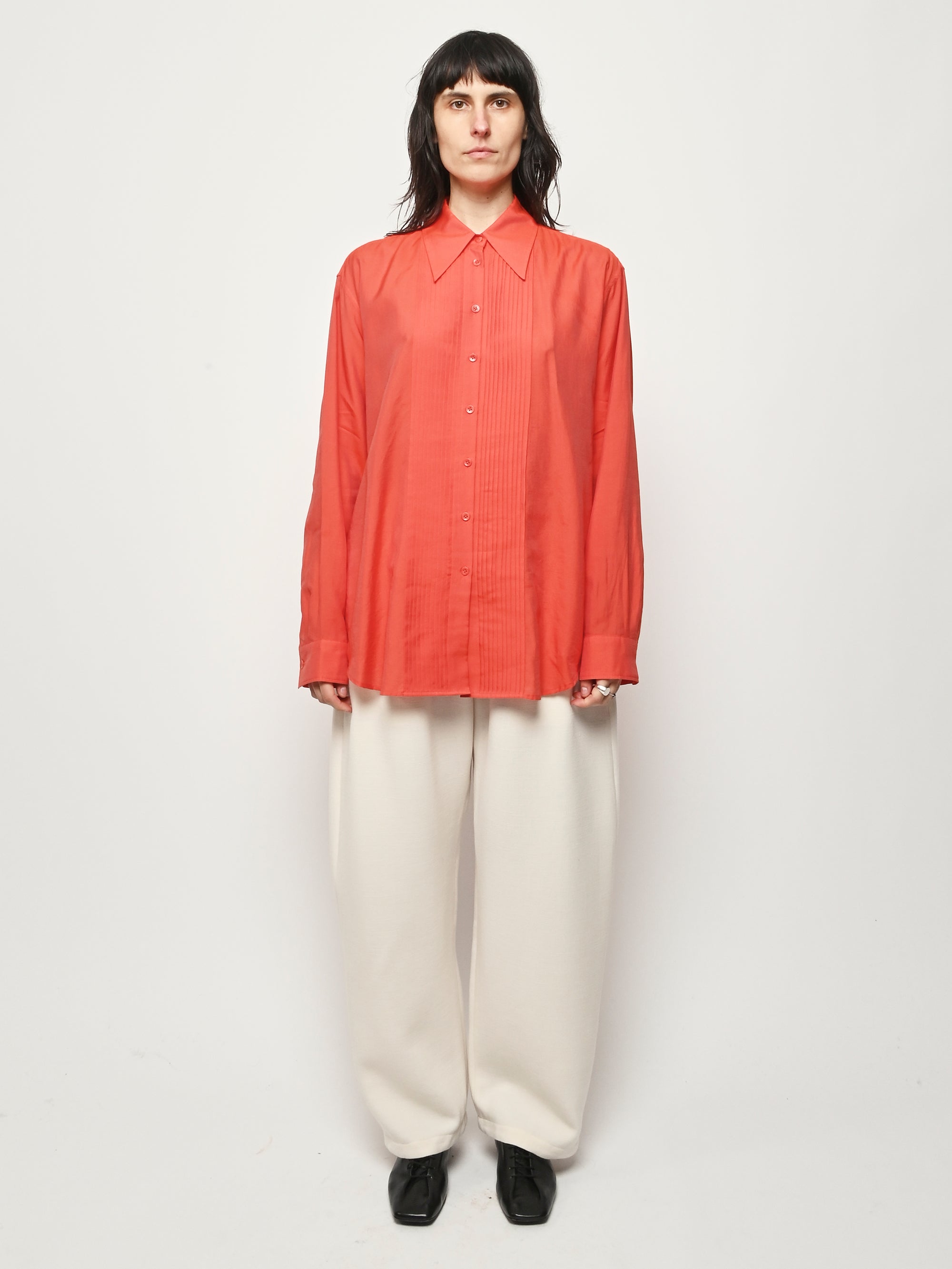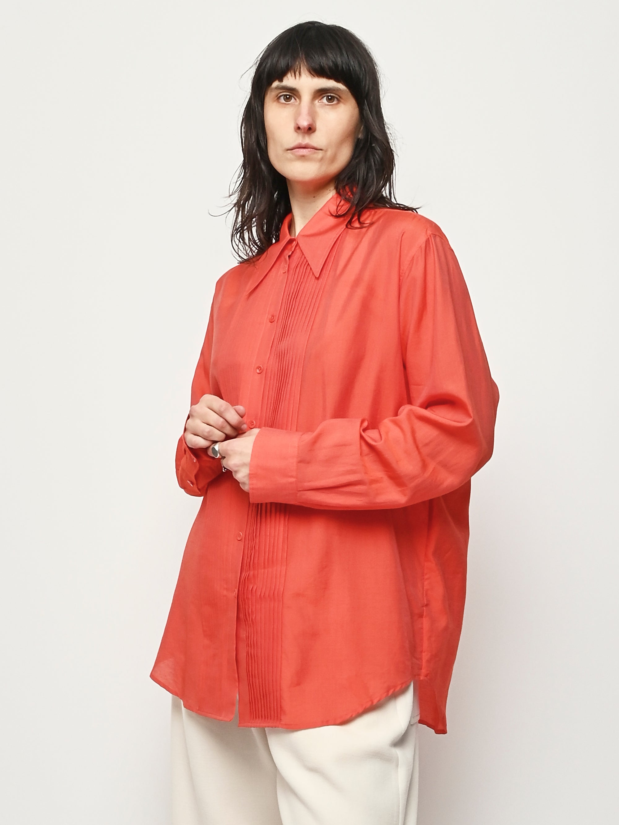 A modern tuxedo shirt through the lens of ease. The Tibi Silk Voile Easy Pintucked Shirt is crafted from Italian silk warp with a Tencel blend weft, finished with a washed hand for softness. The relaxed fit and pintucked front bring refinement with nonchalance. Wear loose for undone attitude, tucked for polish, or layered under suiting for contrast.