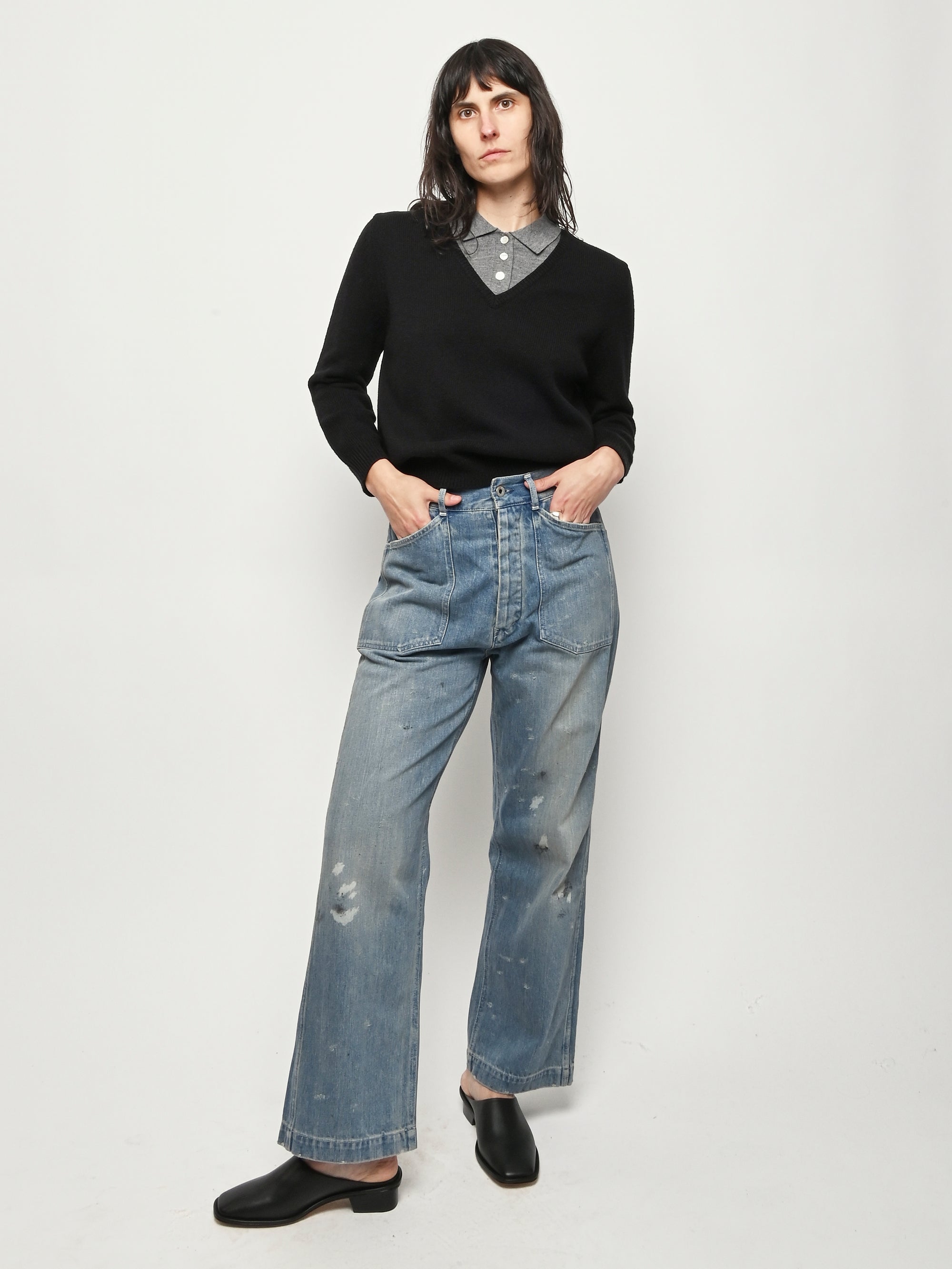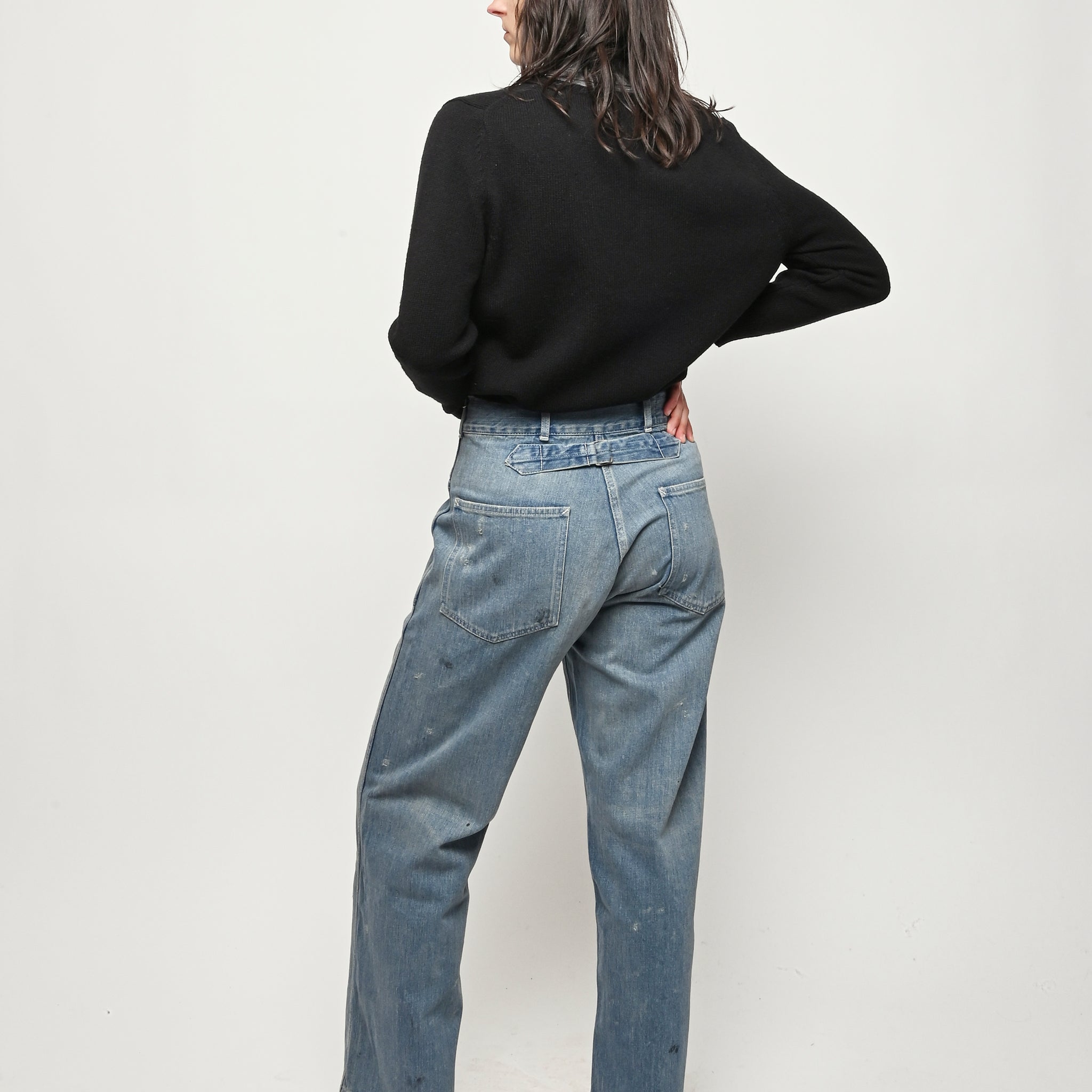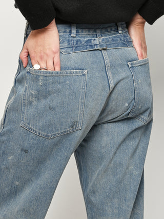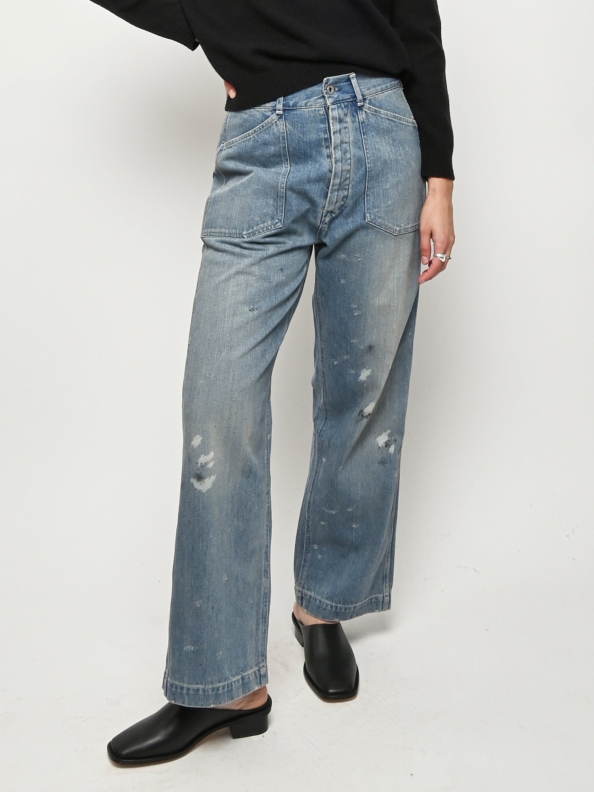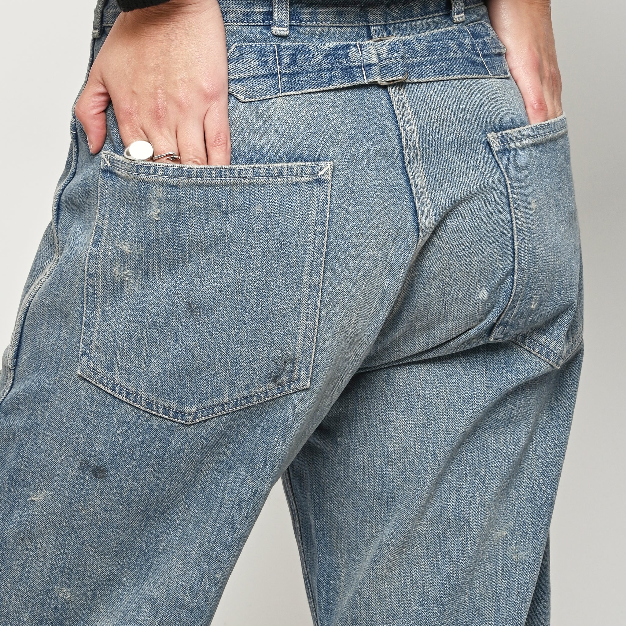 The Unisex Army Style Denim Trousers by Chimala, made from durable cotton, feature light distressing, bleach, and paint splatters throughout which add a vintage, lived-in touch.