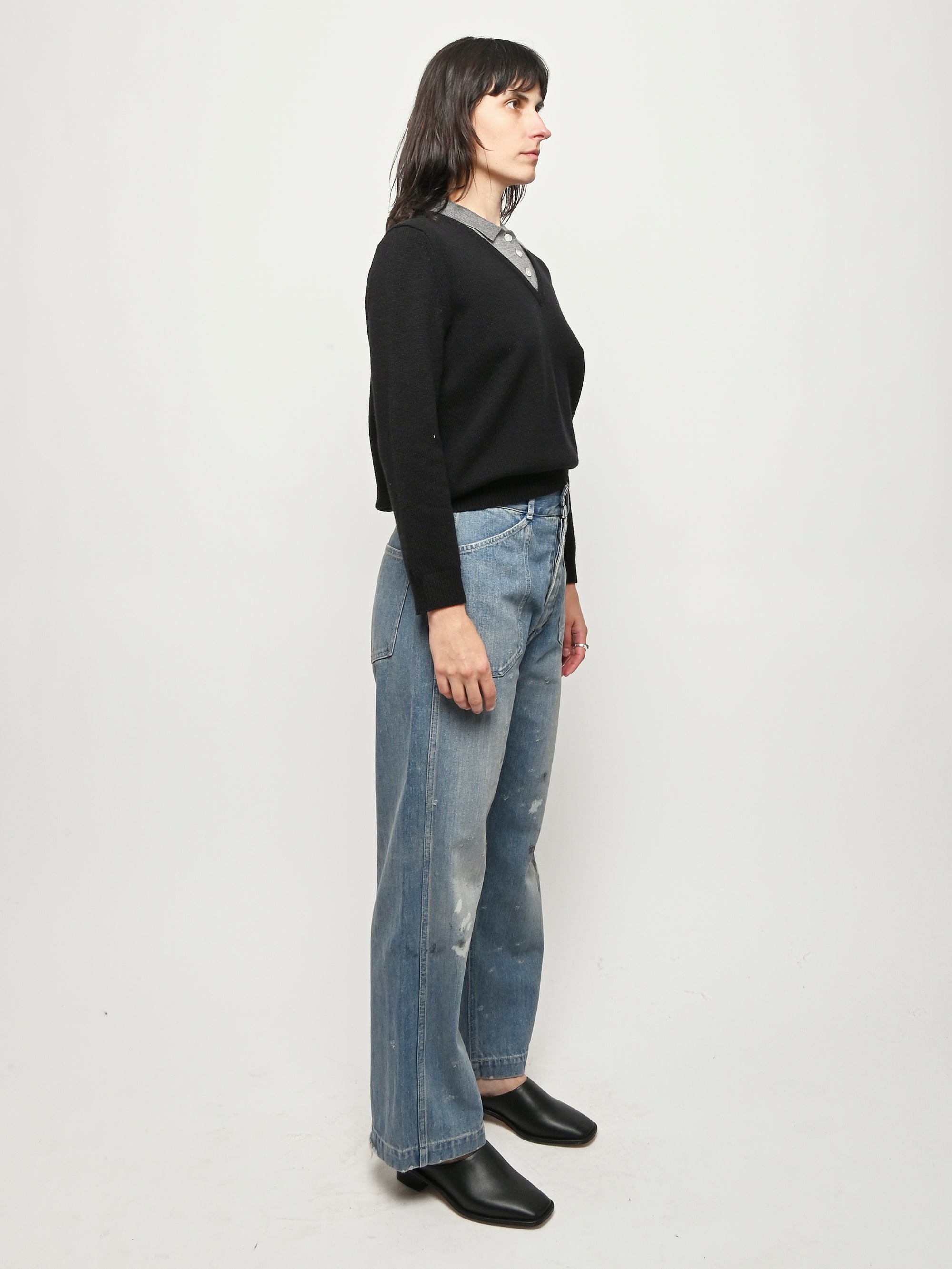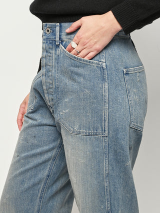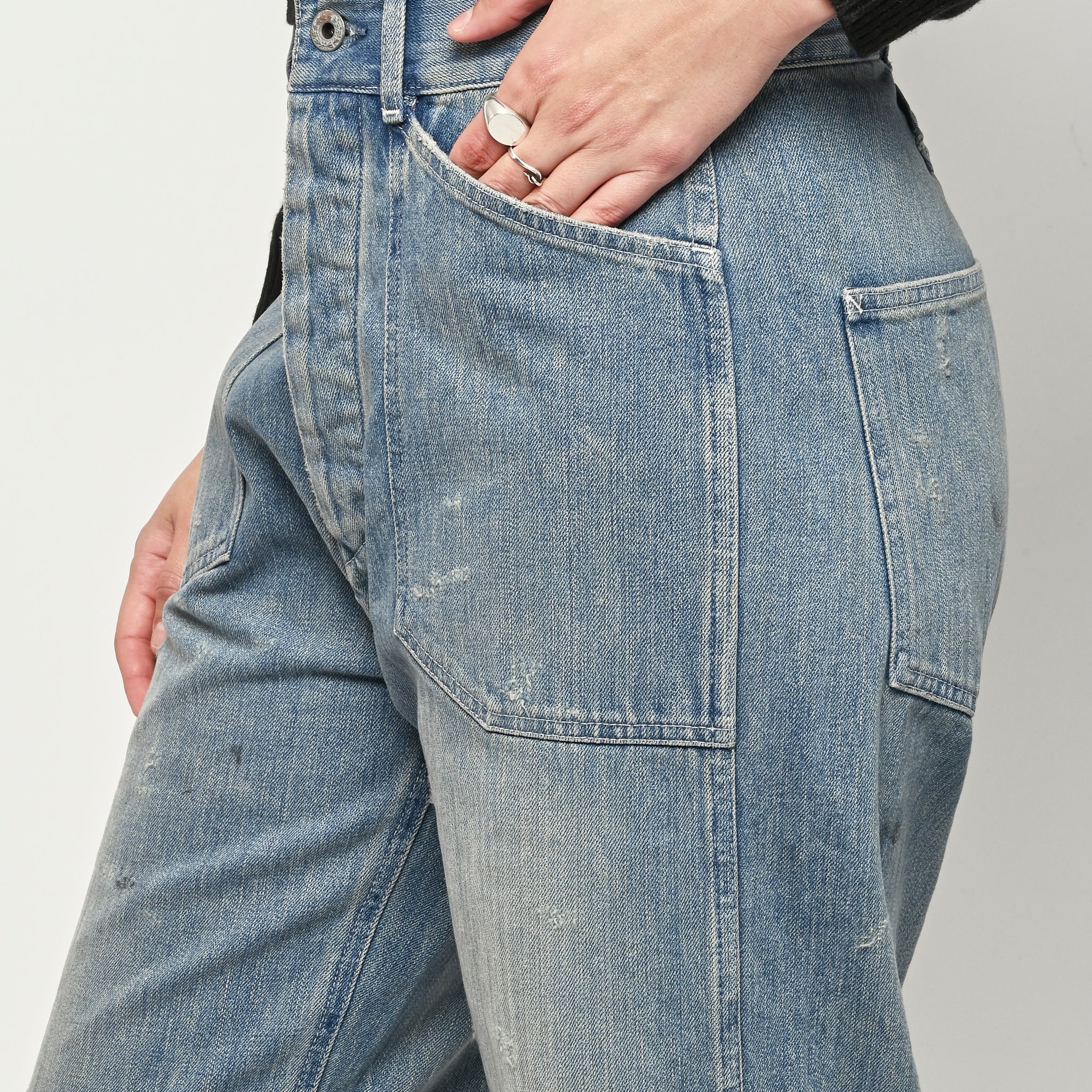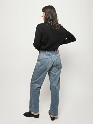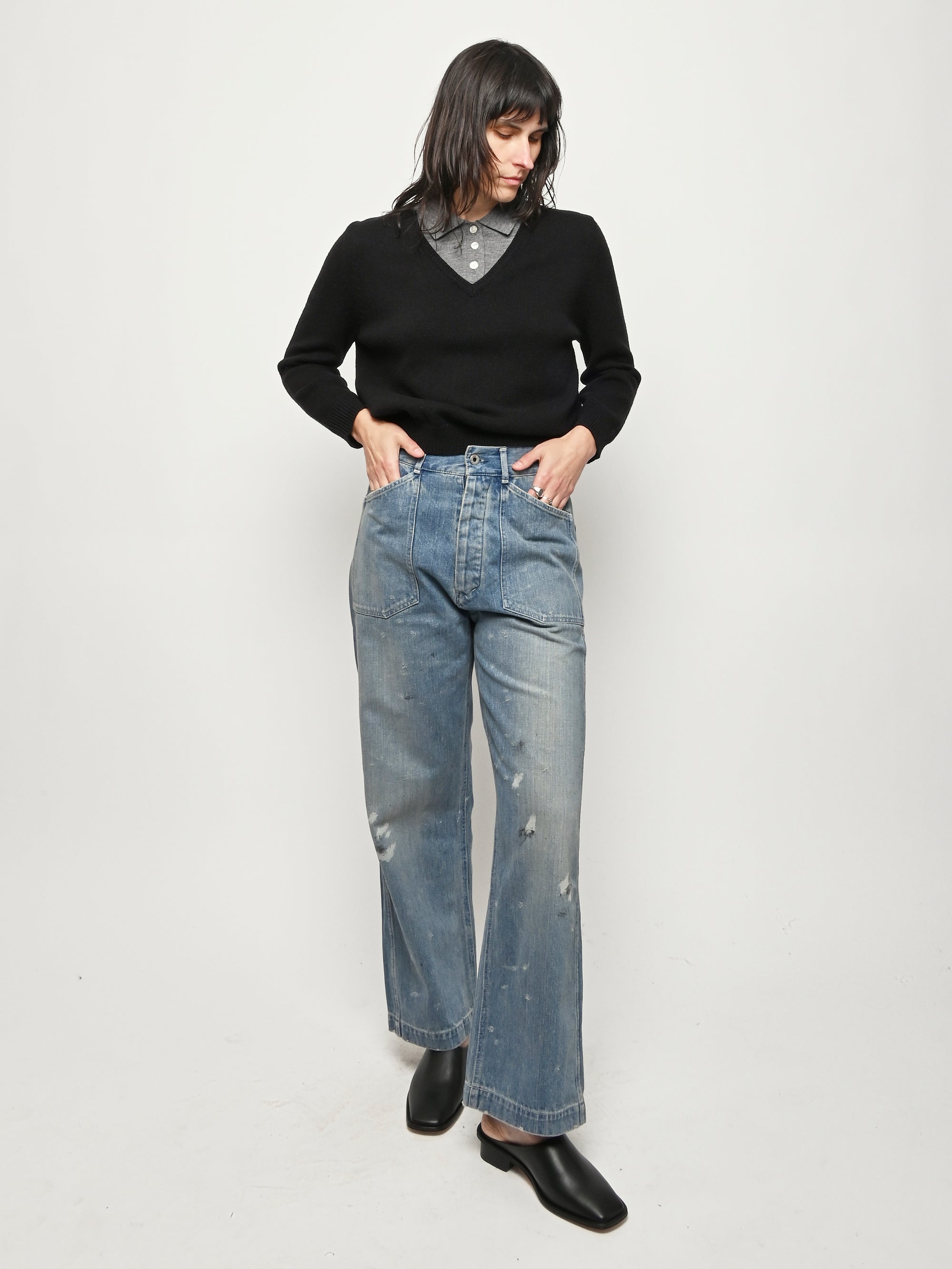 The Unisex Army Style Denim Trousers by Chimala, made from durable cotton, feature light distressing, bleach, and paint splatters throughout which add a vintage, lived-in touch.
