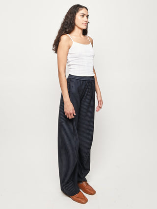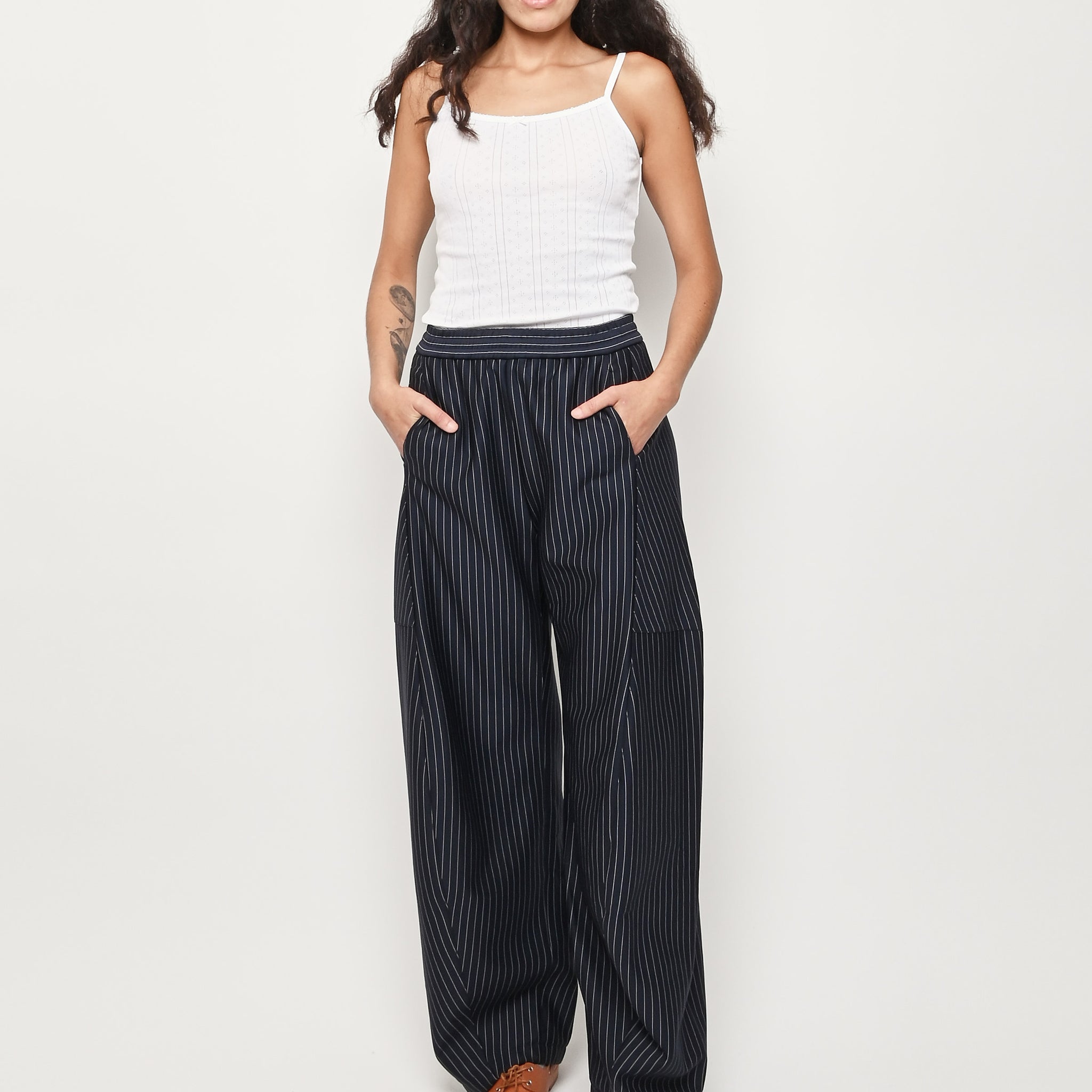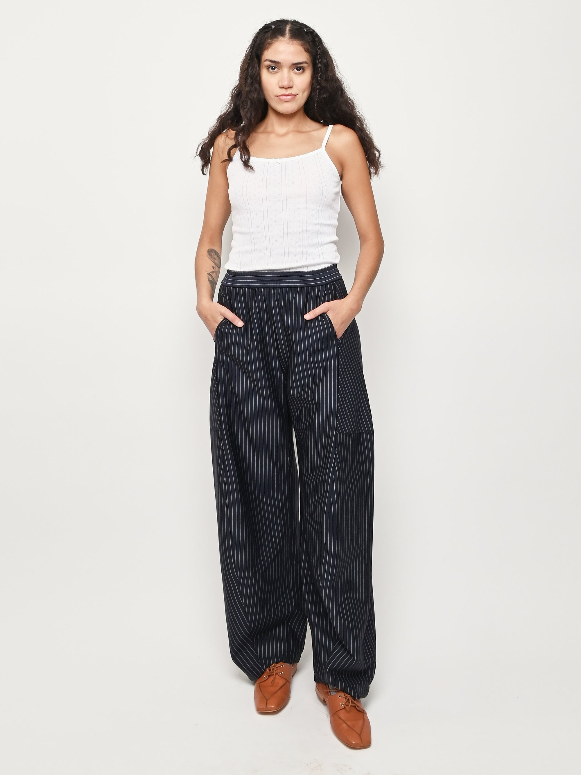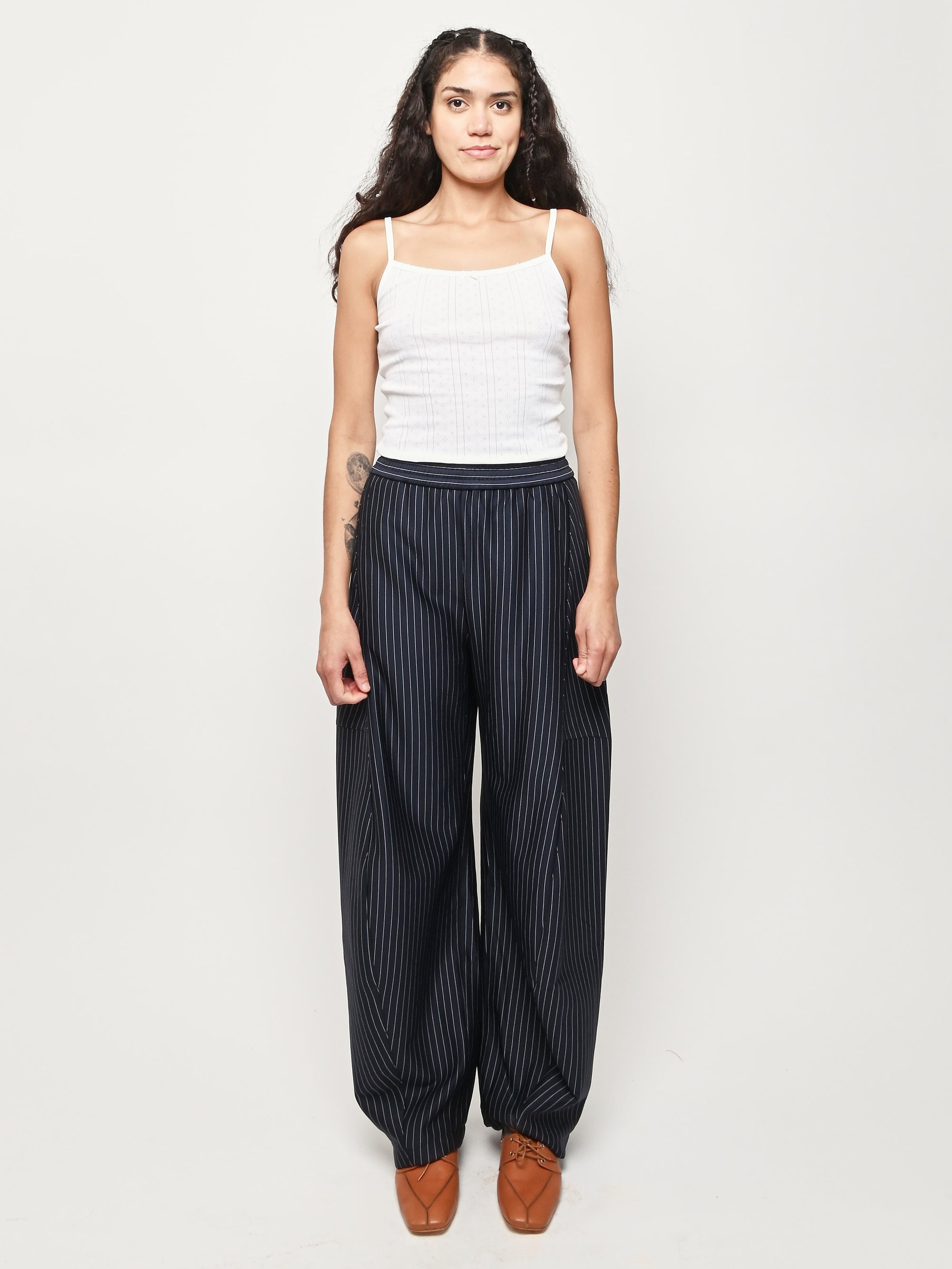Complete the look: Tibi Navy/Multi Pinsripe Active Knit Winslow Pant, Rachel Comey Caramel Barata Moccasin
