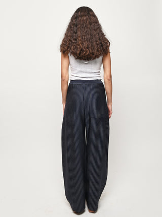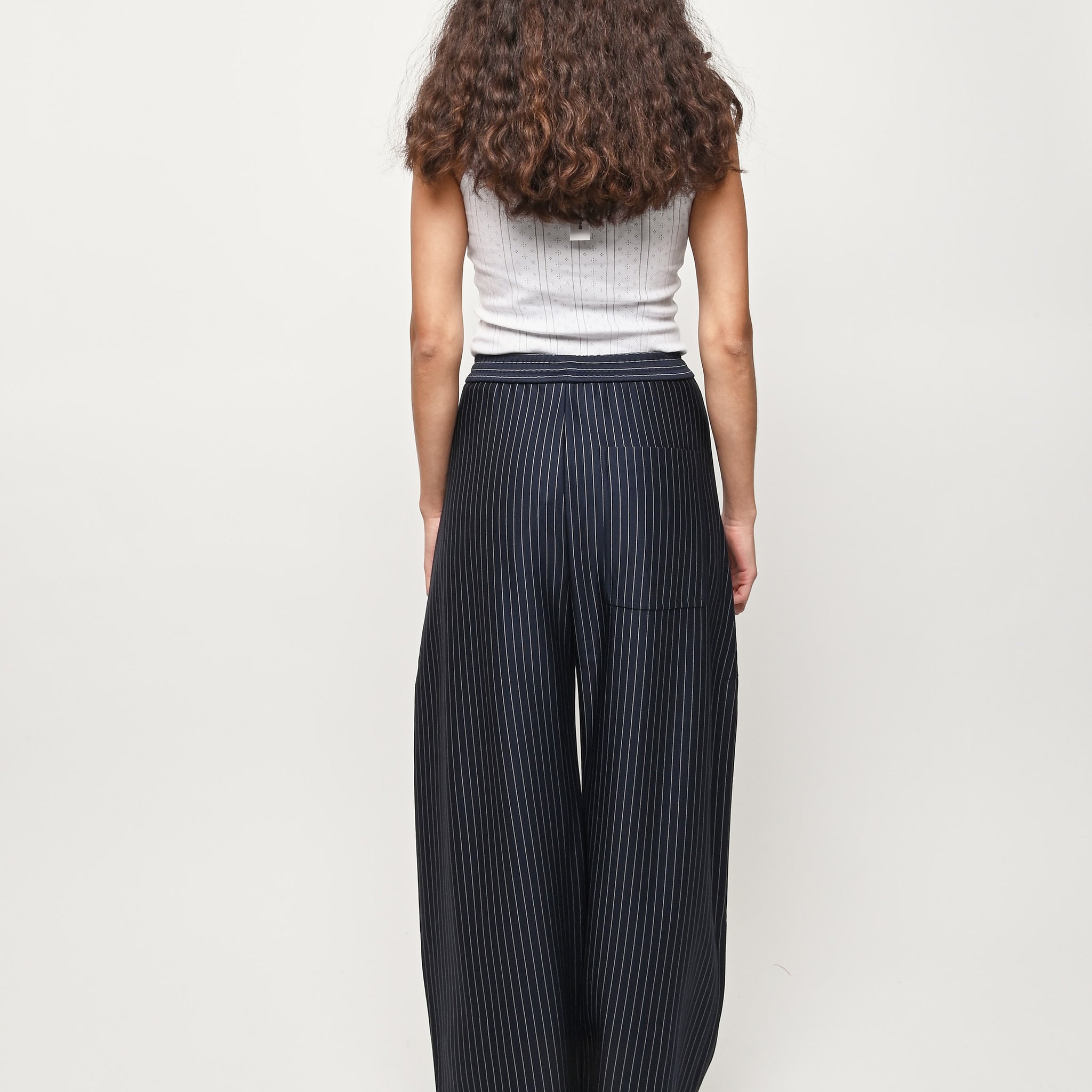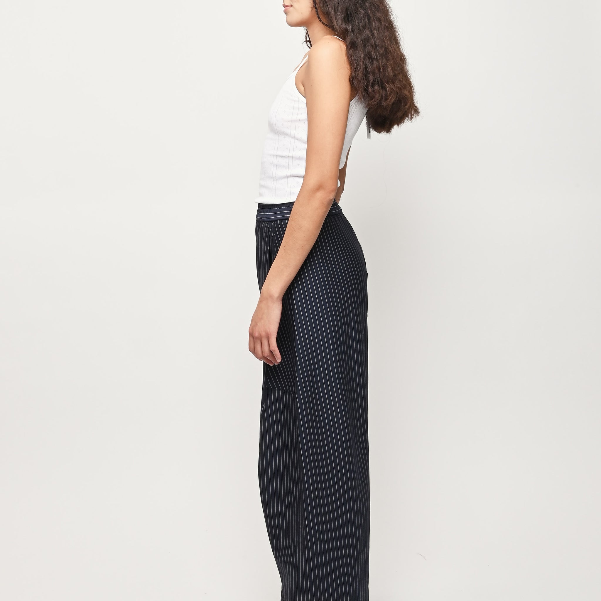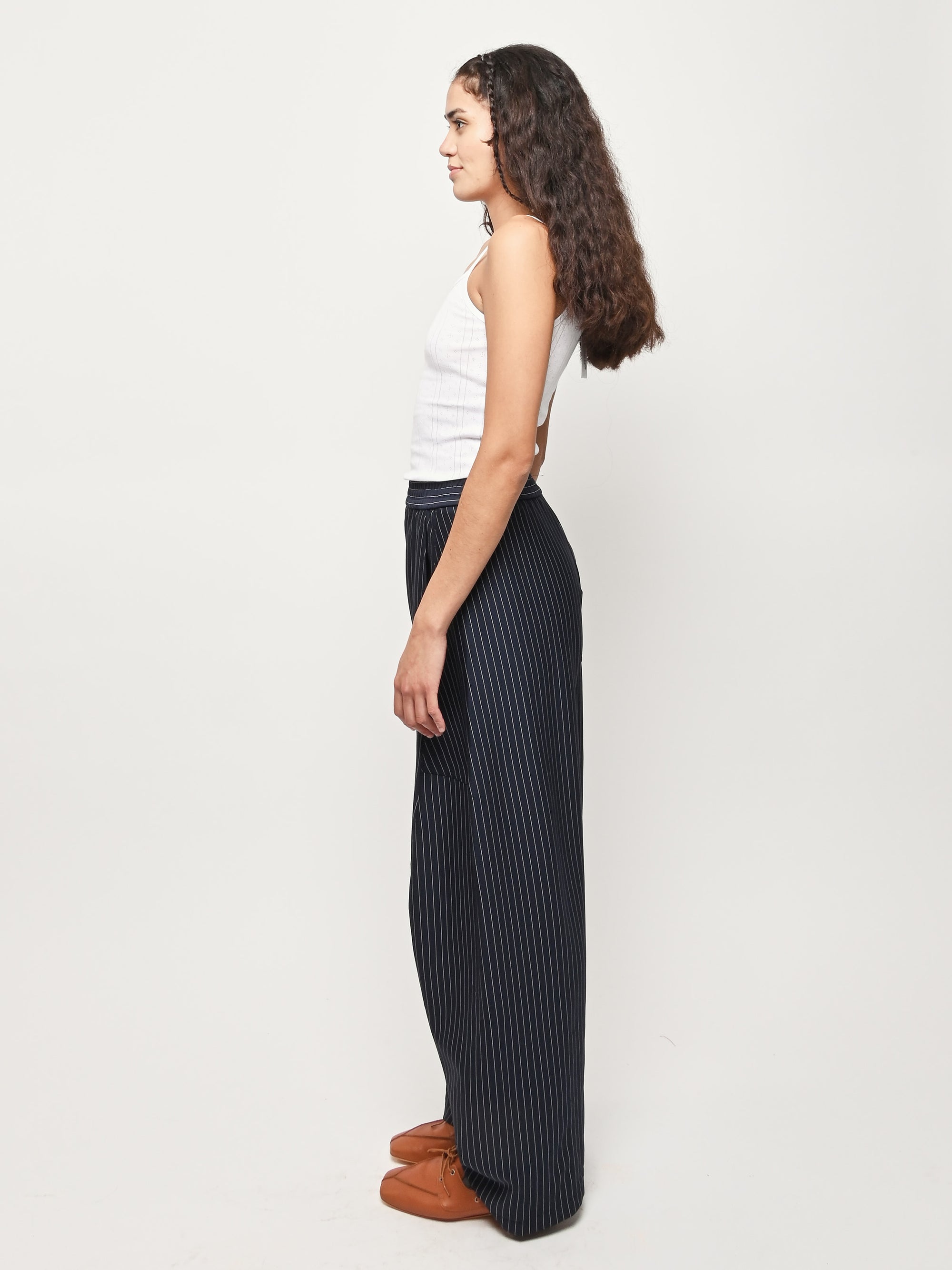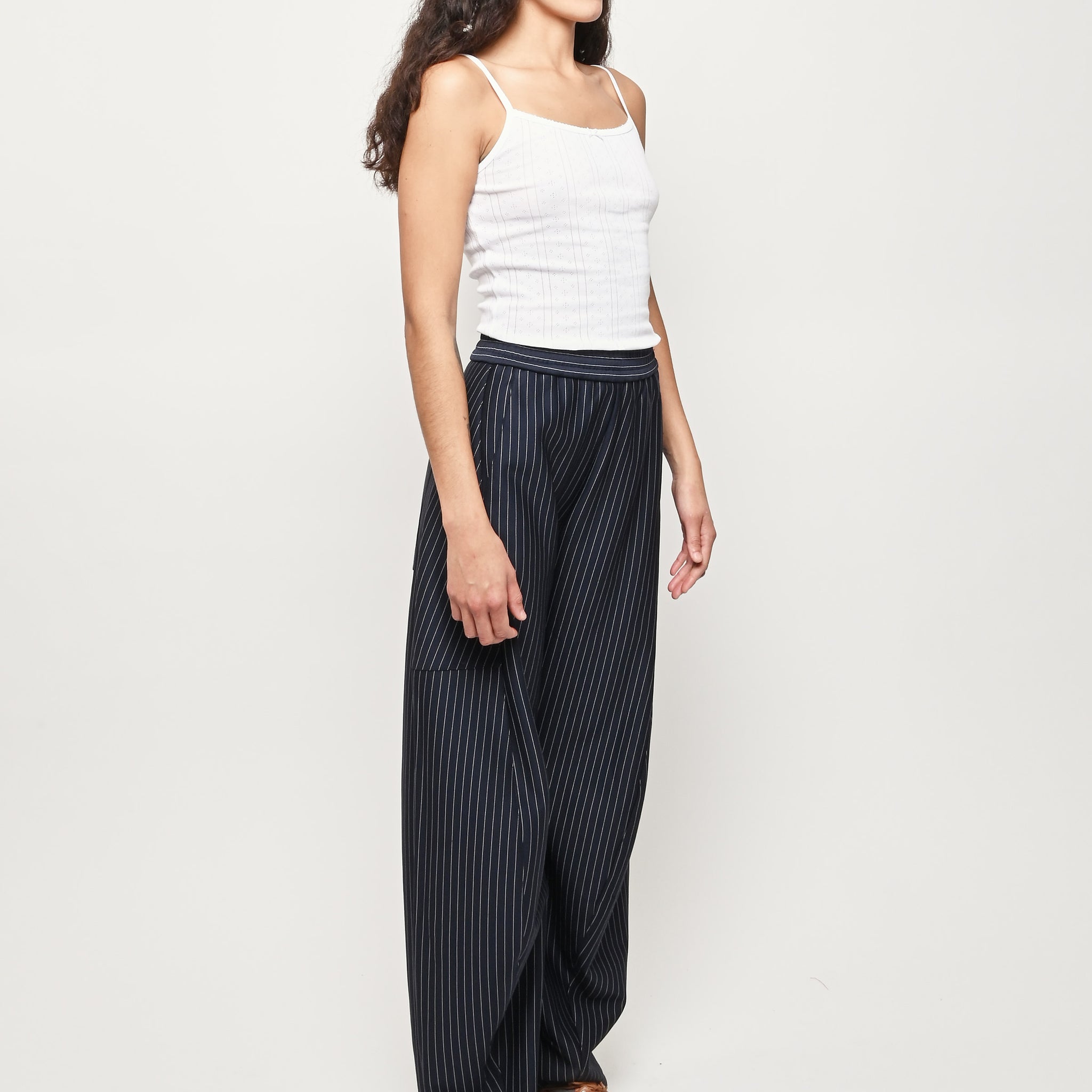 Complete the look: Tibi Navy/Multi Pinsripe Active Knit Winslow Pant, Rachel Comey Caramel Barata Moccasin