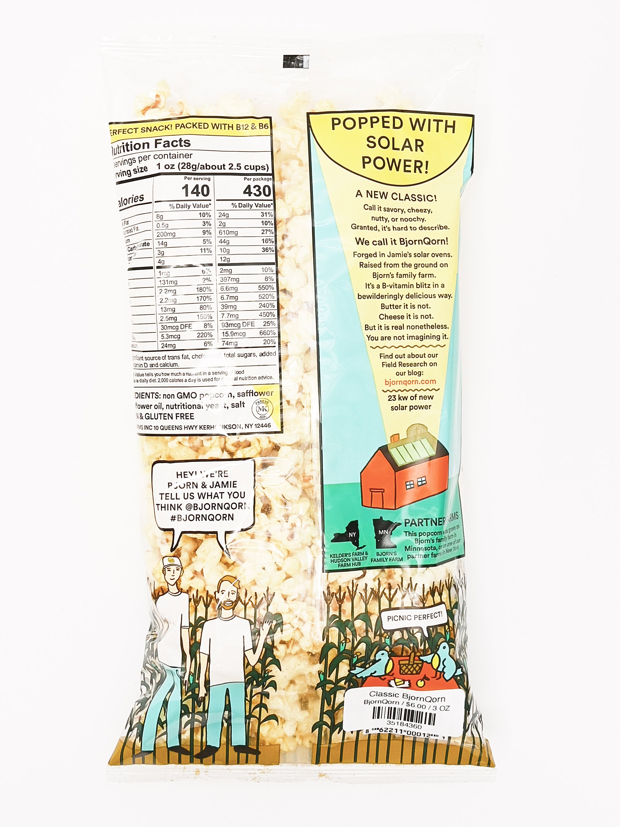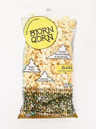 BjornQorn's signature popcorn! This is the one the kids talk about at the playground. Its the bag that keeps peeking at you from your co-worker's desk. Its super nutritious, addictive and simple as can be. Nutritional yeast is the star here, but the kernels are perfectly popped and seasoned just right. It's packaged clearly, because what you see should be what you get.