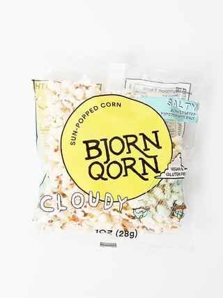 BjornQorn Cloudy Qorn is slow roasted and just salted. The kernels are dark on the inside and bright white on the outside. They're crunchy and, dare I say, sophisticated. Popcorn lovers will truly appreciate this one.