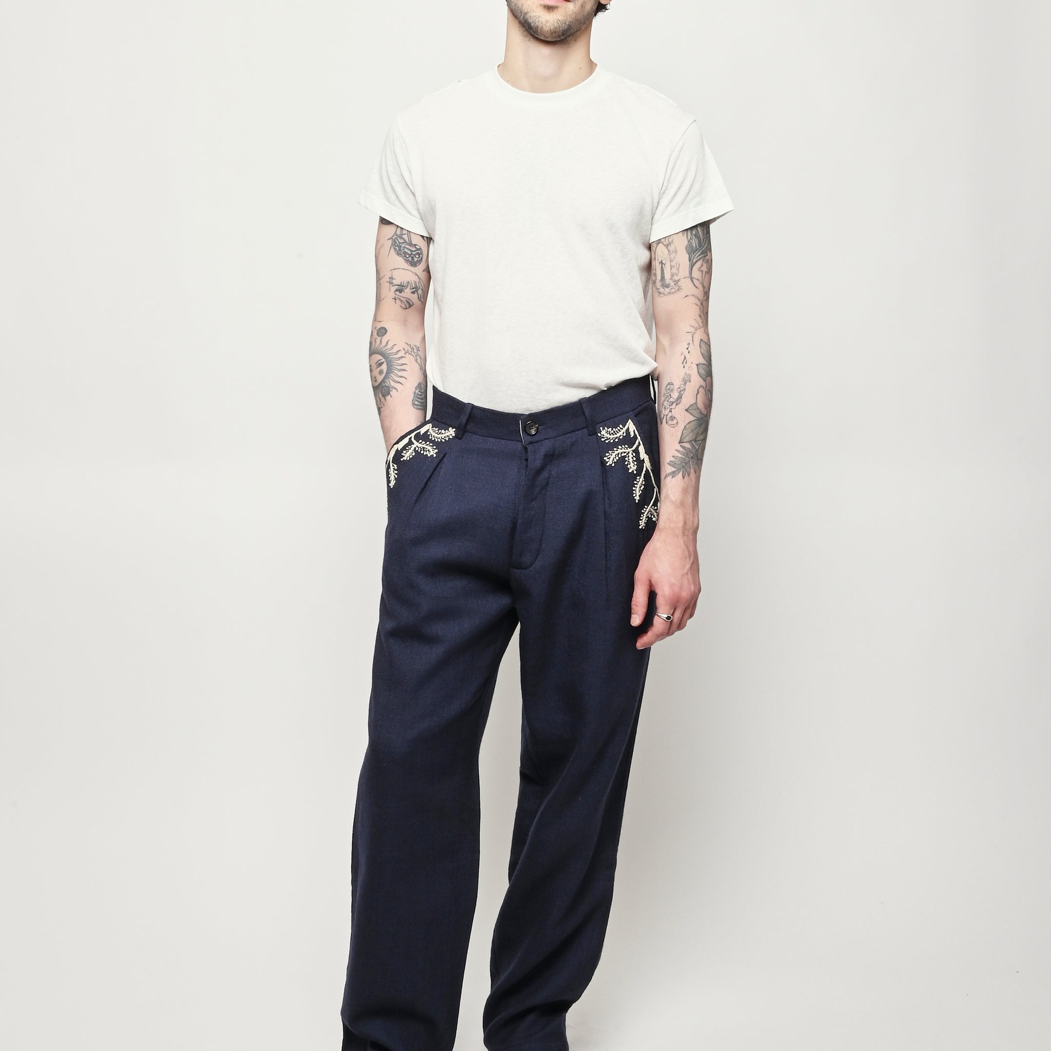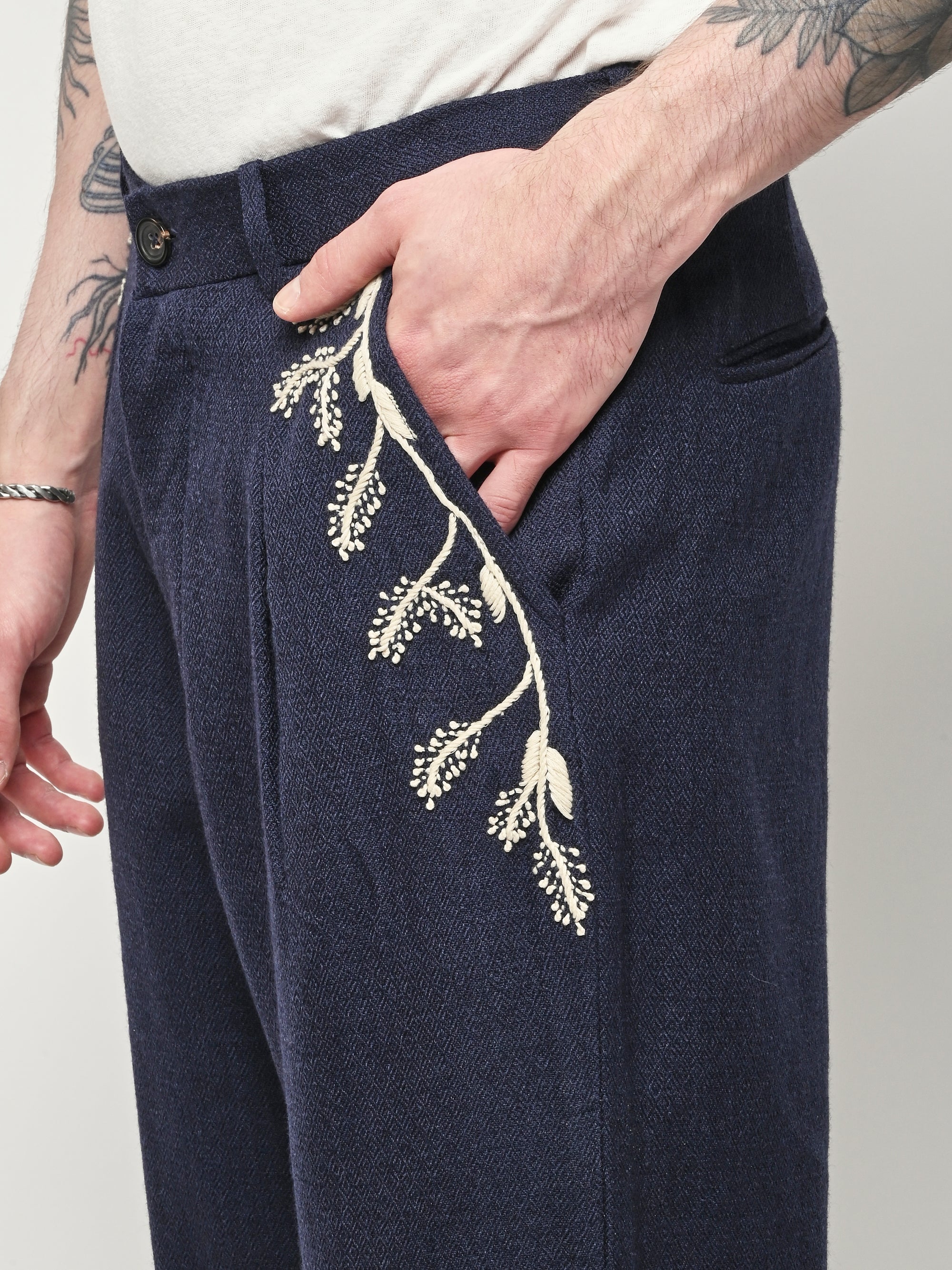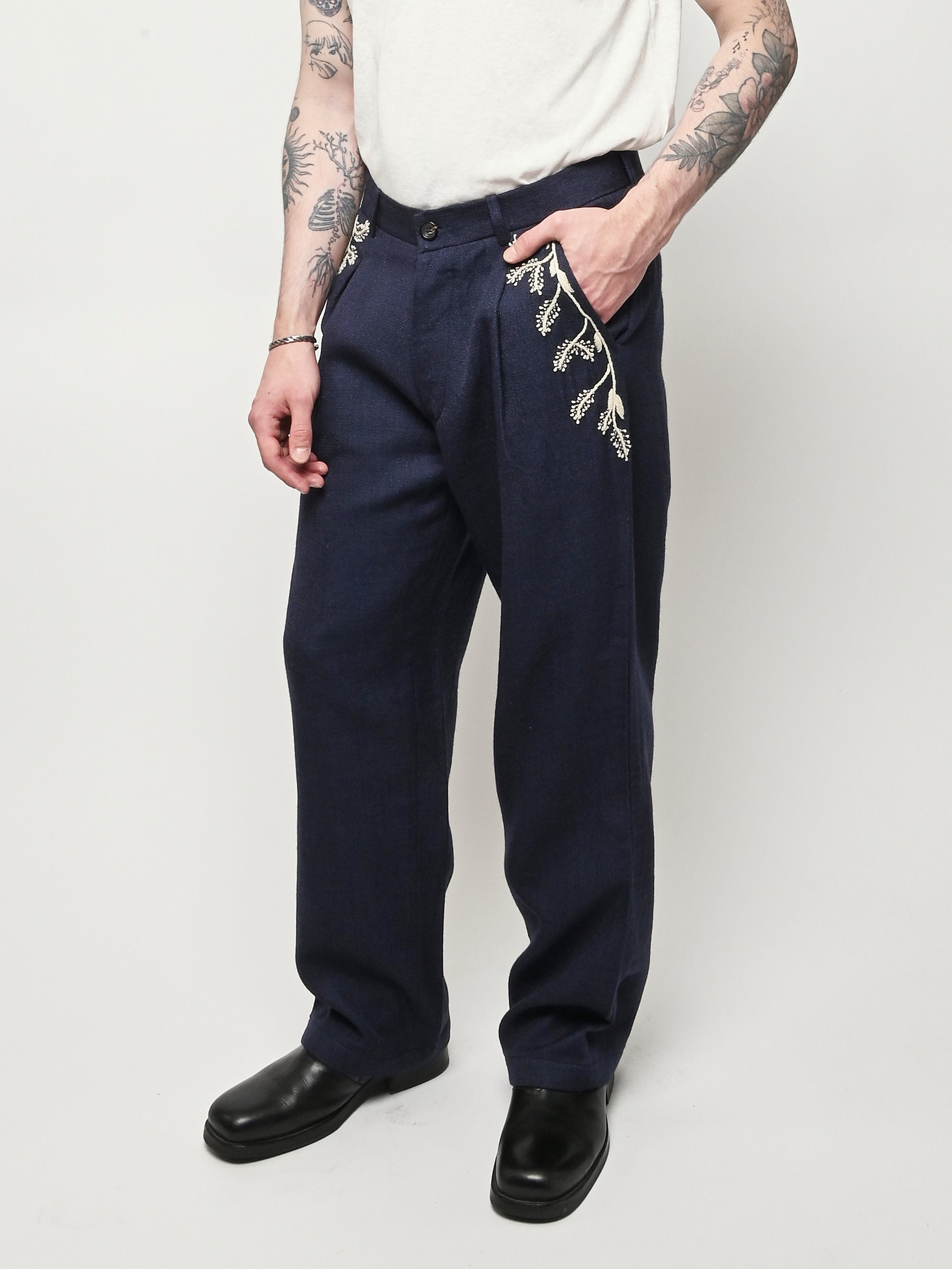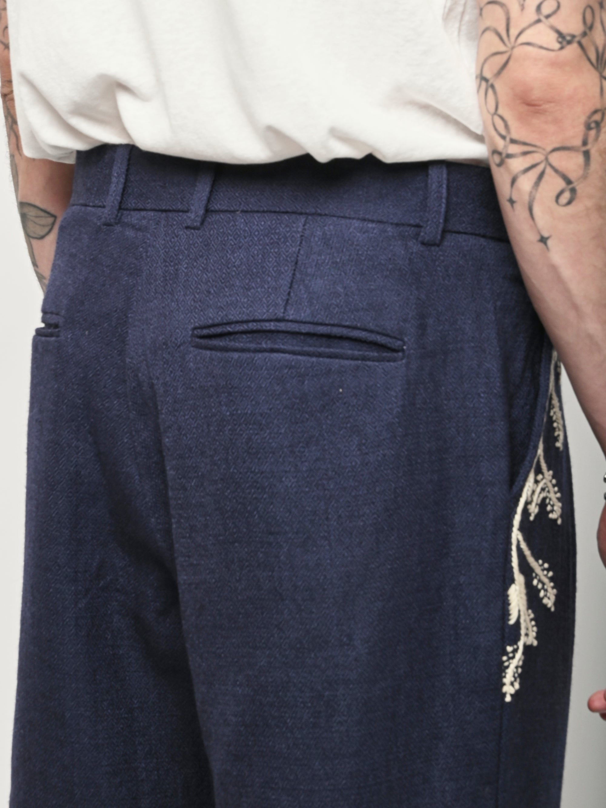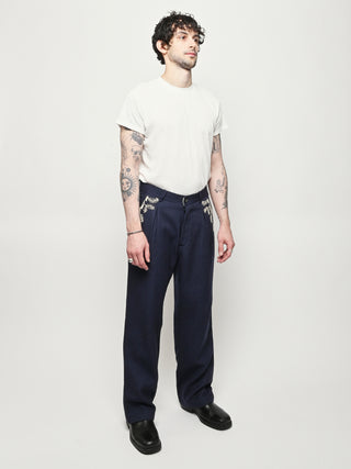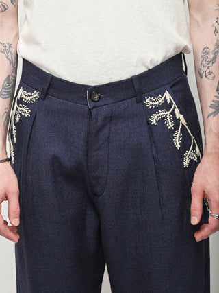 Pleated navy trousers from Kartik Research, featuring a hand embroidered Warli motif.