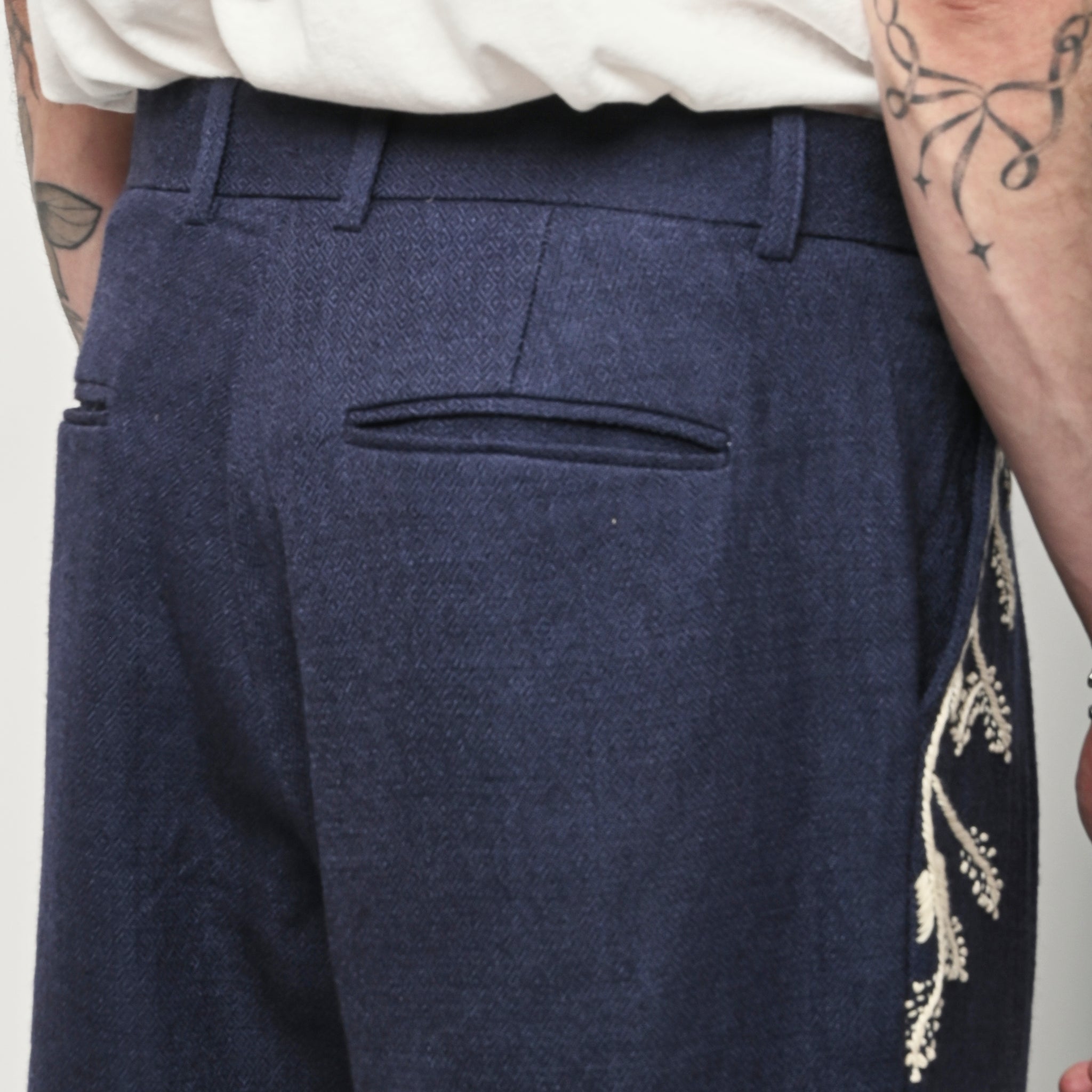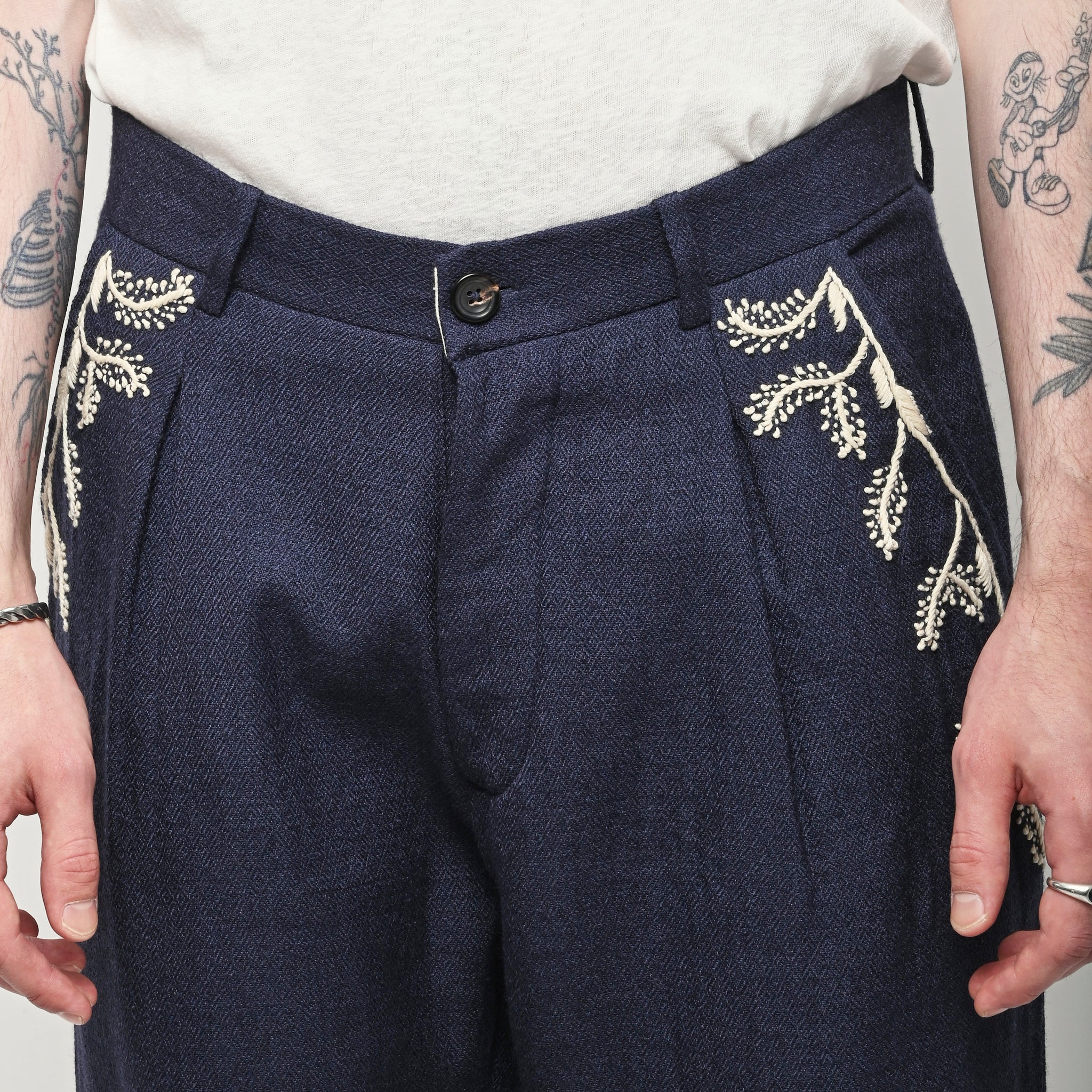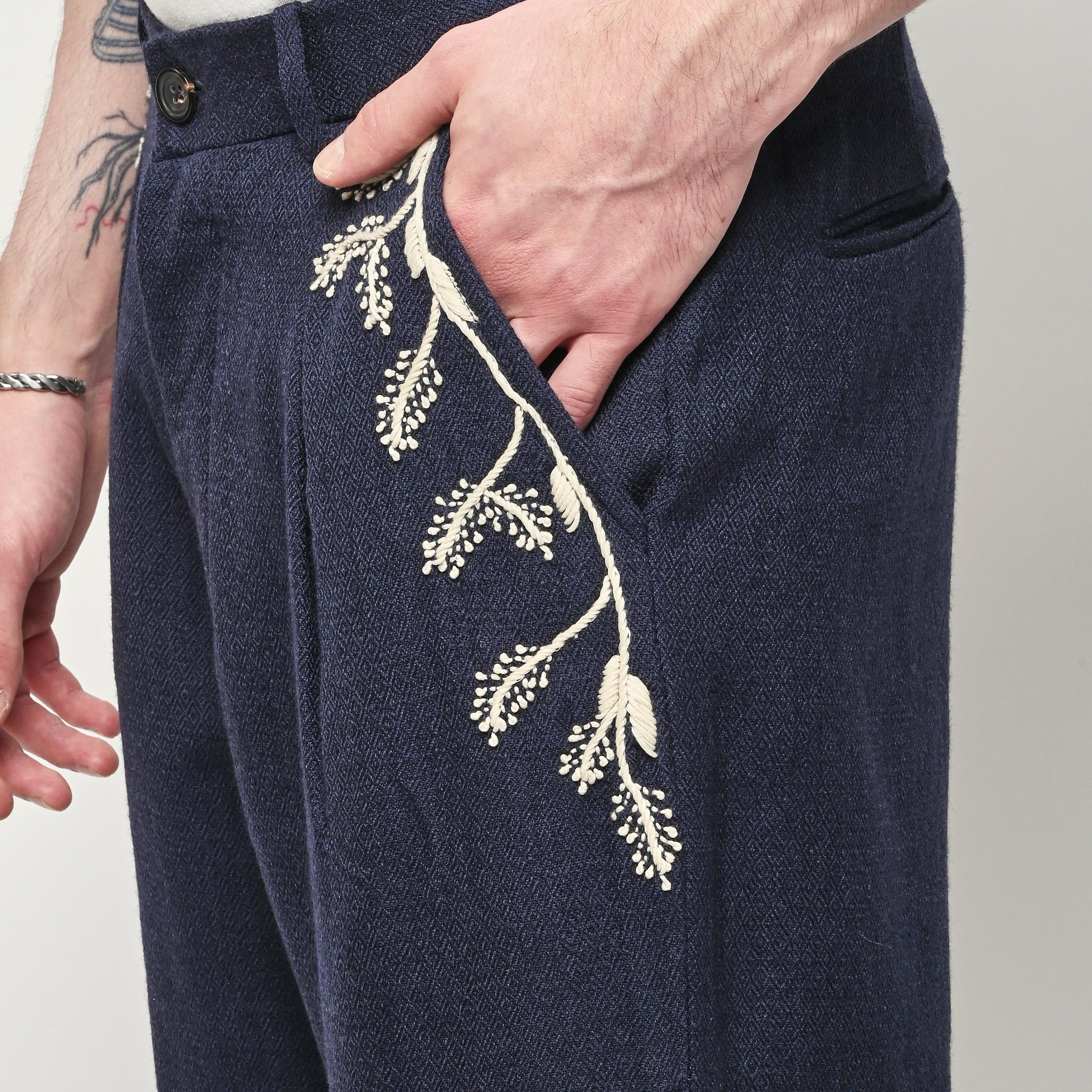 Pleated navy trousers from Kartik Research, featuring a hand embroidered Warli motif.
