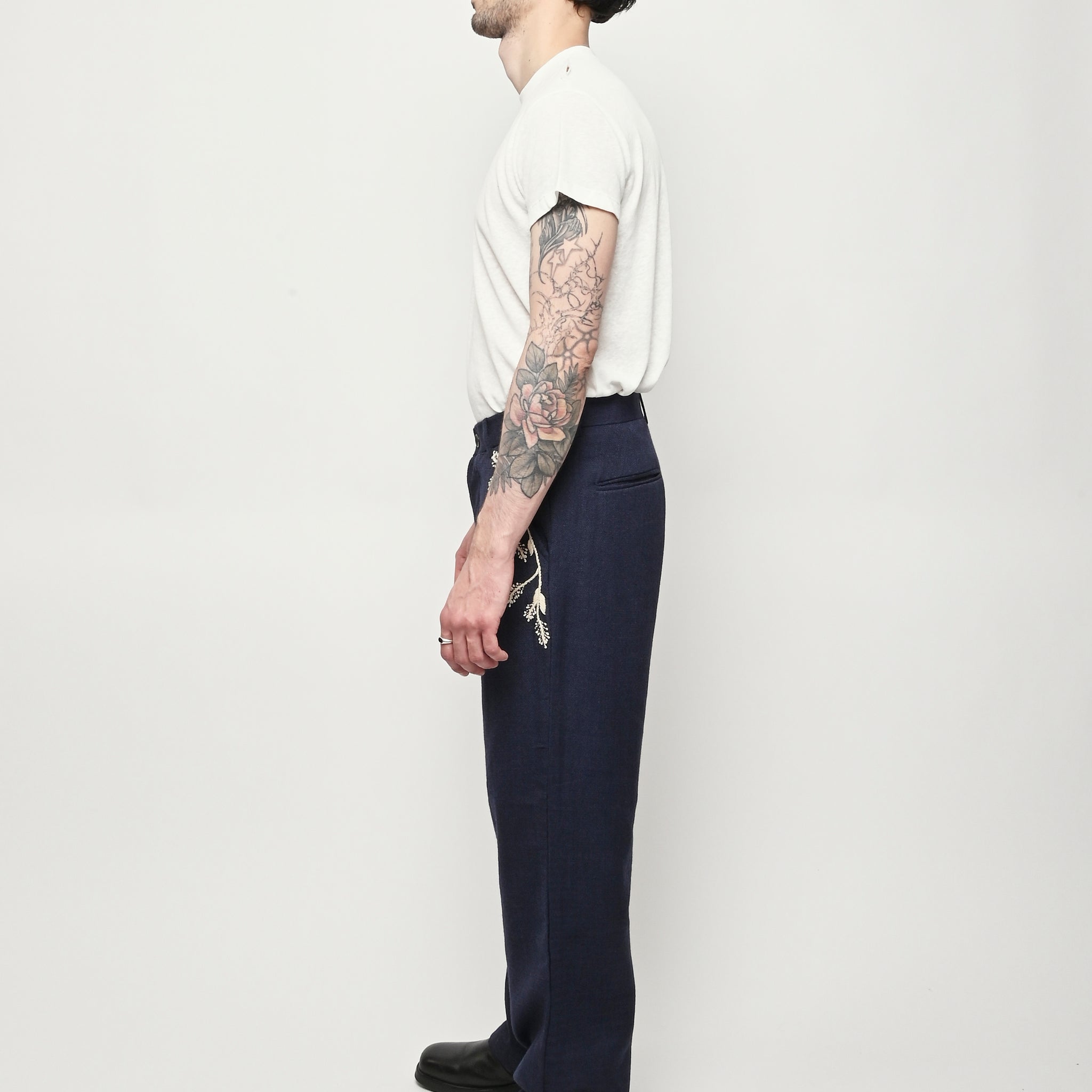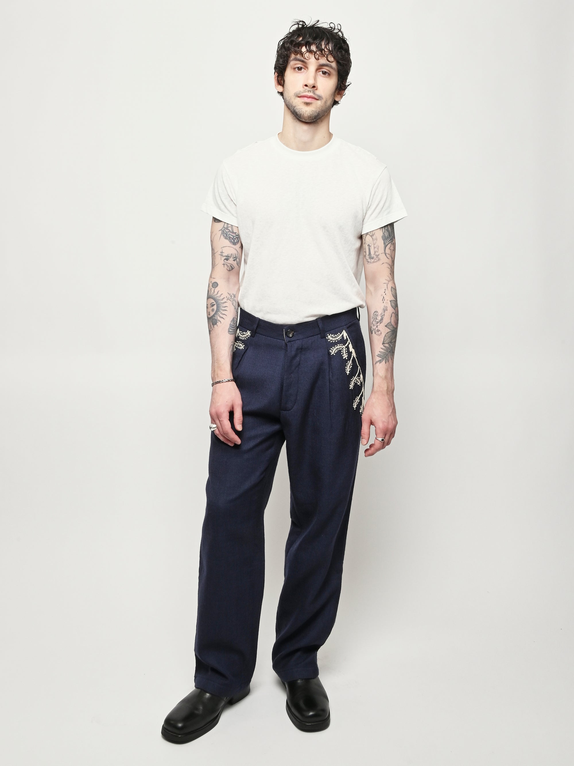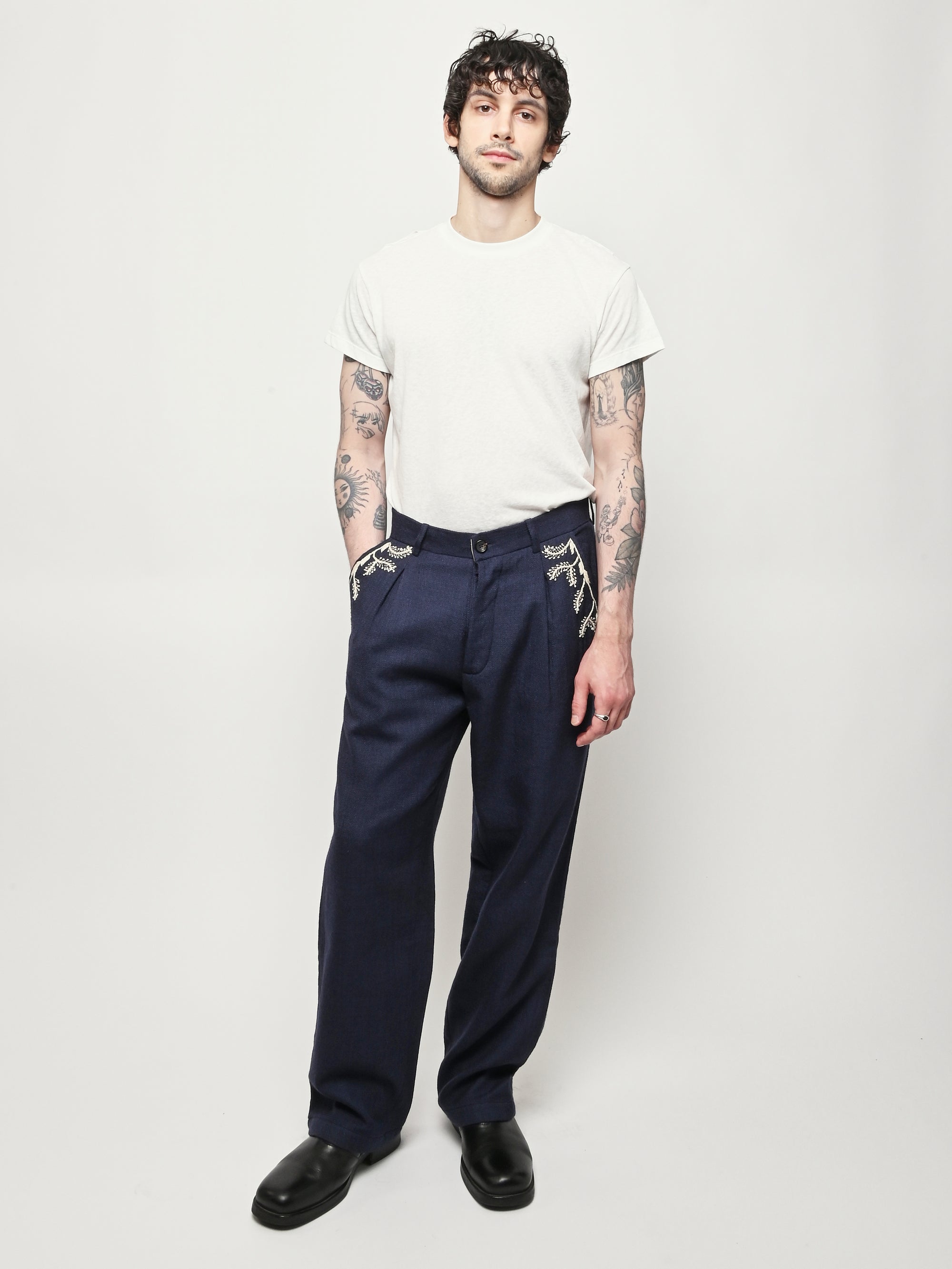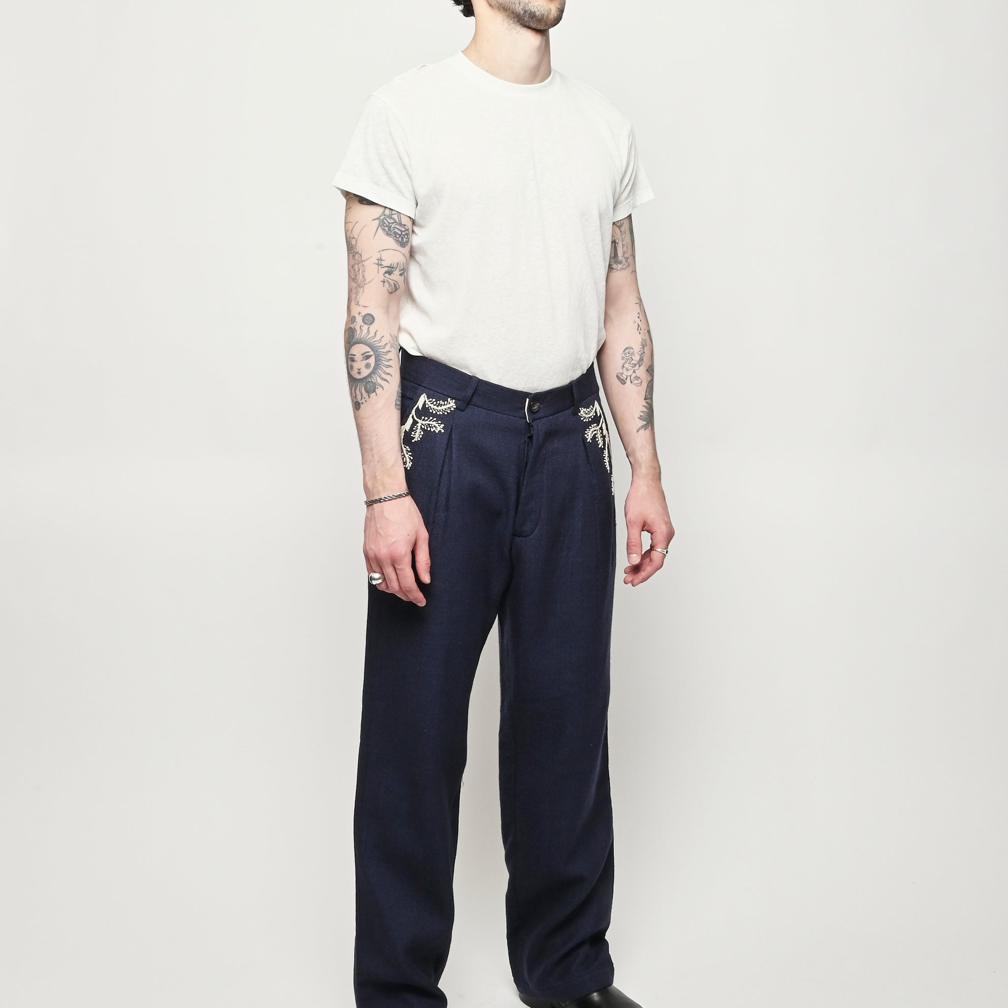 Pleated navy trousers from Kartik Research, featuring a hand embroidered Warli motif.
