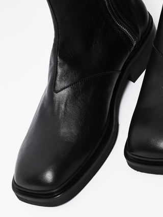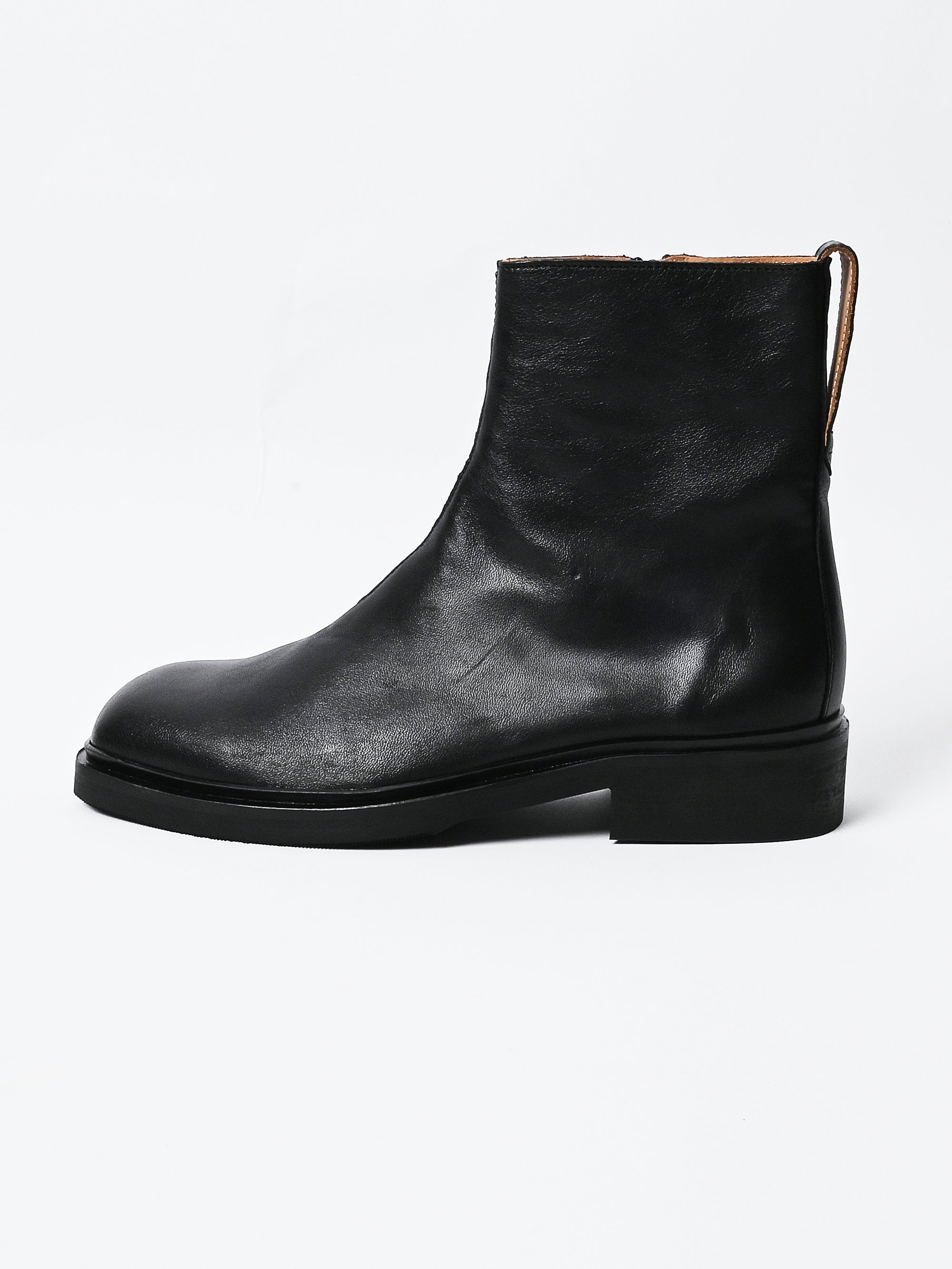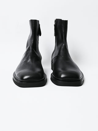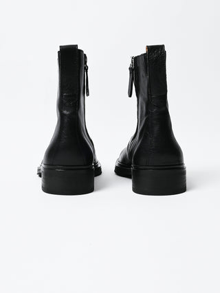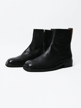 Our Legacy Daimono Boot in Malleable Black Bull Hide. Produced in Italian bull leather, the boot features a Vibram outsole made in the USA, a Kilger leather midsole from Germany, a YKK side zip closure, a leather pull tab and leather lining. This product is crafted from carefully sourced leather. As a natural material, leather carries subtle traces of the animal's life. These natural imperfections bring a unique character to each product, expressing an original and authentic look. The product shall be shaped by its wearer and naturally distress over time to complete the design process.