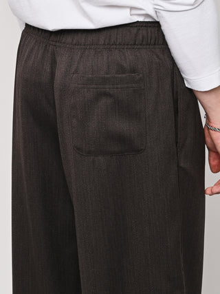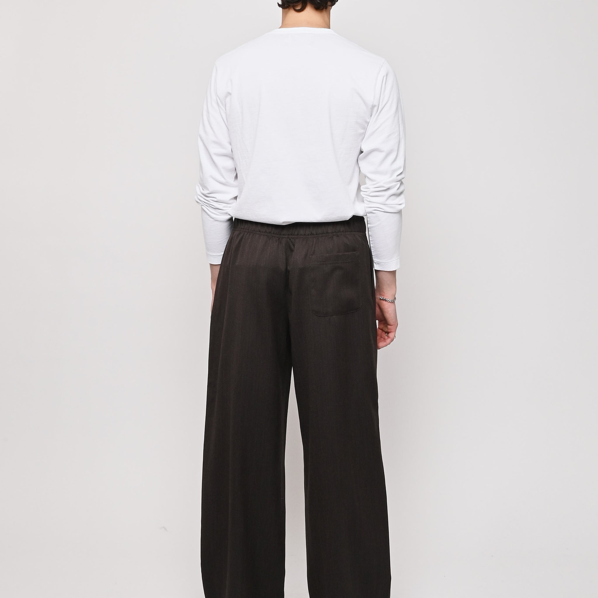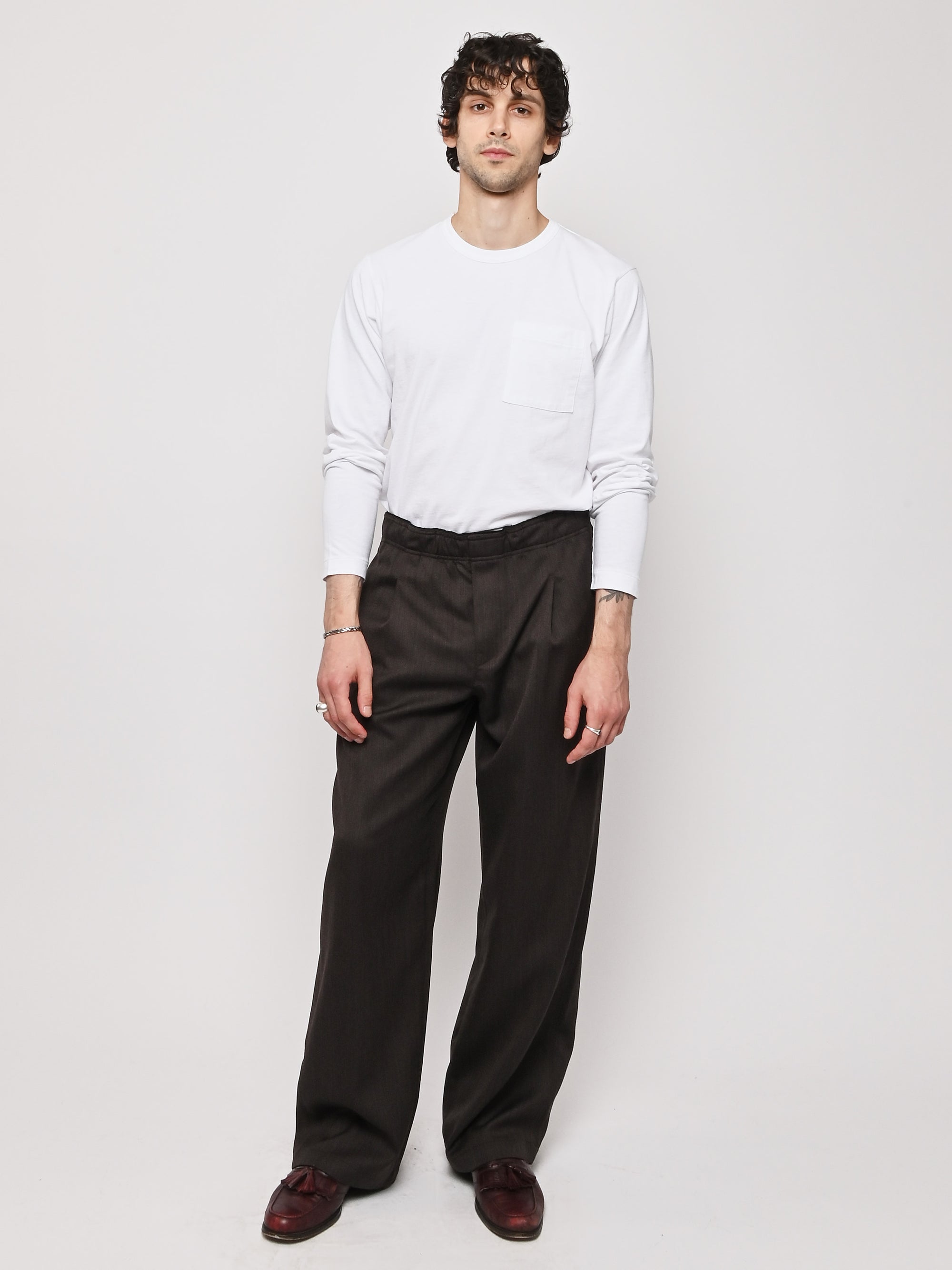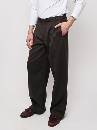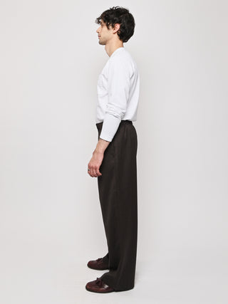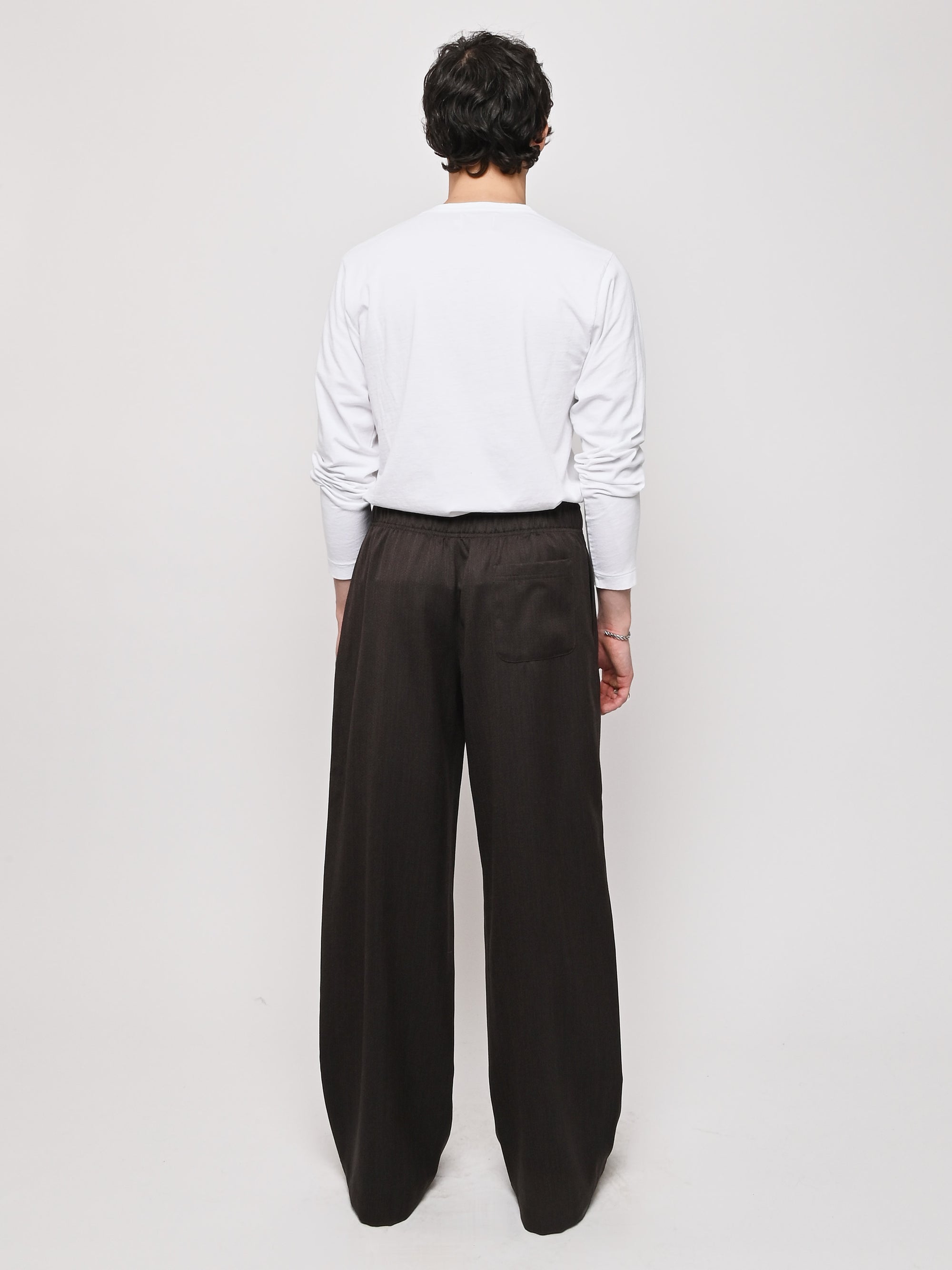 Our Legacy's Leisure Trouser in Havana Brown Chain Wool. Produced in Italian viscose and rayon fabric, the men's Leisure Trouser has a relaxed, wide fit and features an elasticated waist with premium Italian elastic trim, a hidden button fly, pleated waistband for added volume through the leg, side seam pockets and a patch back pocket. The elasticated waistband creates a slight contrast by popping up above the shell, combining loungewear comfort with refined tailoring details.