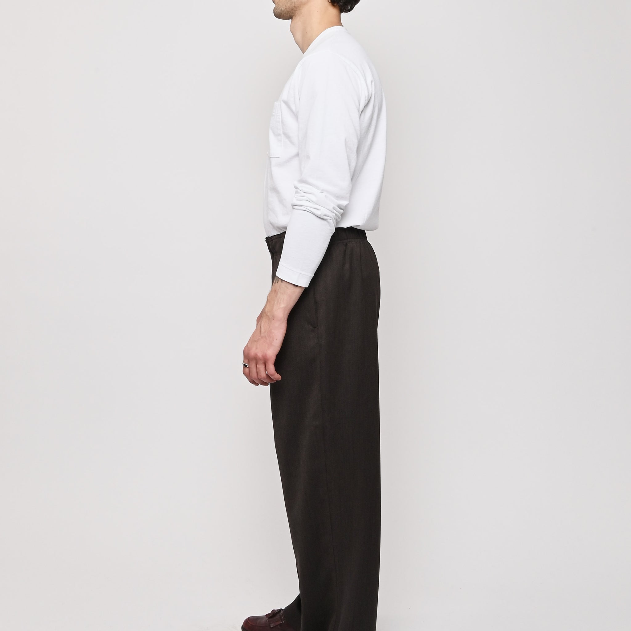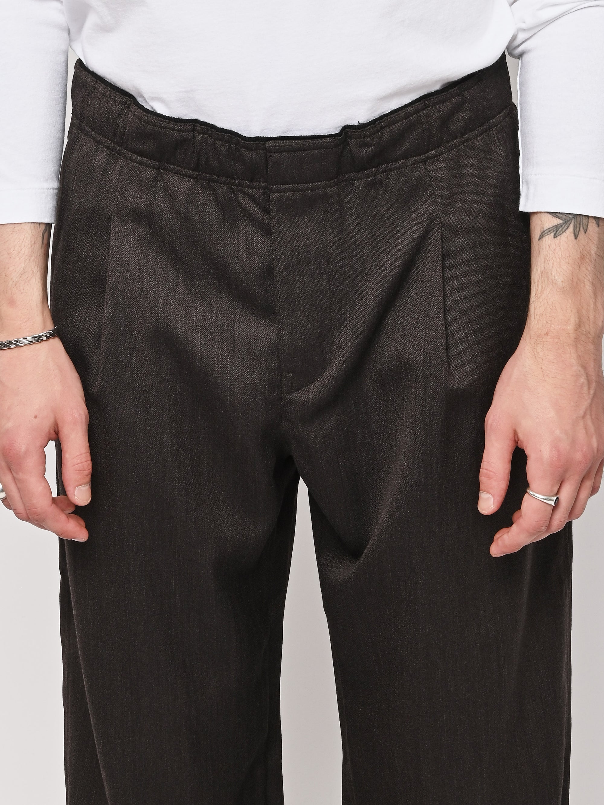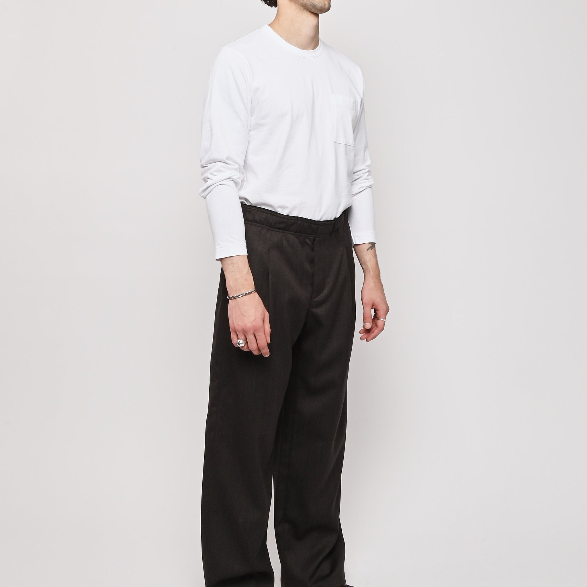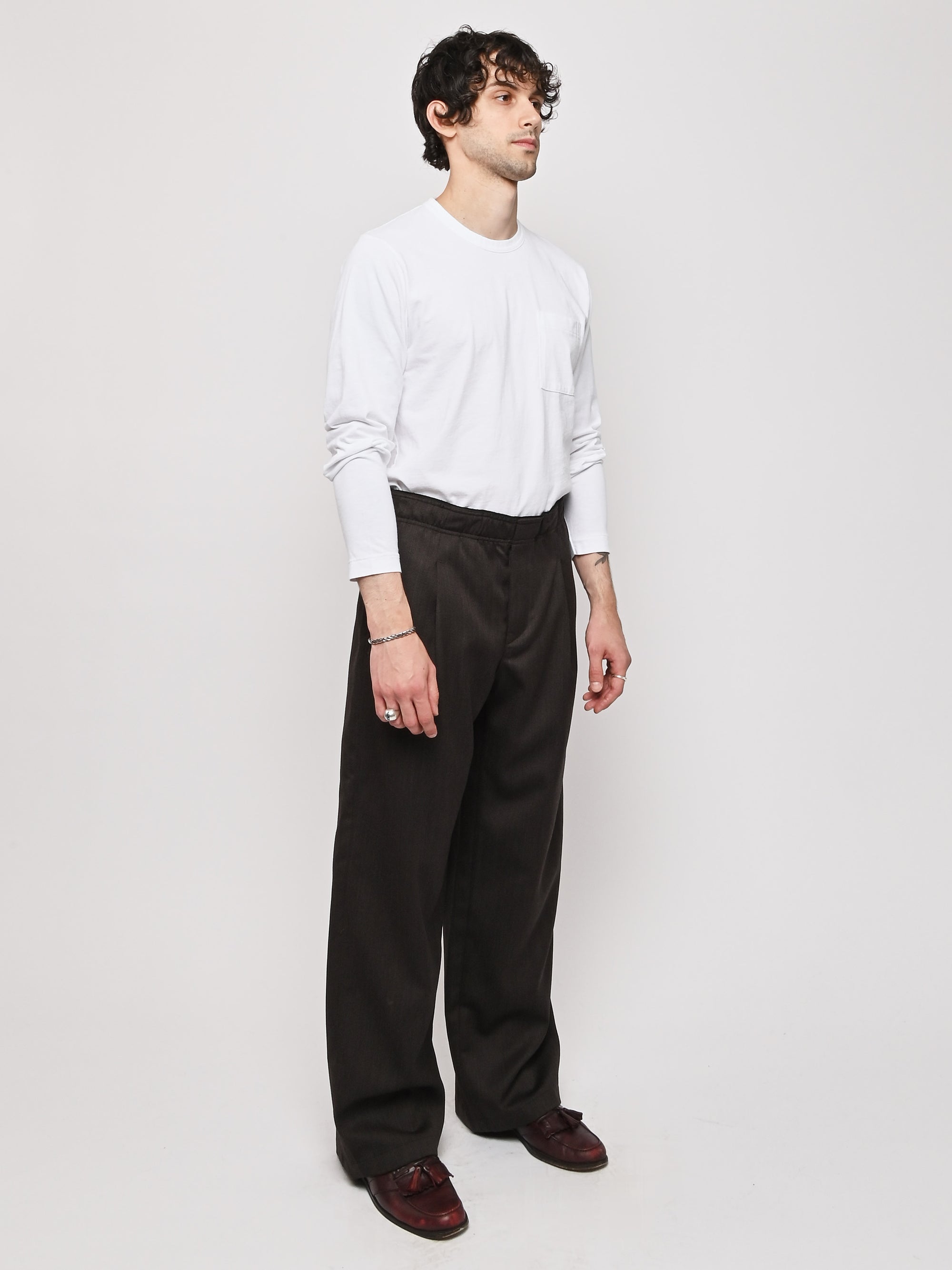 Our Legacy's Leisure Trouser in Havana Brown Chain Wool. Produced in Italian viscose and rayon fabric, the men's Leisure Trouser has a relaxed, wide fit and features an elasticated waist with premium Italian elastic trim, a hidden button fly, pleated waistband for added volume through the leg, side seam pockets and a patch back pocket. The elasticated waistband creates a slight contrast by popping up above the shell, combining loungewear comfort with refined tailoring details.