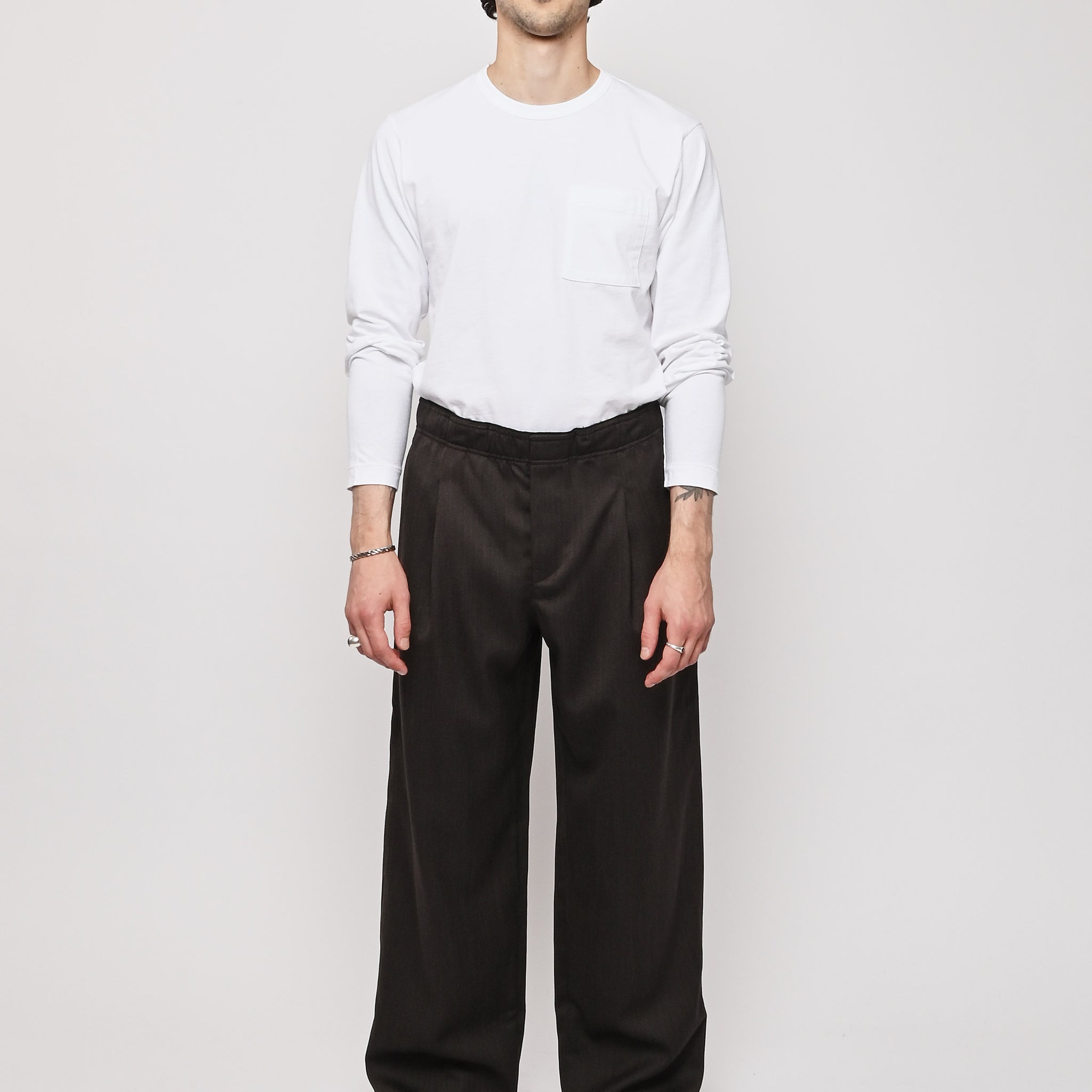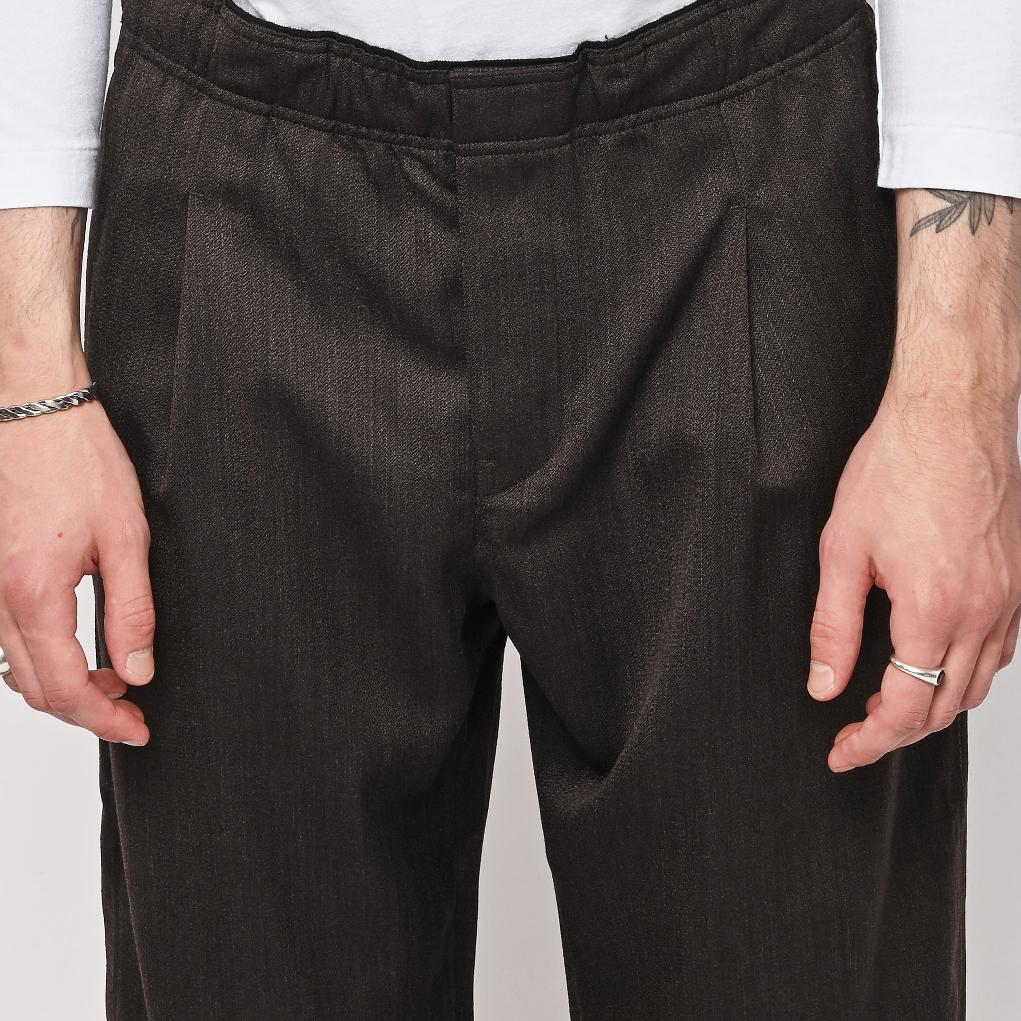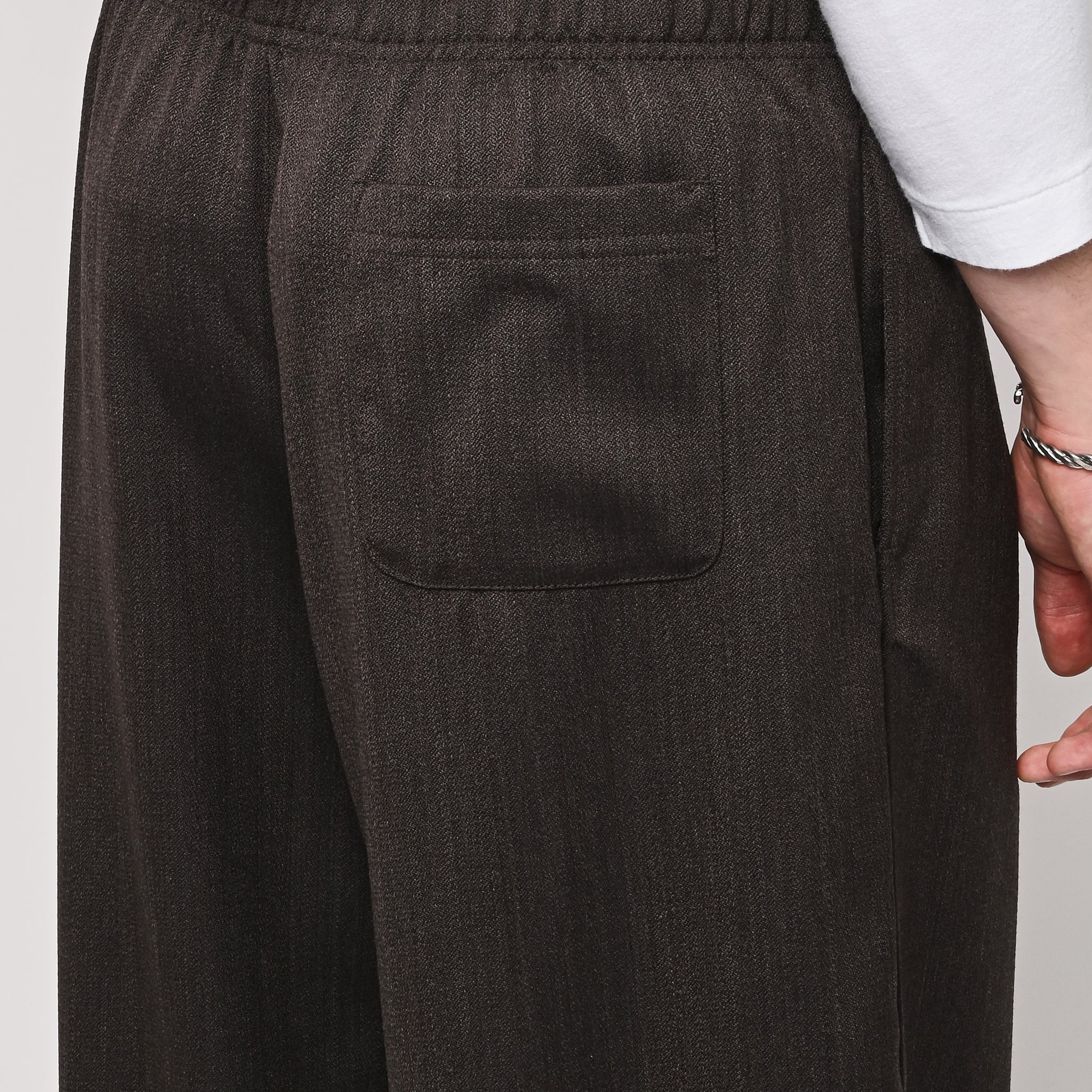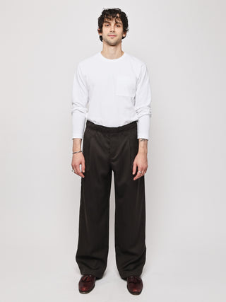 Our Legacy's Leisure Trouser in Havana Brown Chain Wool. Produced in Italian viscose and rayon fabric, the men's Leisure Trouser has a relaxed, wide fit and features an elasticated waist with premium Italian elastic trim, a hidden button fly, pleated waistband for added volume through the leg, side seam pockets and a patch back pocket. The elasticated waistband creates a slight contrast by popping up above the shell, combining loungewear comfort with refined tailoring details.