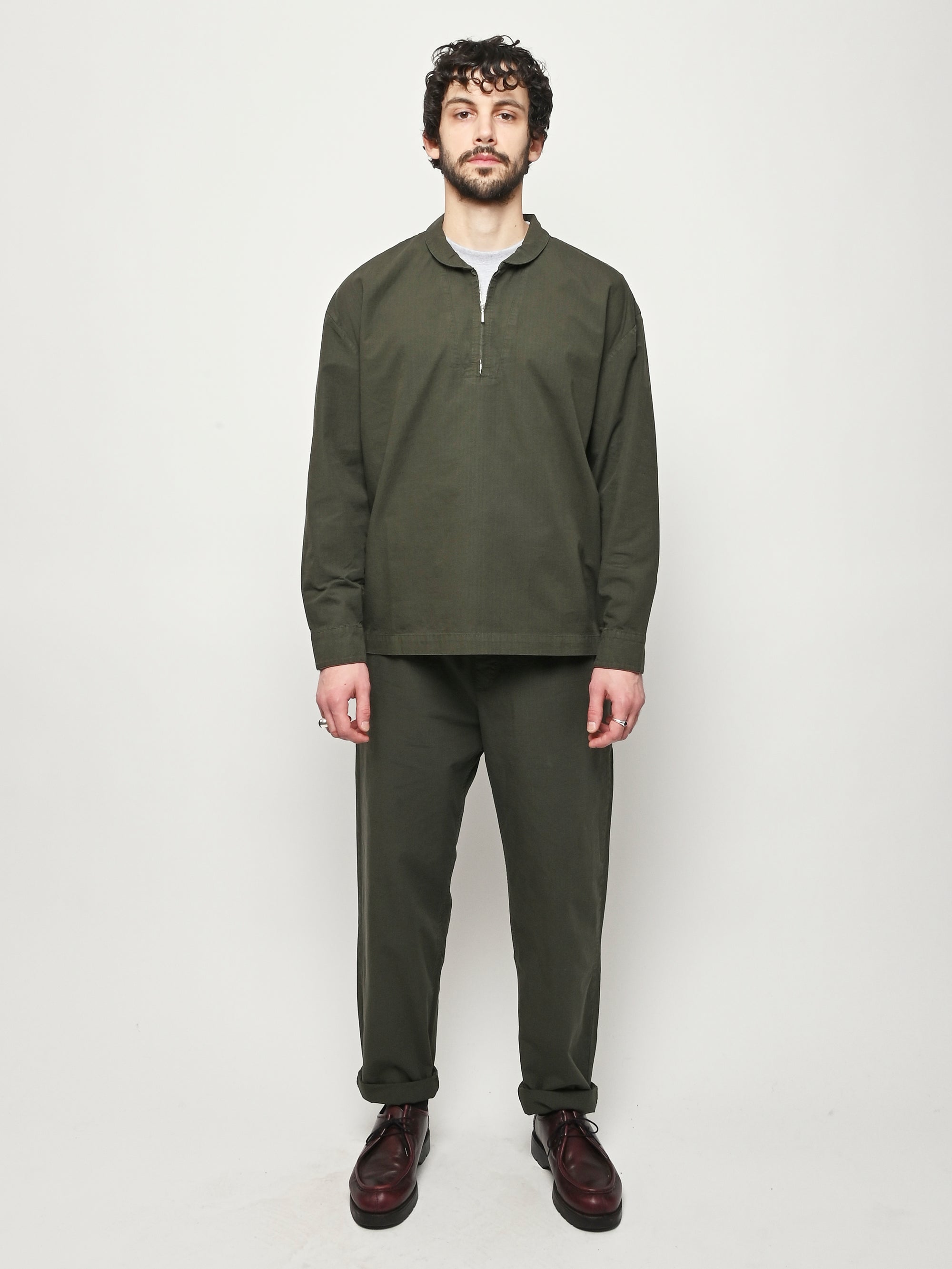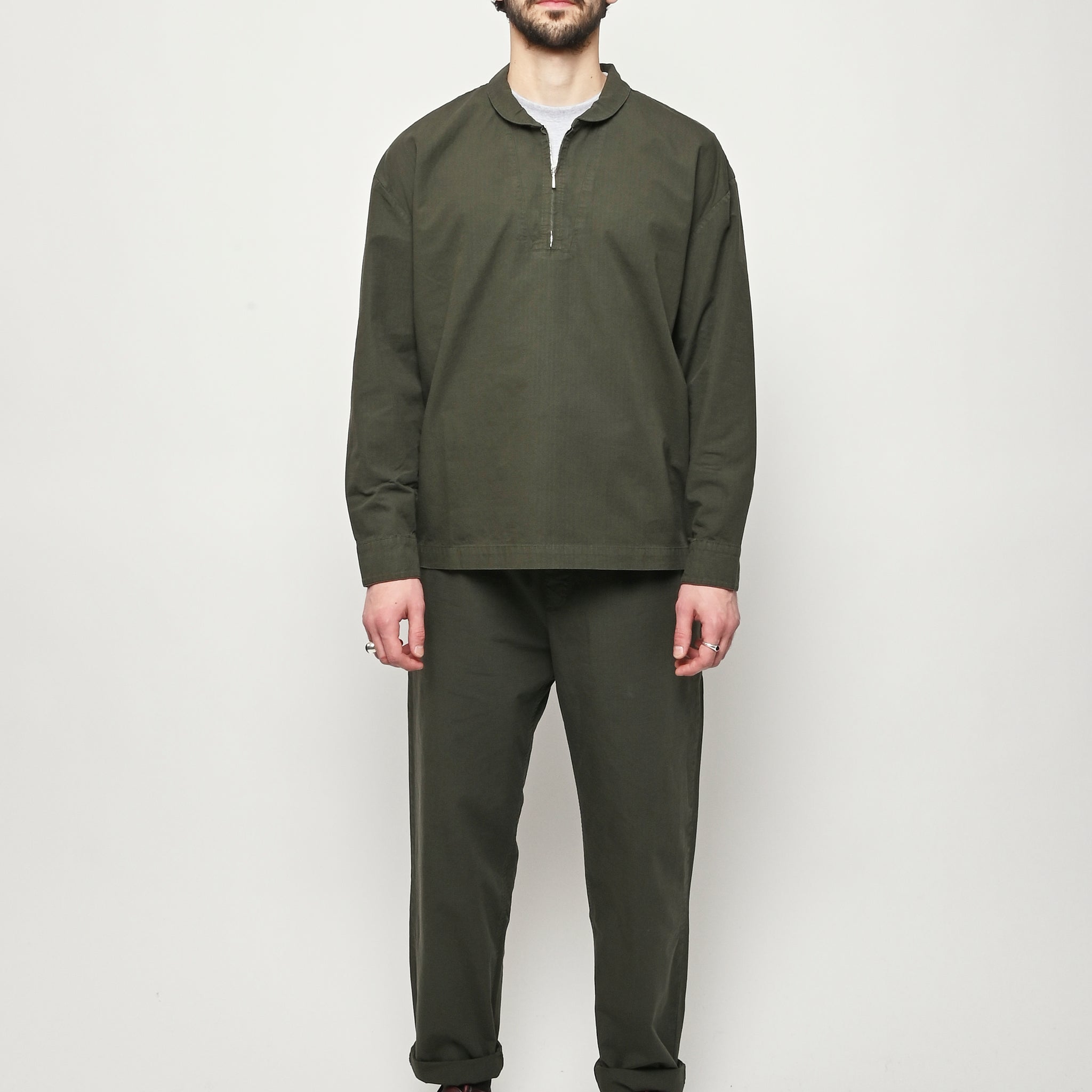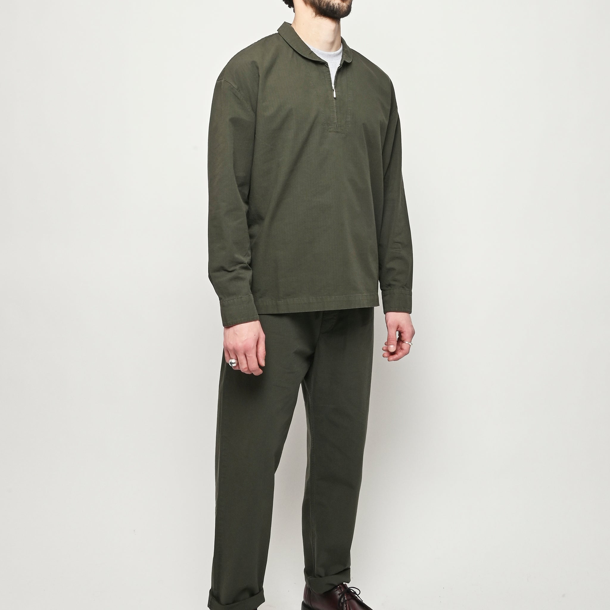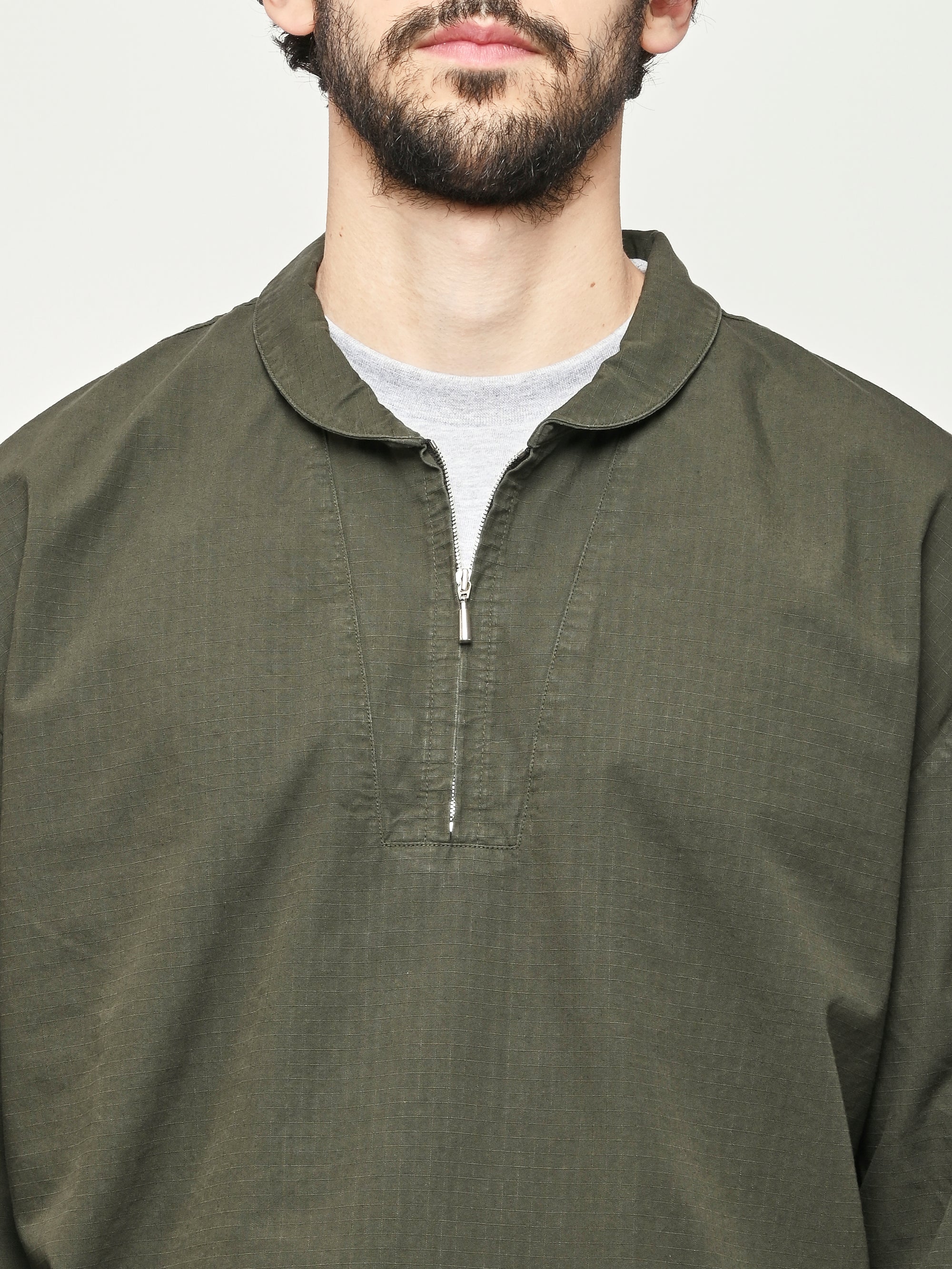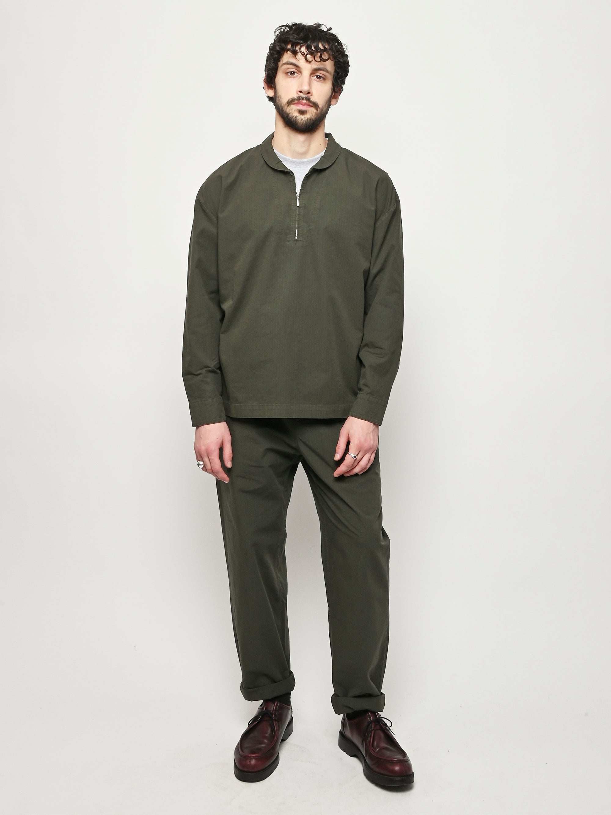 This pop-over shirt by A Kind of Guise features a sleek metal zipper and a rolled collar. Inspired by the classical fishermen shirt, it features overcut shoulders and a boxy fit. It is made in cotton ripstop fabric with a visible grid structure and a garment-dyed deep tone.