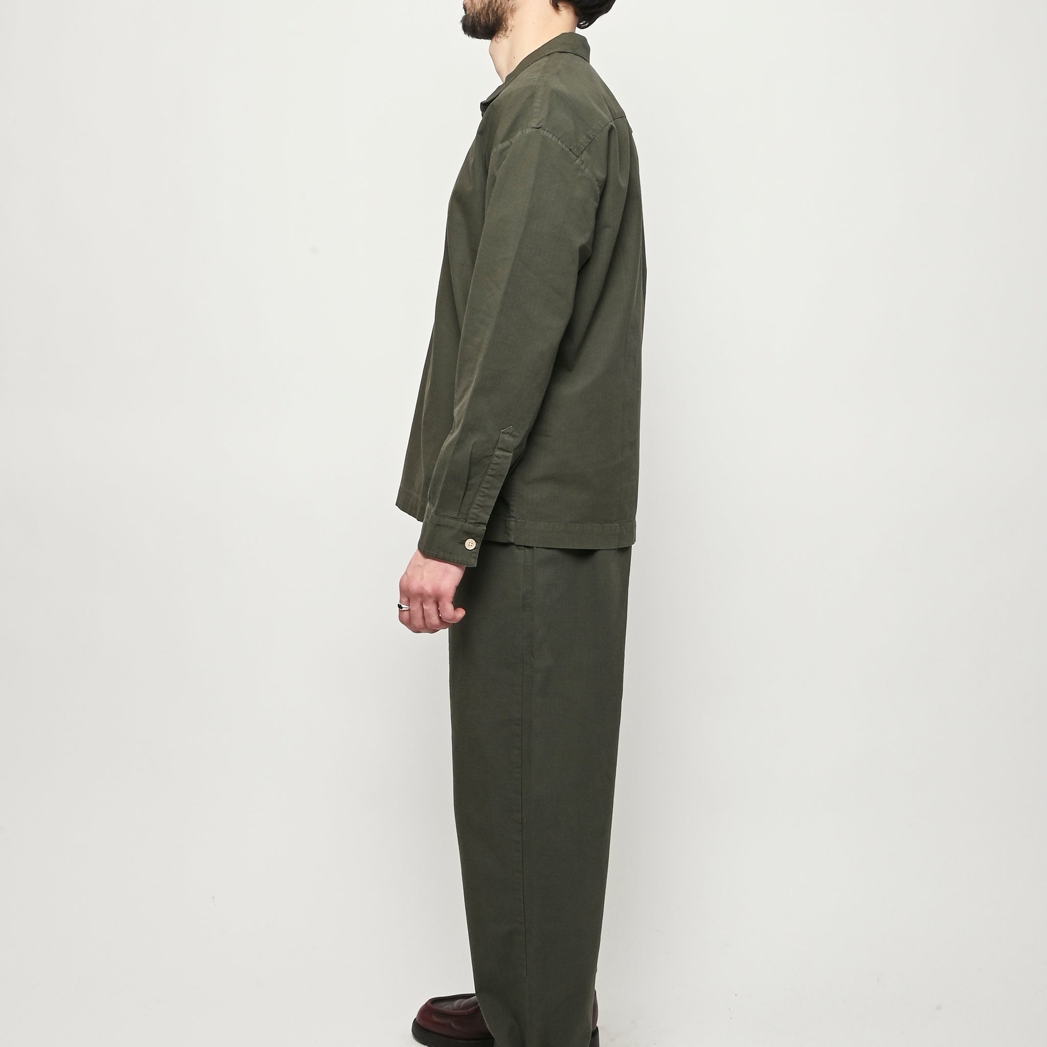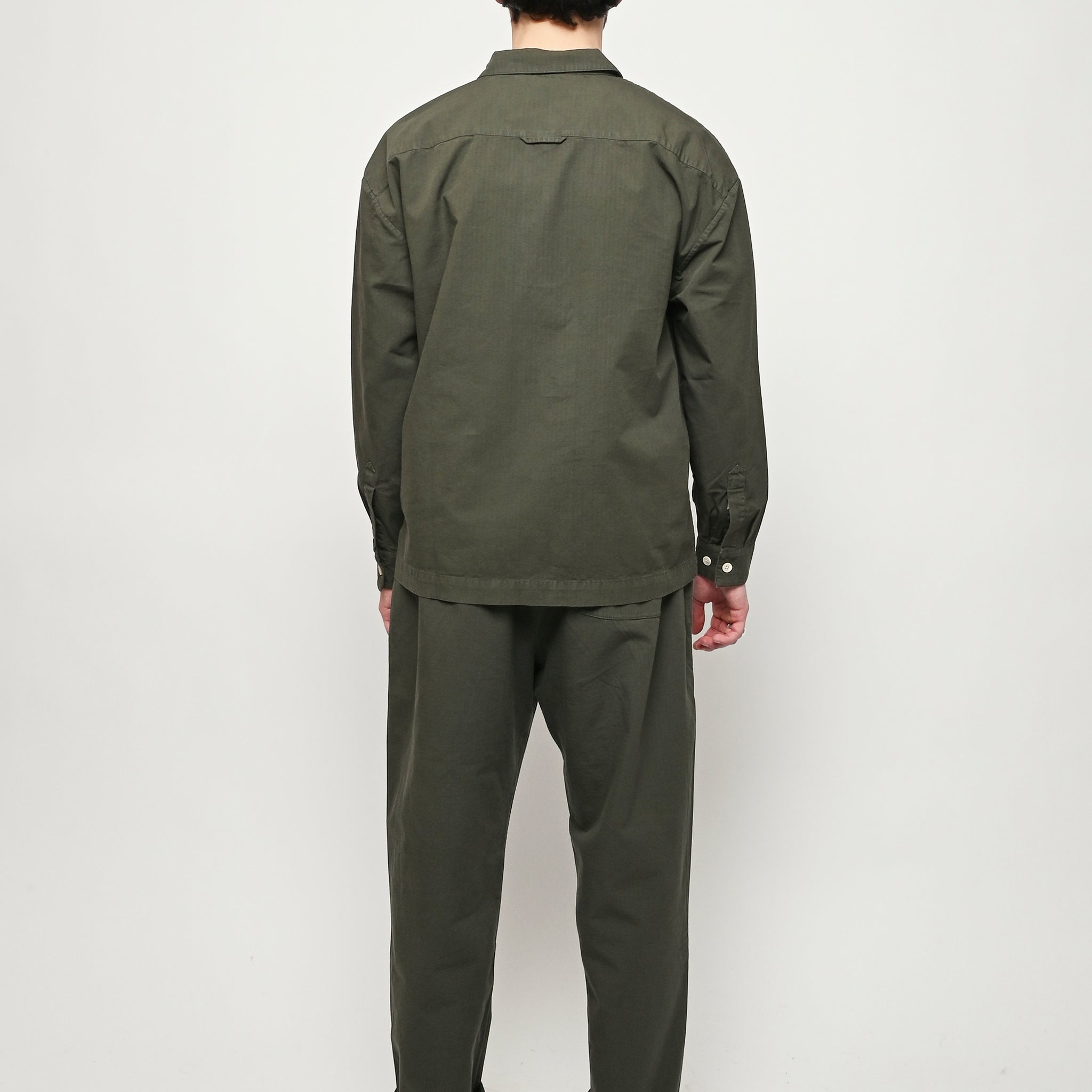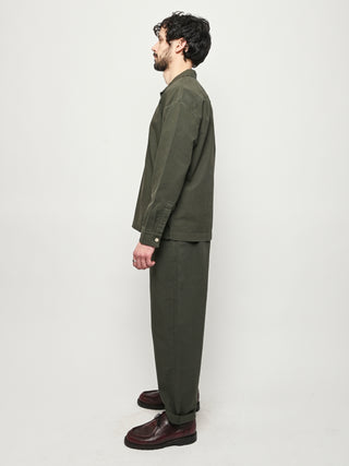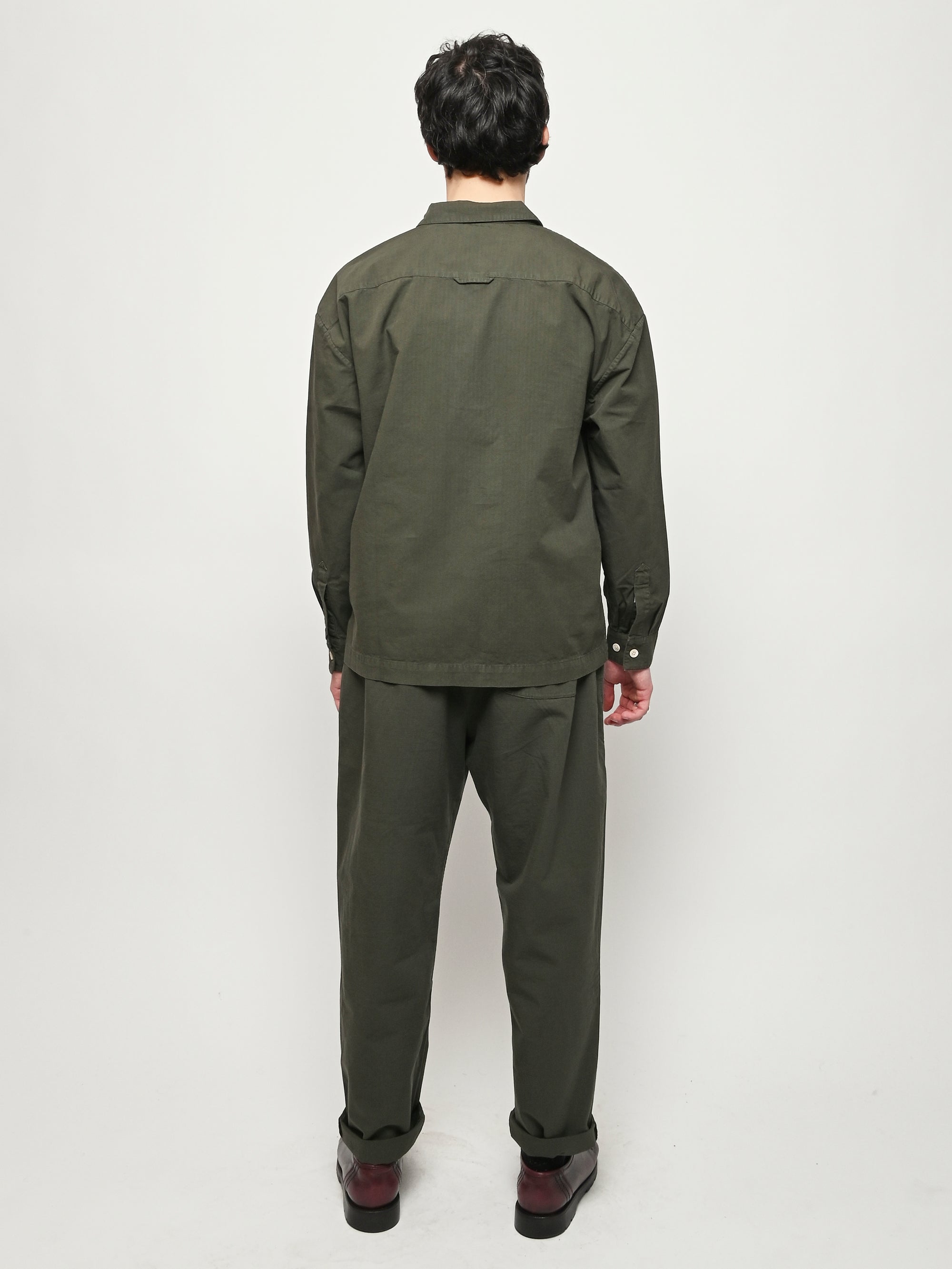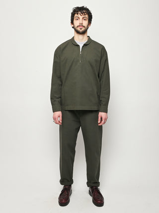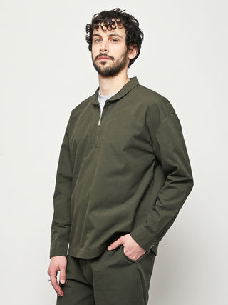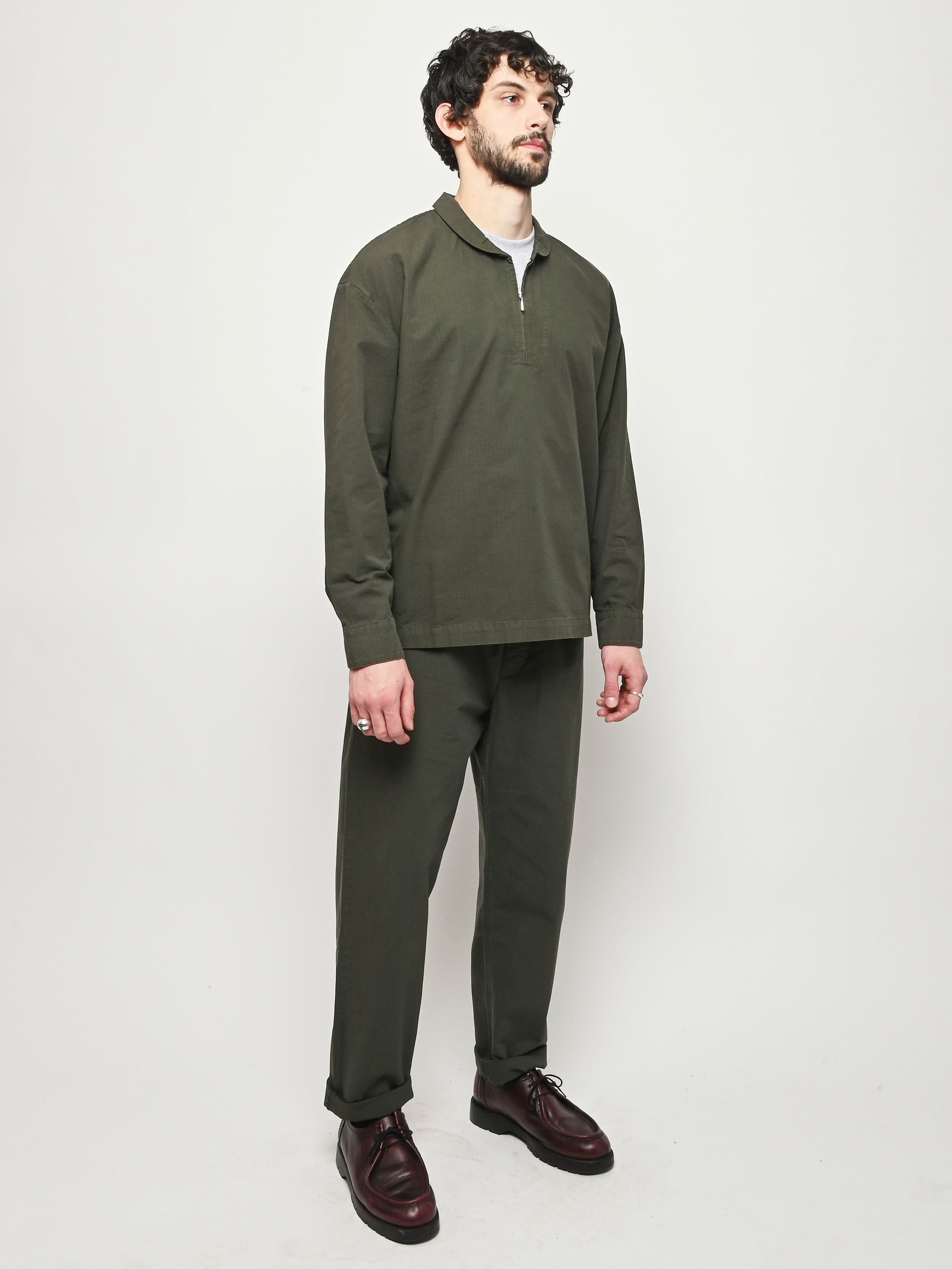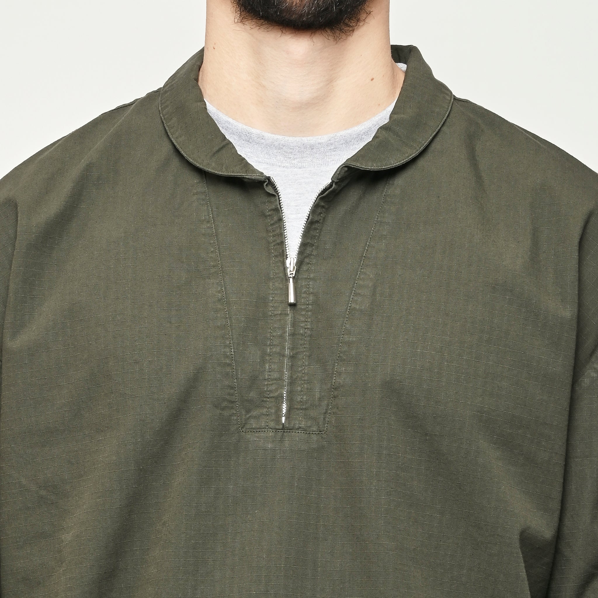 This pop-over shirt by A Kind of Guise features a sleek metal zipper and a rolled collar. Inspired by the classical fishermen shirt, it features overcut shoulders and a boxy fit. It is made in cotton ripstop fabric with a visible grid structure and a garment-dyed deep tone.