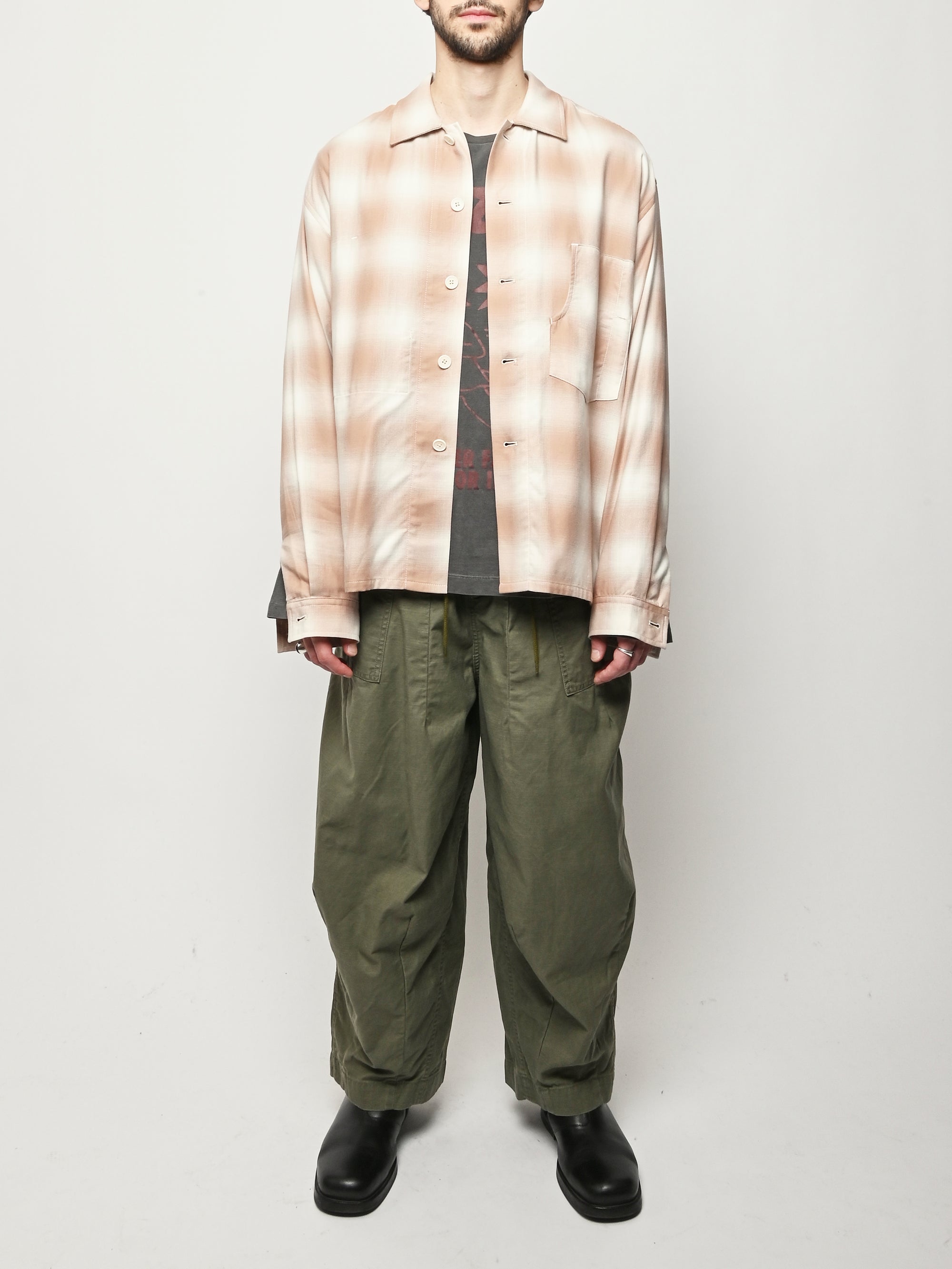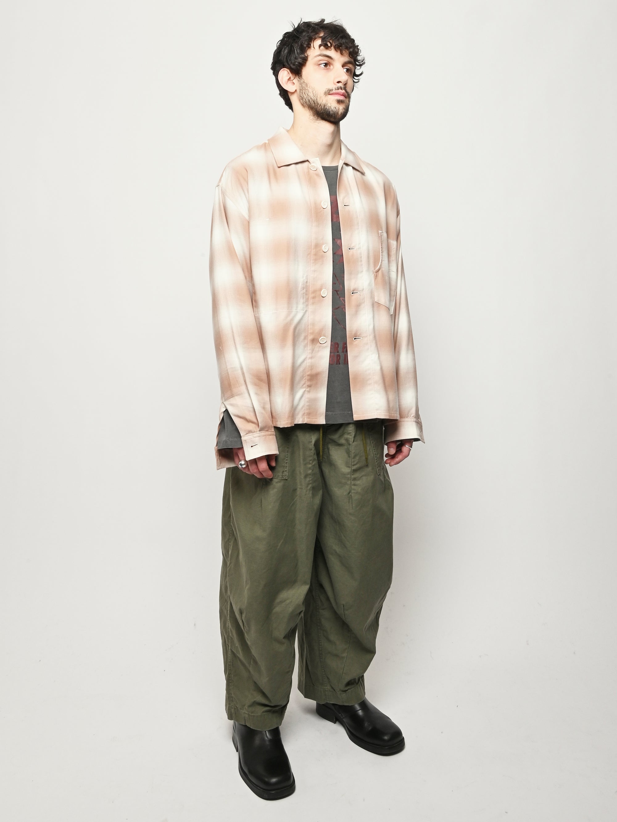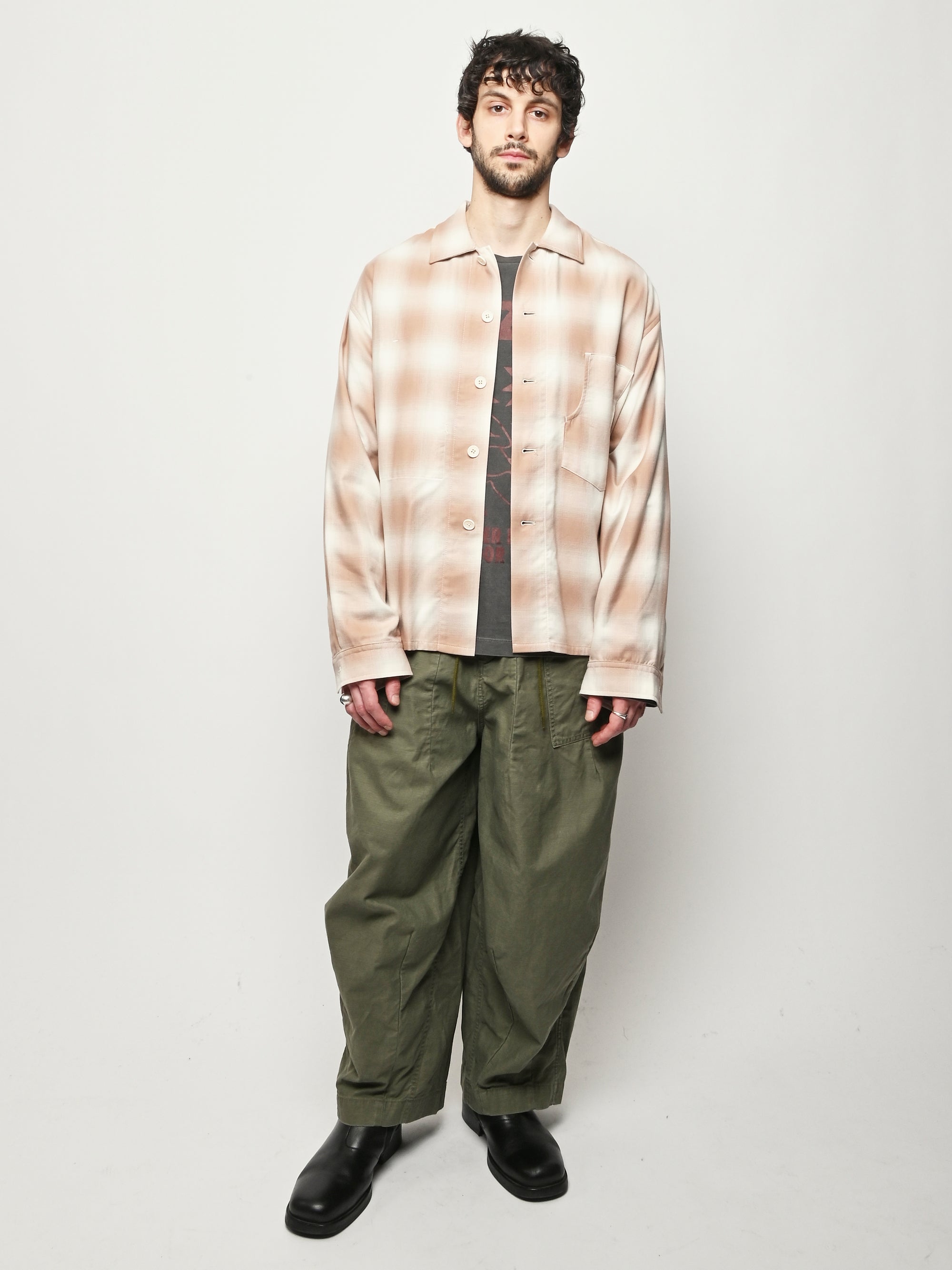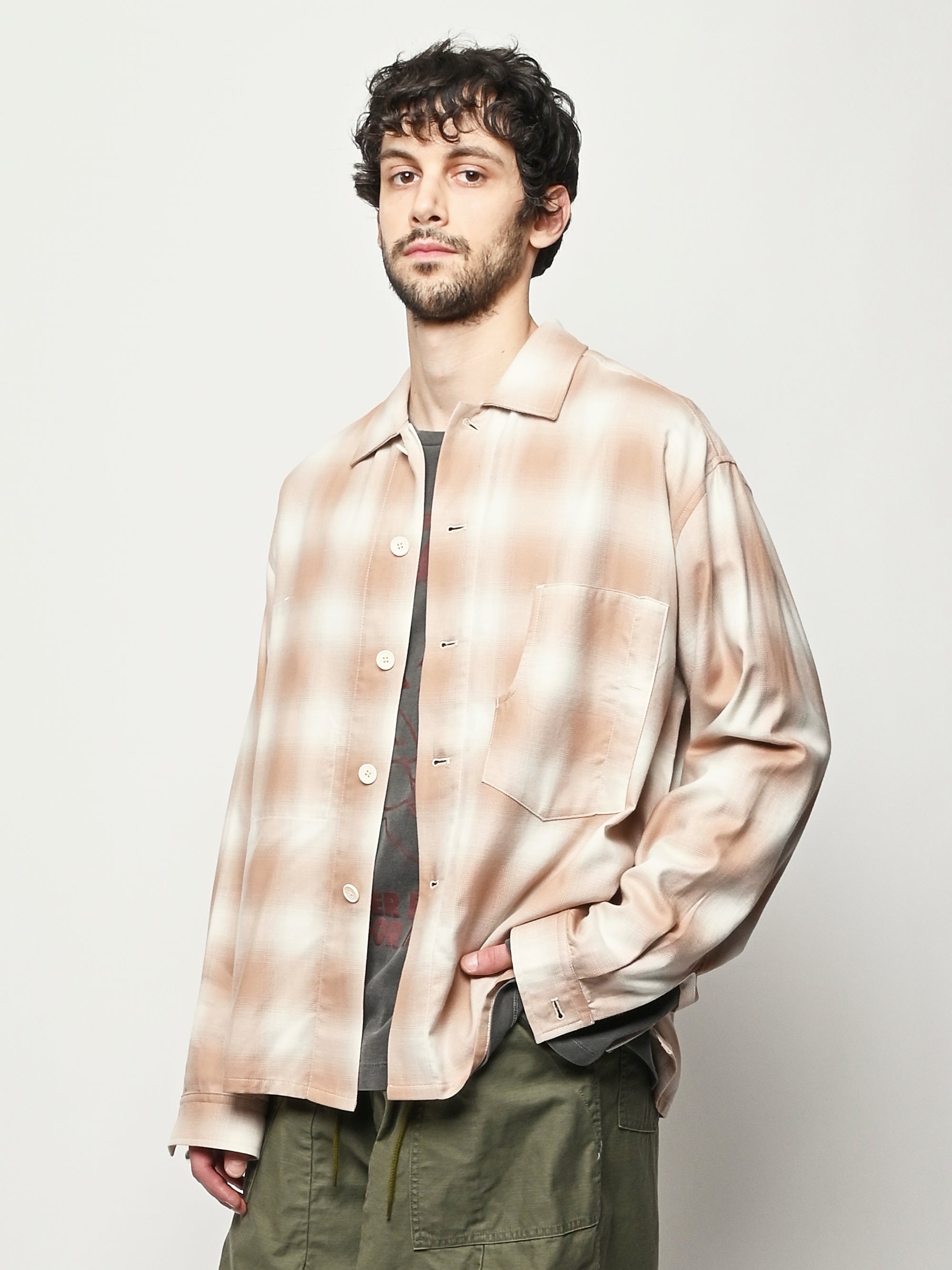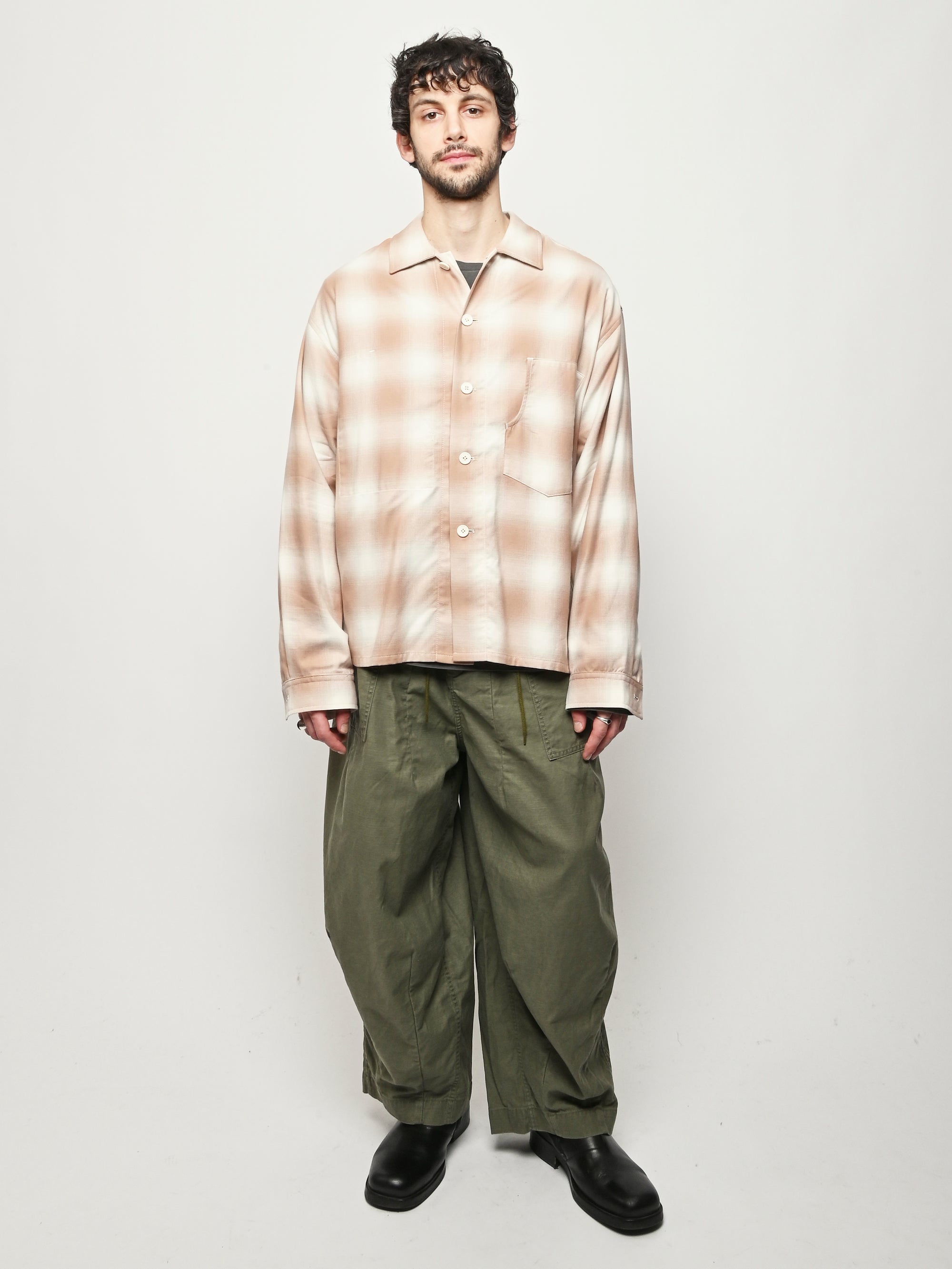 Boxy wide button-up collared shirt w/ one external left chest patch pocket & one inner right chest patch pocket.