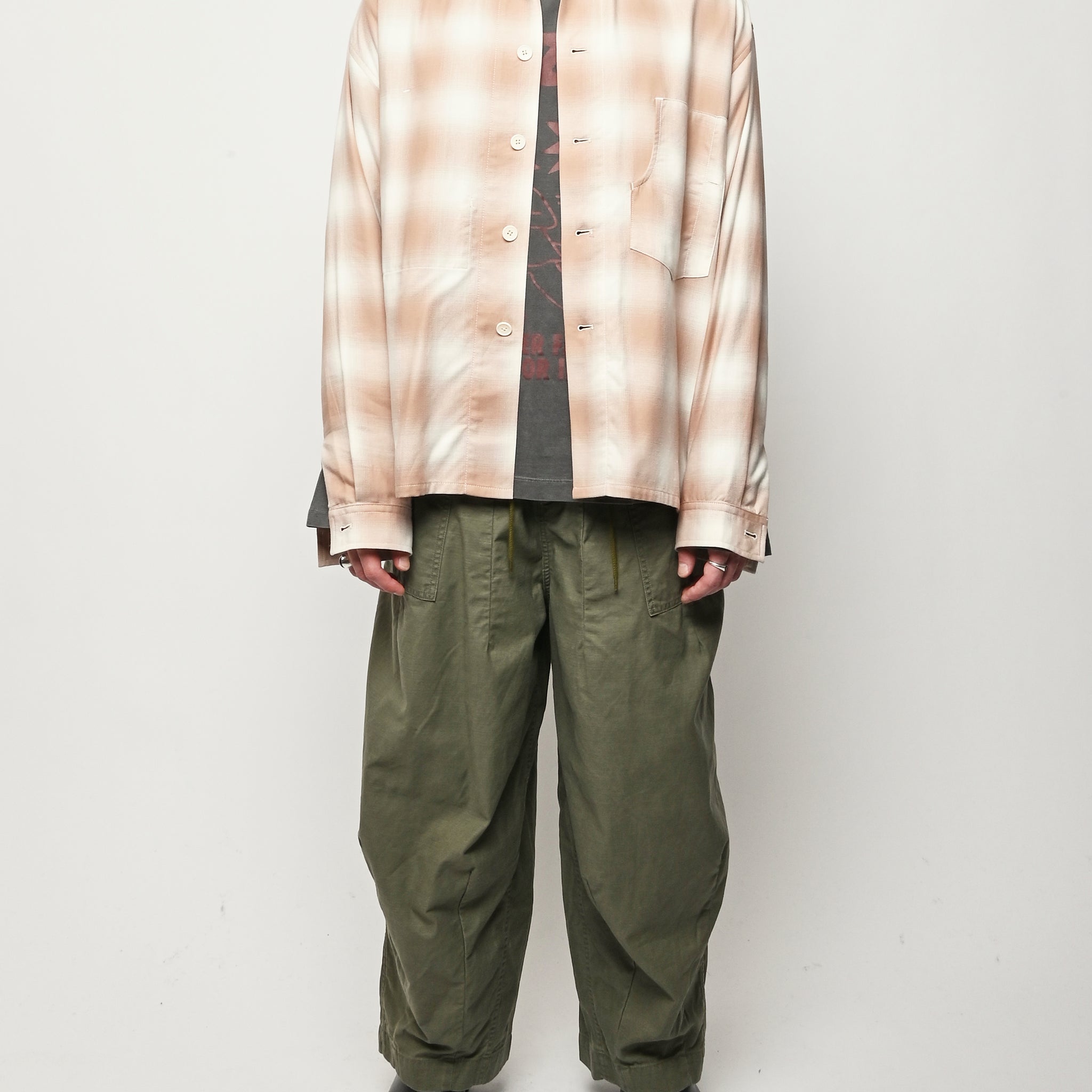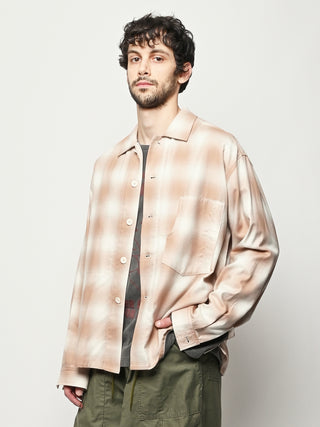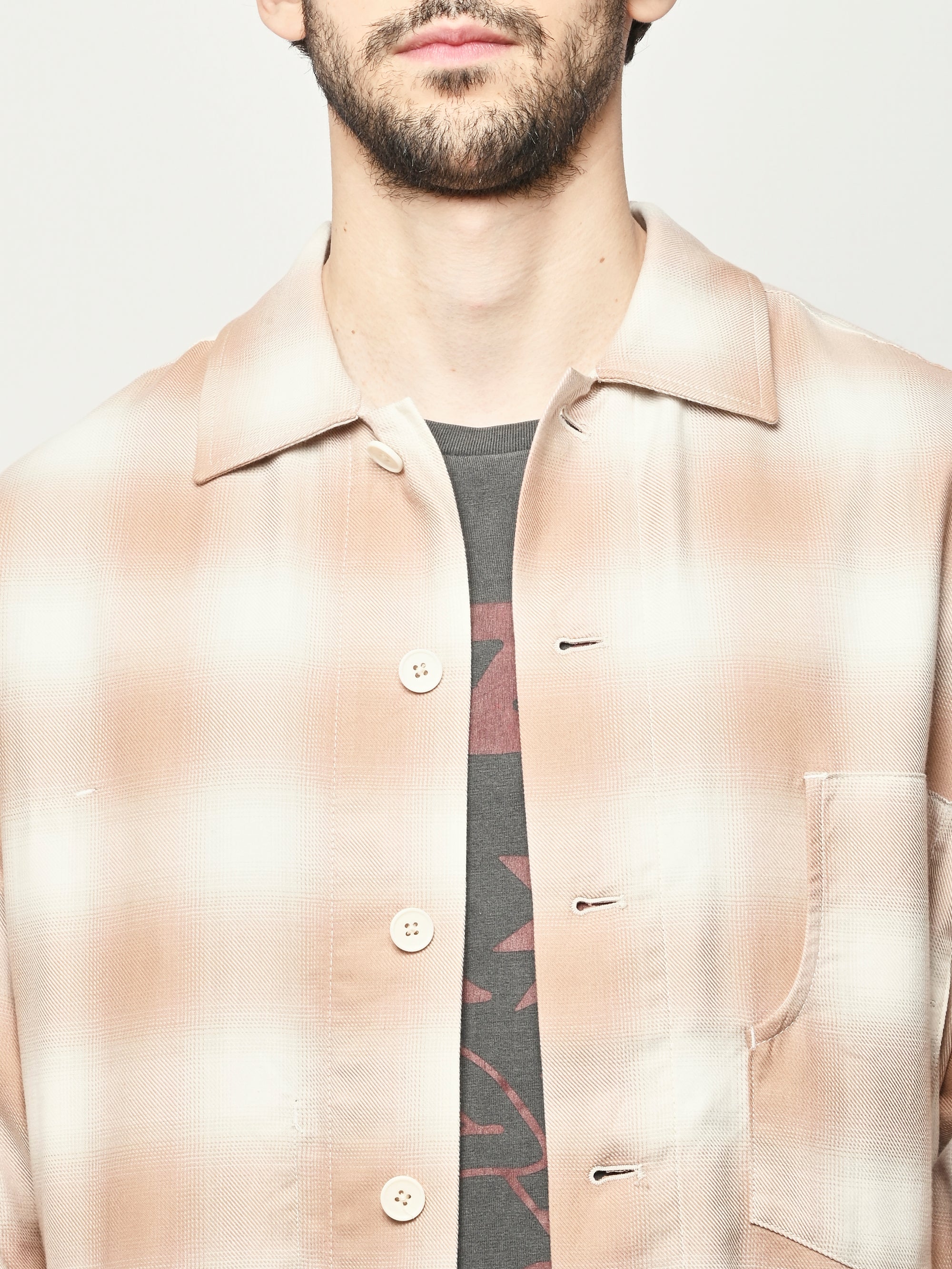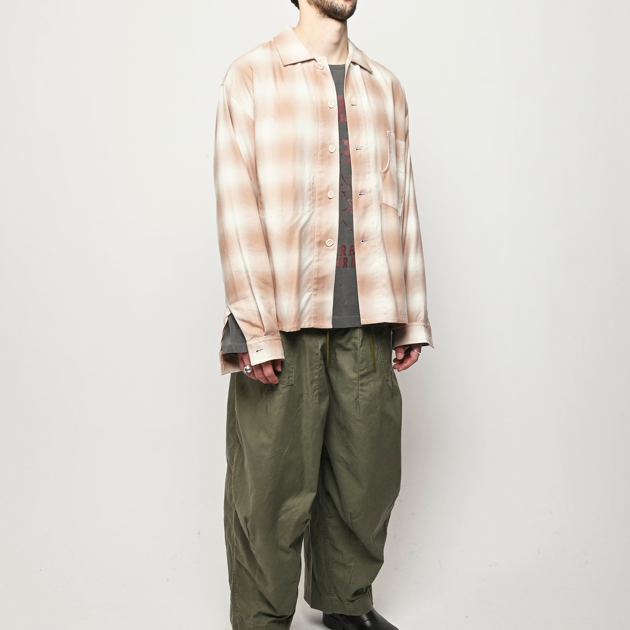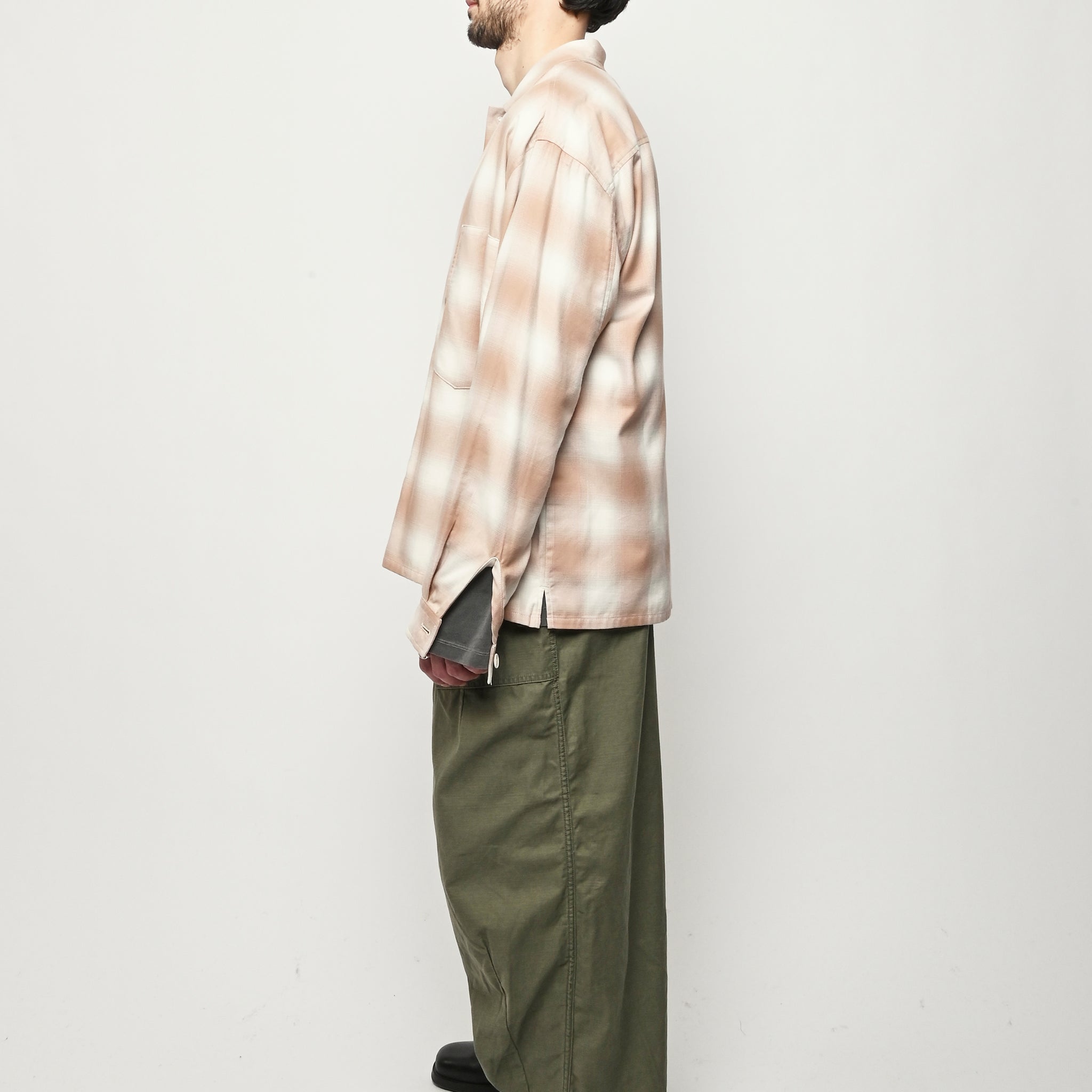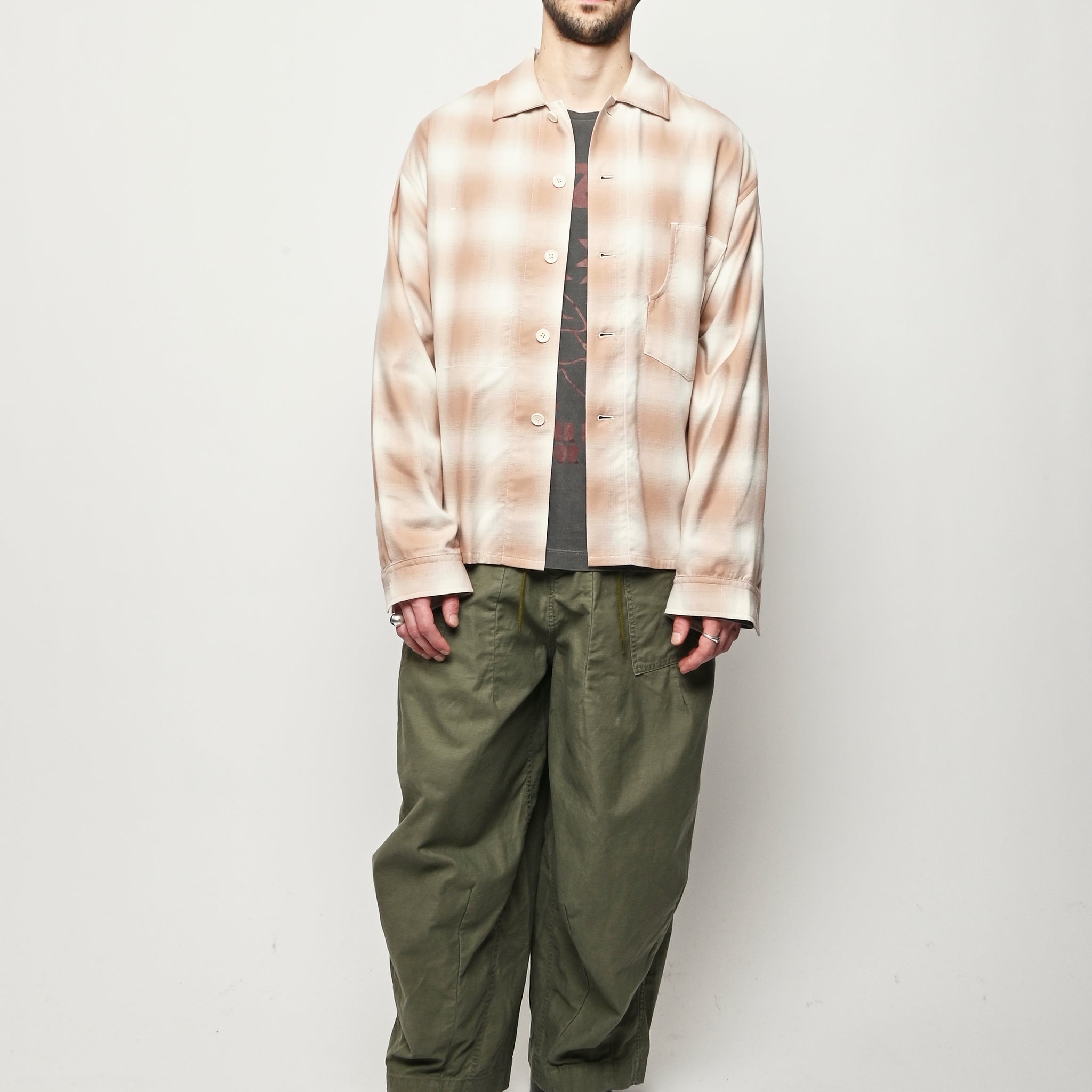 Boxy wide button-up collared shirt w/ one external left chest patch pocket & one inner right chest patch pocket.