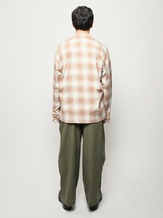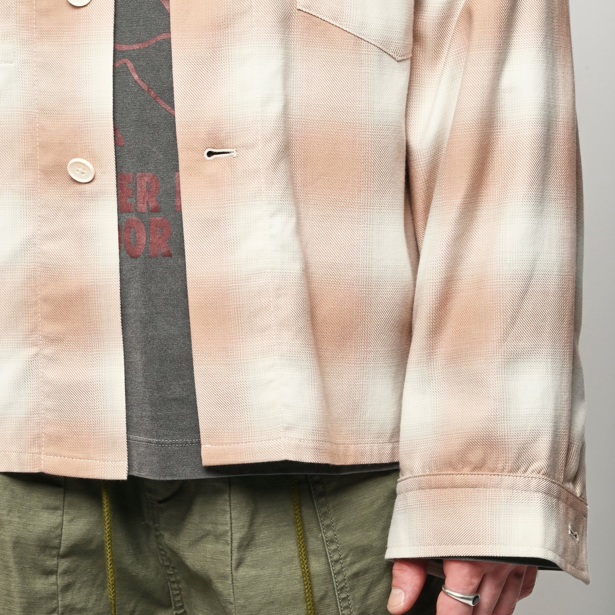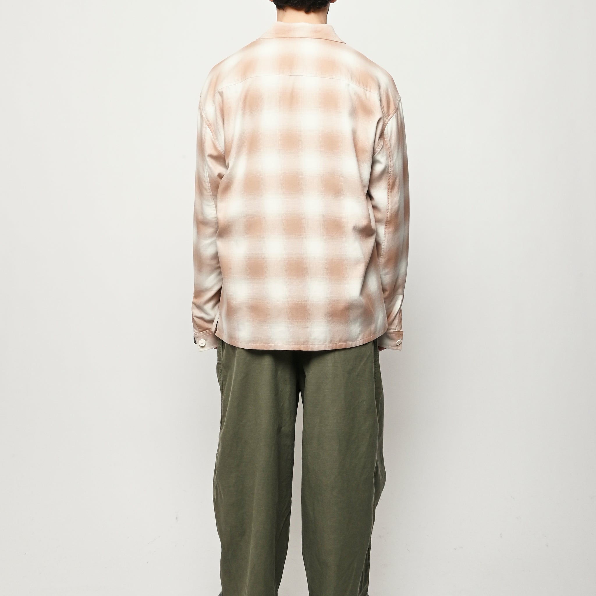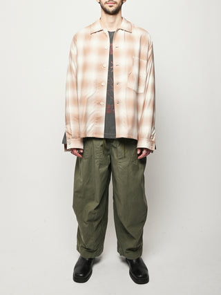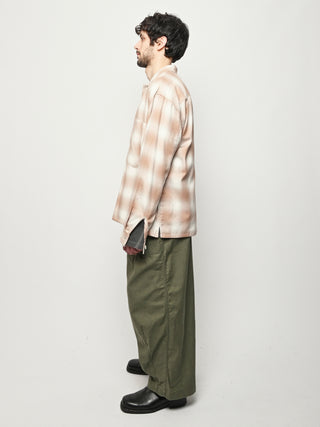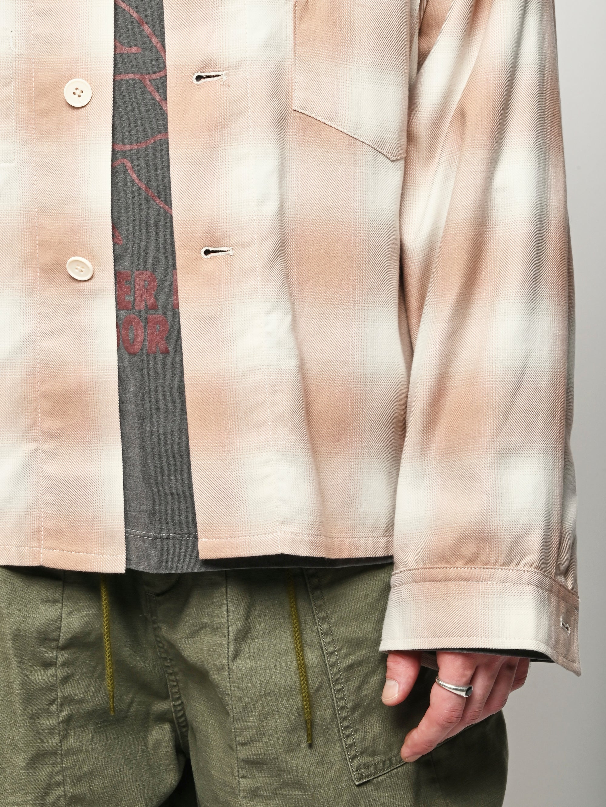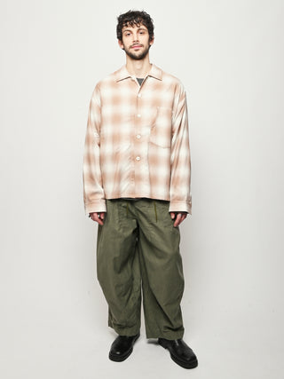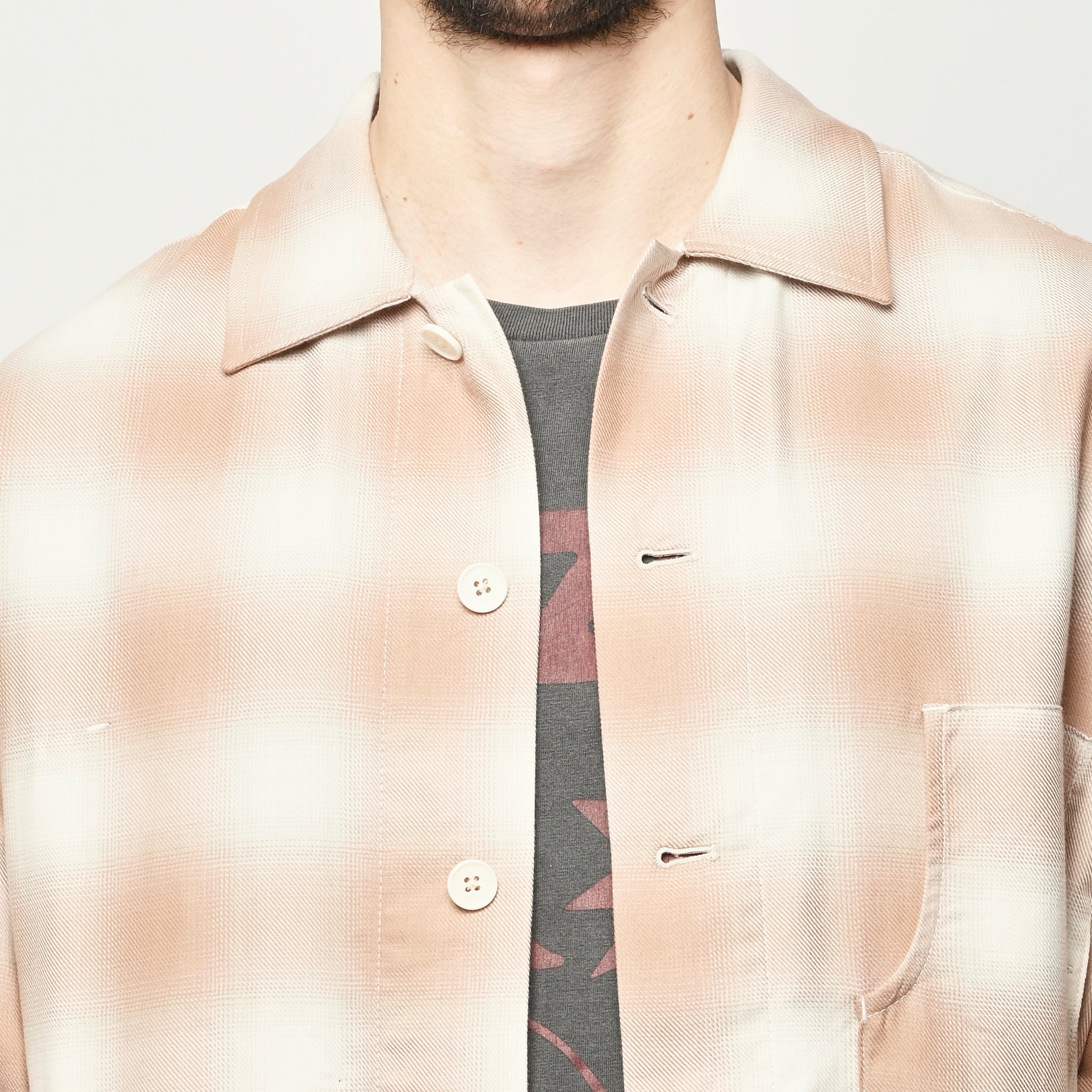 Boxy wide button-up collared shirt w/ one external left chest patch pocket & one inner right chest patch pocket.