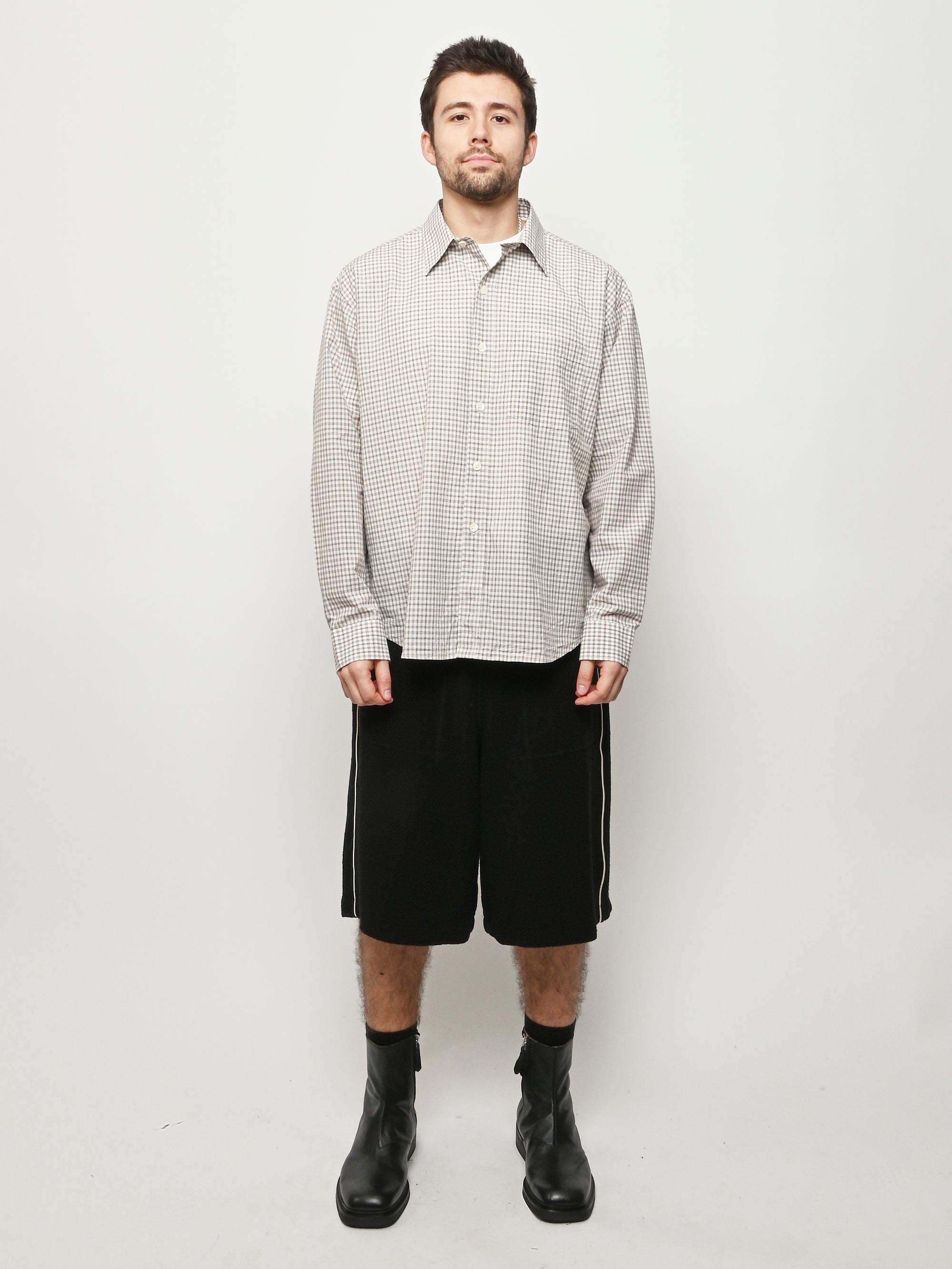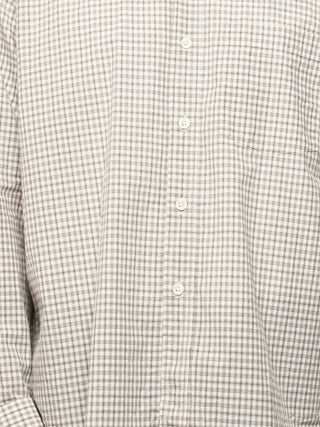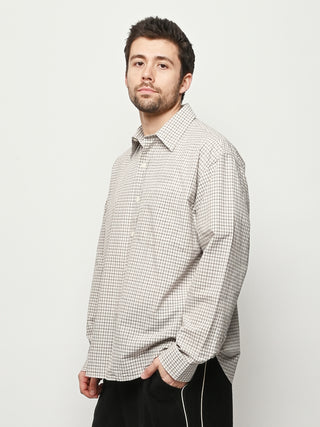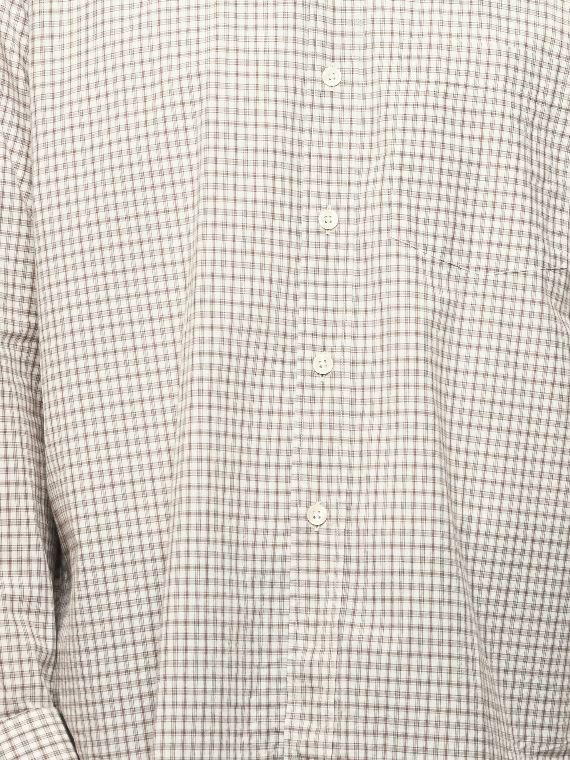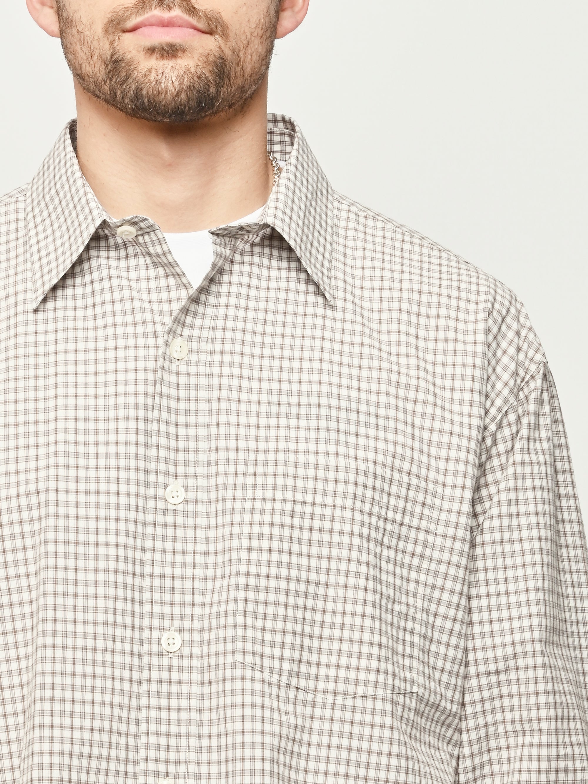 The Executive Shirt has a relaxed fit with drop shoulders and a rounded hem. Featuring a button placket, spread collar, back yoke pleats and a chest pocket. Cut from a lightweight cotton poplin with a soft hand feel, in a light brown and soft grey plaid check on a bone white ground.