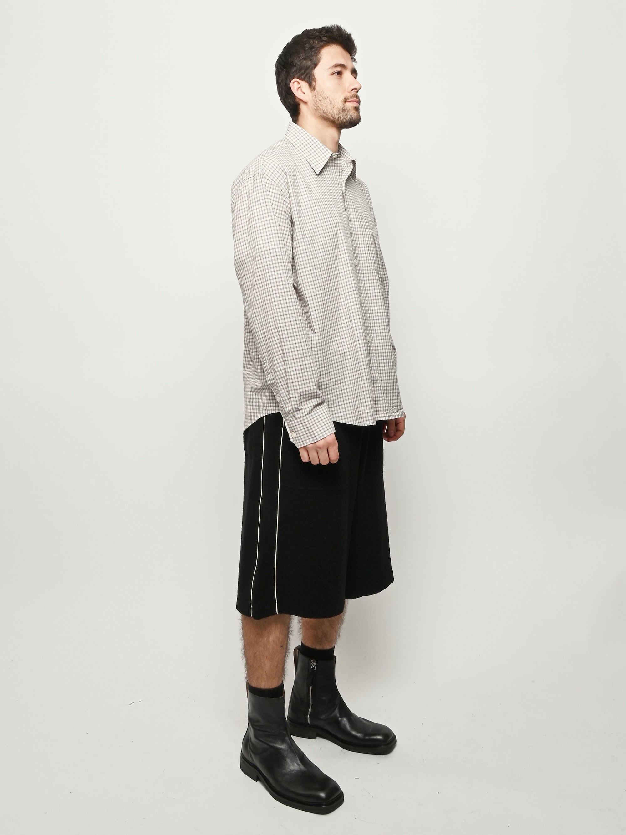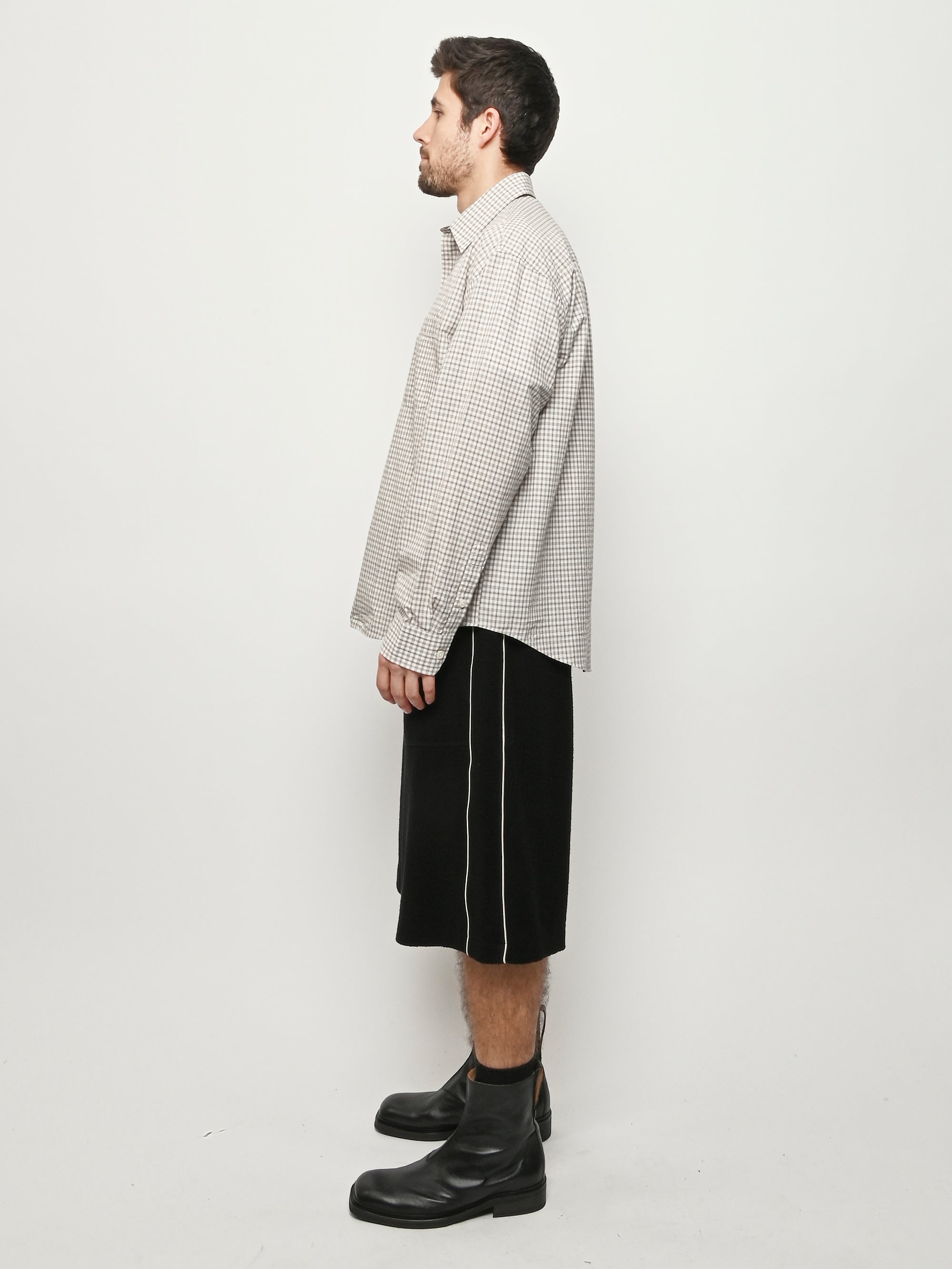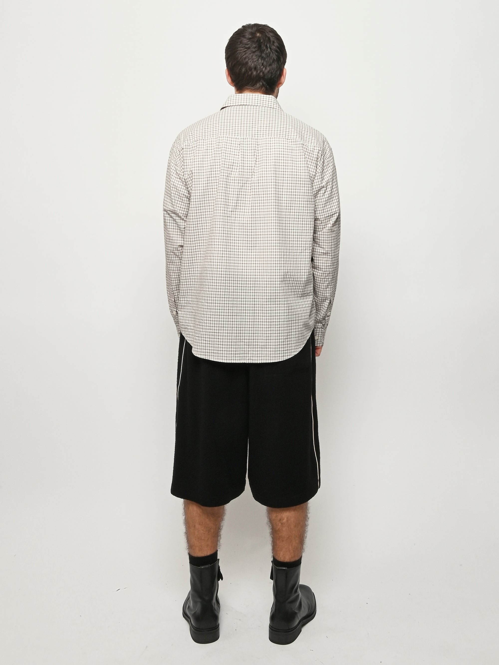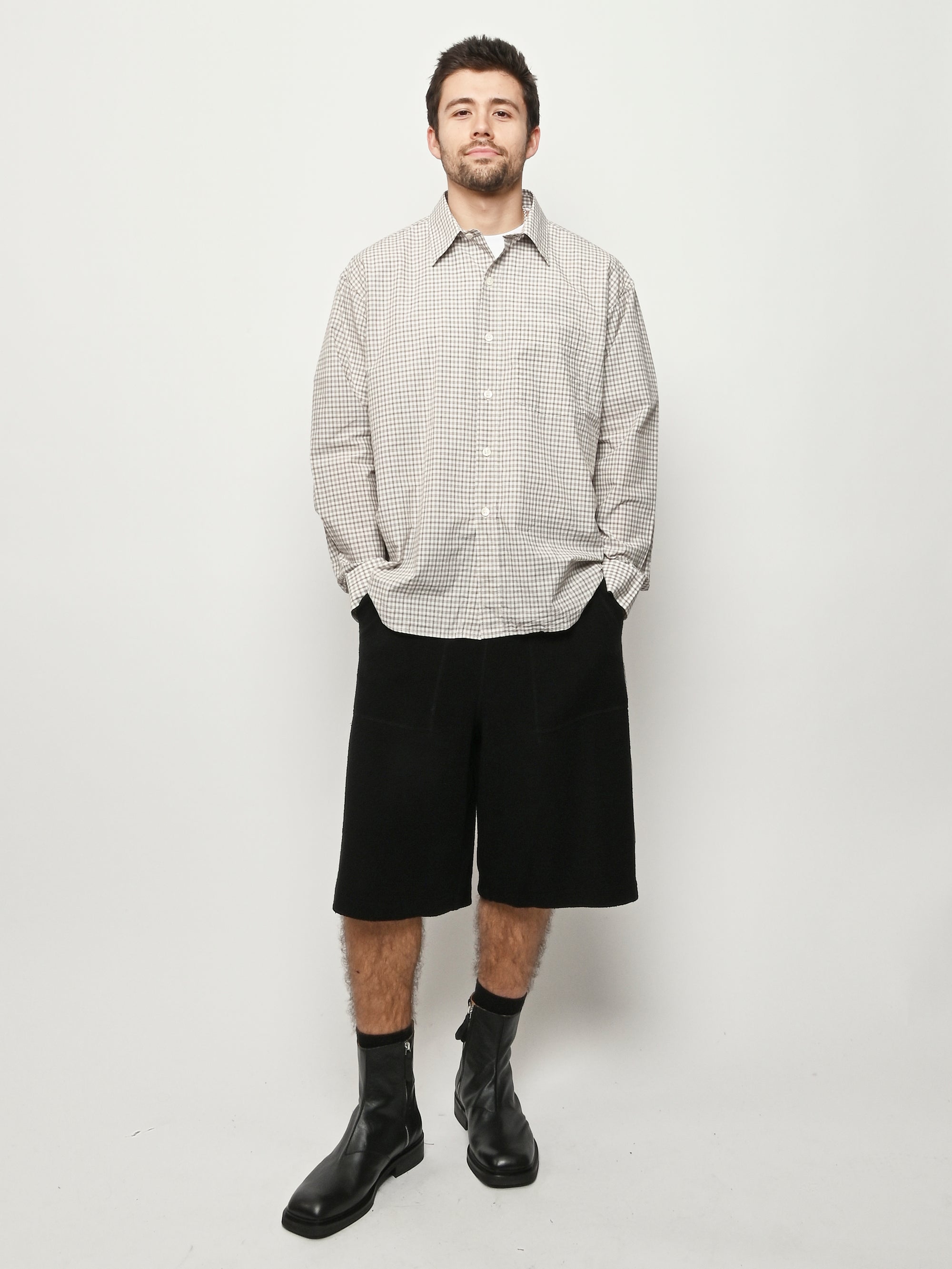 The Executive Shirt has a relaxed fit with drop shoulders and a rounded hem. Featuring a button placket, spread collar, back yoke pleats and a chest pocket. Cut from a lightweight cotton poplin with a soft hand feel, in a light brown and soft grey plaid check on a bone white ground.