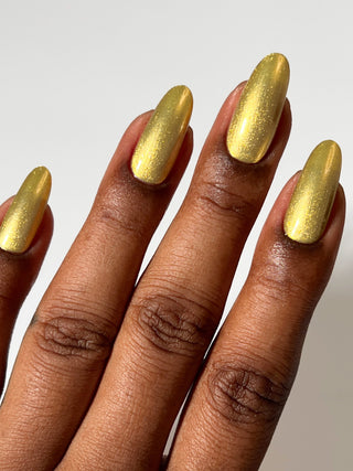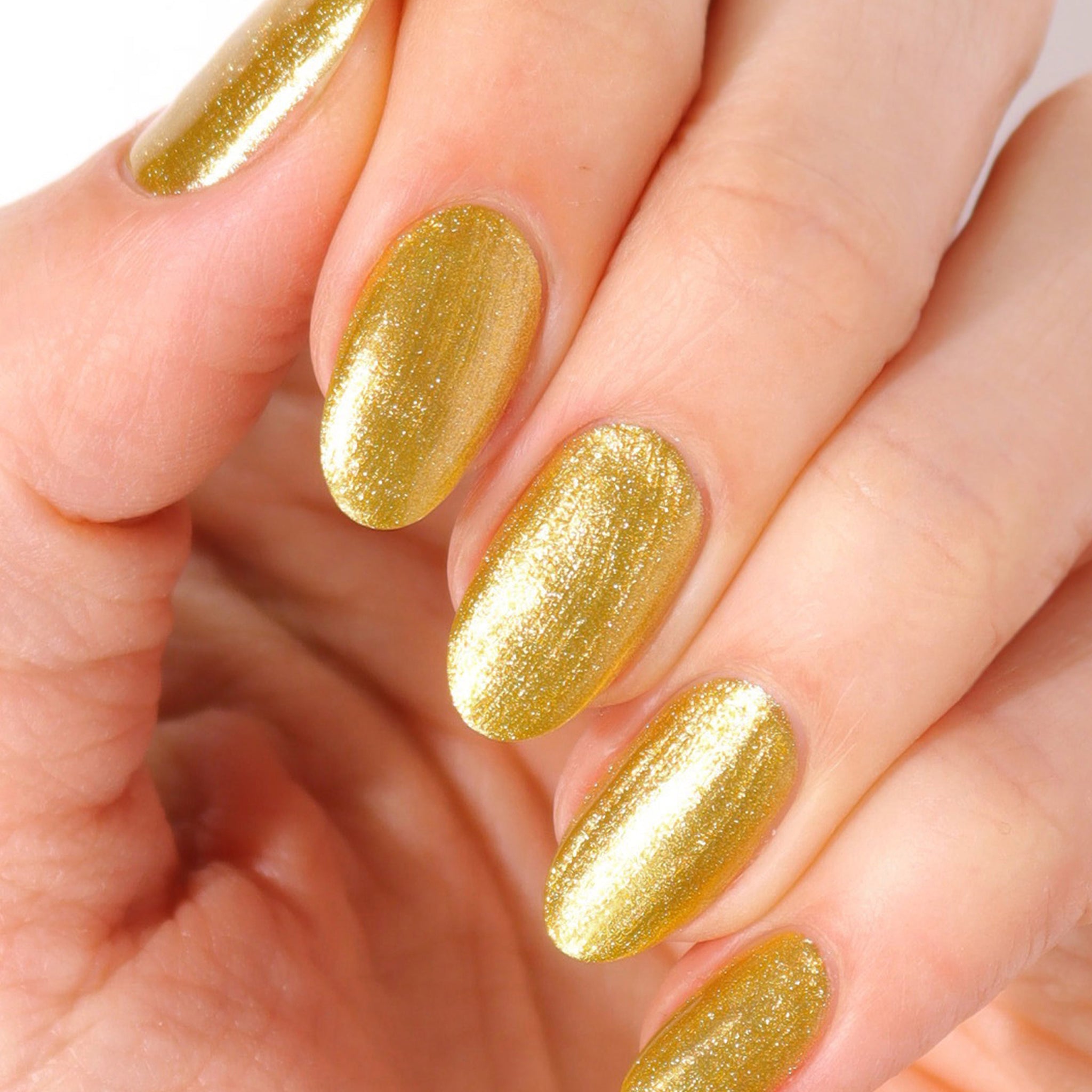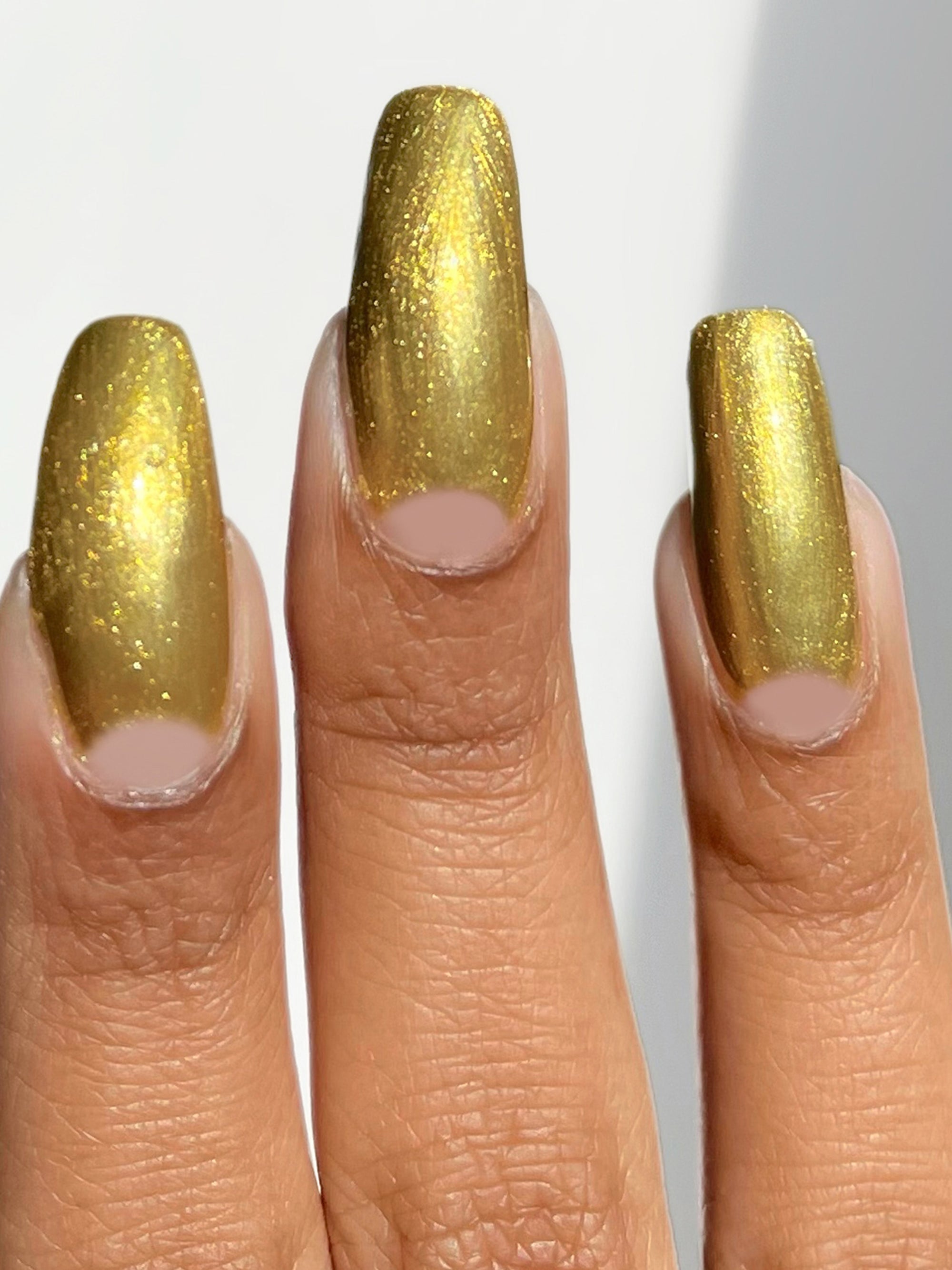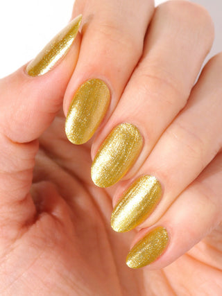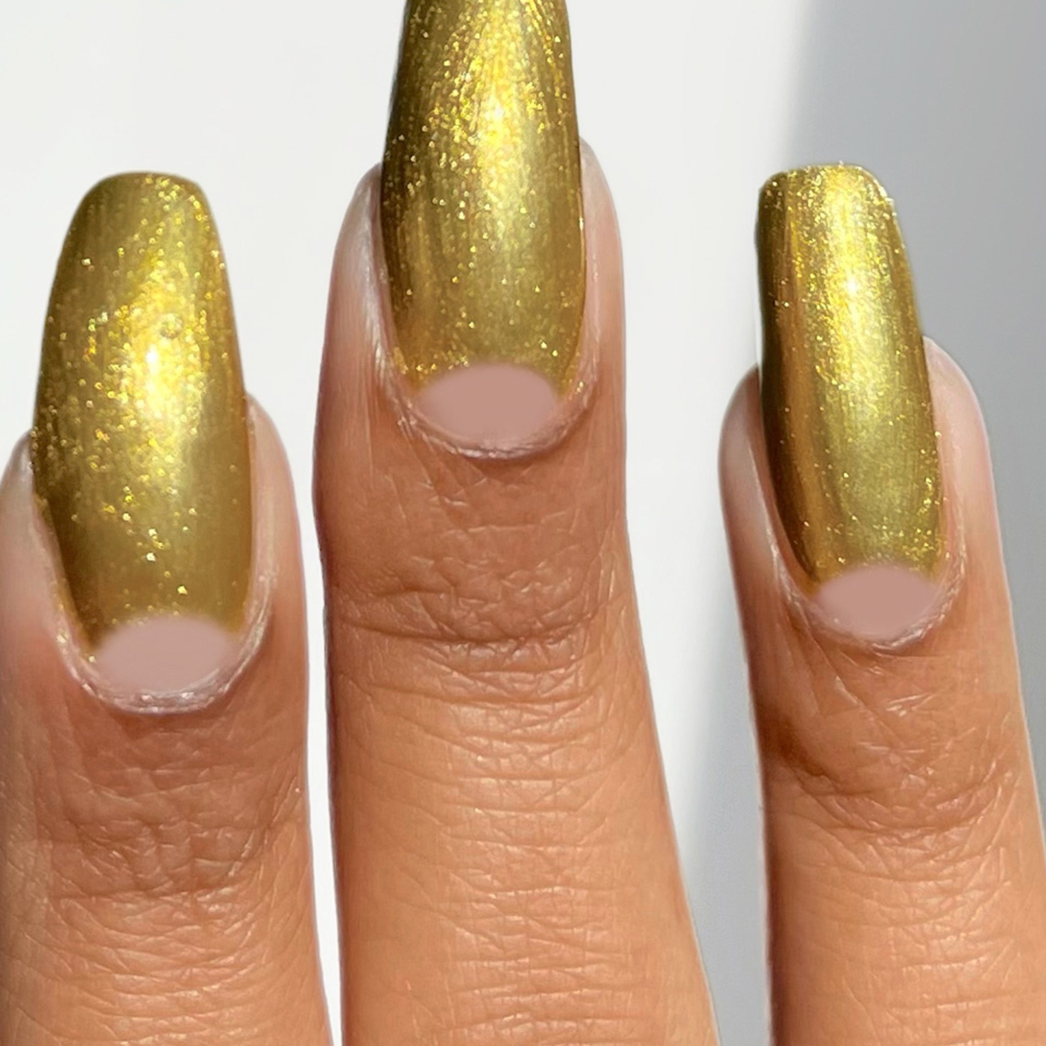 Cosplay Lamé is a warm-toned brushed gold metallic nail polish.