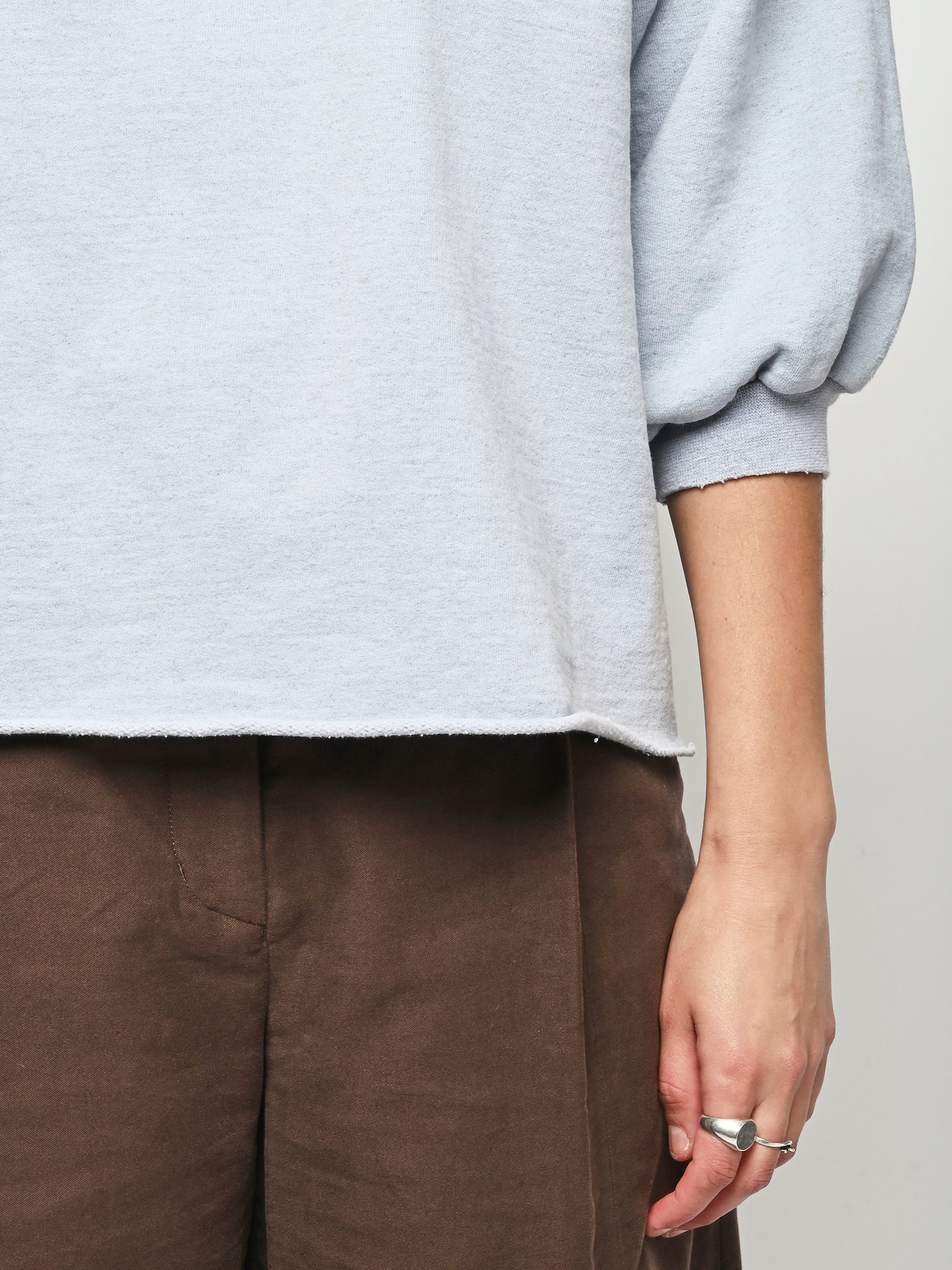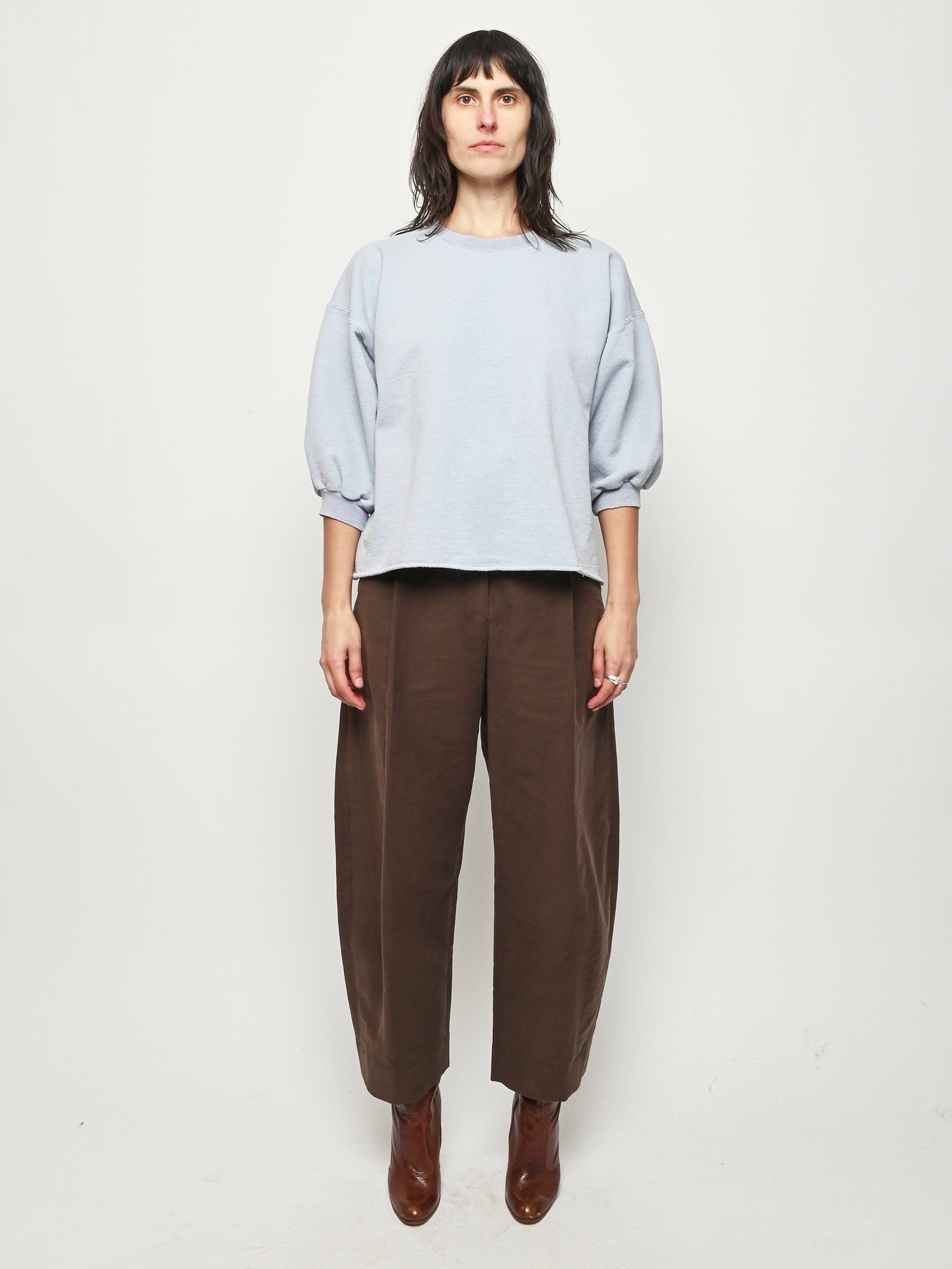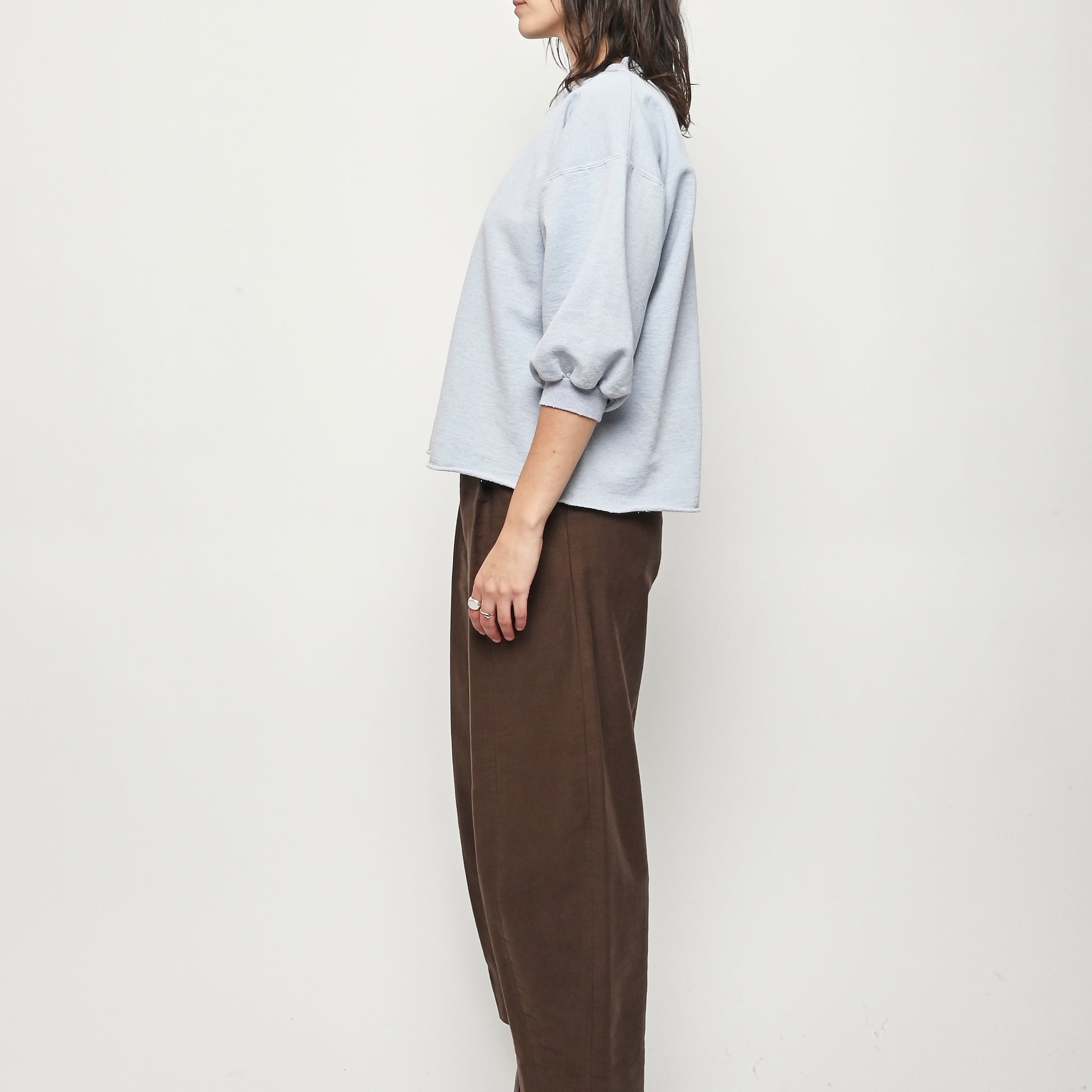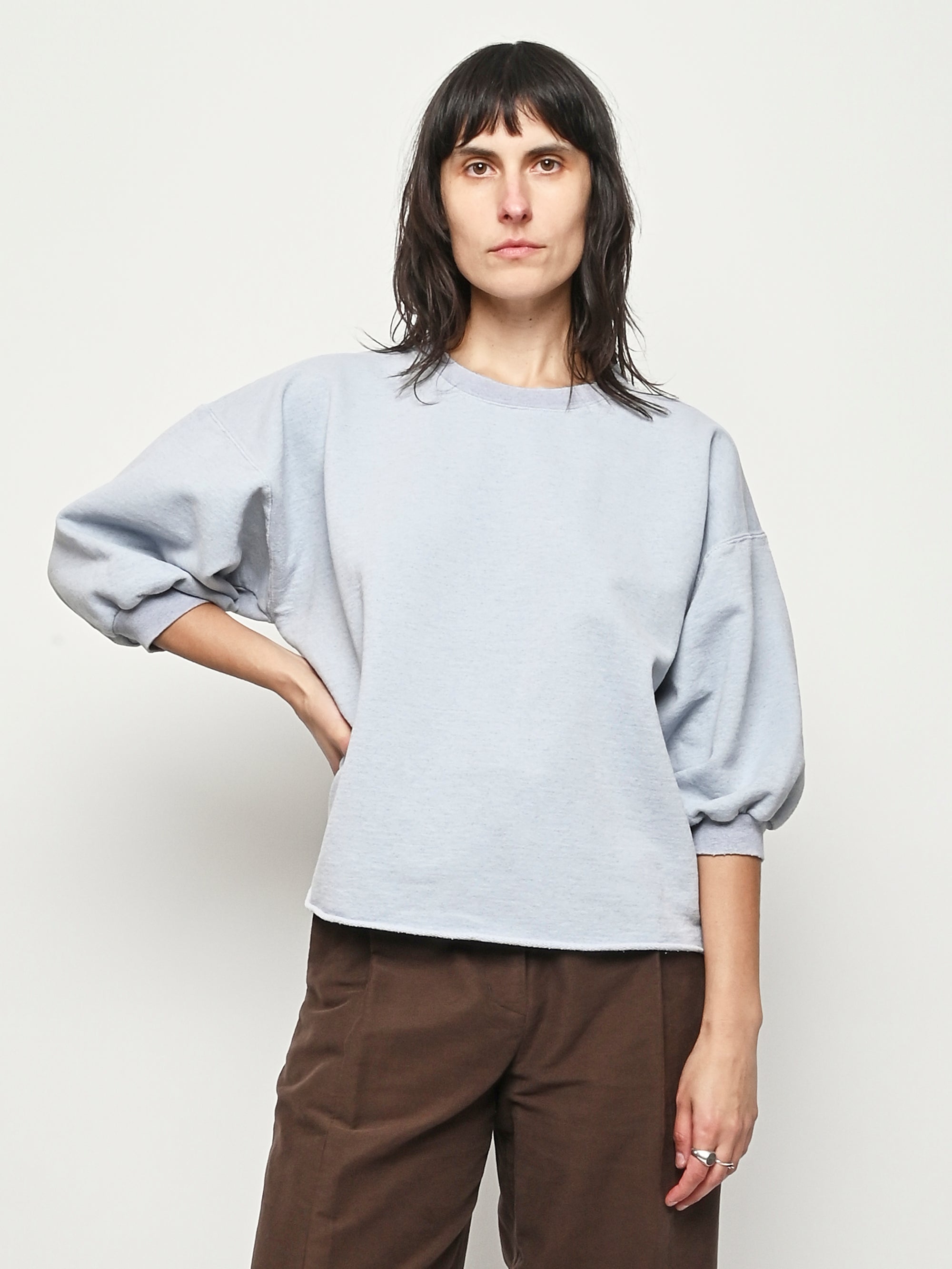 Rachel Comey's classic crewneck sweatshirt with drop shoulders, cropped sleeves, a raw edge hemline, and unique distressing throughout.