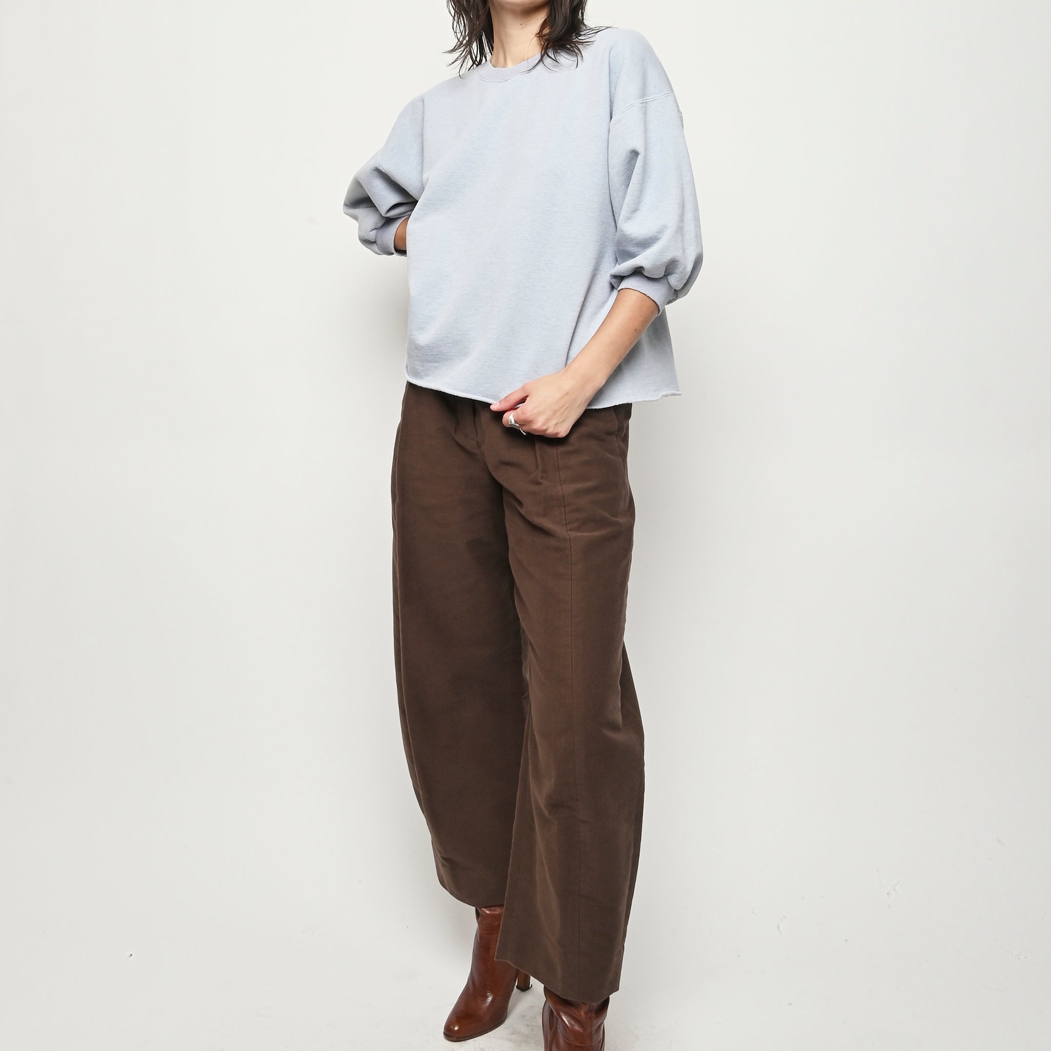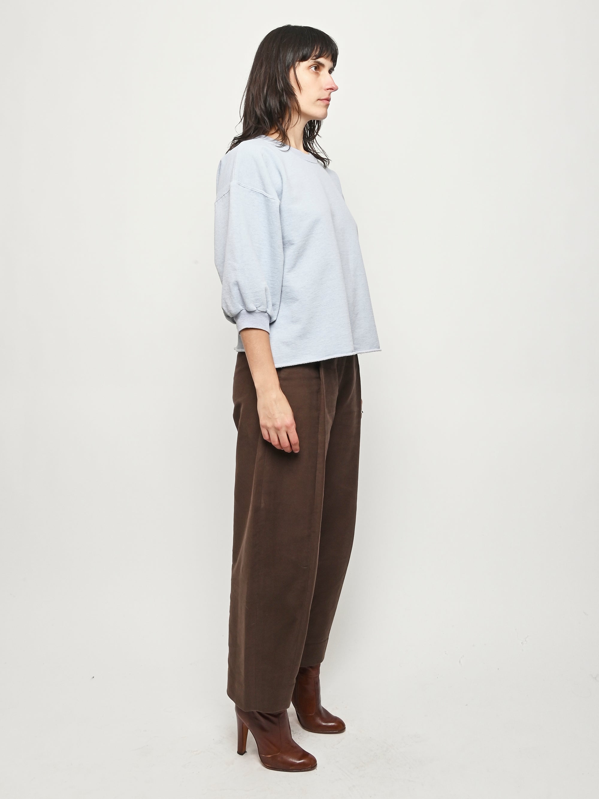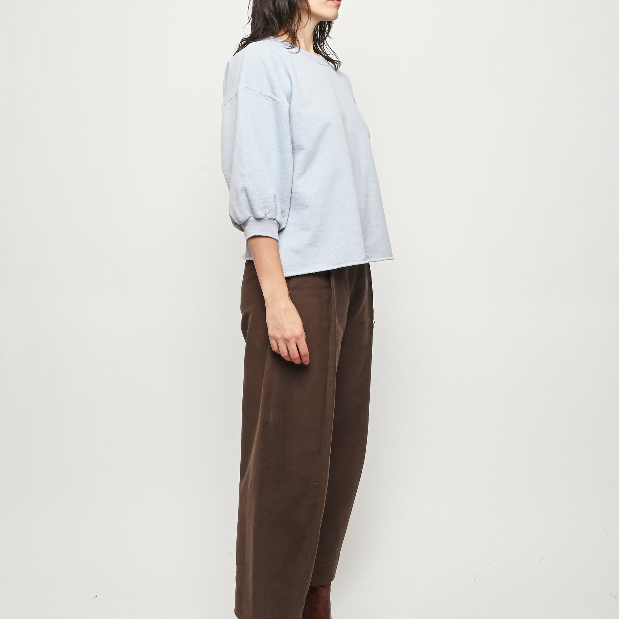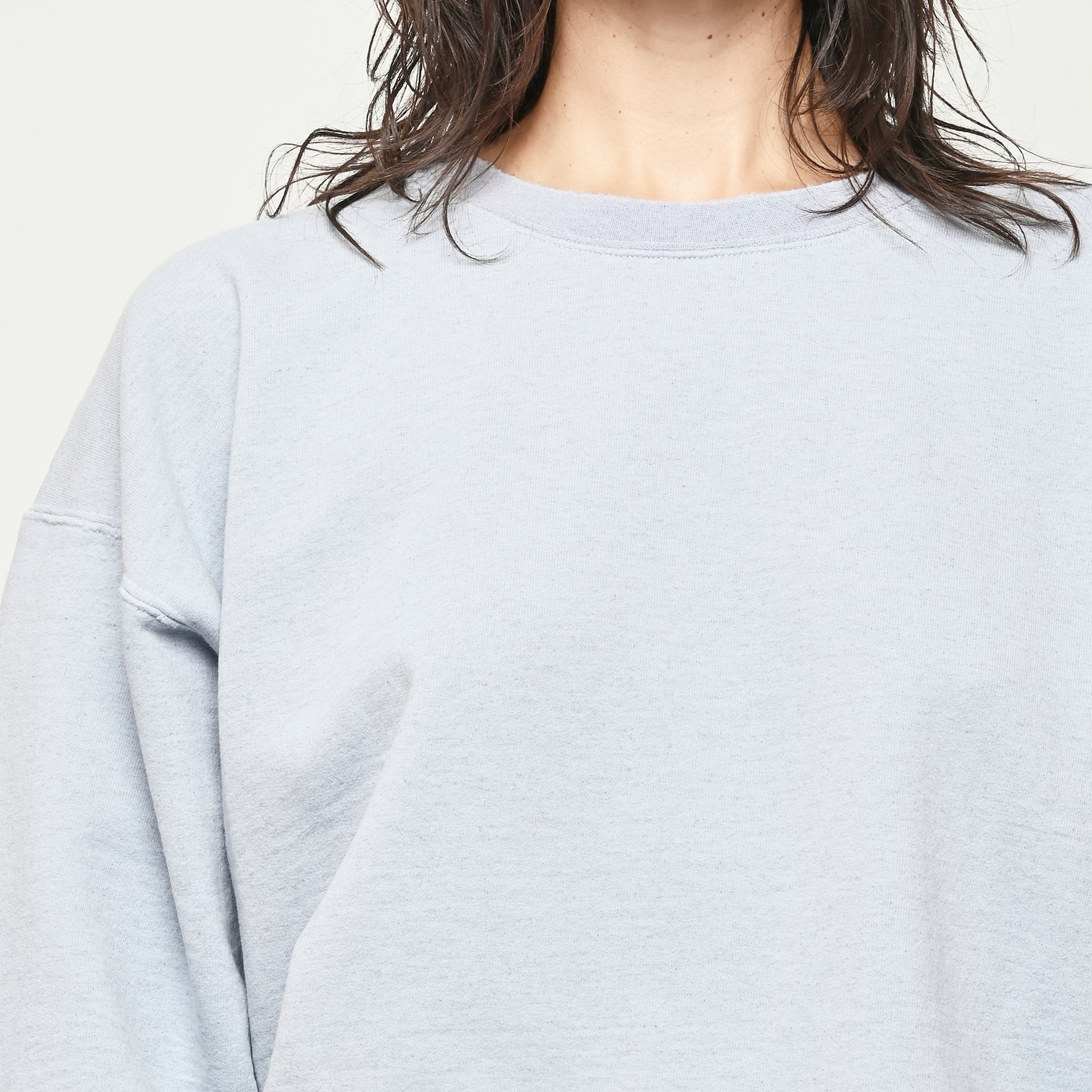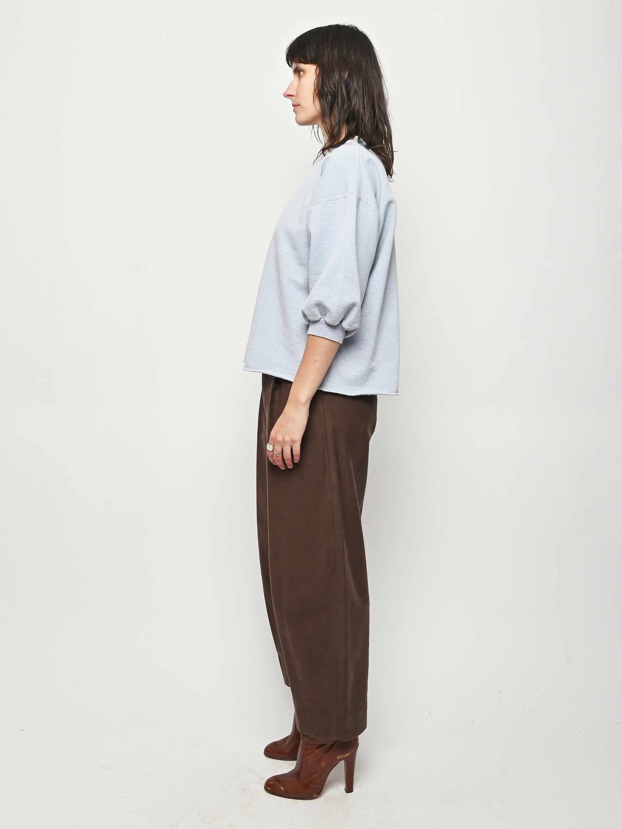 Rachel Comey's classic crewneck sweatshirt with drop shoulders, cropped sleeves, a raw edge hemline, and unique distressing throughout.