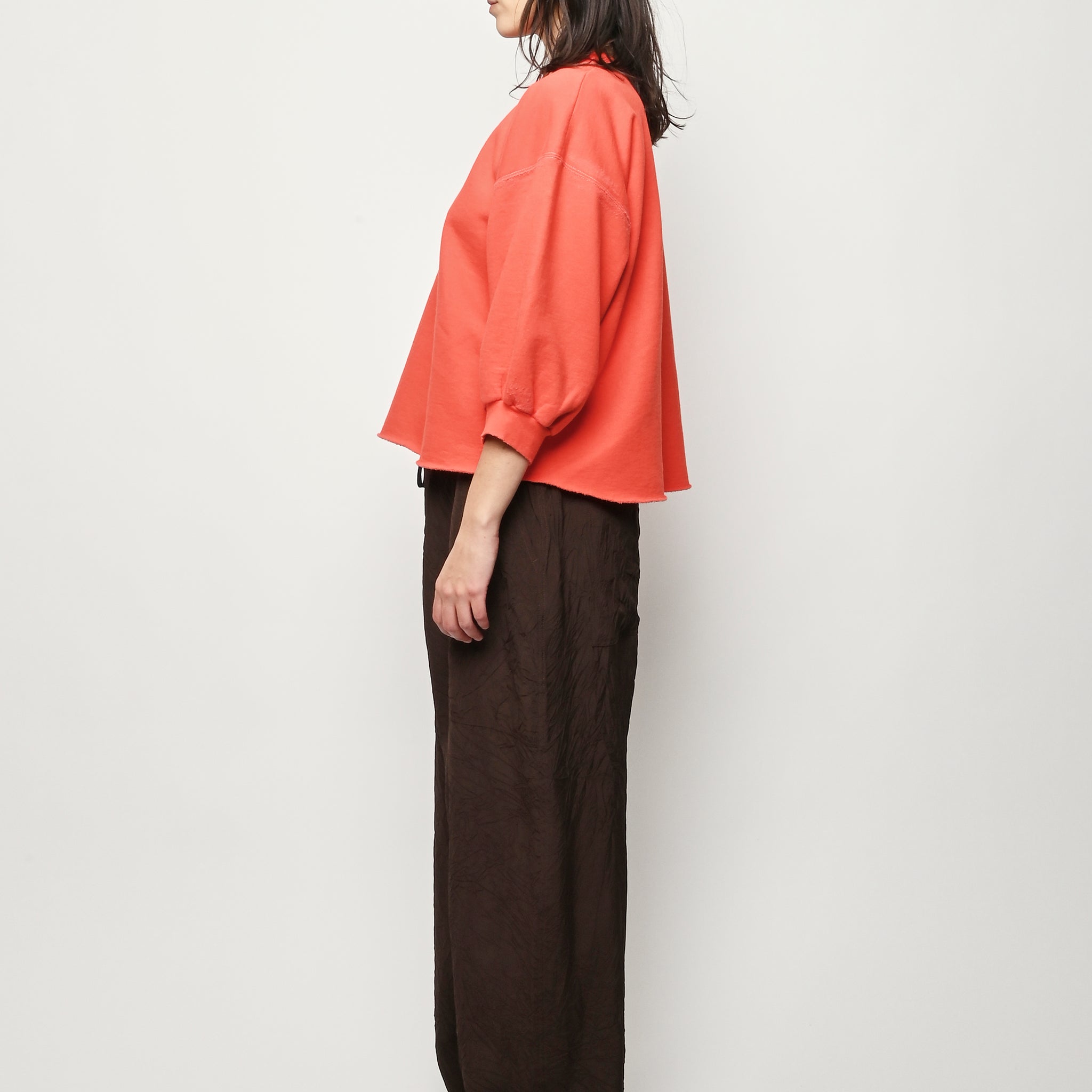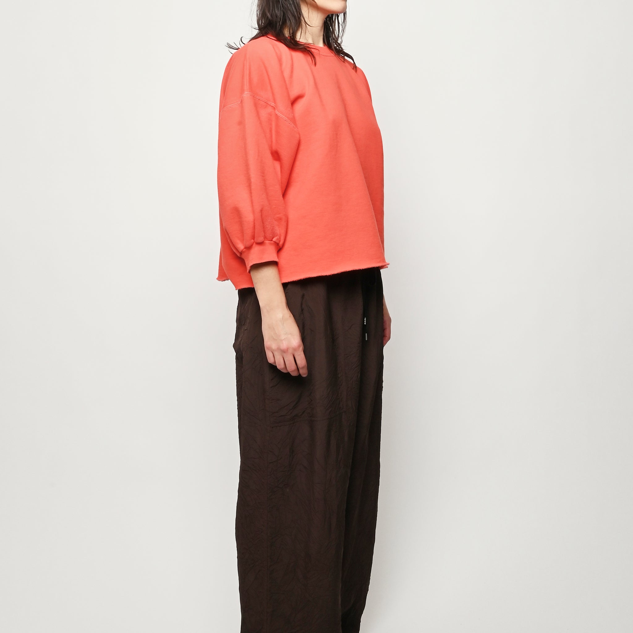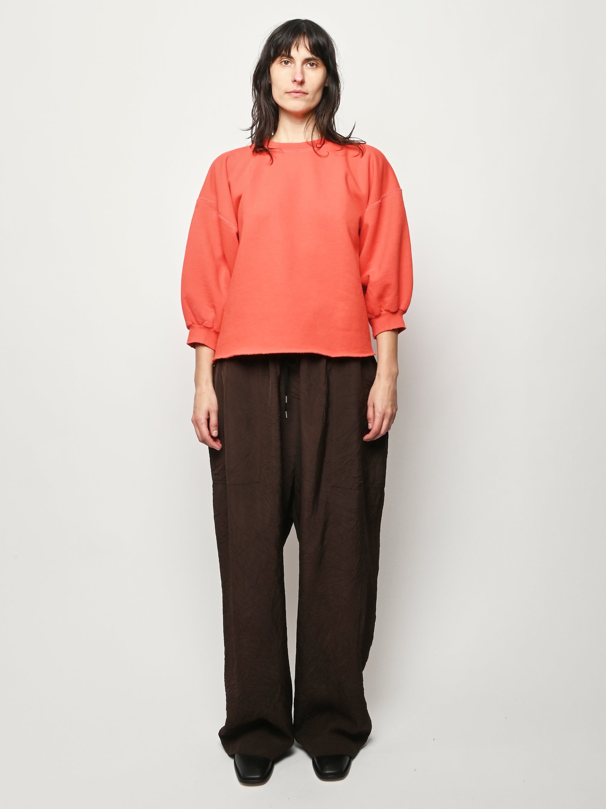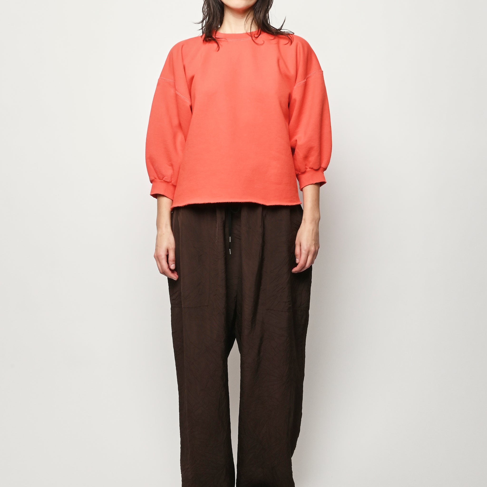 Rachel Comey's classic crewneck sweatshirt with drop shoulders, cropped sleeves, raw edge hemline and unique distressing throughout. Makes a great styling piece for any look.