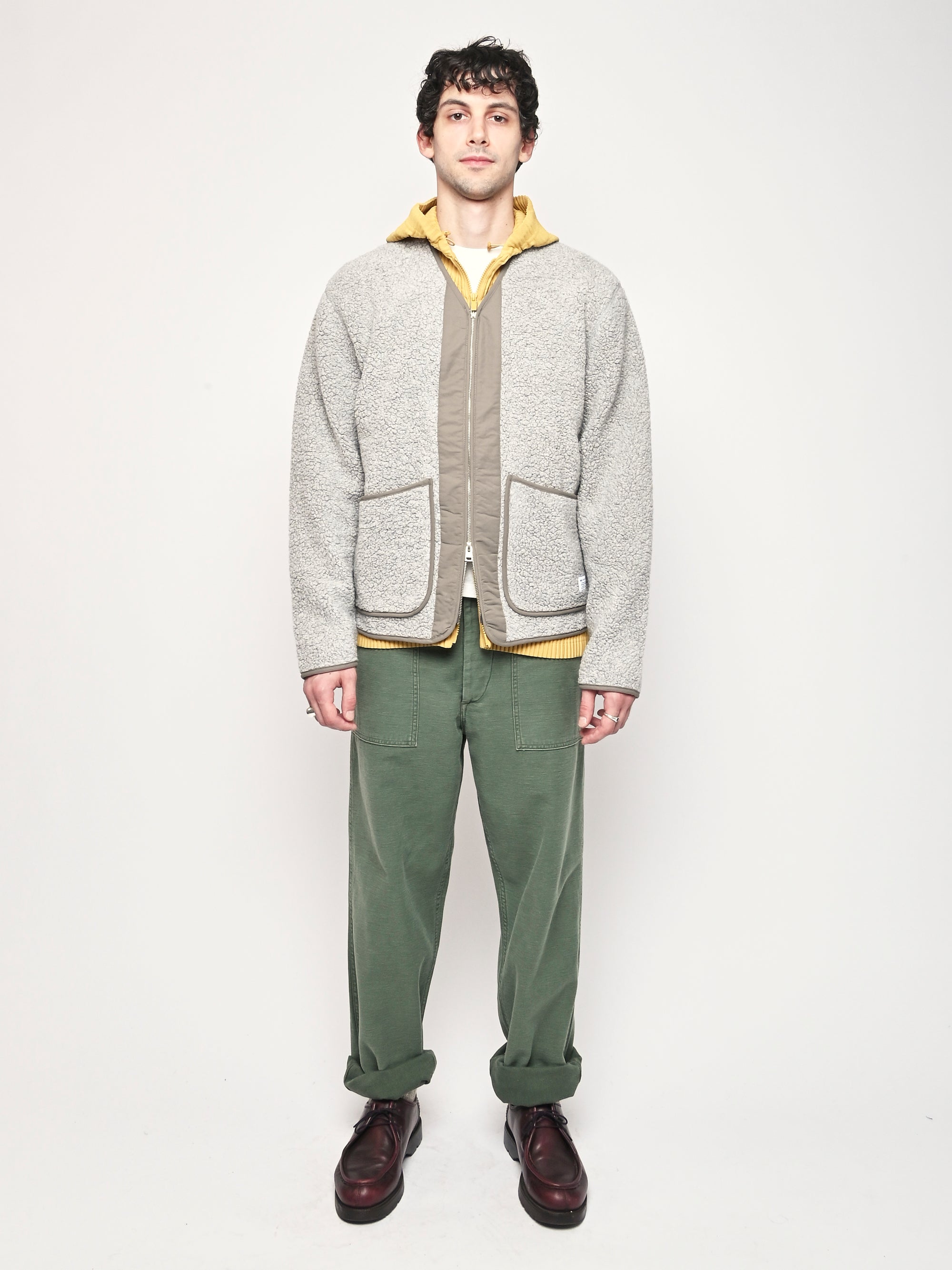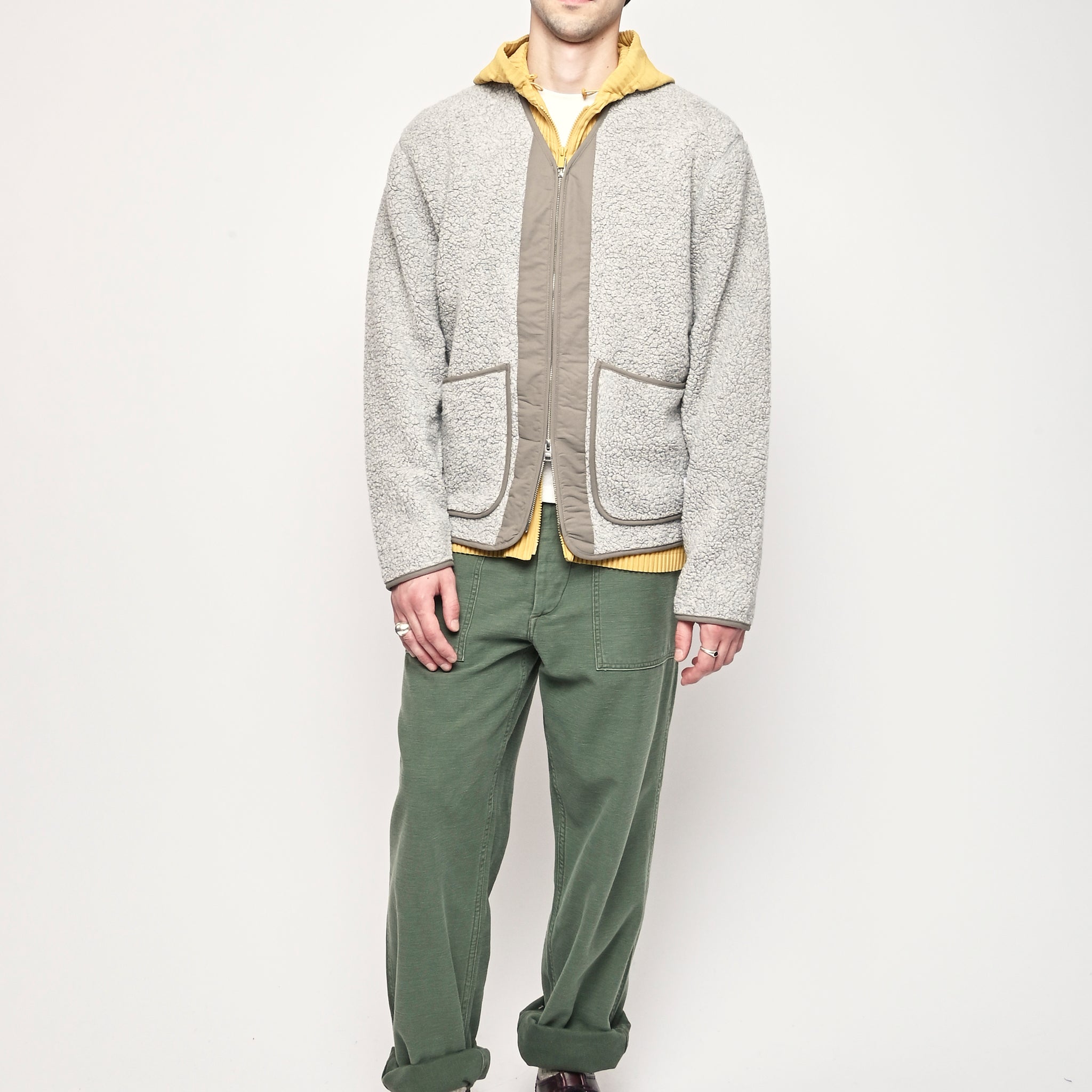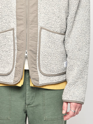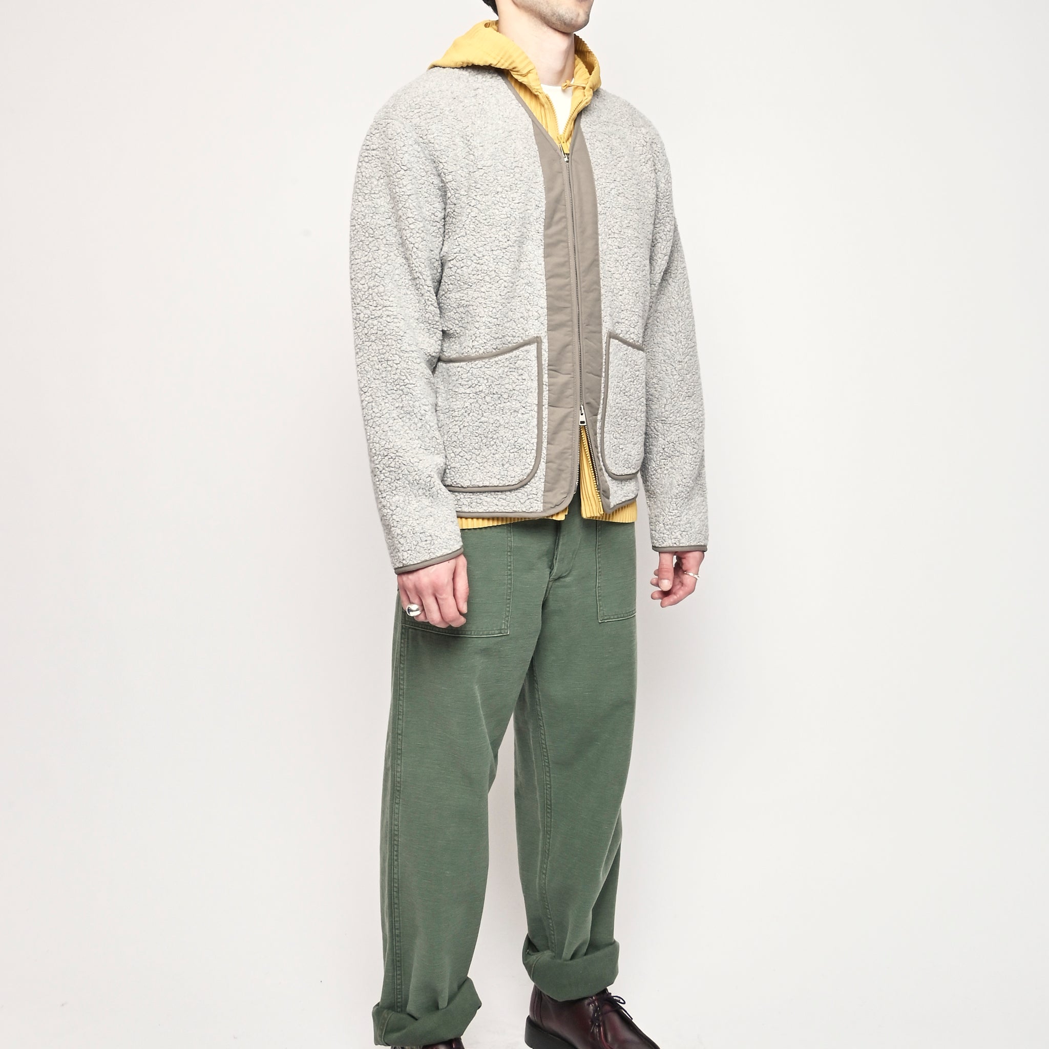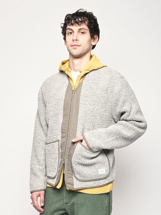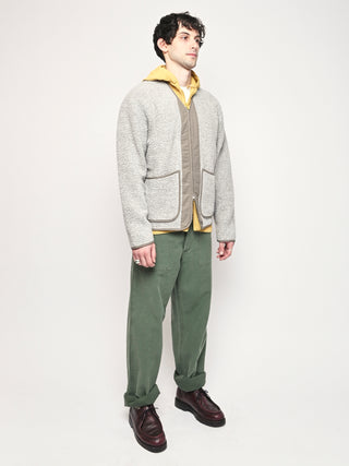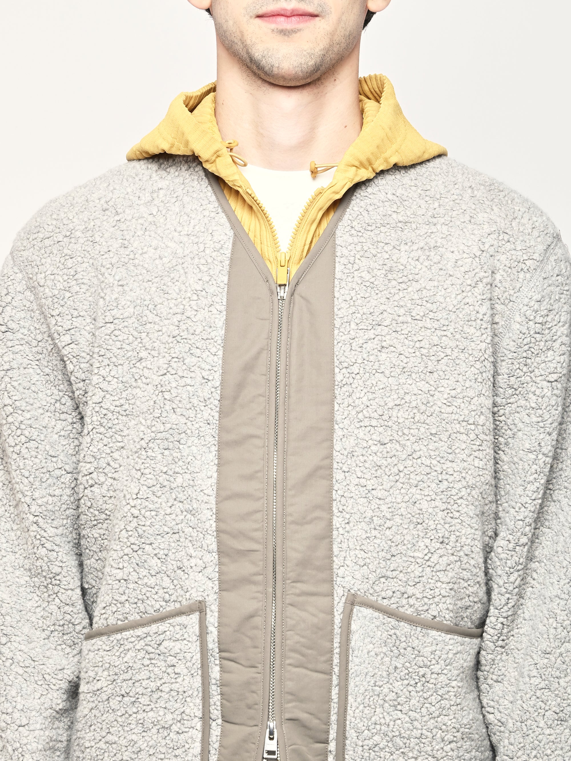 A relaxed fitting military liner style jacket by Norse Projects with set-in sleeves cut in an Italian wool blend sherpa fleece. Features a stand collar, patch pockets, contrast binding and panel details, a branded two-way metal zipper at center front and finished with flatlock stitching and a branded tab at the front.