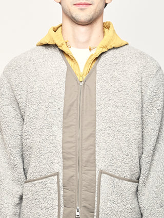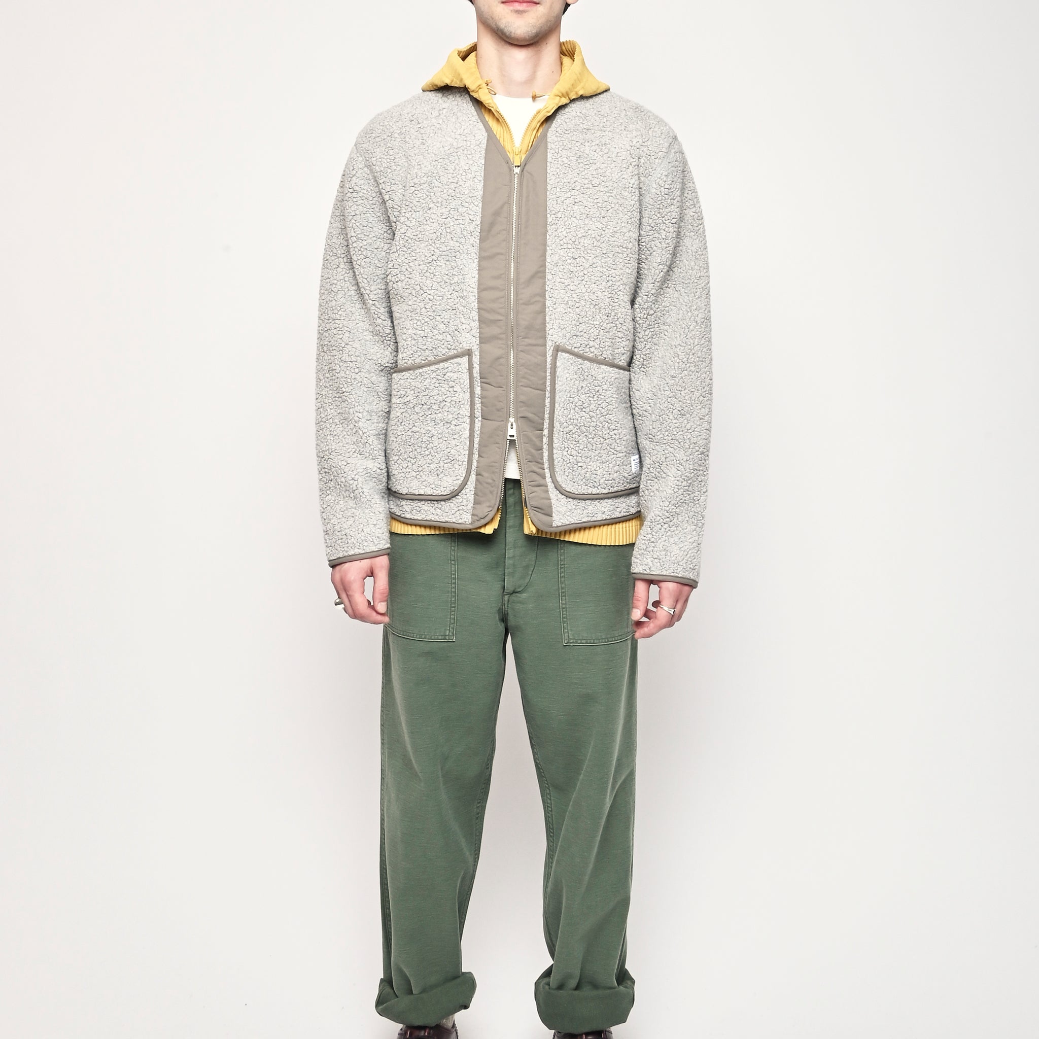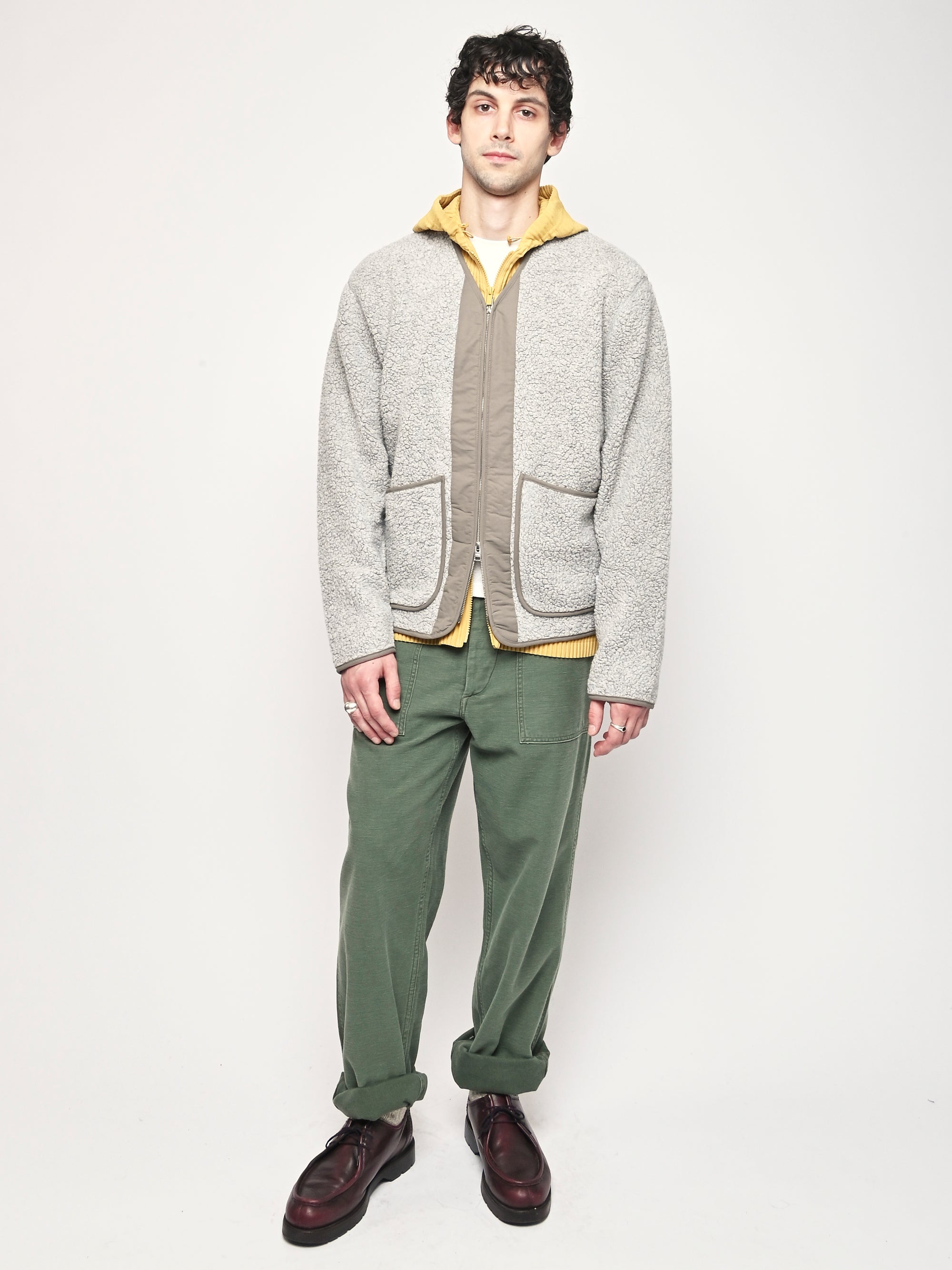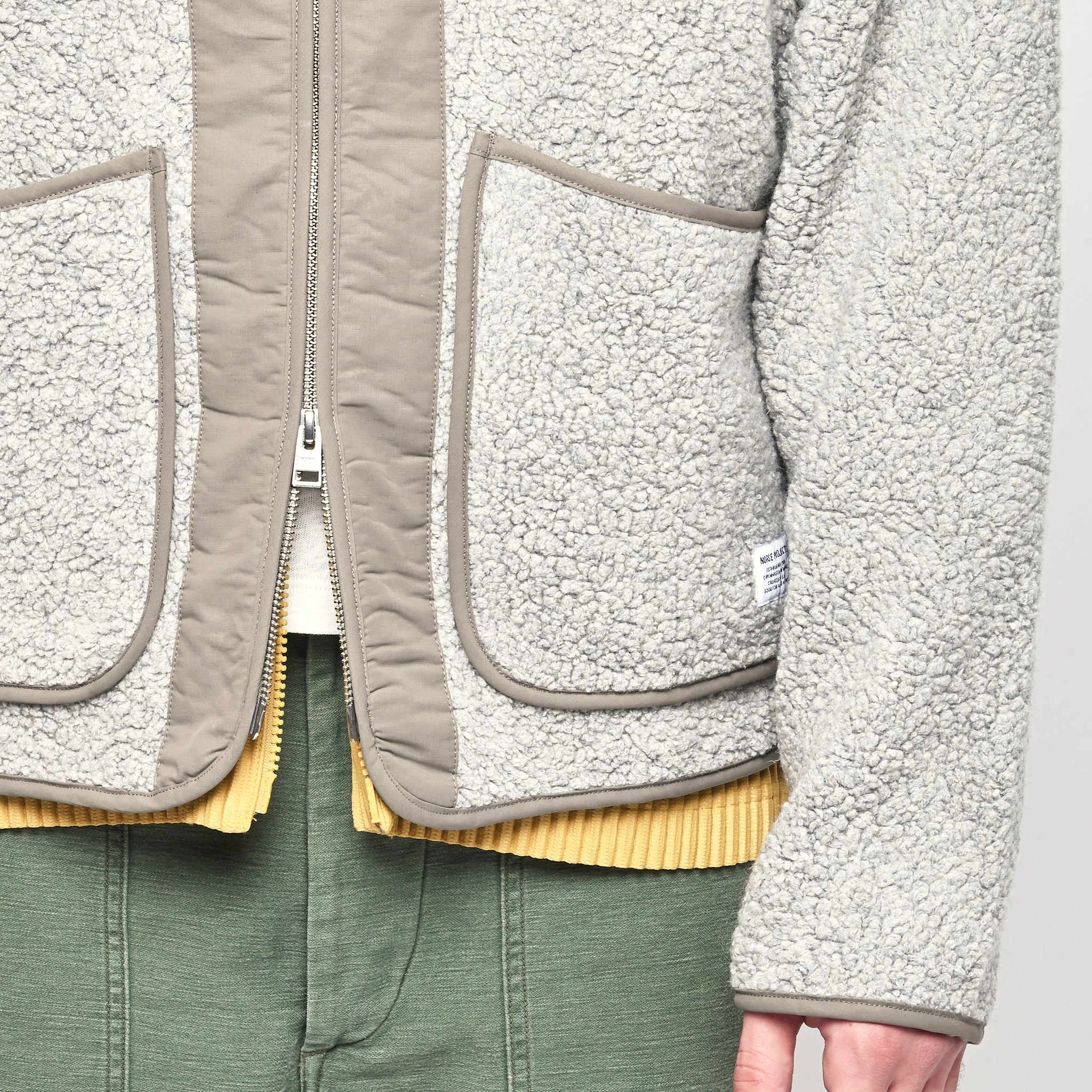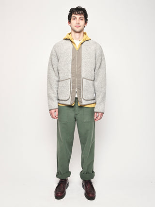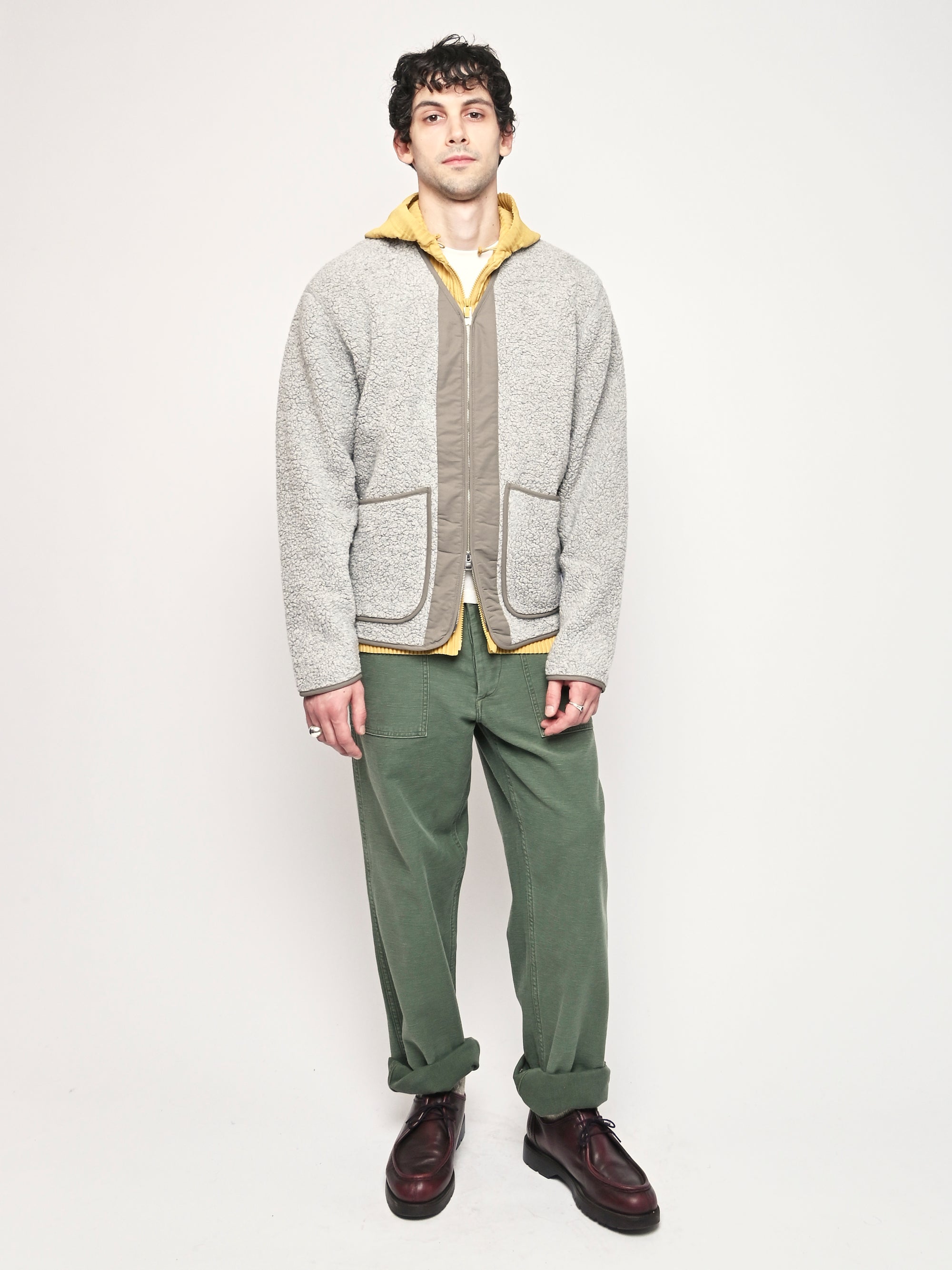 A relaxed fitting military liner style jacket by Norse Projects with set-in sleeves cut in an Italian wool blend sherpa fleece. Features a stand collar, patch pockets, contrast binding and panel details, a branded two-way metal zipper at center front and finished with flatlock stitching and a branded tab at the front.