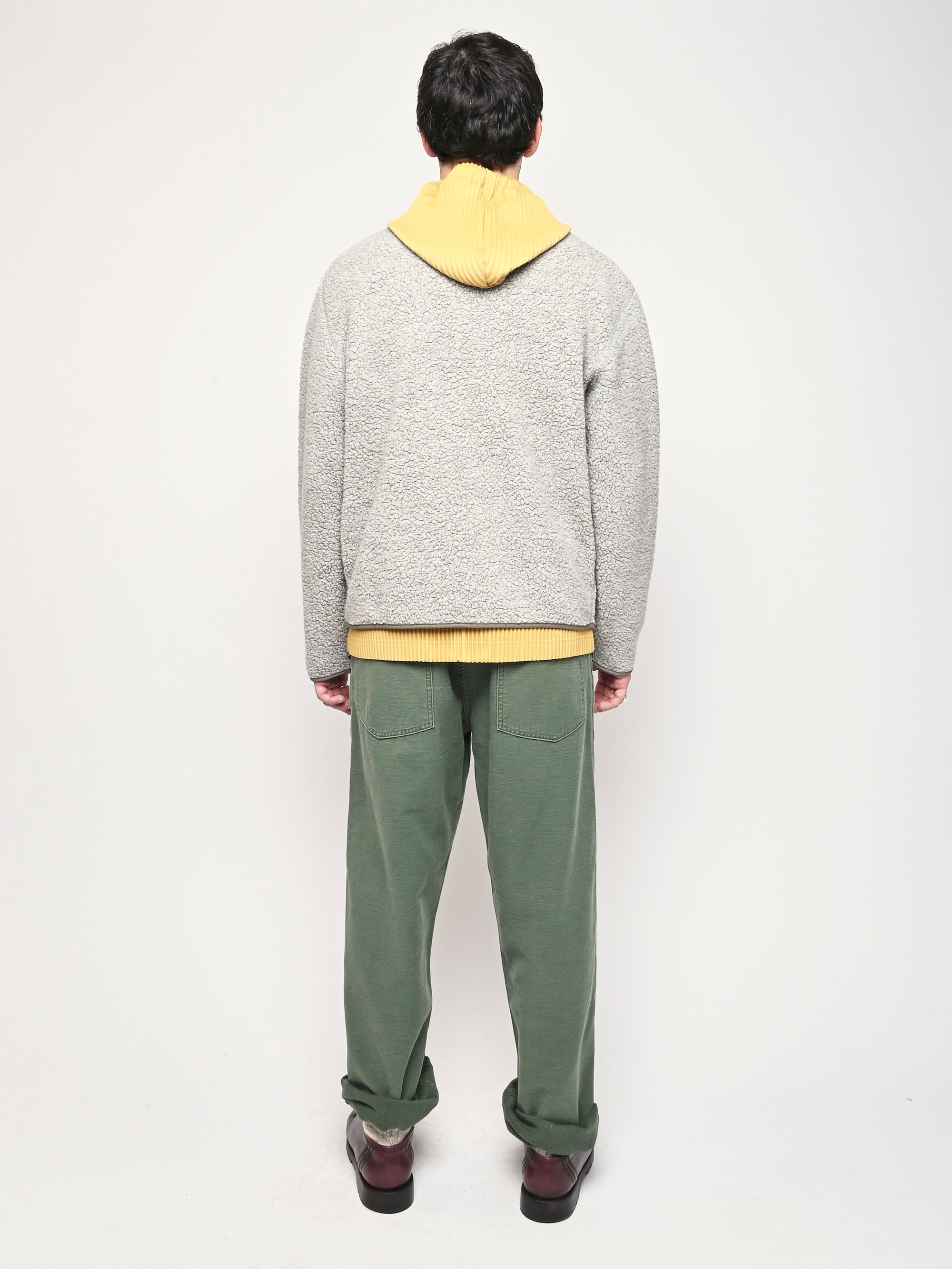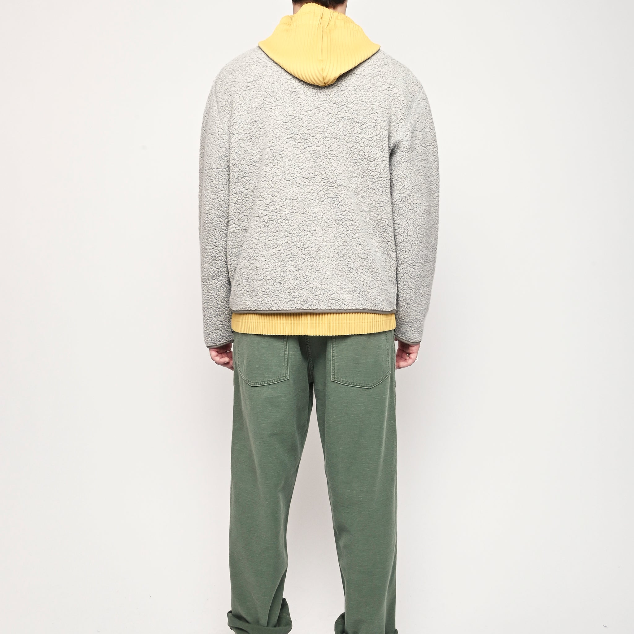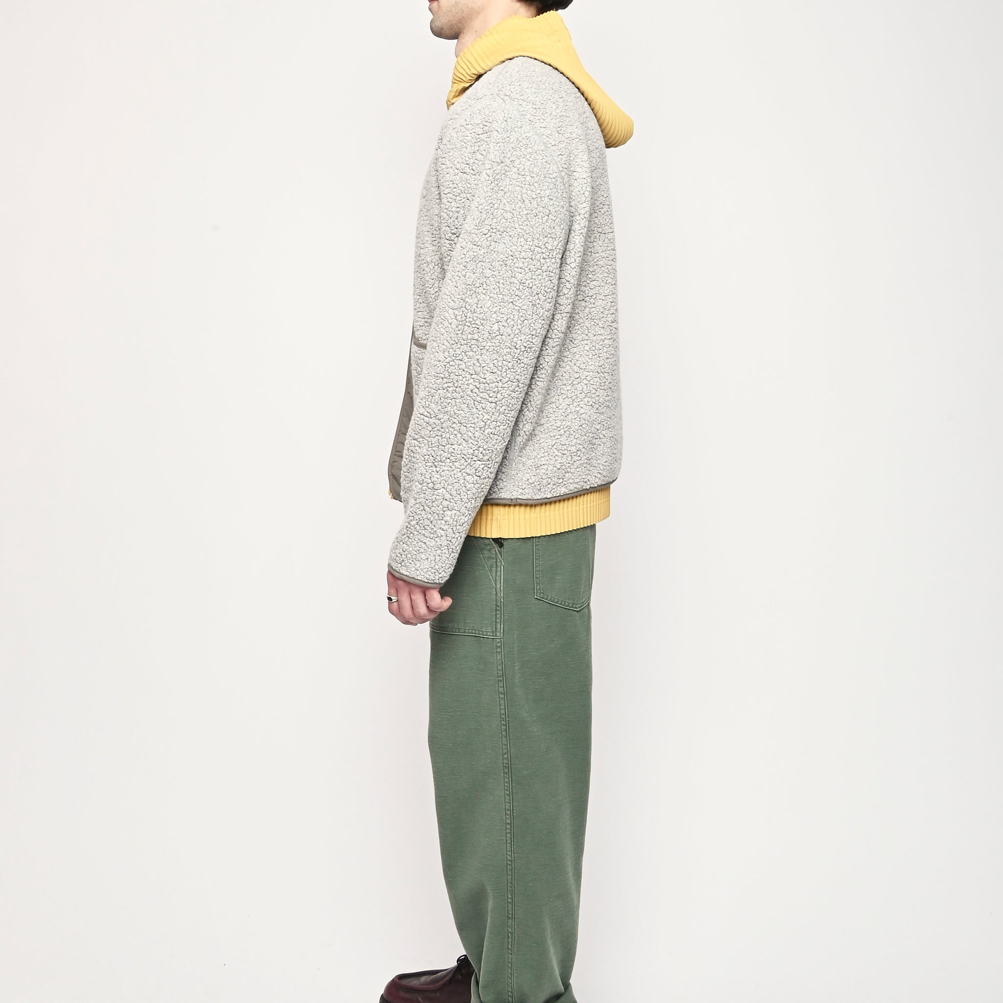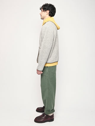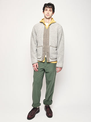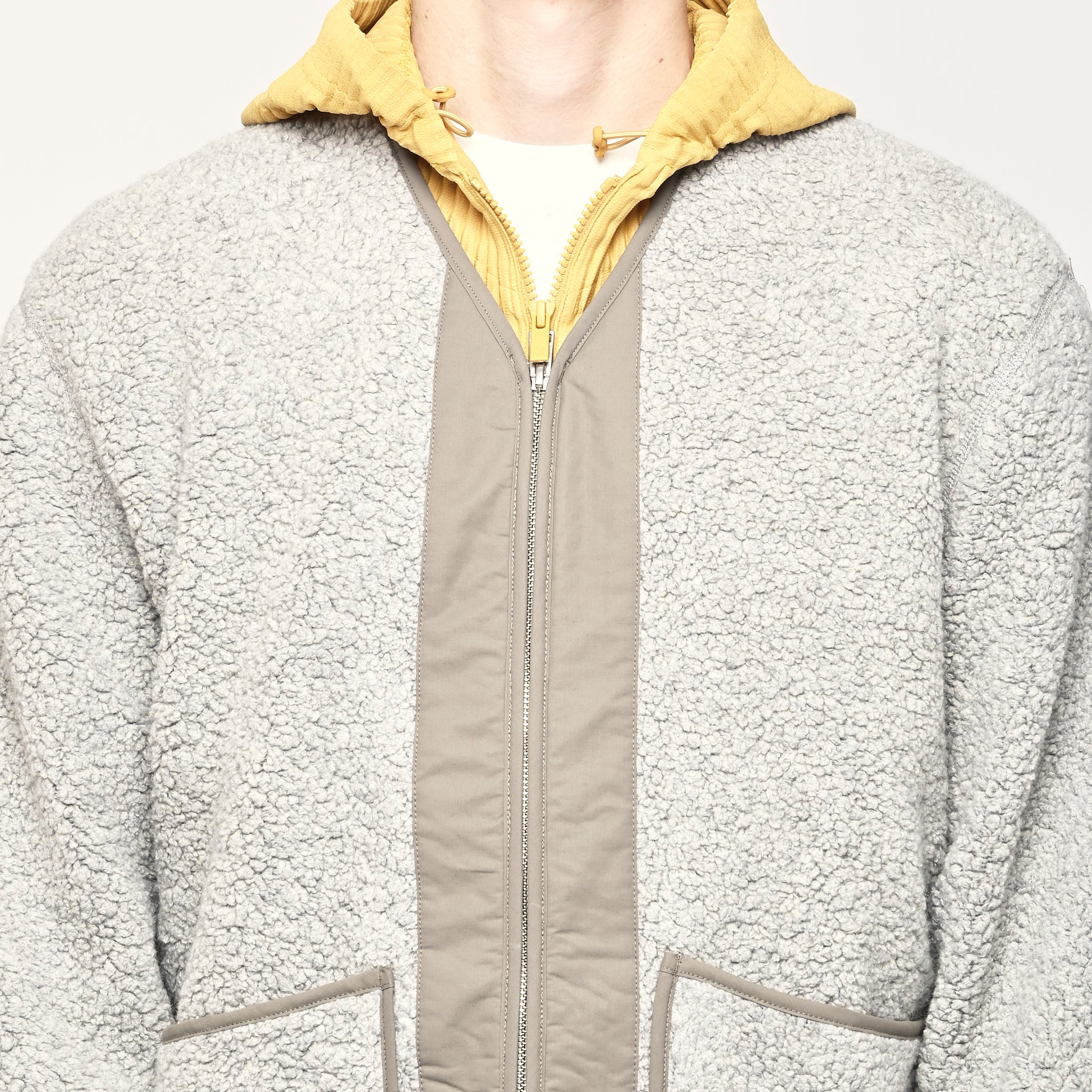 A relaxed fitting military liner style jacket by Norse Projects with set-in sleeves cut in an Italian wool blend sherpa fleece. Features a stand collar, patch pockets, contrast binding and panel details, a branded two-way metal zipper at center front and finished with flatlock stitching and a branded tab at the front.