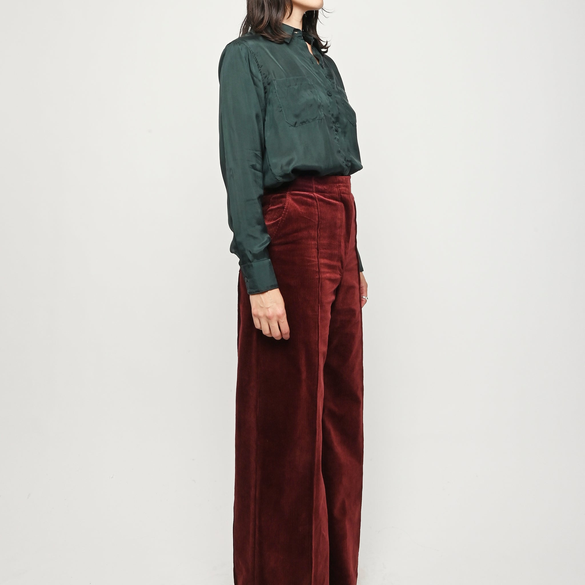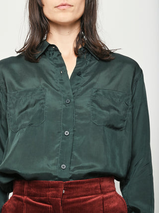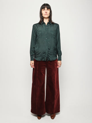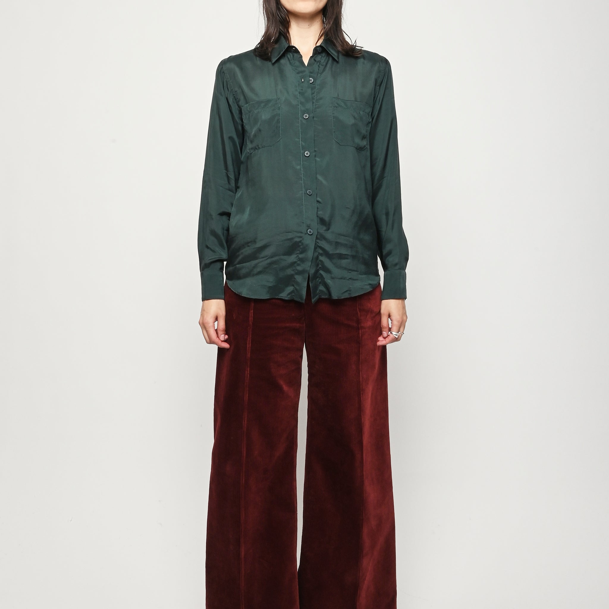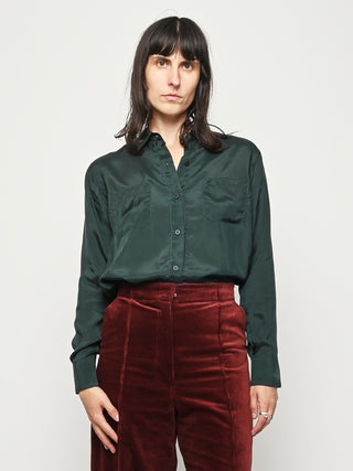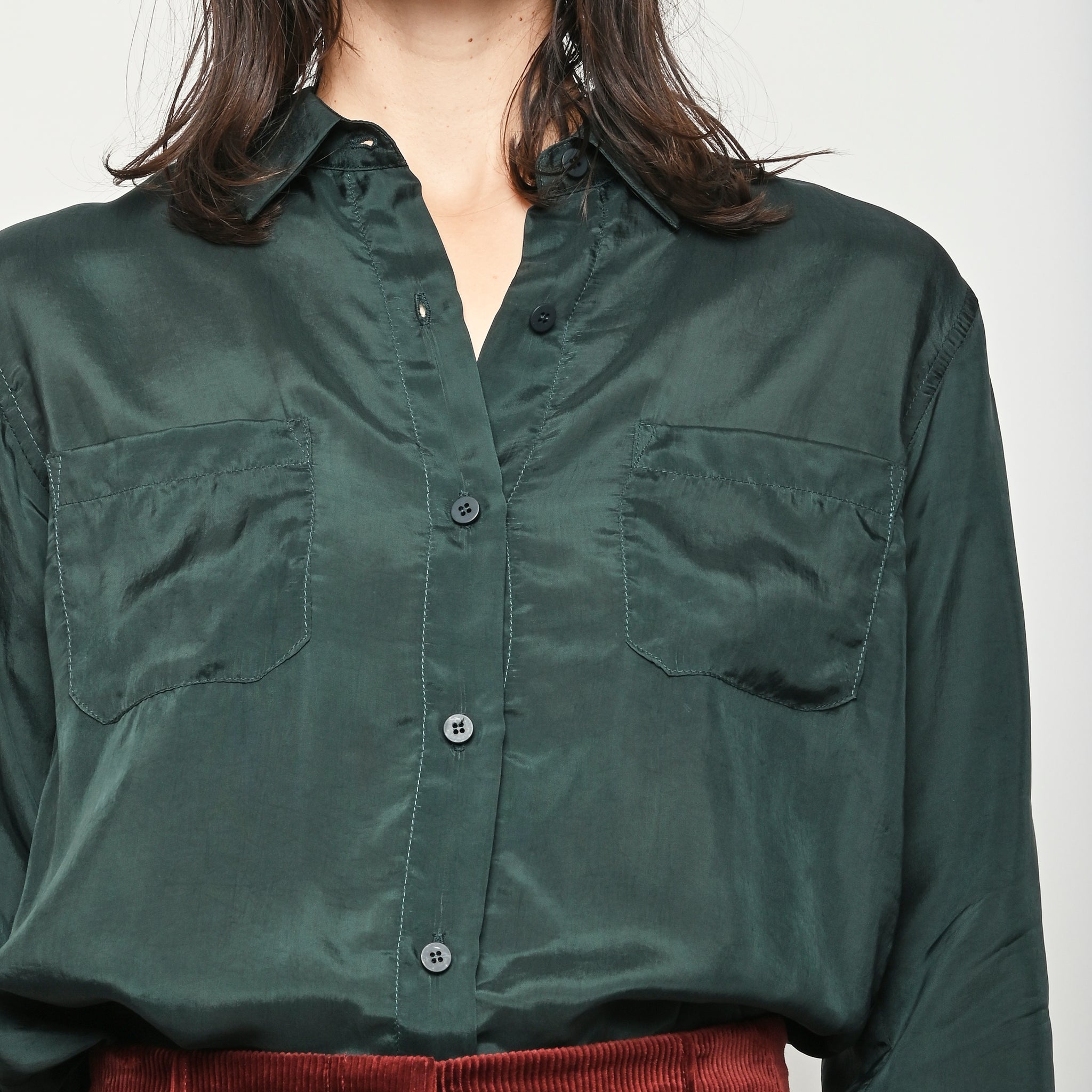 Casual fit button down with a prefect drape by Jesse Kamm. Features front pockets and full button closure. Elegant and minimal silhouette. Built from a luxurious, buttery, feather-weight Japanese Cupro.