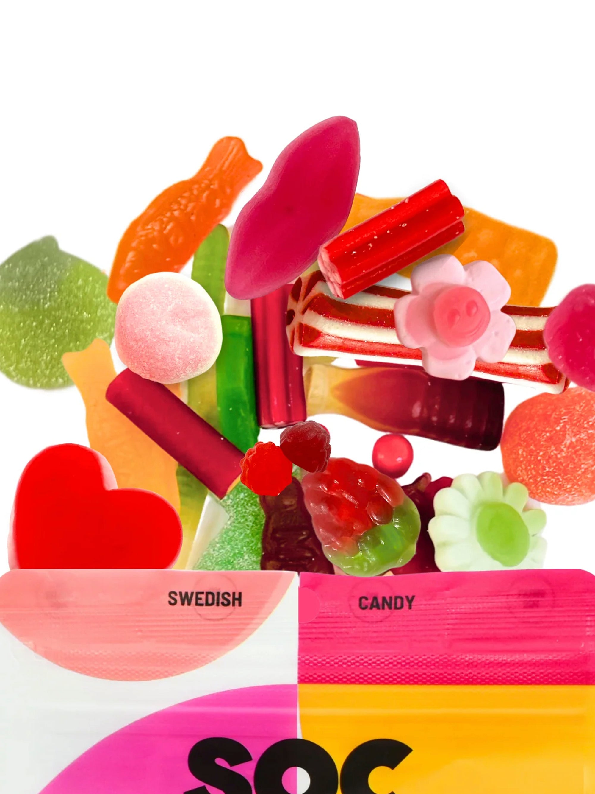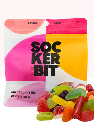 Resealable pouch bag filled with a variety of sweet gummy candies.