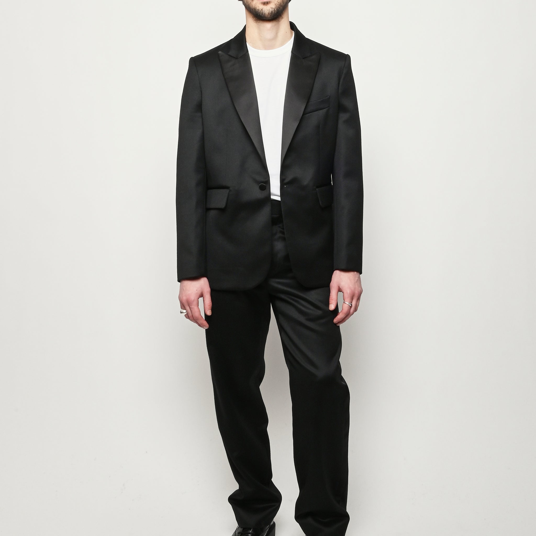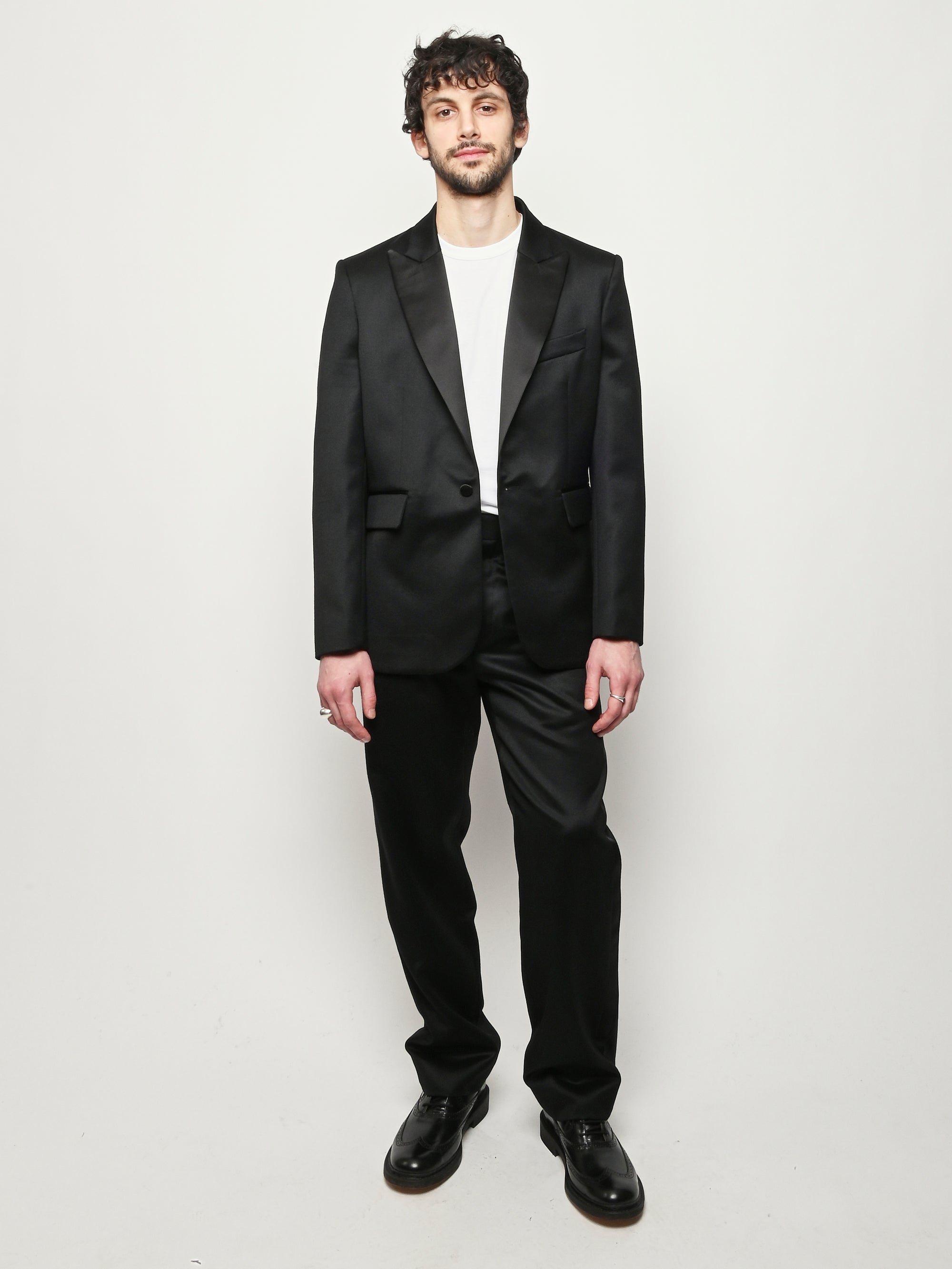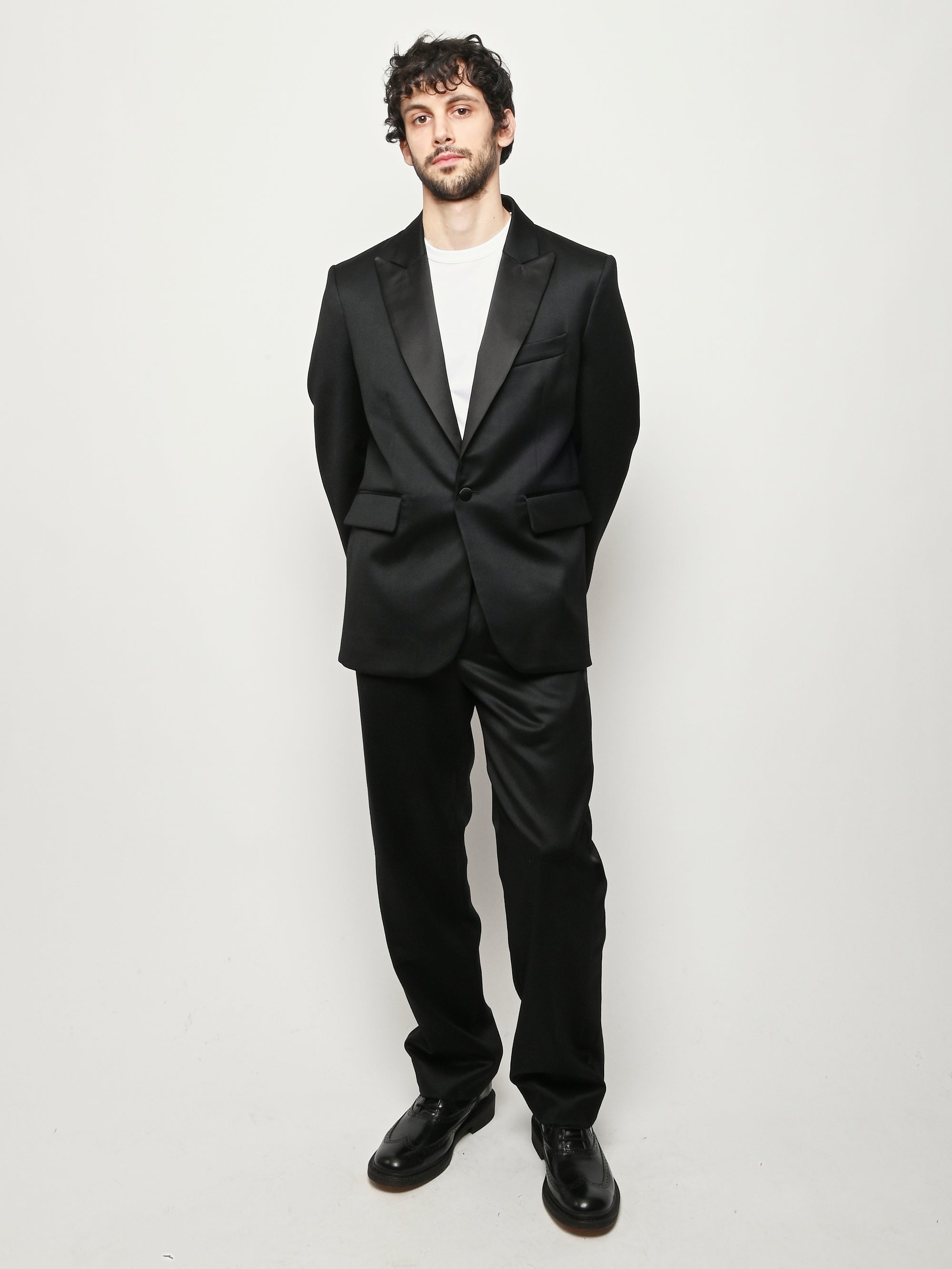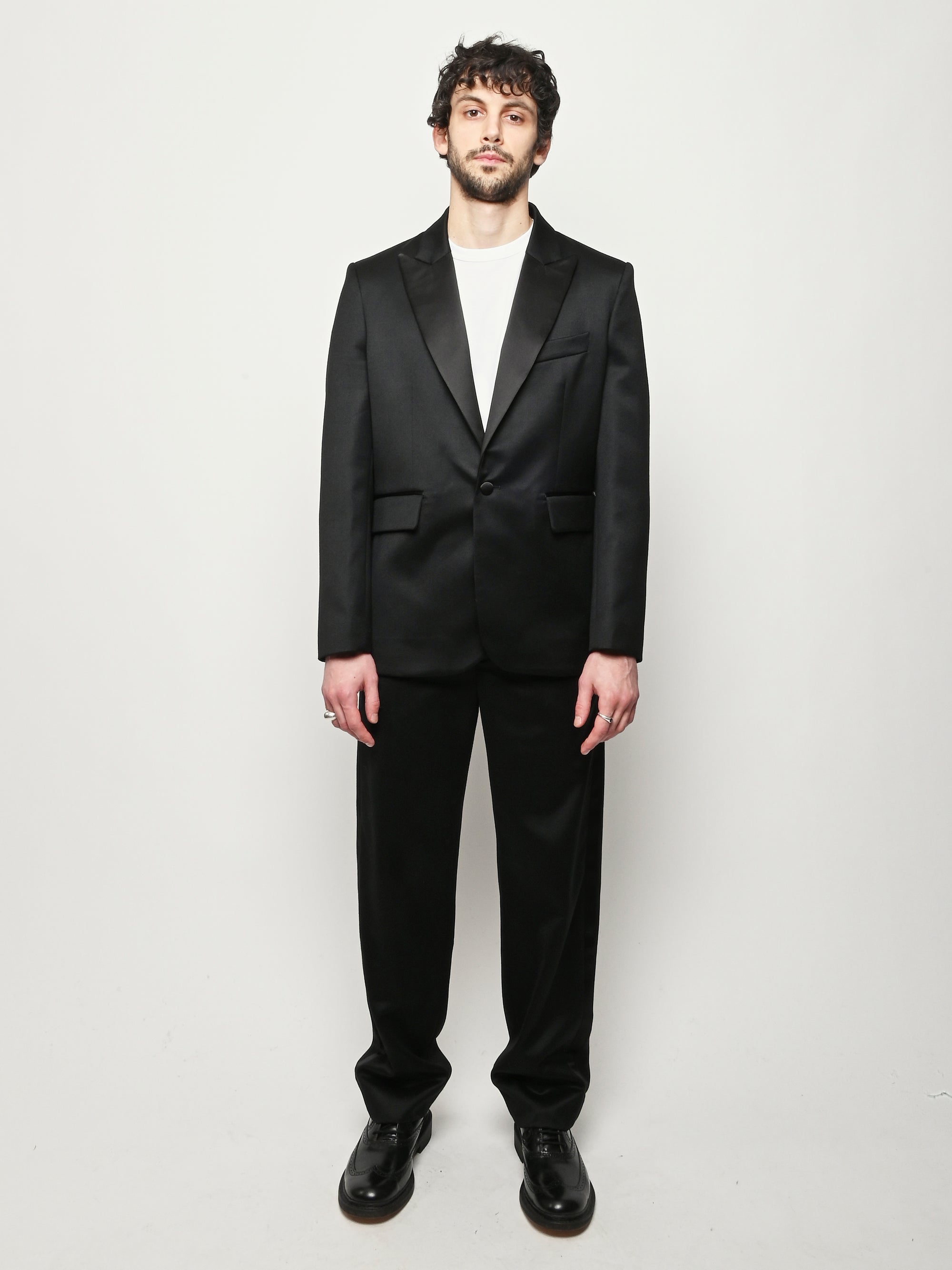 This Bode piece is a reproduction of a men's tuxedo jacket from the 1960s. Bode reproduced the silhouette in fine barathea wool with a satin contrast collar and buttons.
