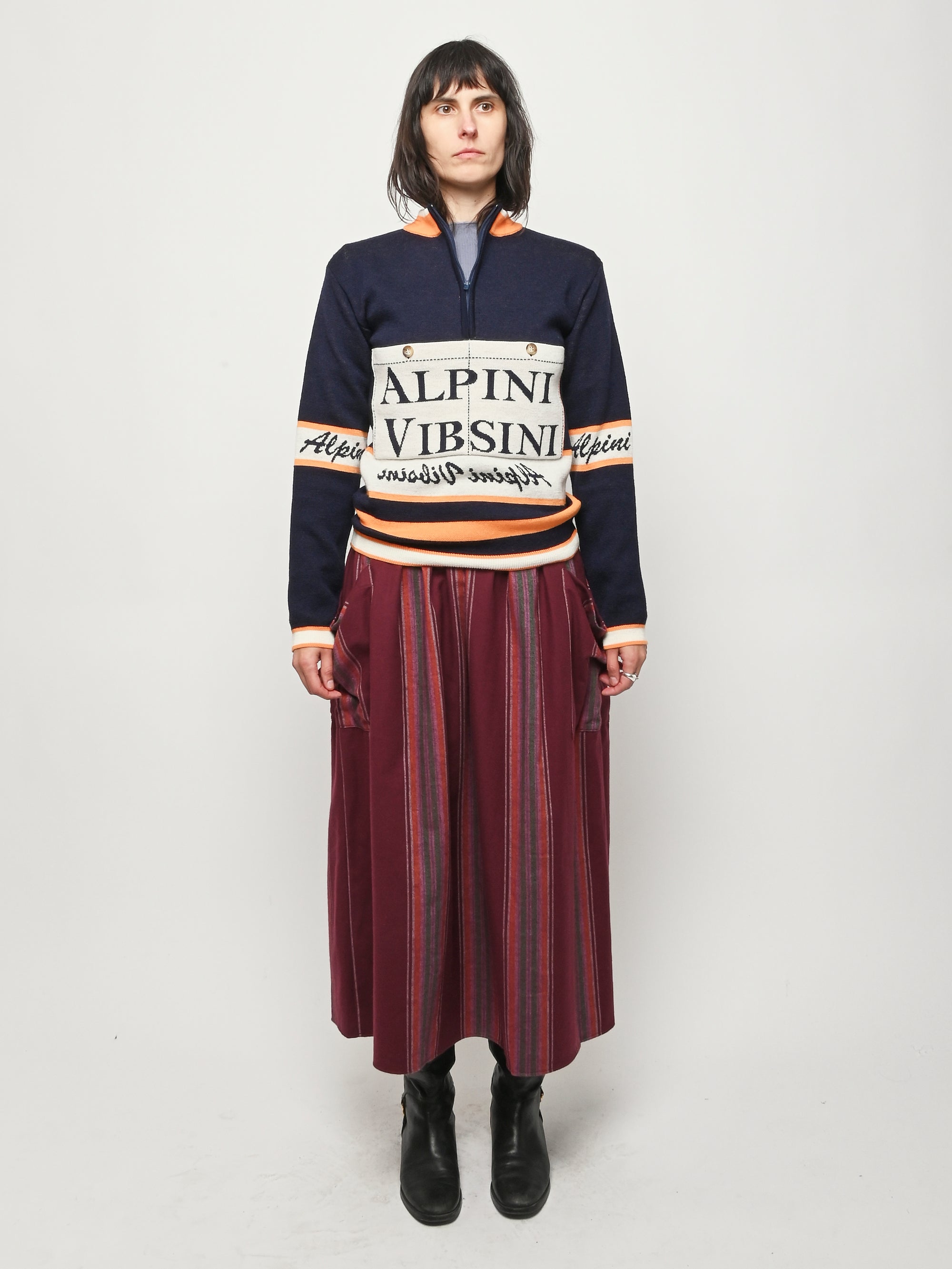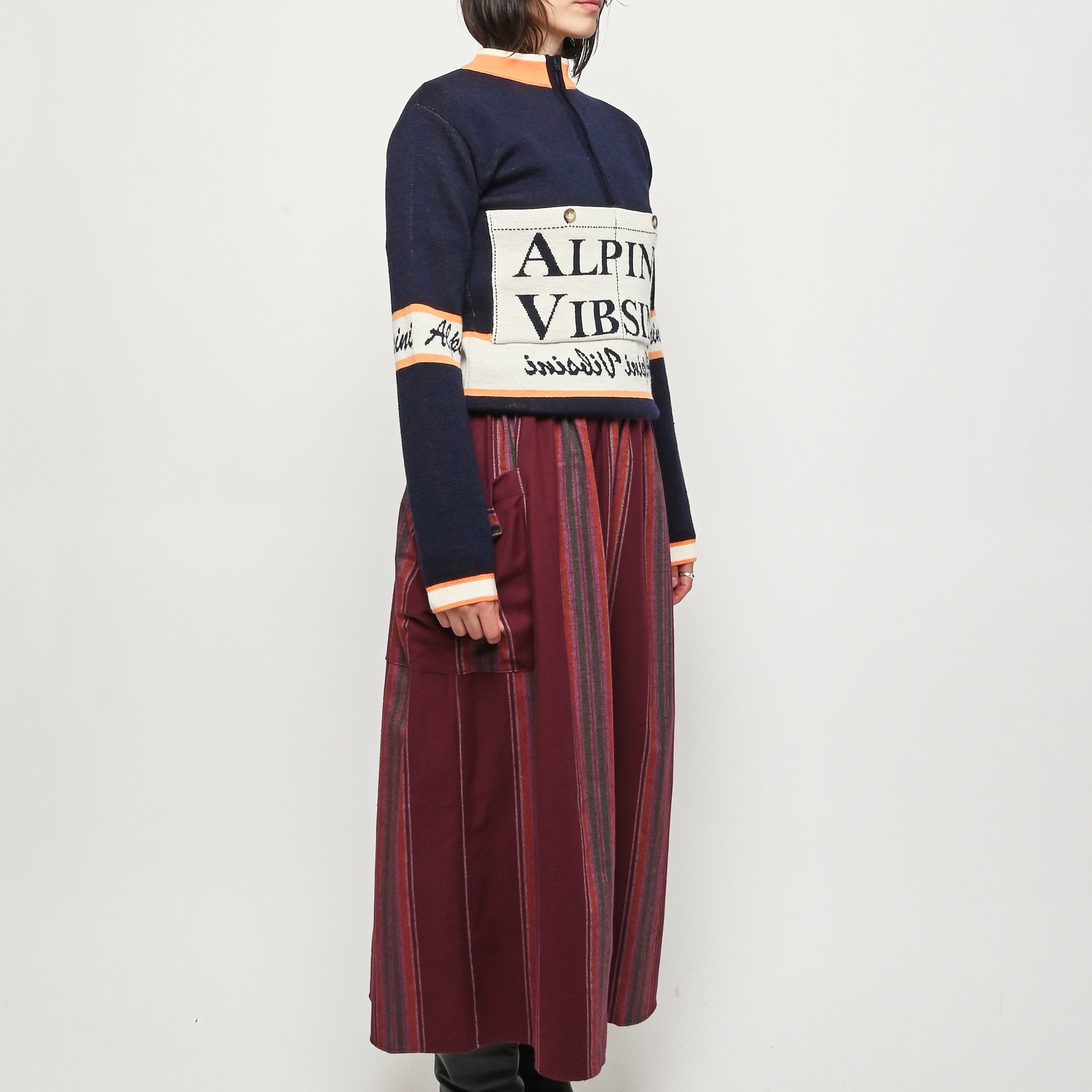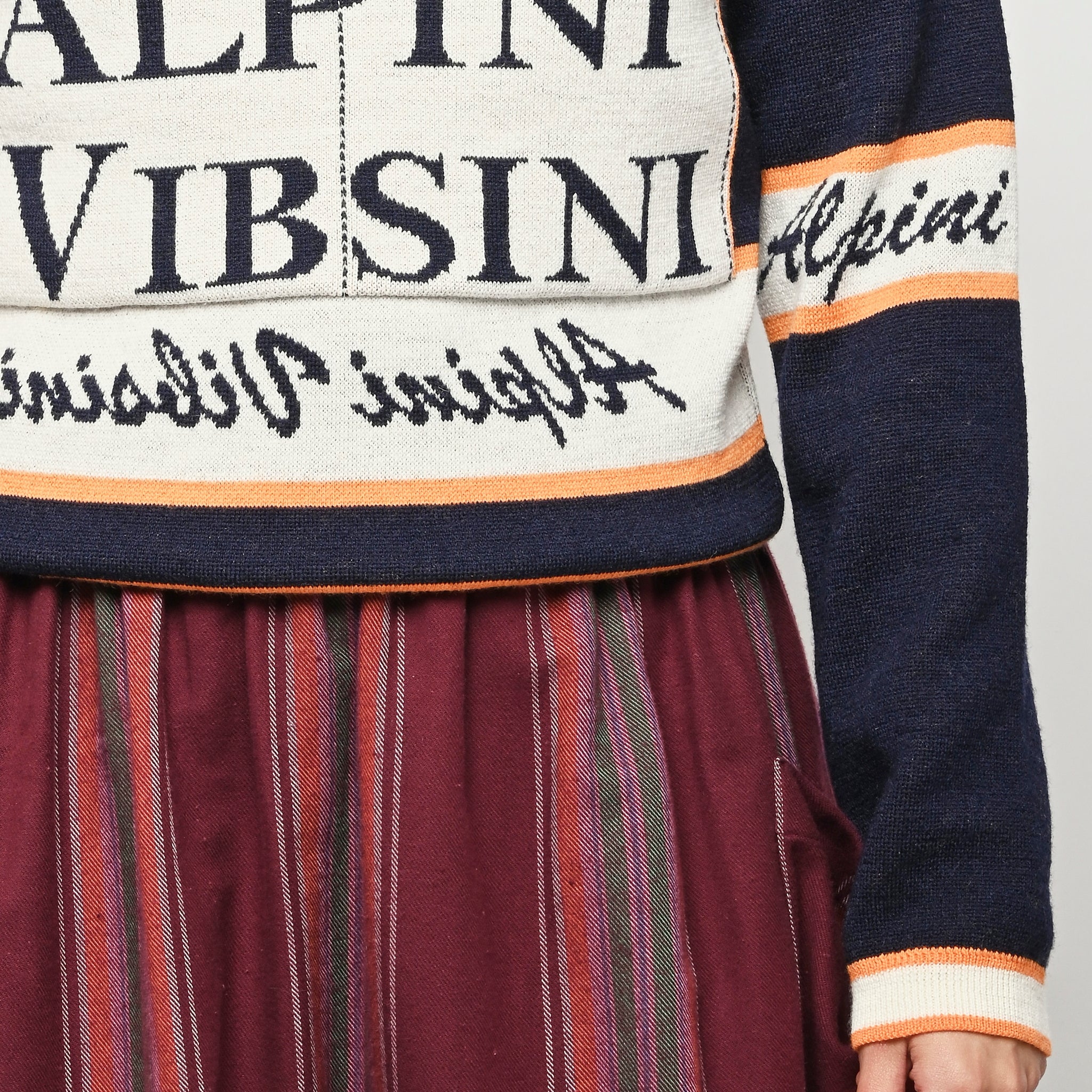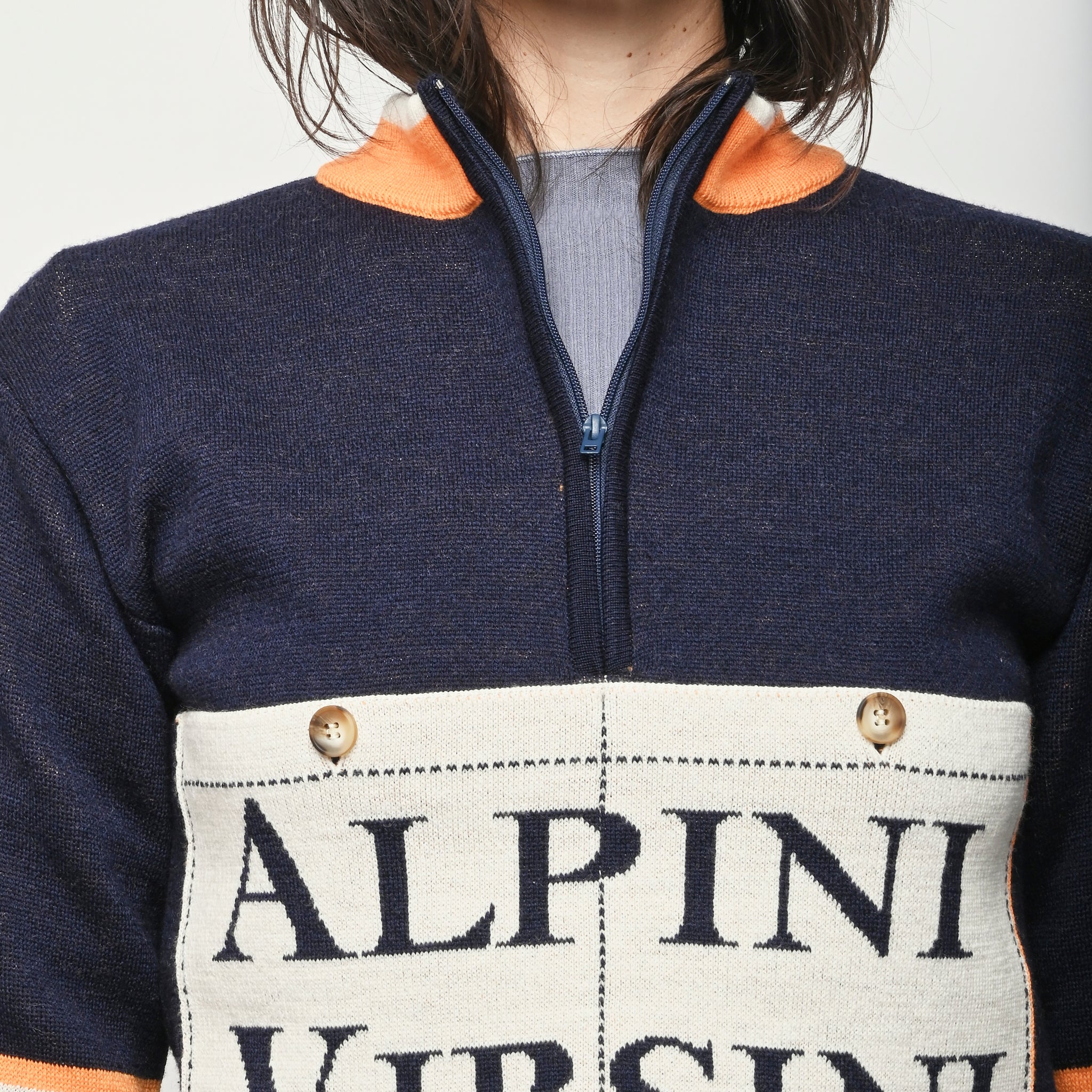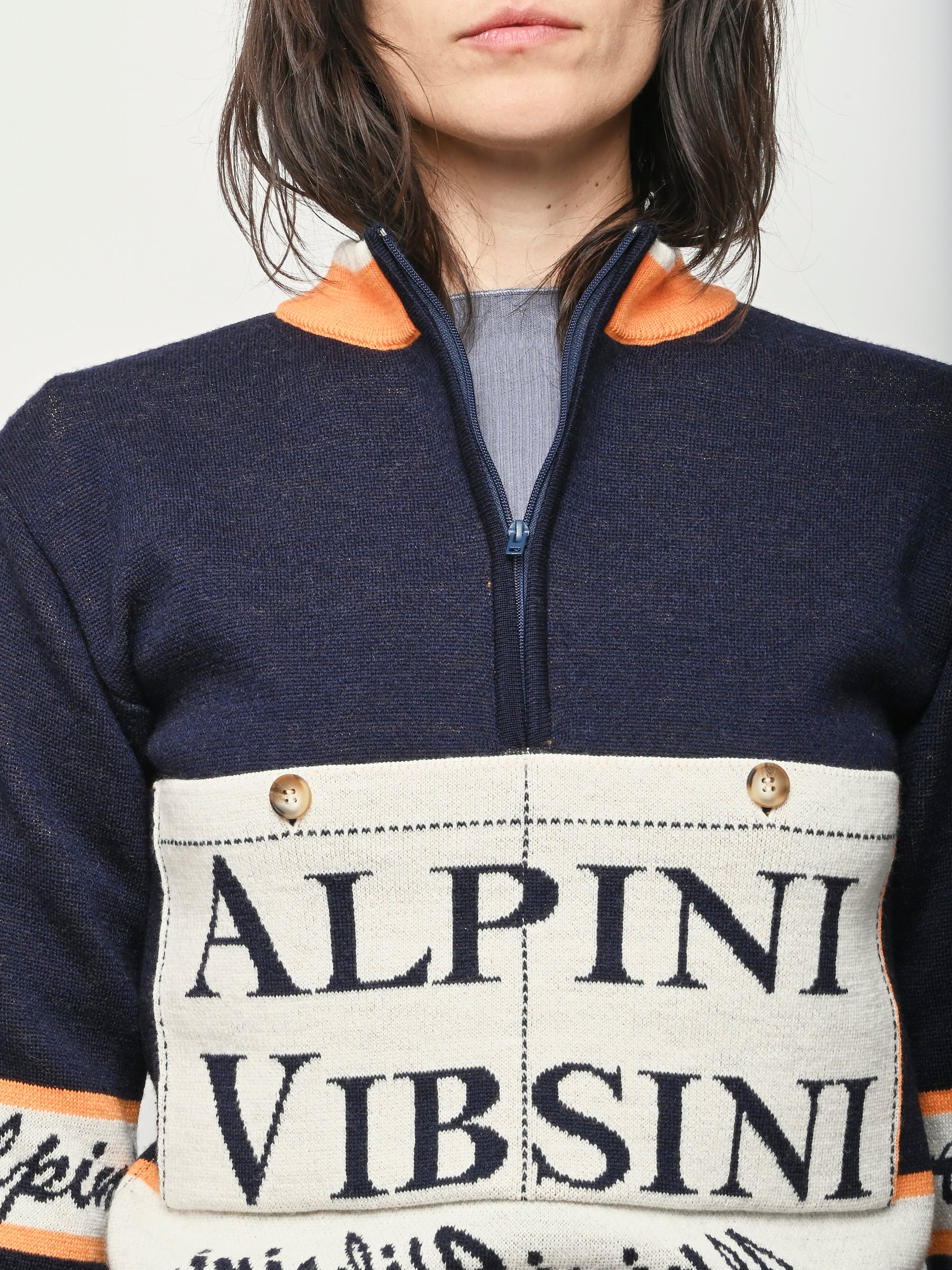 Navy knit in organic wool from Henrik Vibskov. Race Jersey Long Sleeve has a round neck, a half-zip closure and details in orange, off-white and black. The text 'Alpini Vibsini' is woven on the knit.