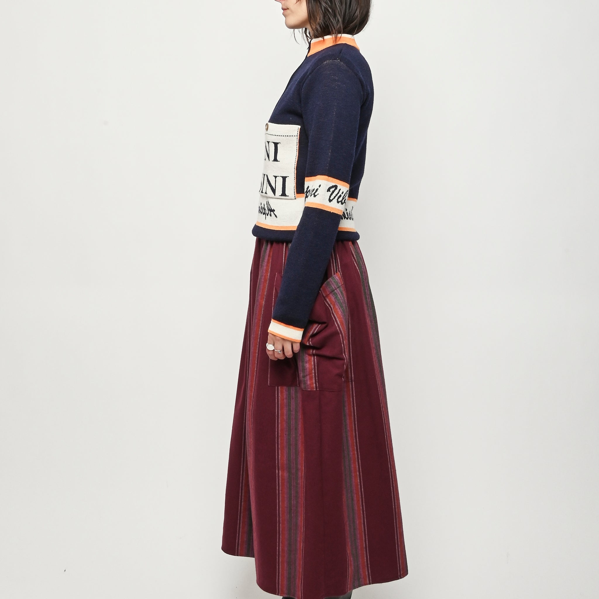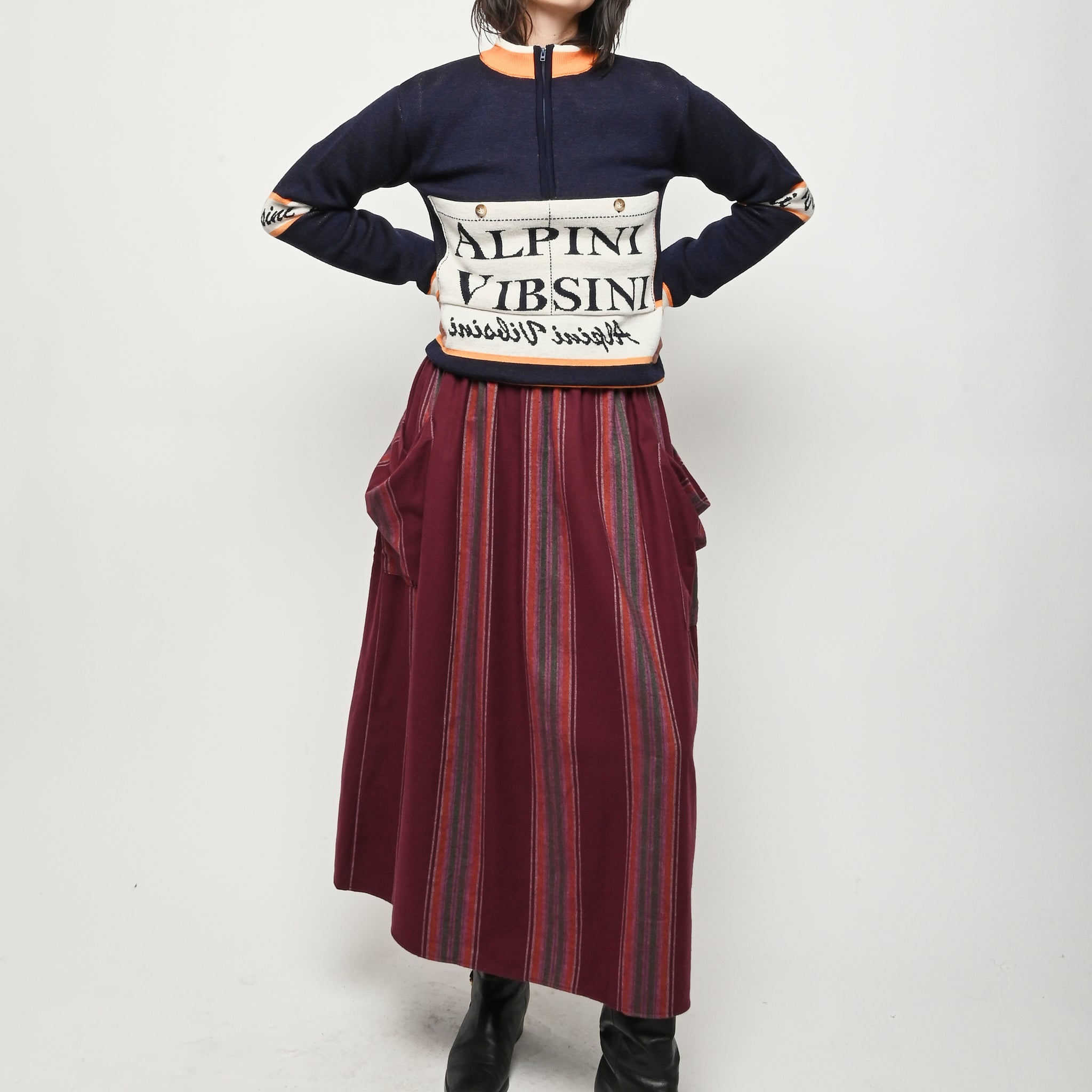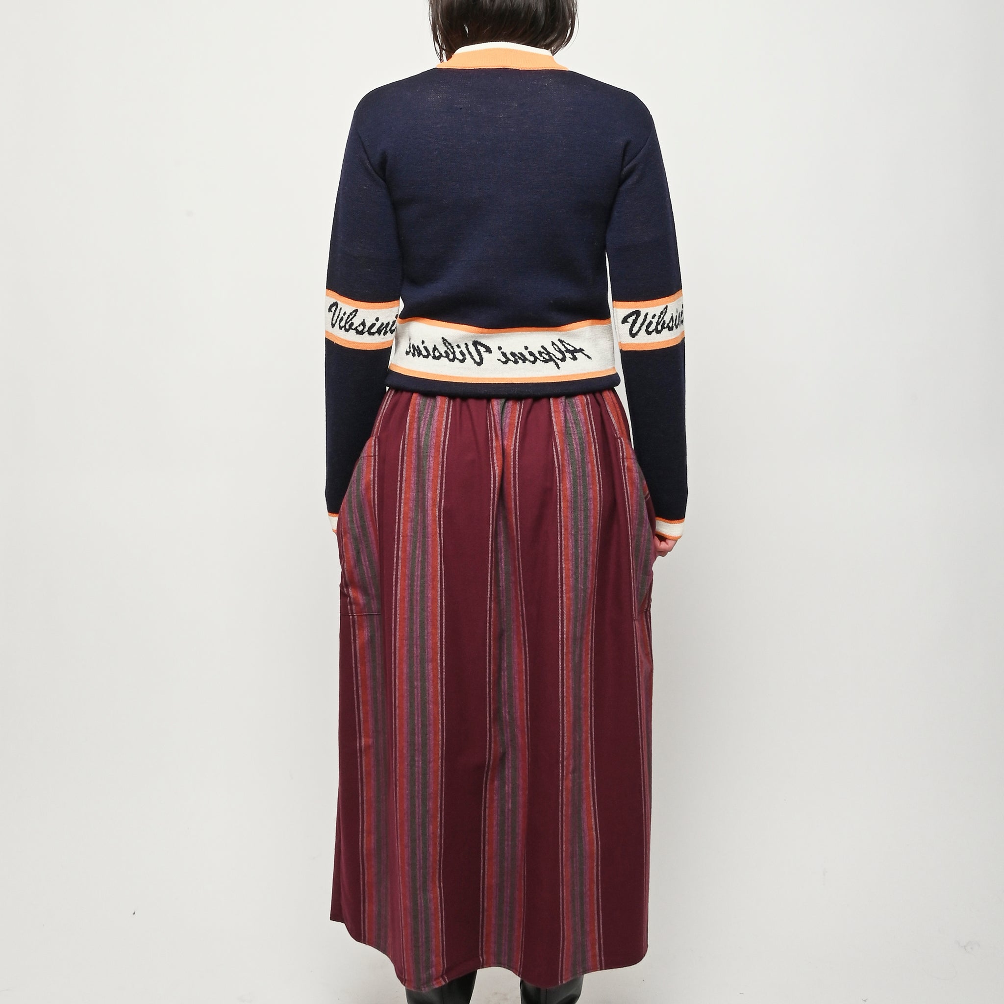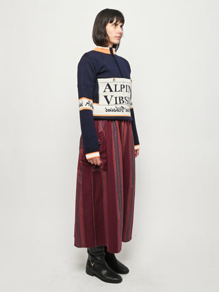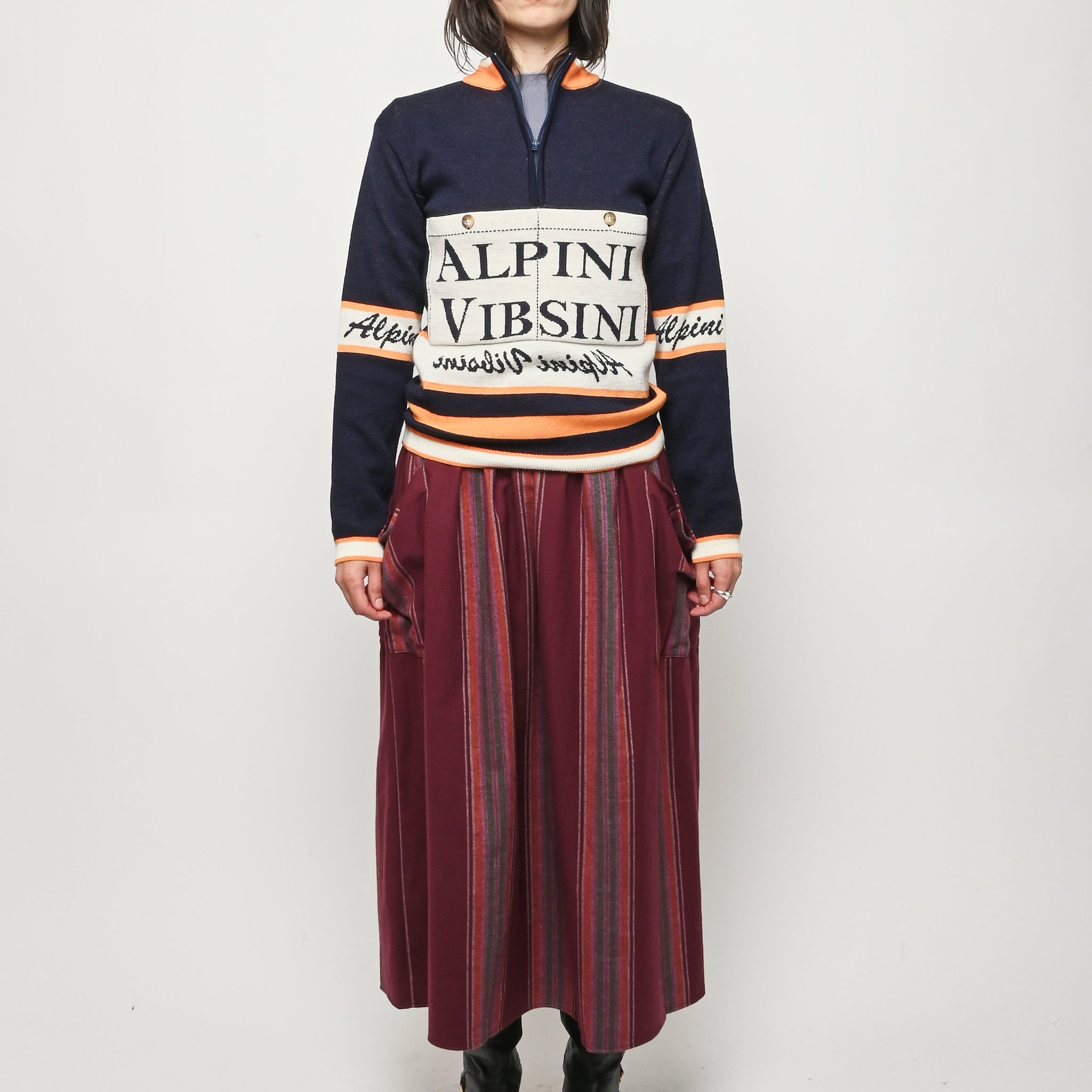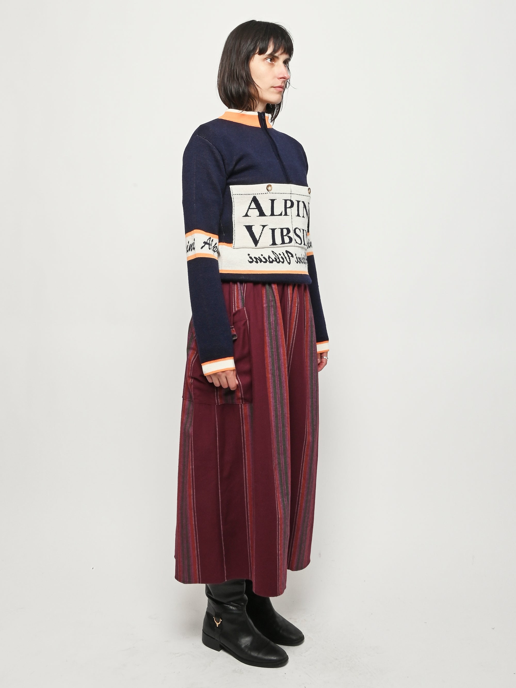 Navy knit in organic wool from Henrik Vibskov. Race Jersey Long Sleeve has a round neck, a half-zip closure and details in orange, off-white and black. The text 'Alpini Vibsini' is woven on the knit.