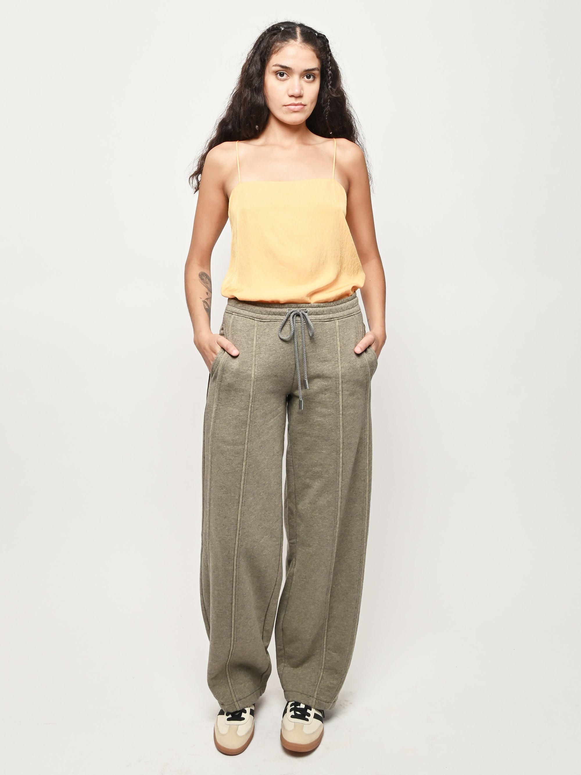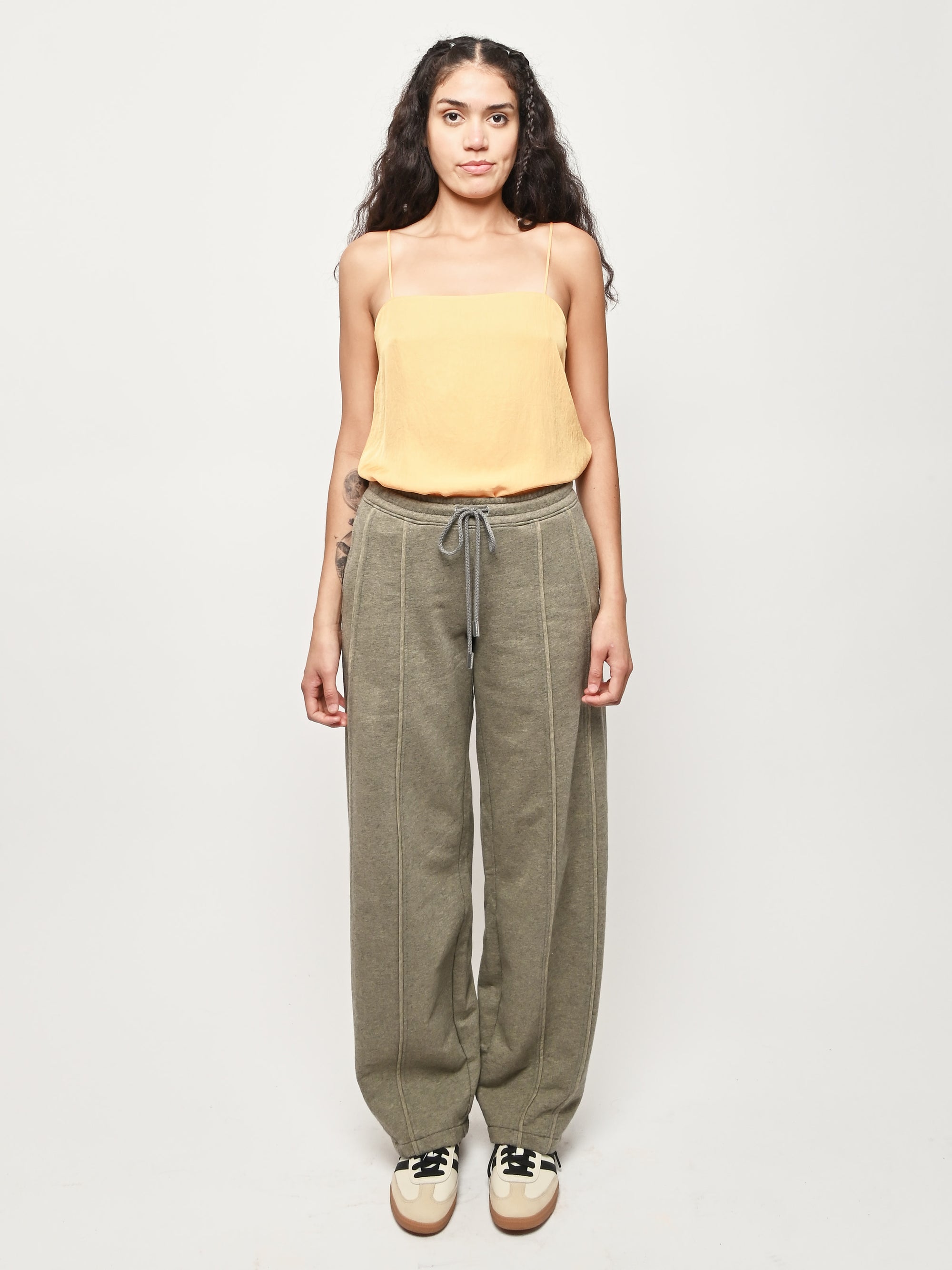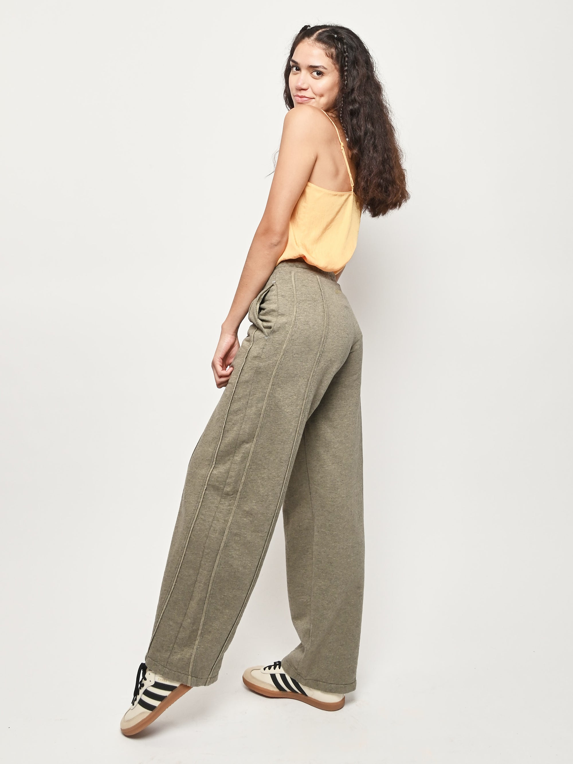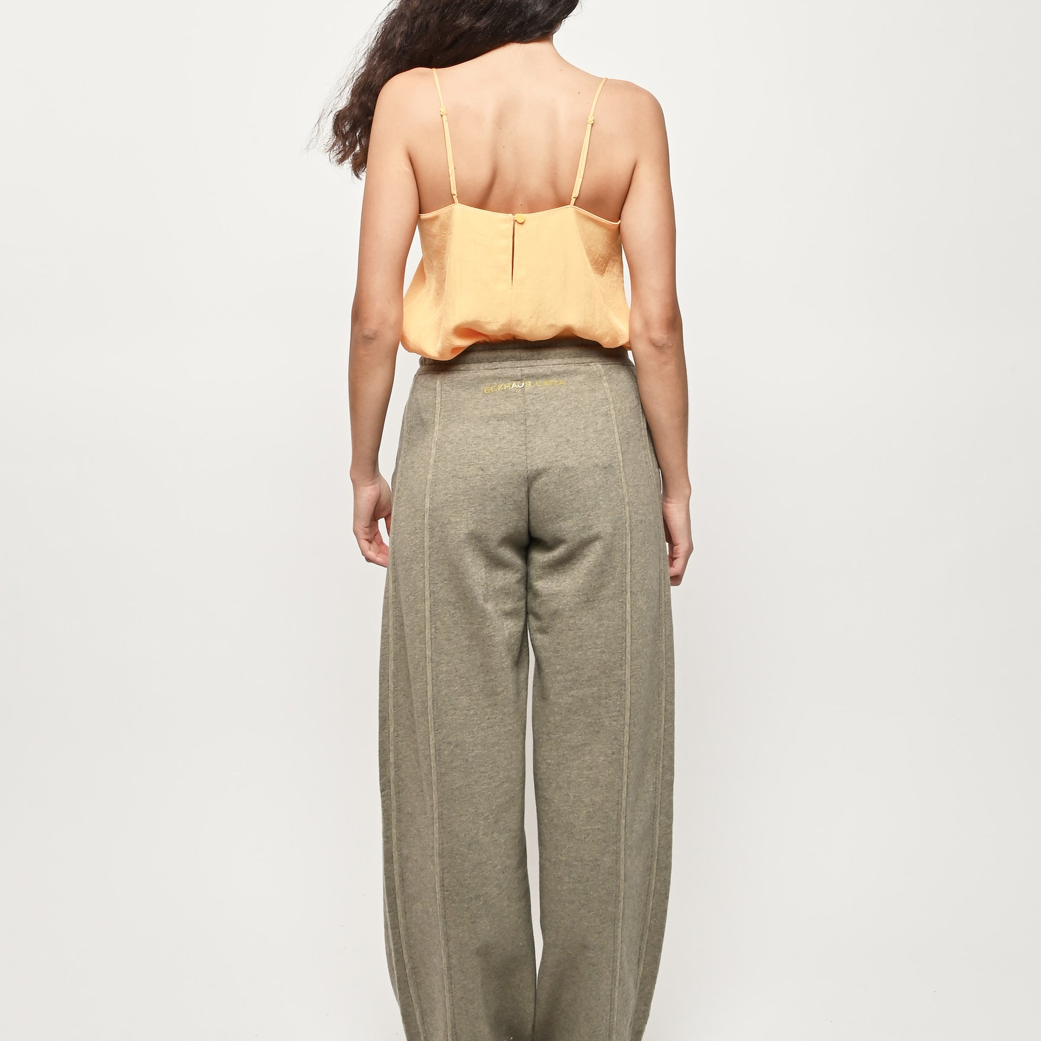 Mid-rise sweatpants in a heather grey fleece with a wide-leg. Overdyed a pale khaki for a vintage look and finished with a glossy green ""Eckhaus Latta"" logo on the rear.