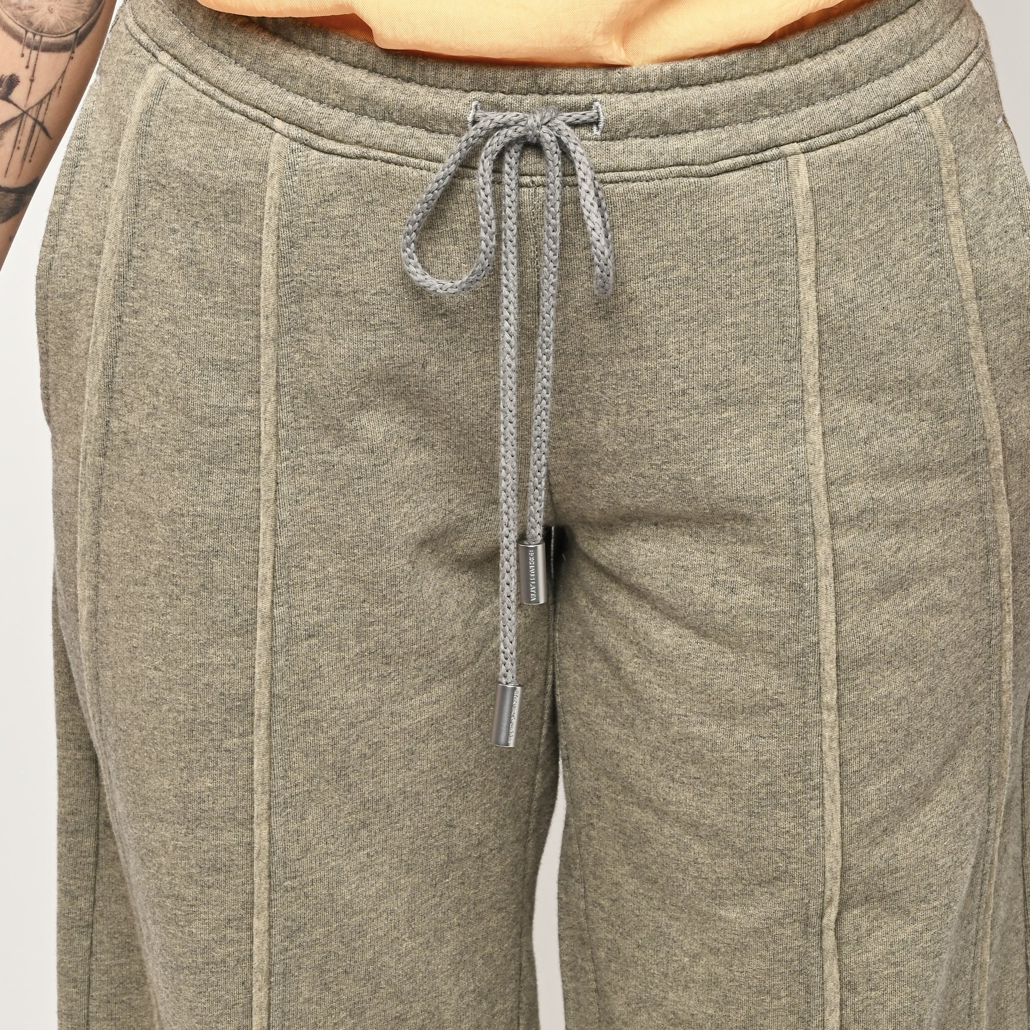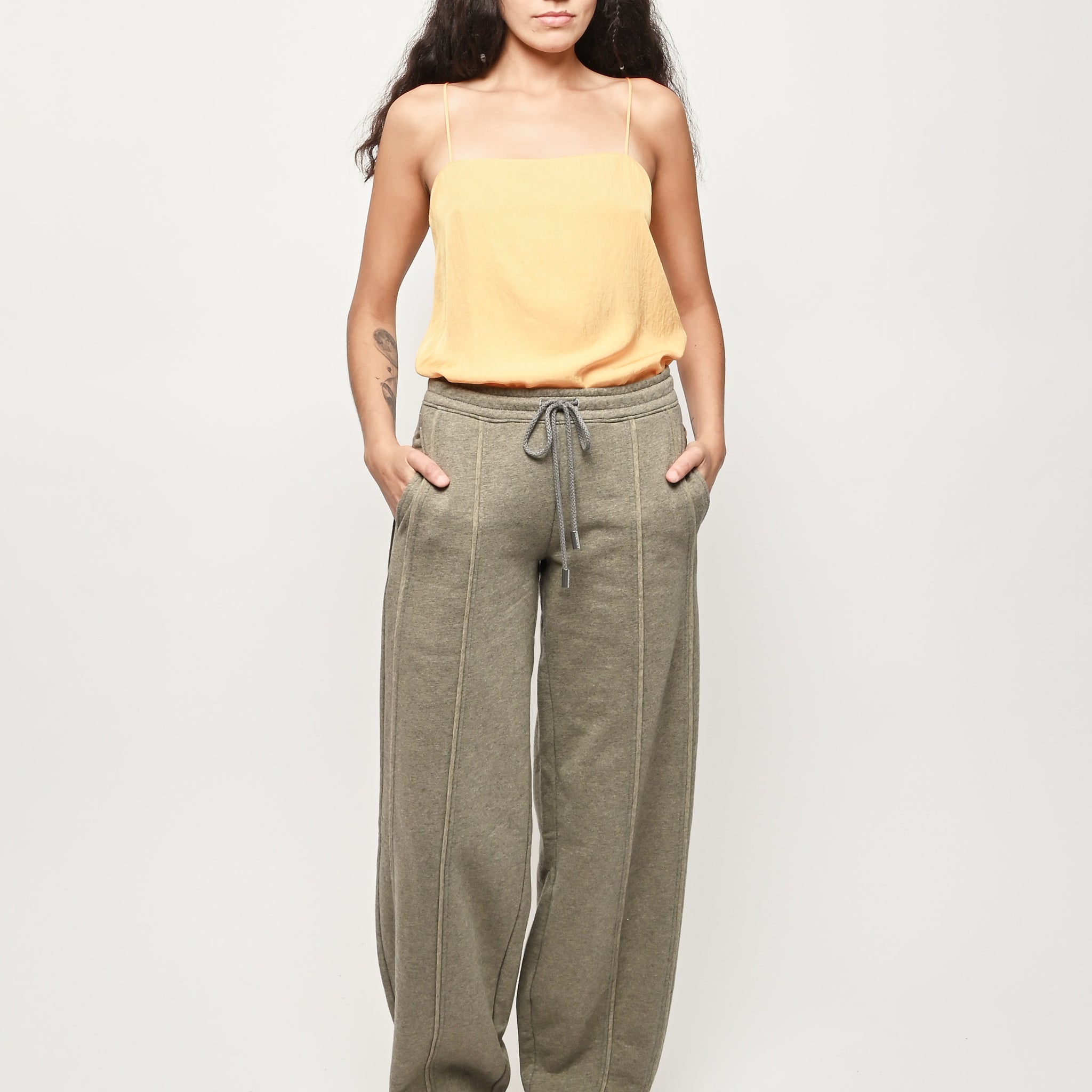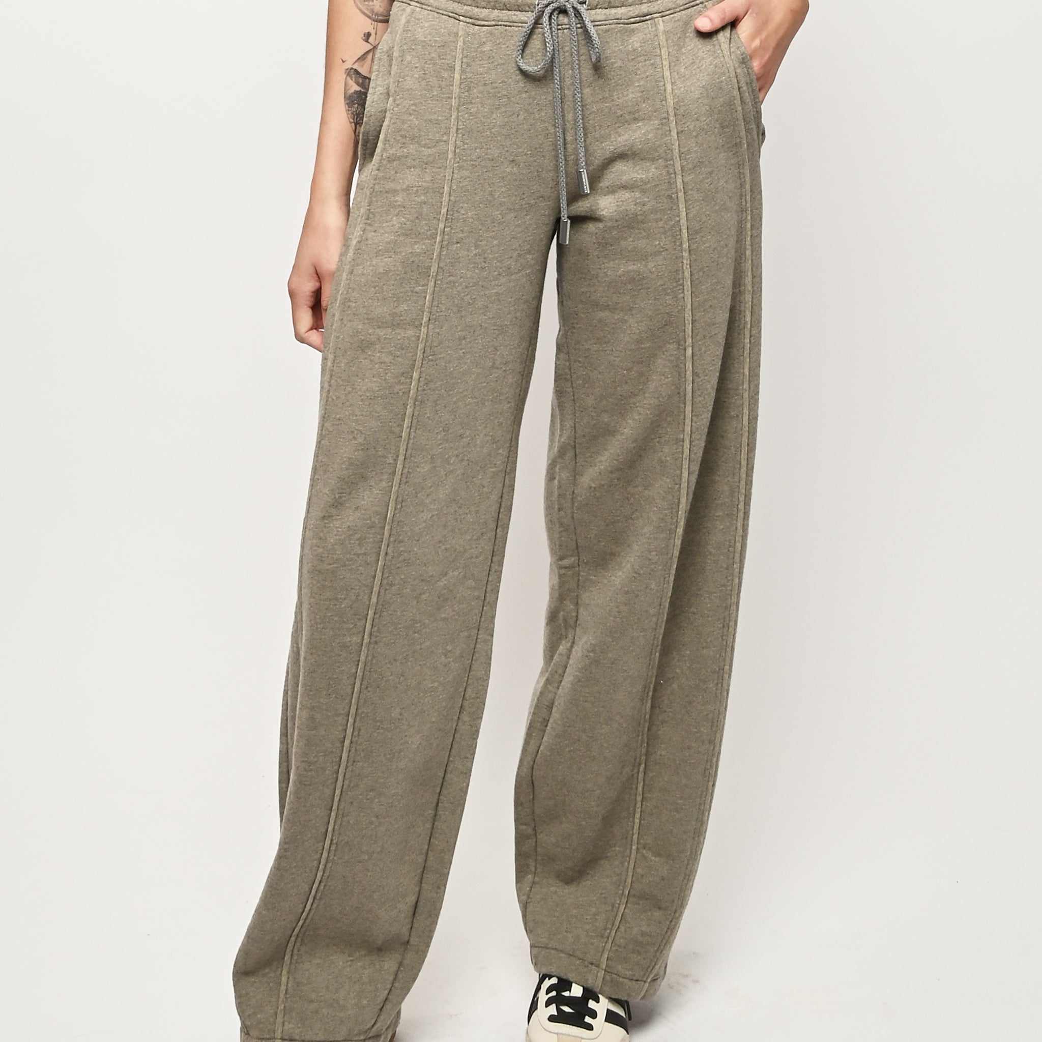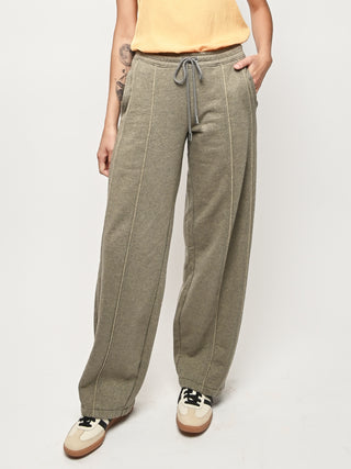 Mid-rise sweatpants in a heather grey fleece with a wide-leg. Overdyed a pale khaki for a vintage look and finished with a glossy green ""Eckhaus Latta"" logo on the rear.