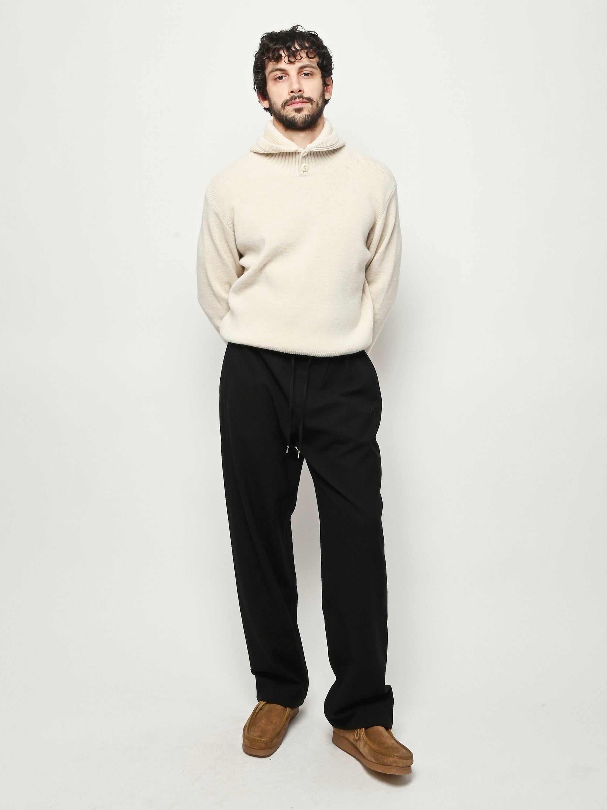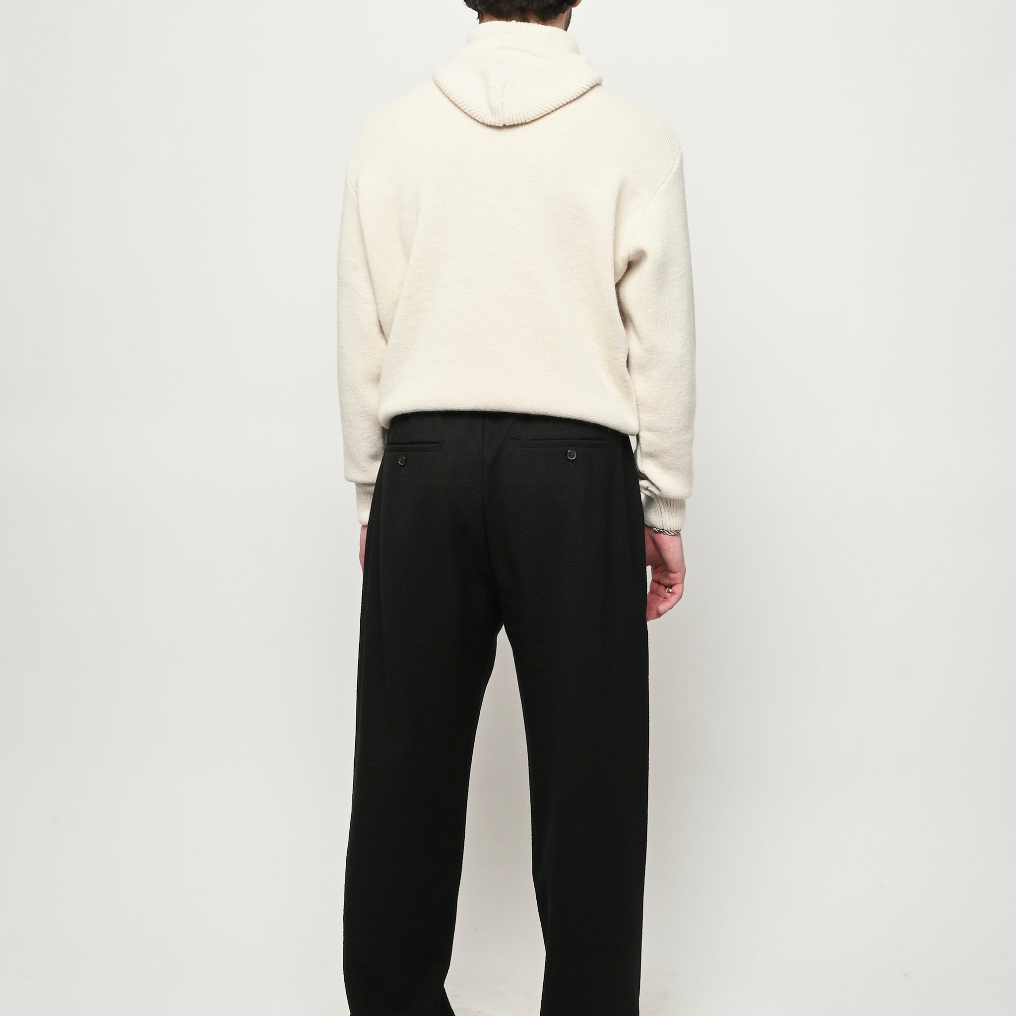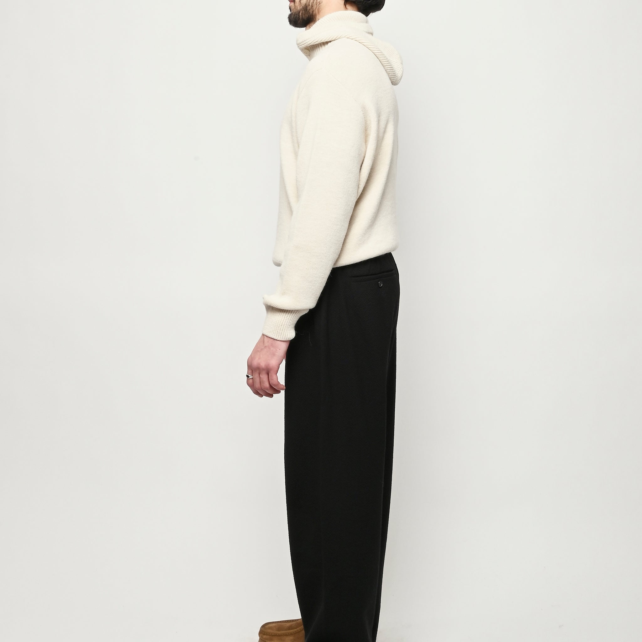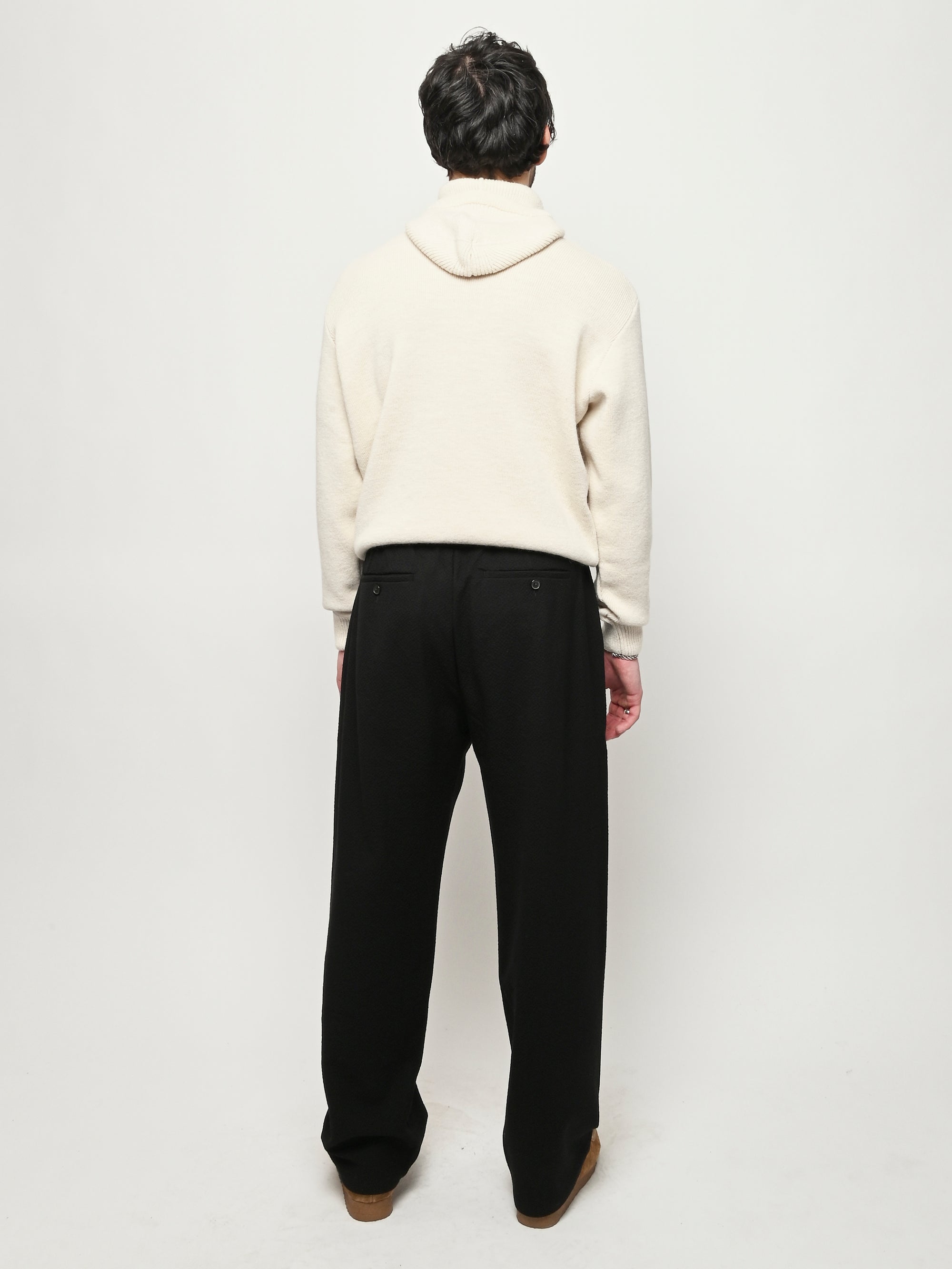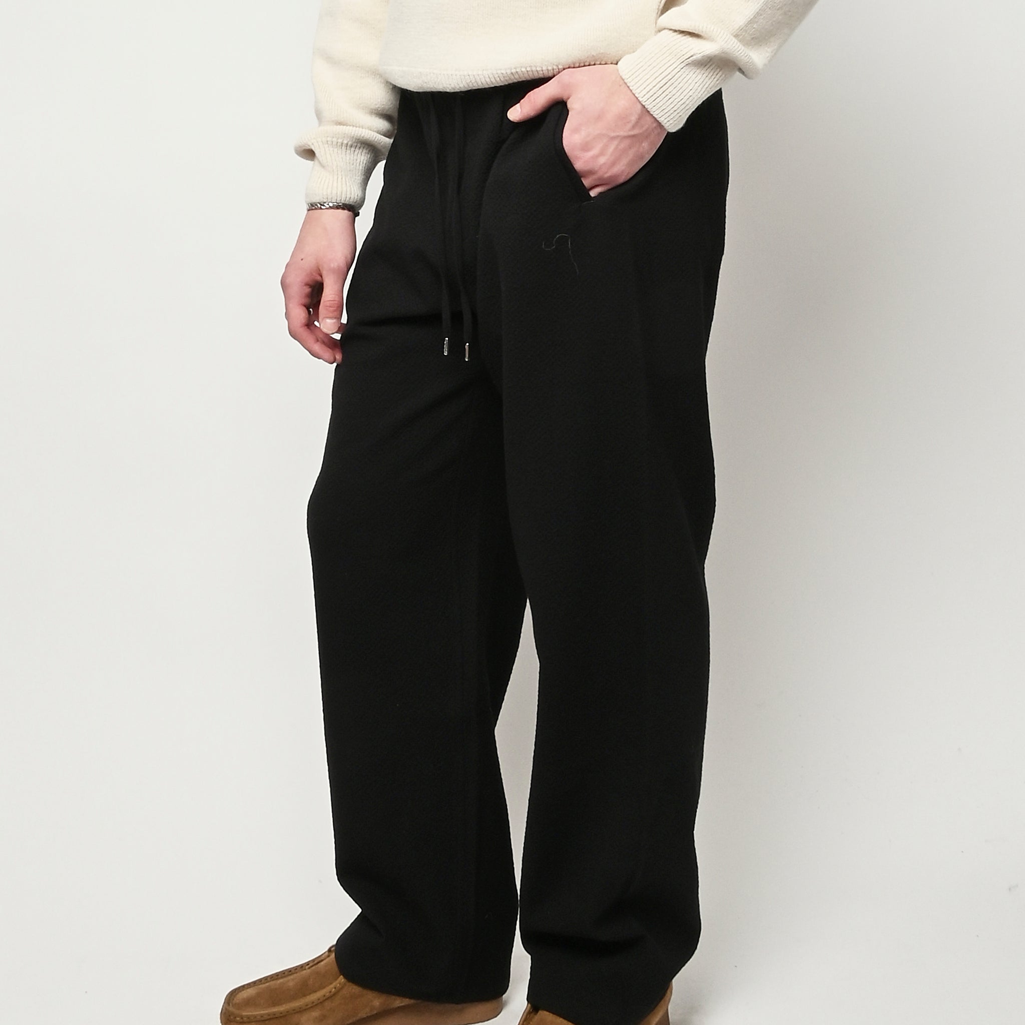The Samurai Trousers by A Kind of Guise have no side seam, offering a wide straight fit with an elasticated waistband and welt pockets at the front and back, both with button closures. They are made from a structured seersucker fabric made from a wool–cotton blend, featuring a subtle puckered texture. Slightly stretchy with a soft, warm handfeel for added comfort.