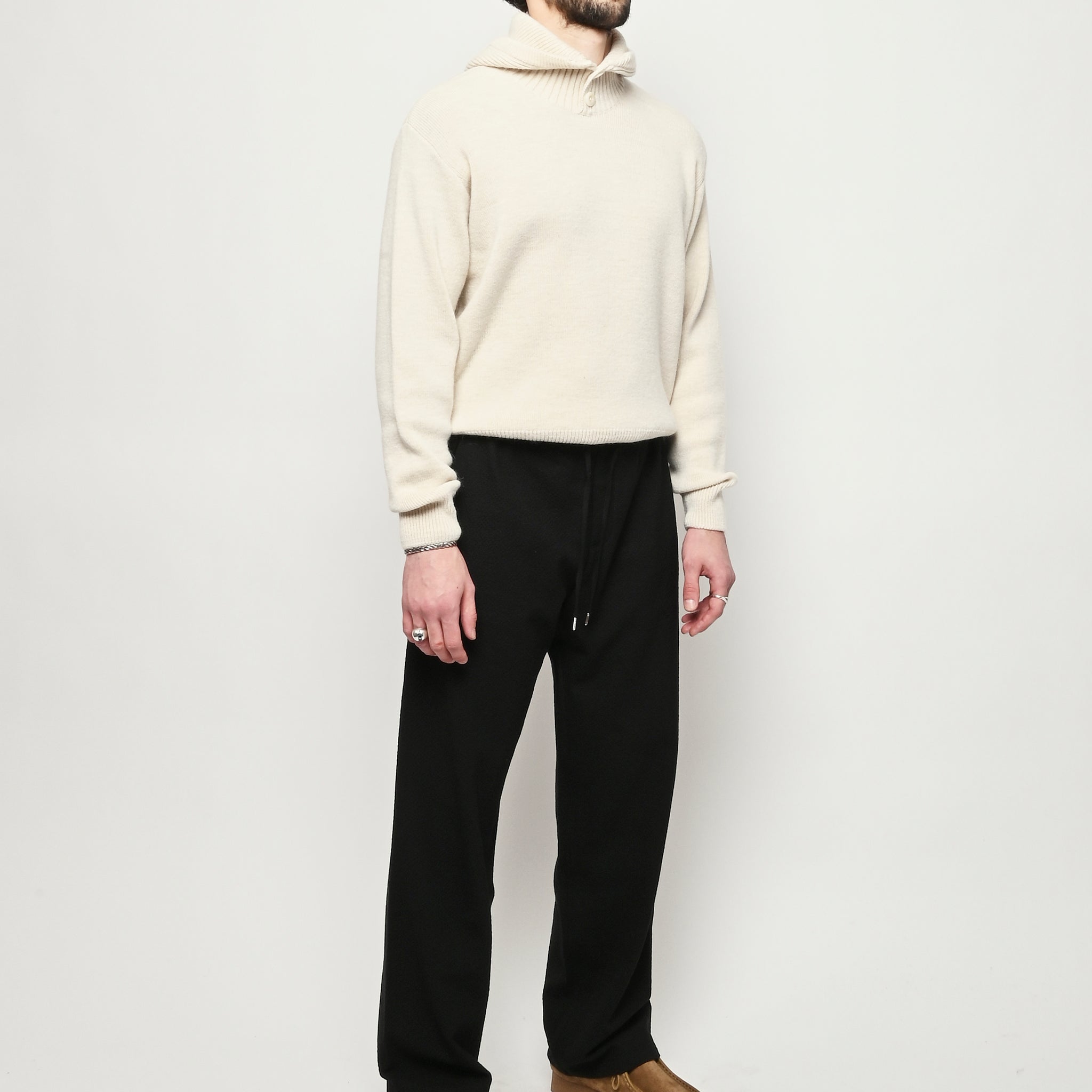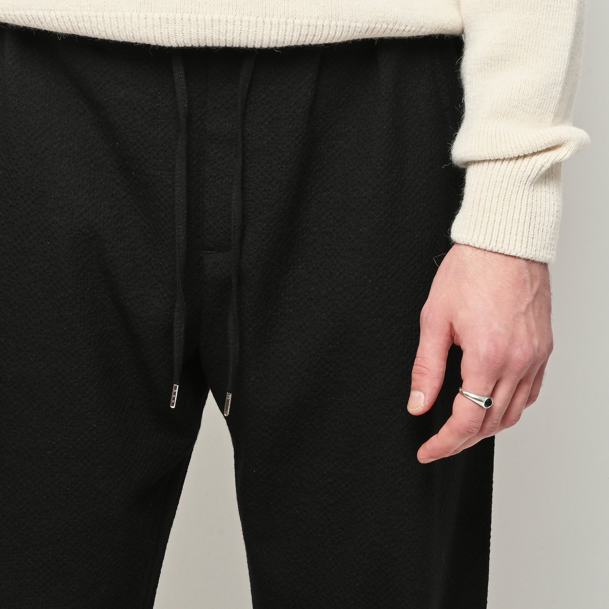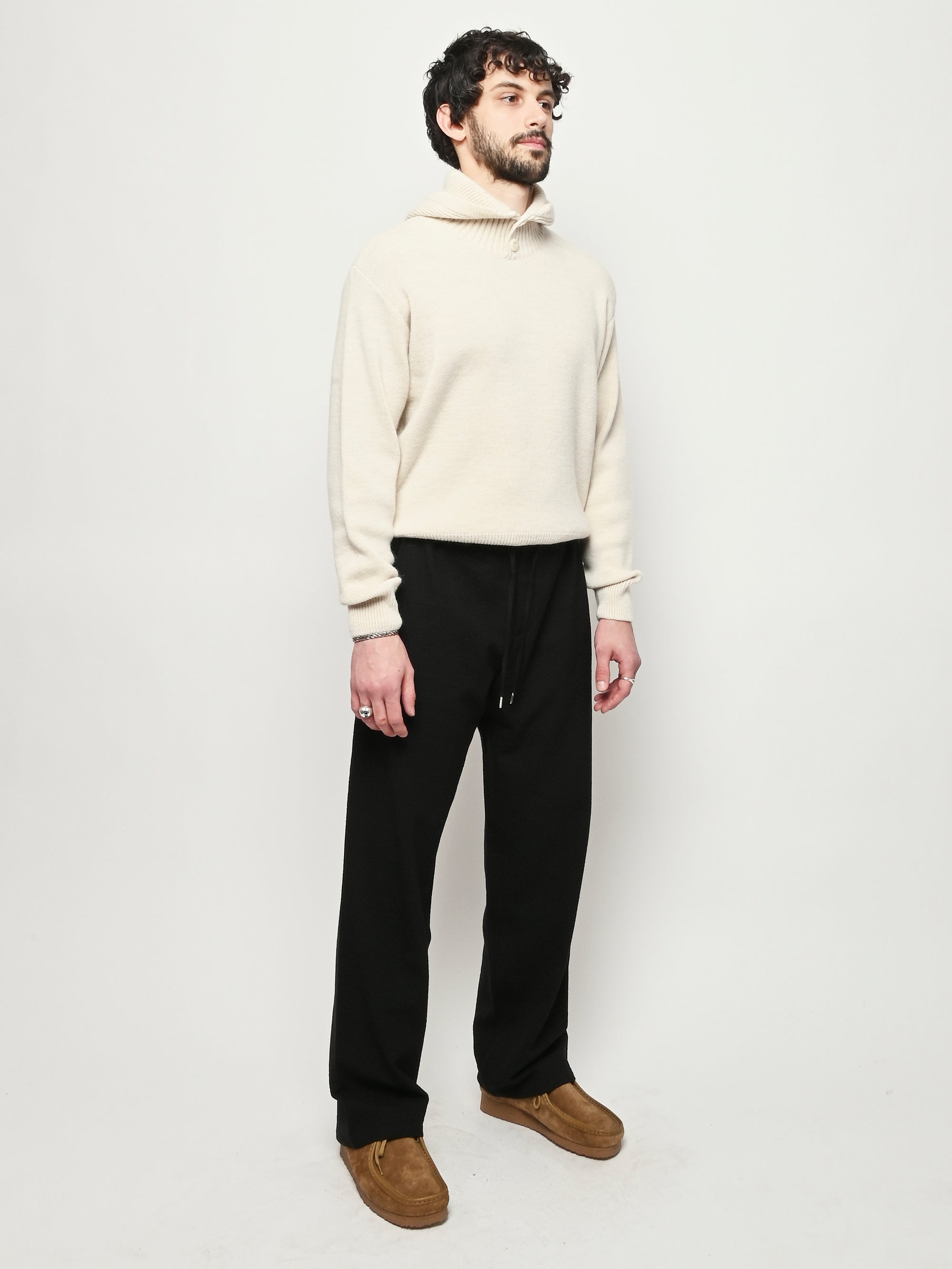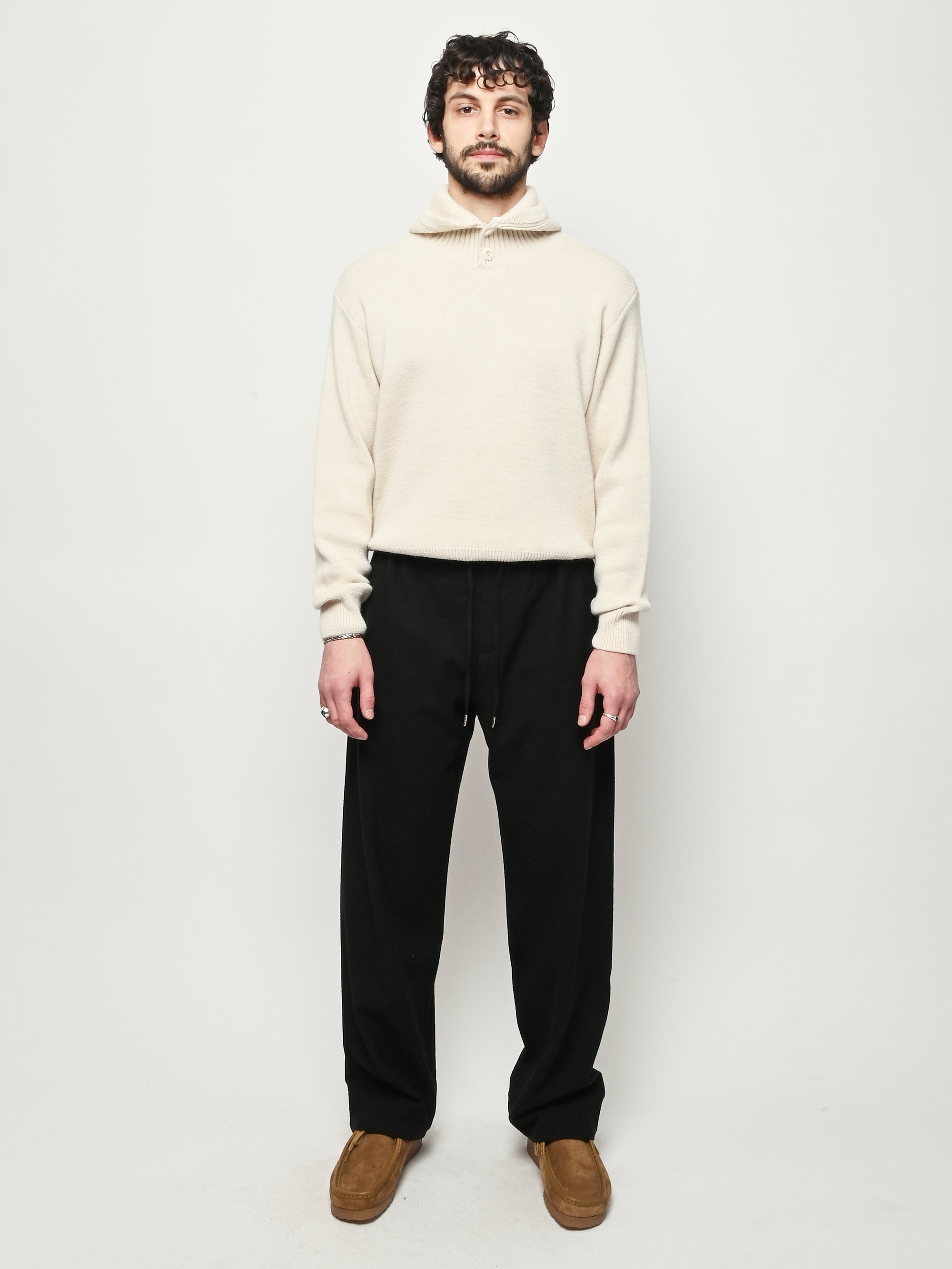 The Samurai Trousers by A Kind of Guise have no side seam, offering a wide straight fit with an elasticated waistband and welt pockets at the front and back, both with button closures. They are made from a structured seersucker fabric made from a wool–cotton blend, featuring a subtle puckered texture. Slightly stretchy with a soft, warm handfeel for added comfort.