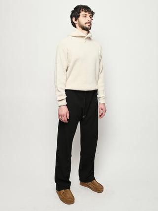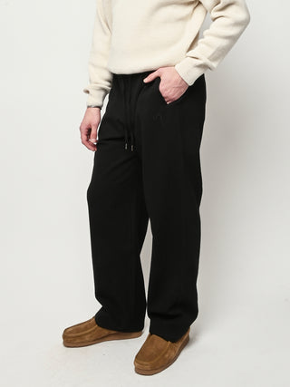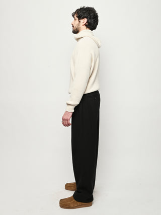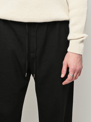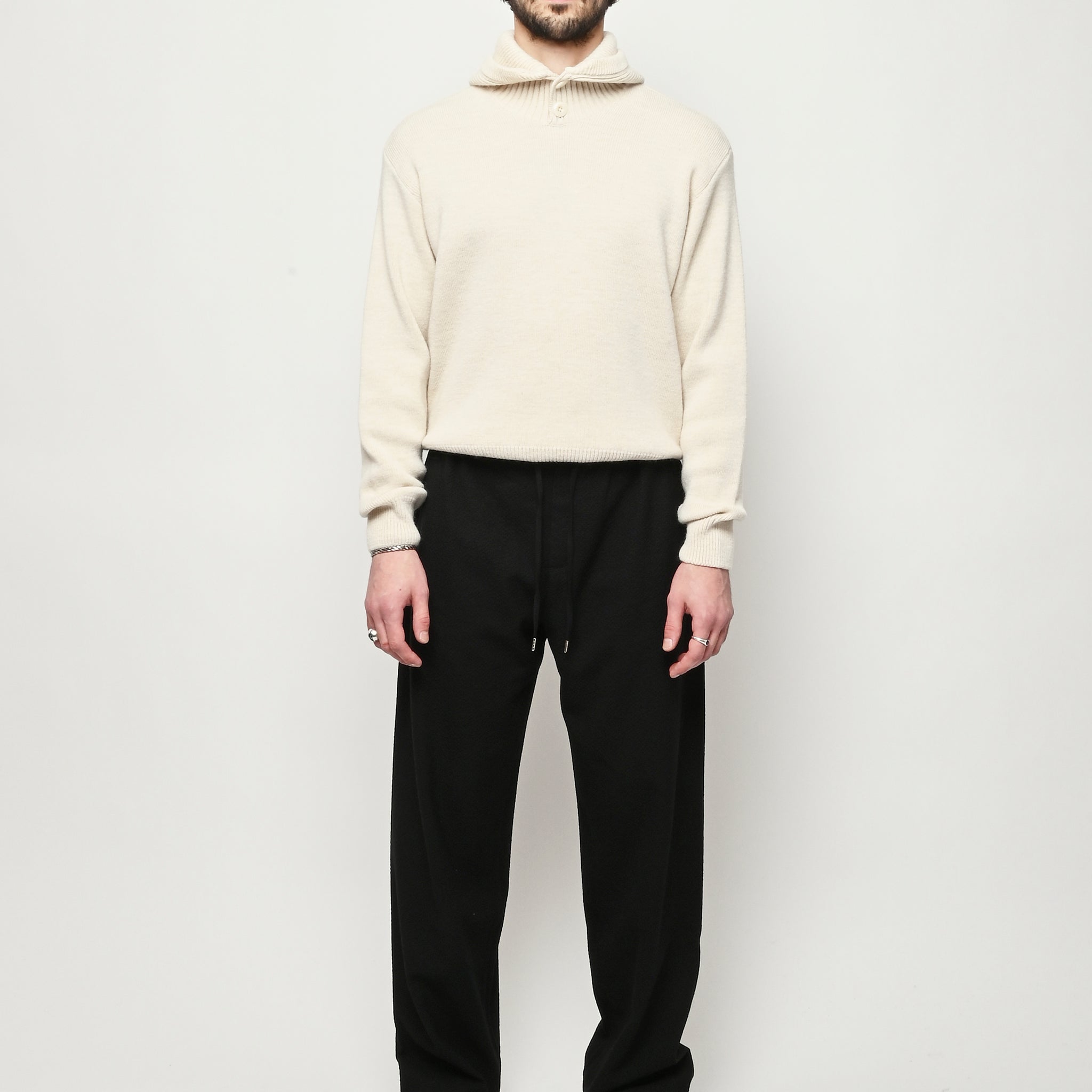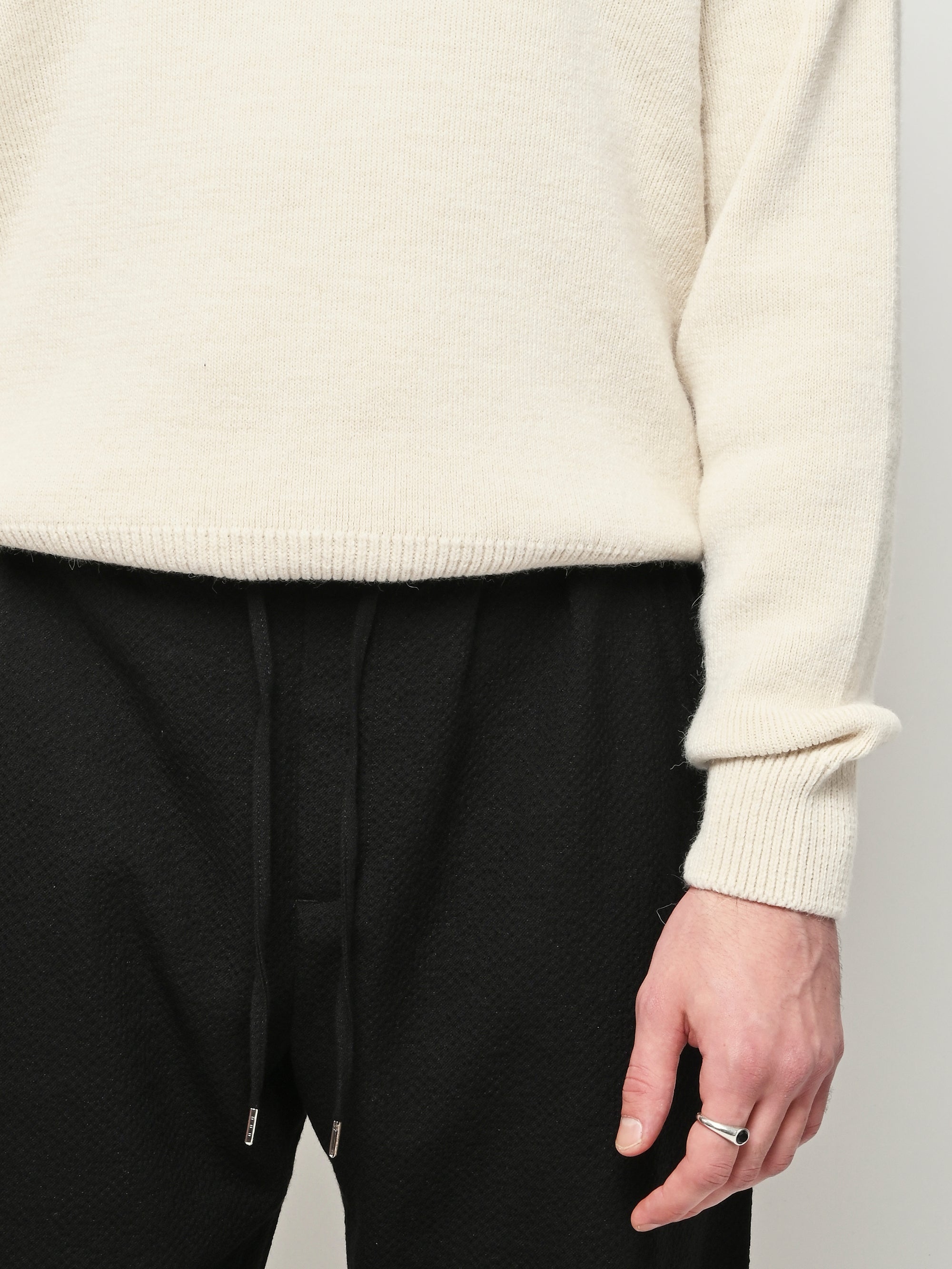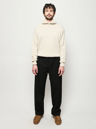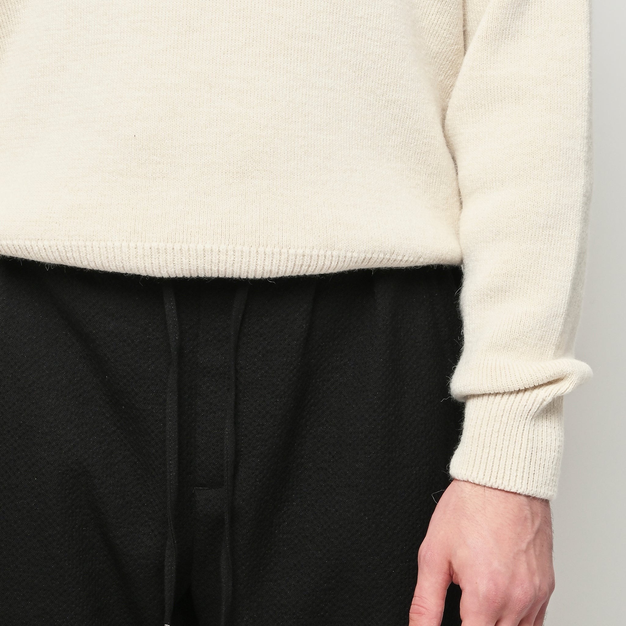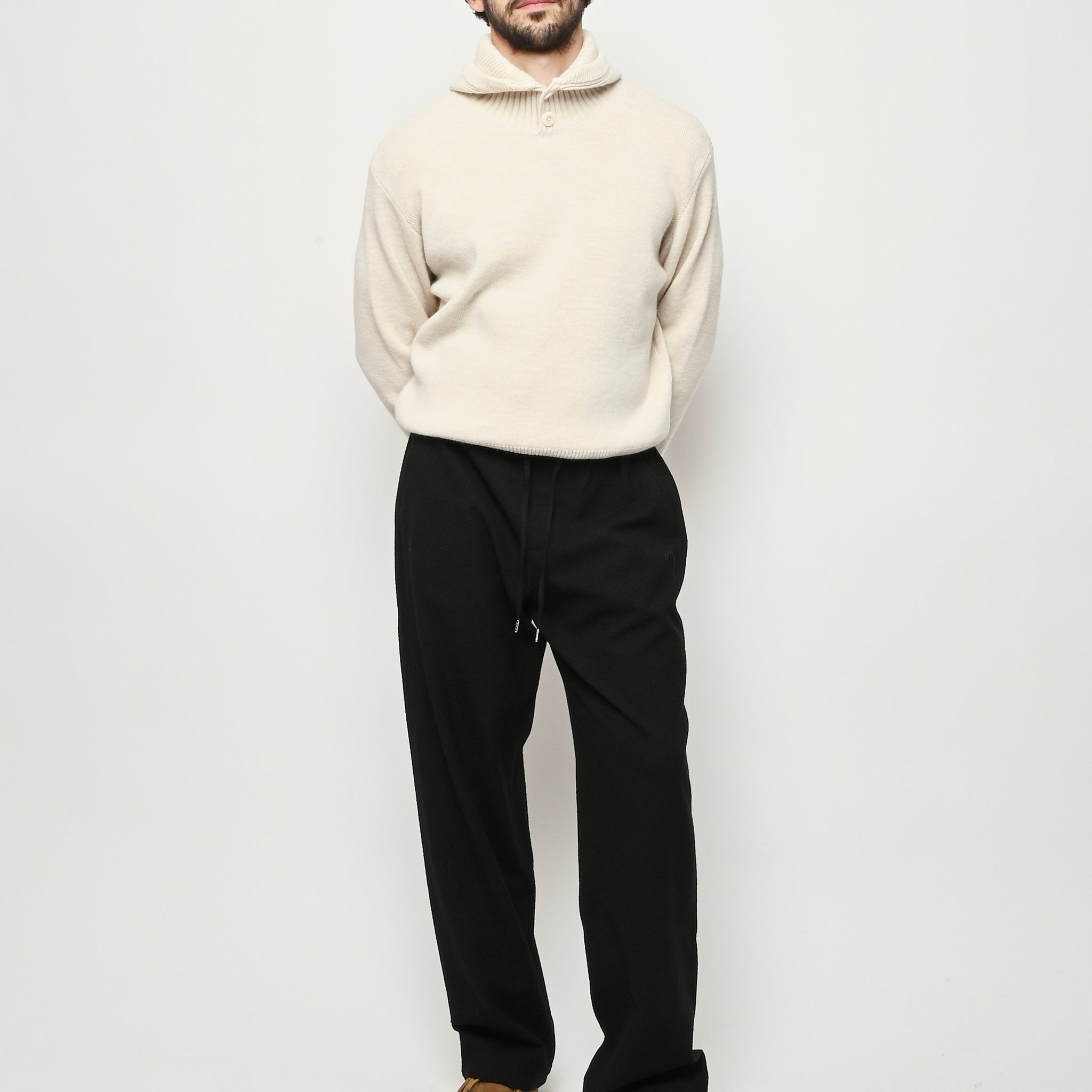 The Samurai Trousers by A Kind of Guise have no side seam, offering a wide straight fit with an elasticated waistband and welt pockets at the front and back, both with button closures. They are made from a structured seersucker fabric made from a wool–cotton blend, featuring a subtle puckered texture. Slightly stretchy with a soft, warm handfeel for added comfort.