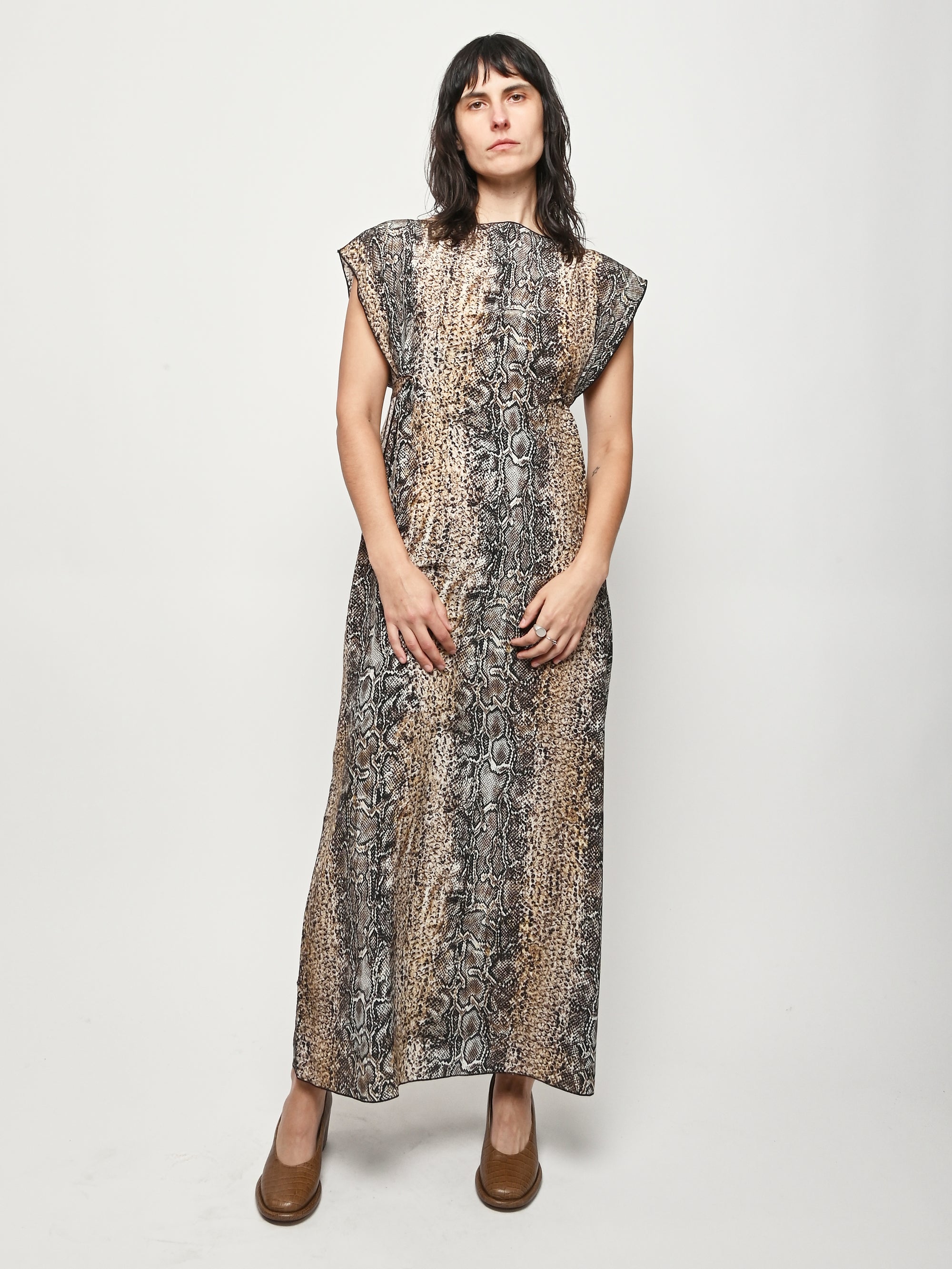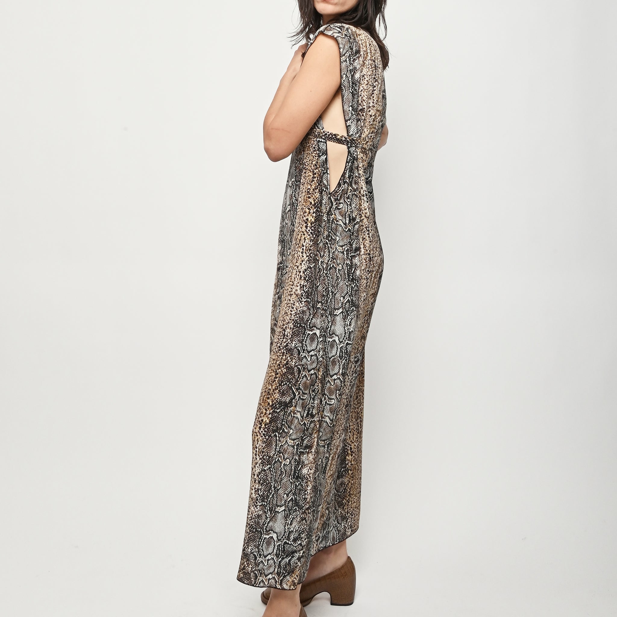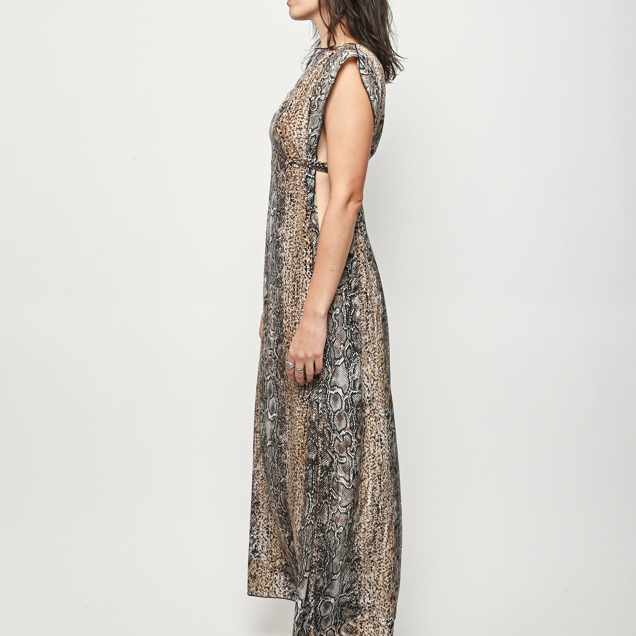 Silk crepe dress by Baserange featuring an allover snake print. This style can be worn multiple ways.