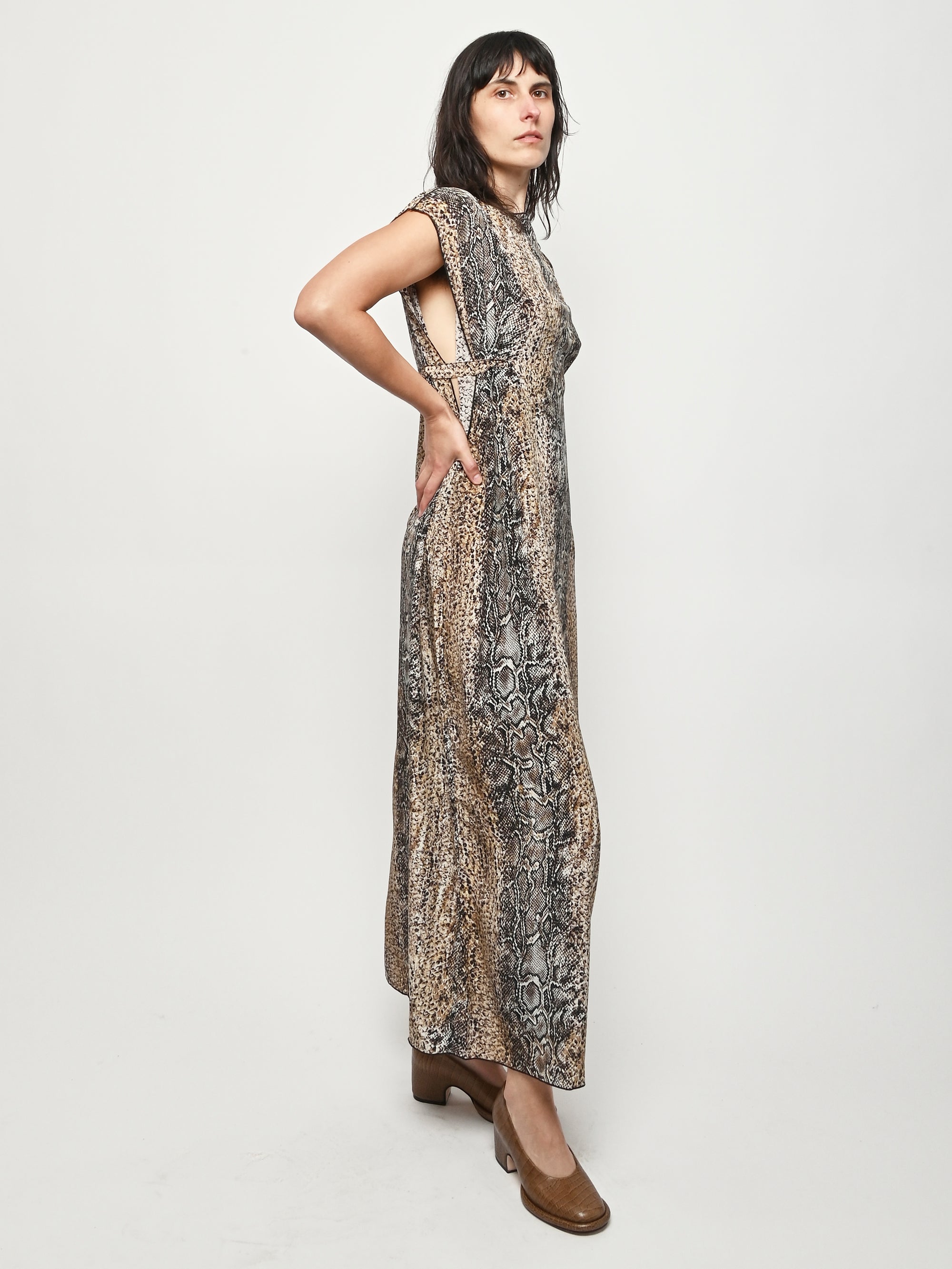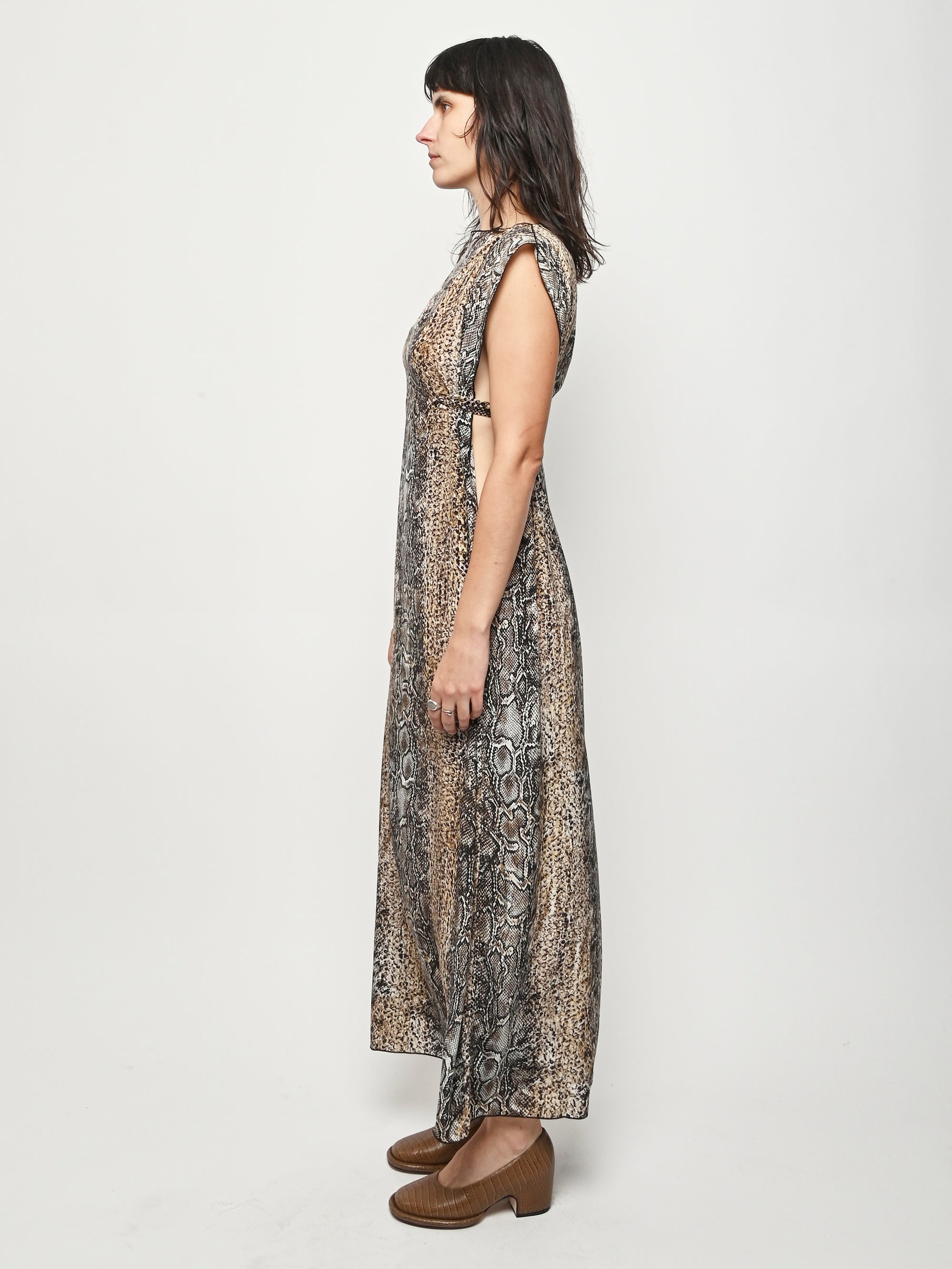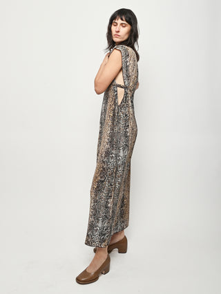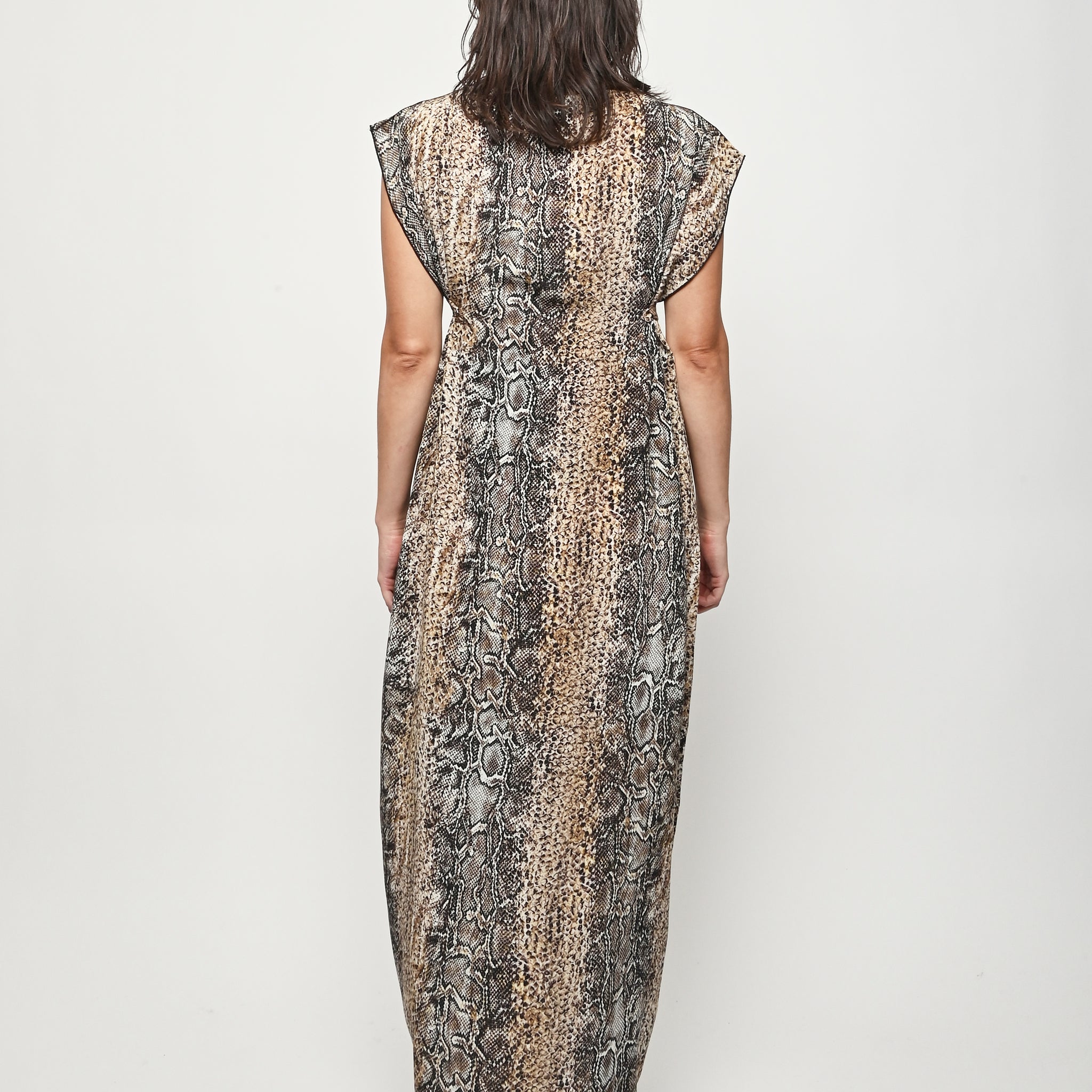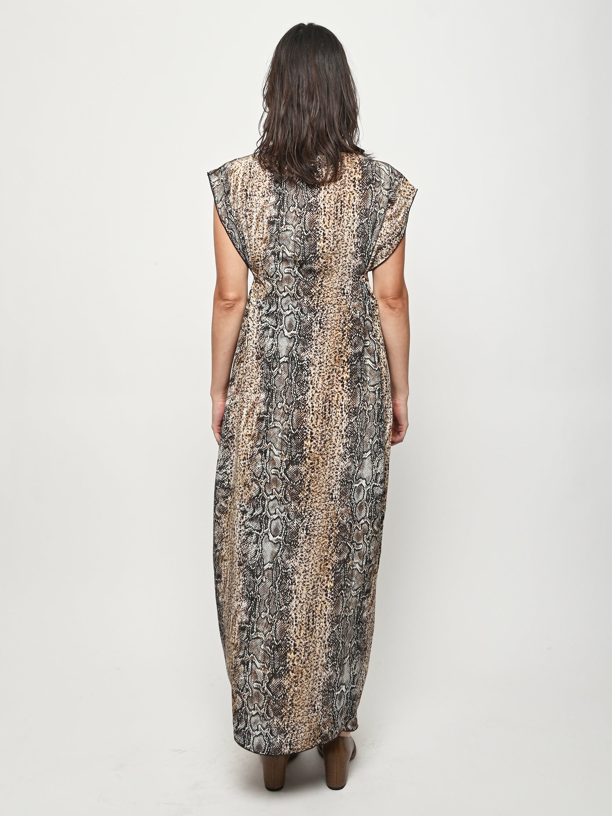 Silk crepe dress by Baserange featuring an allover snake print. This style can be worn multiple ways.
