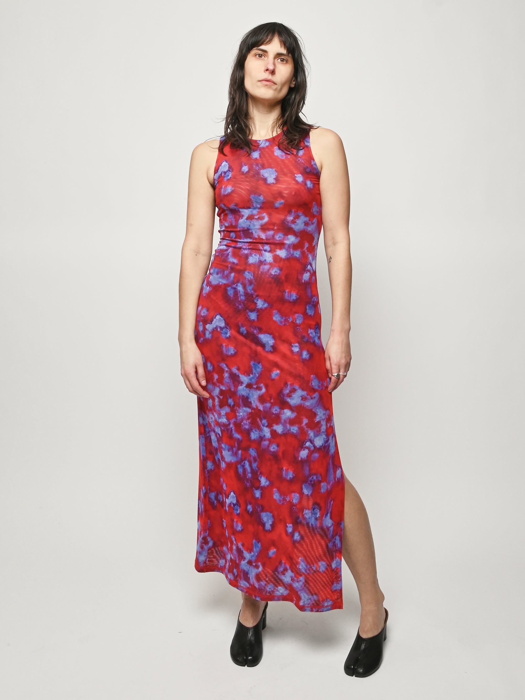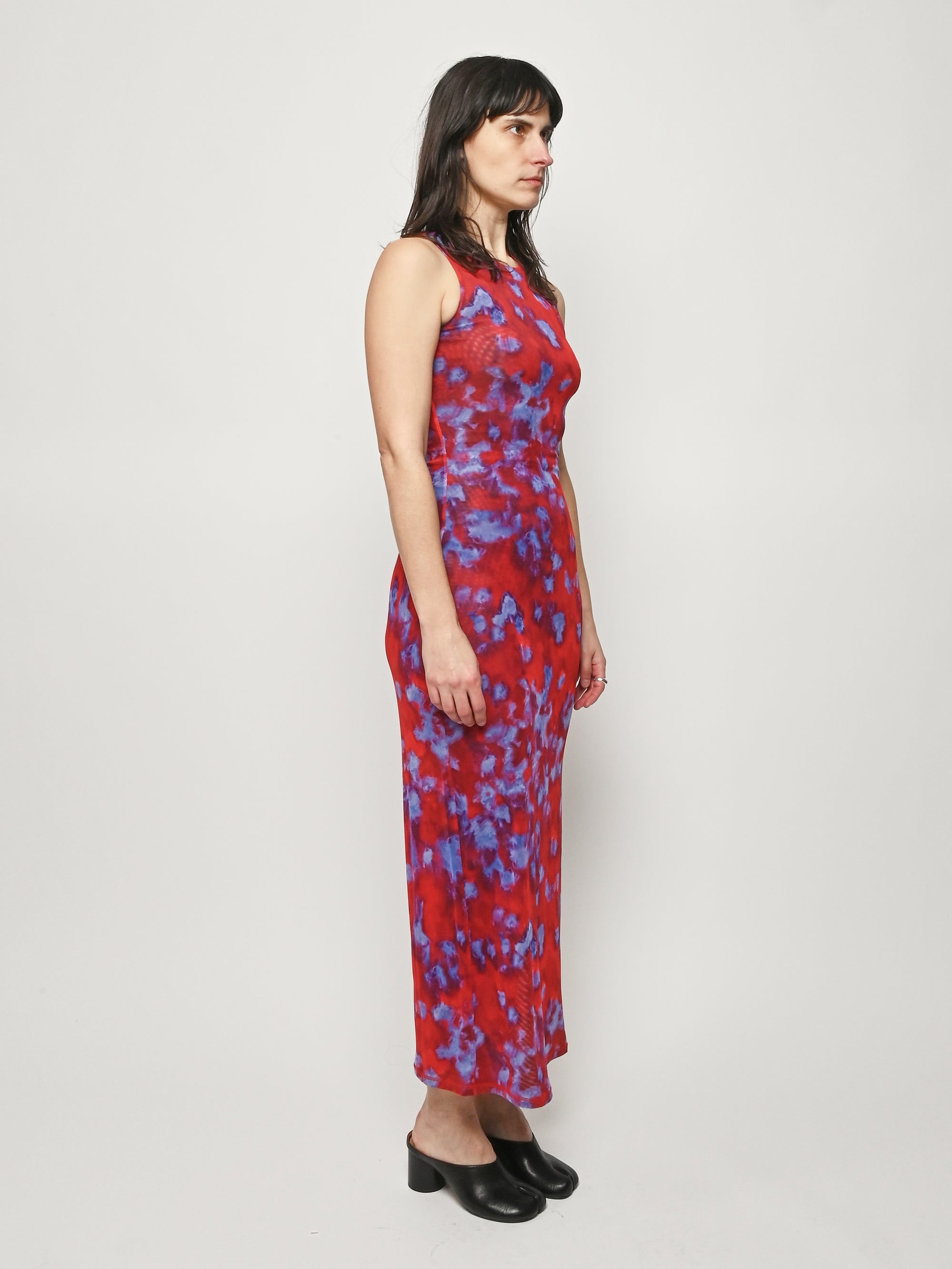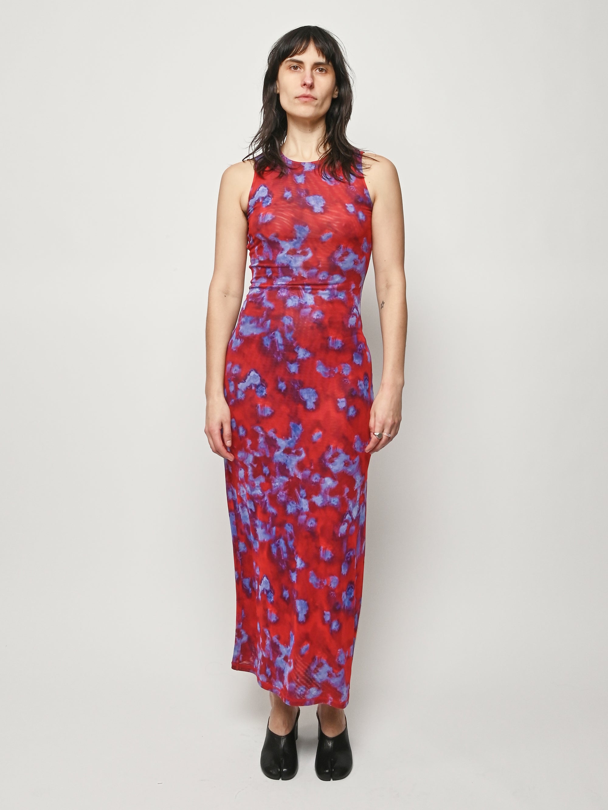 Slim-fit, full-length sleeveless dress by Eckhaus Latta, made in double-layer digitally printed micro mesh, featuring a distinct all-over print on the top layer and a slit at the left side seam.