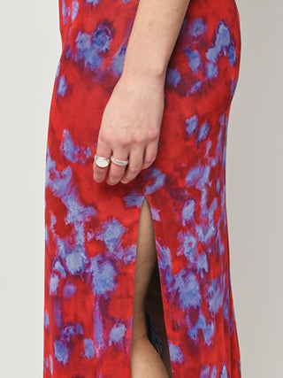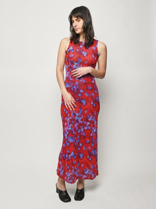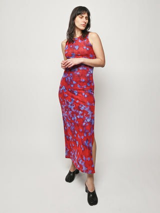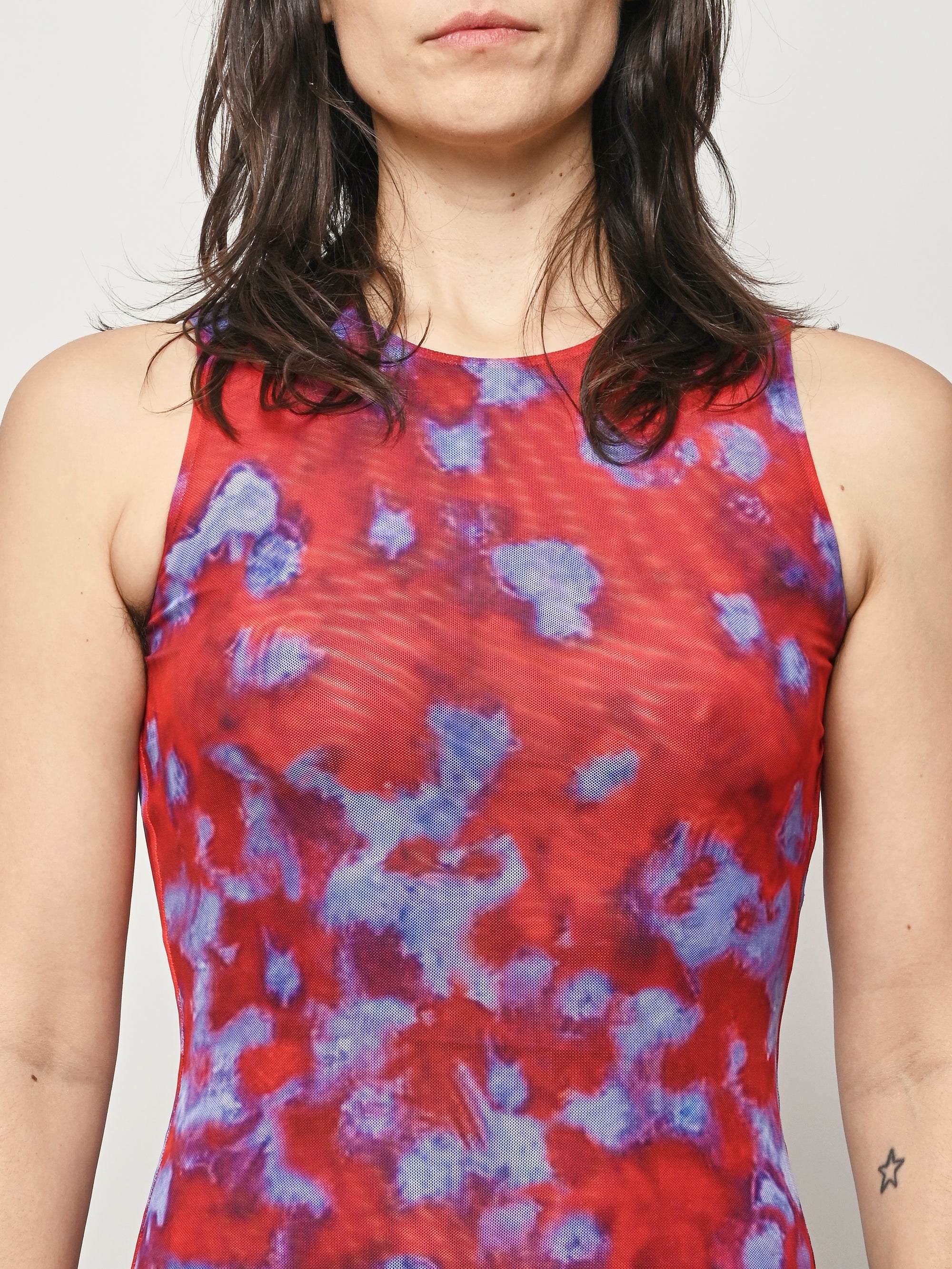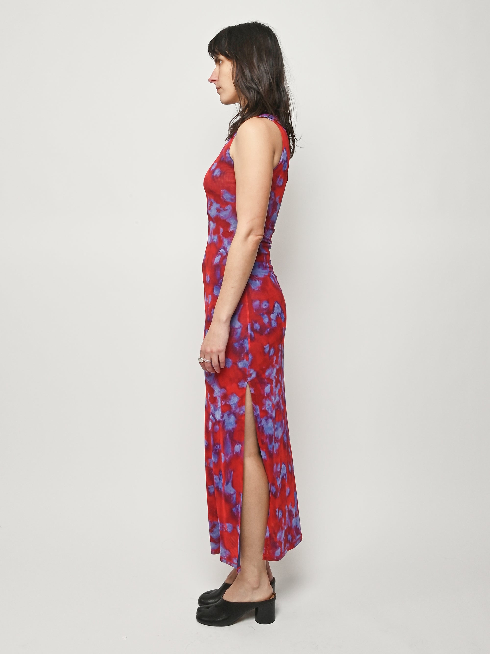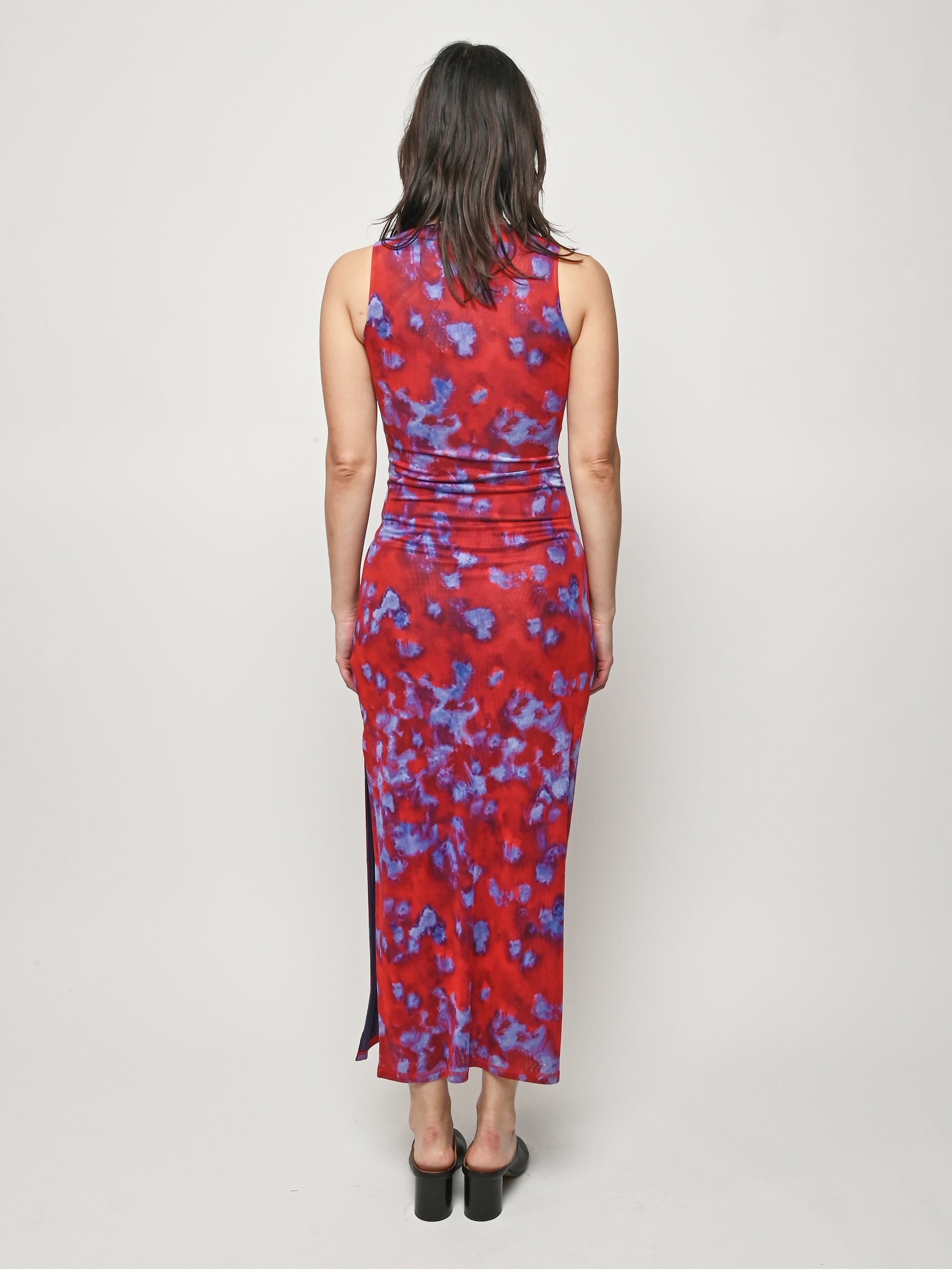 Slim-fit, full-length sleeveless dress by Eckhaus Latta, made in double-layer digitally printed micro mesh, featuring a distinct all-over print on the top layer and a slit at the left side seam.