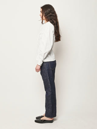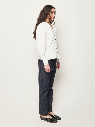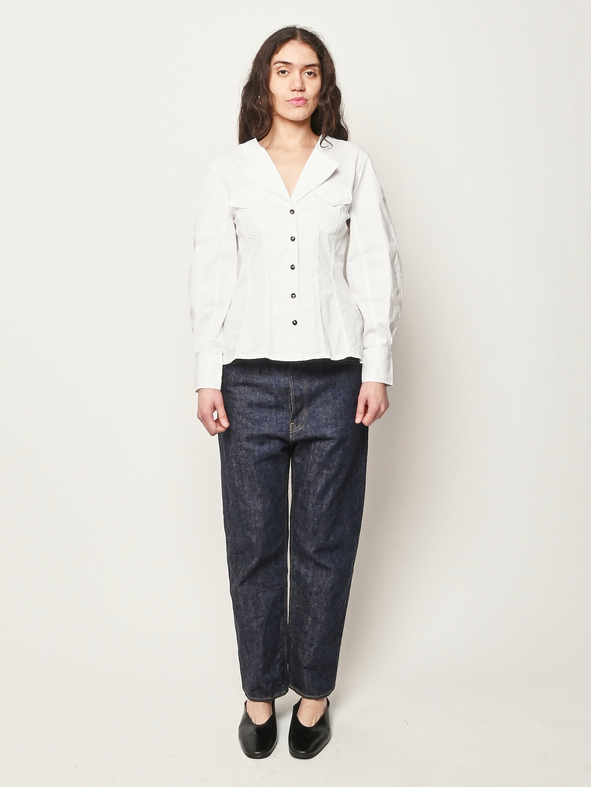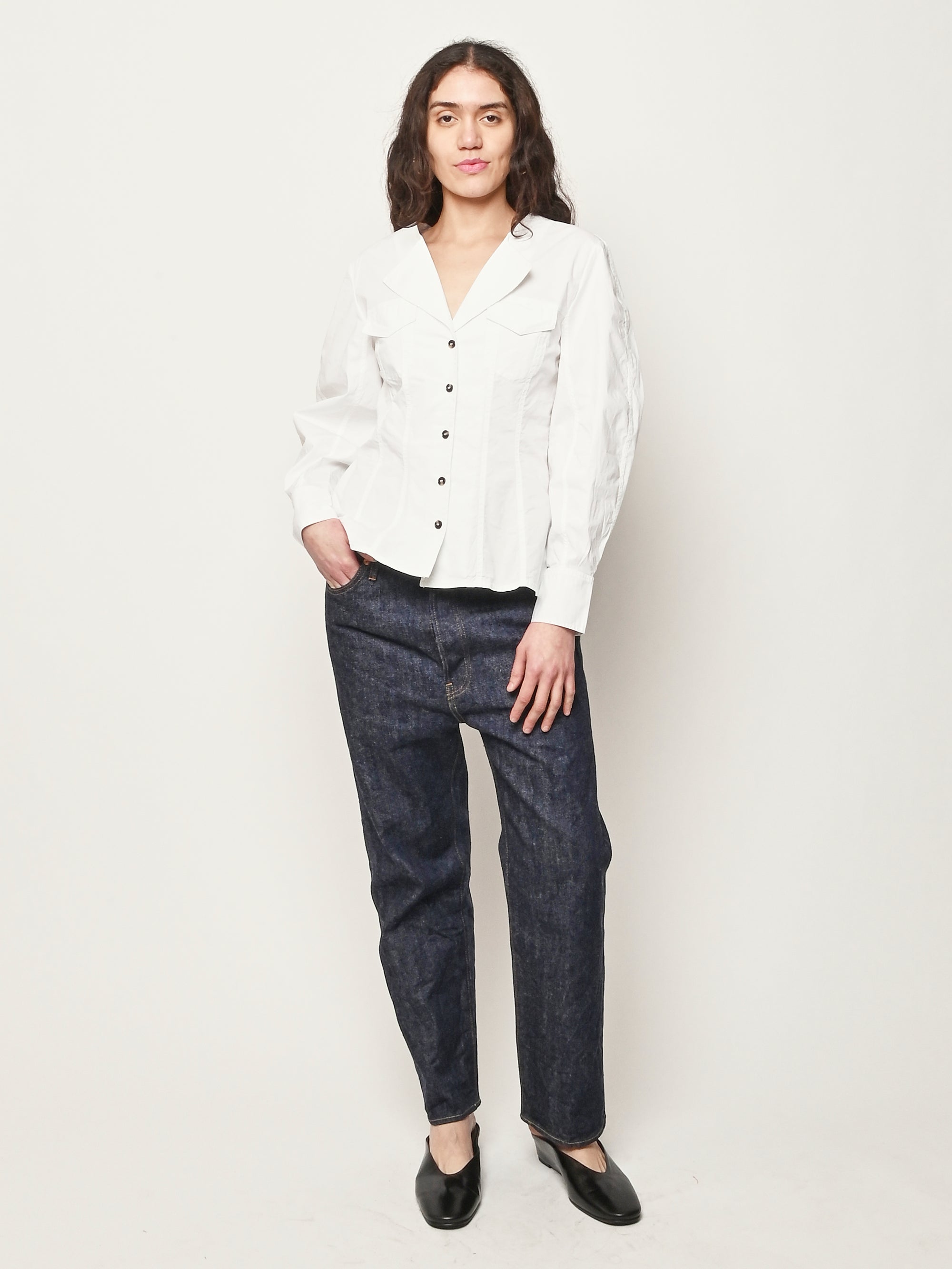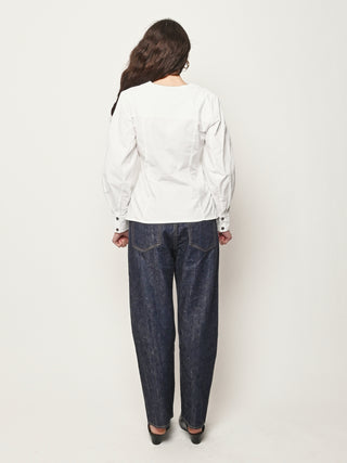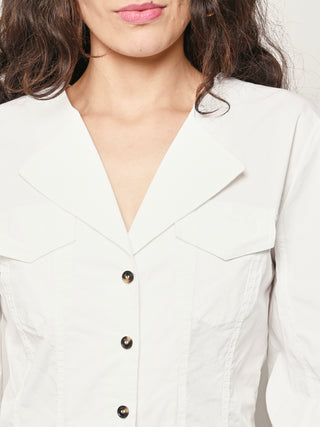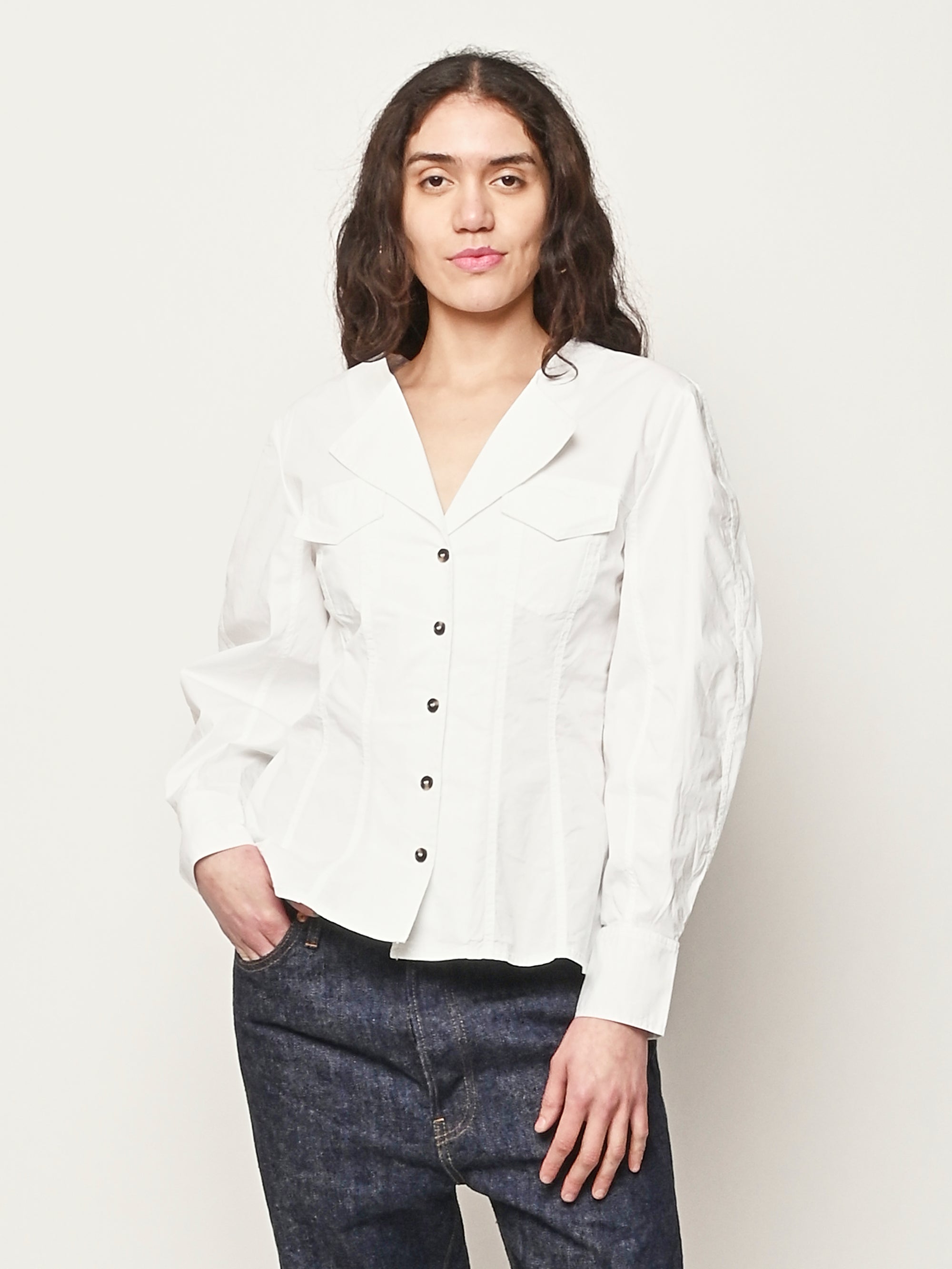 White Ganni top with a fitted waist, an open collar and ballooon sleeves.