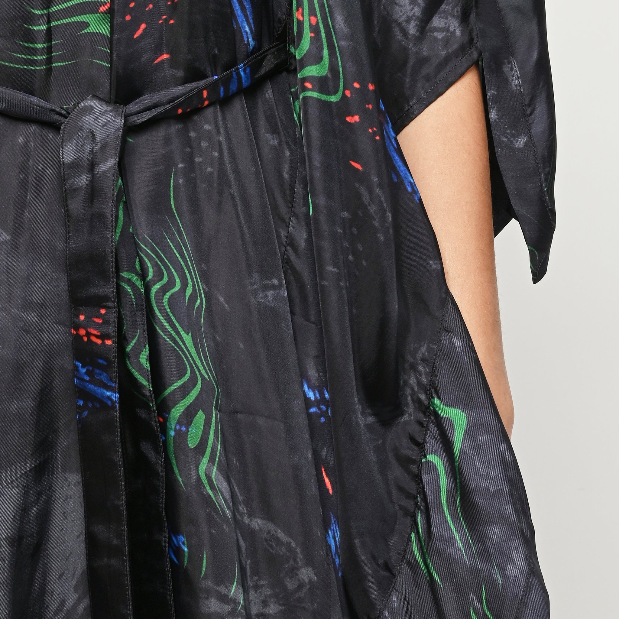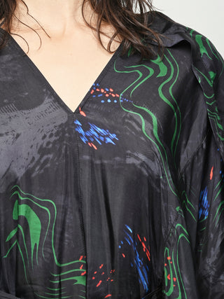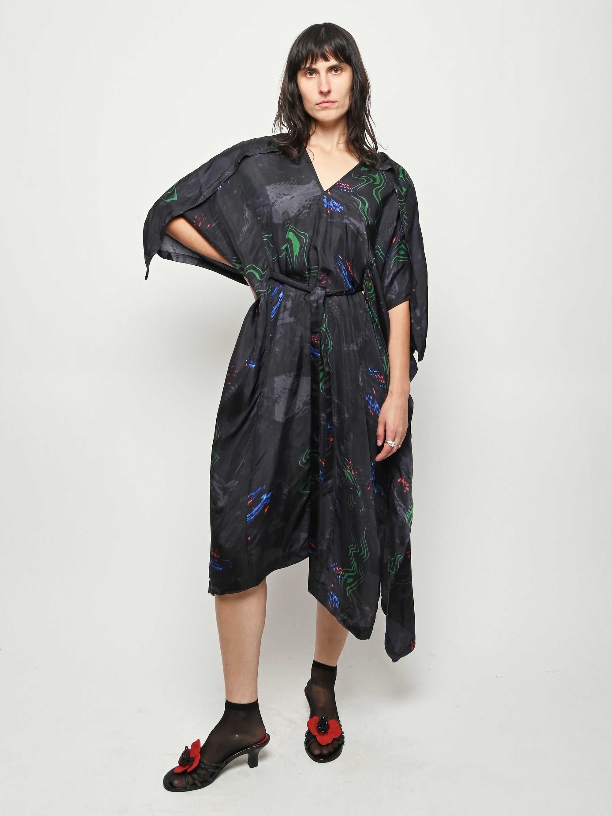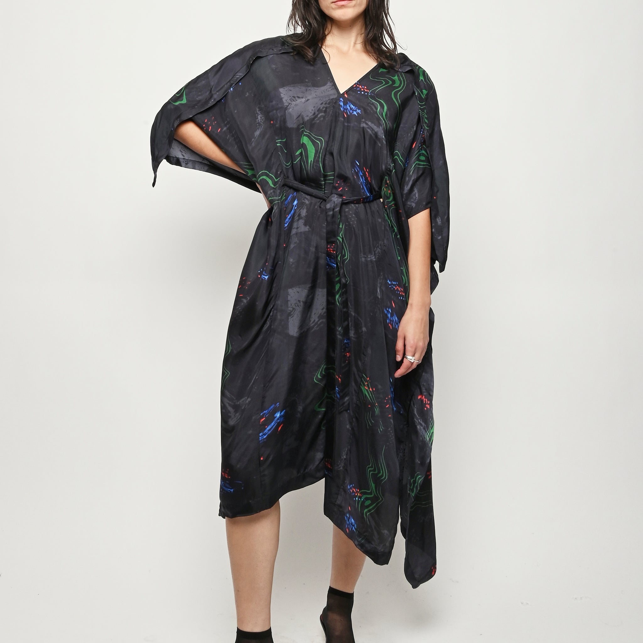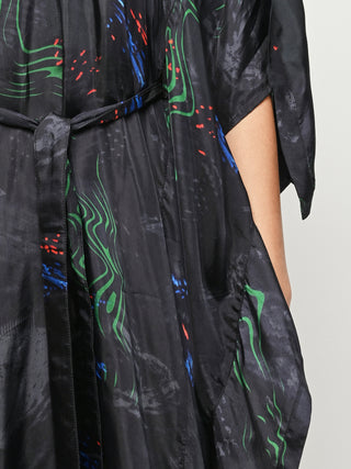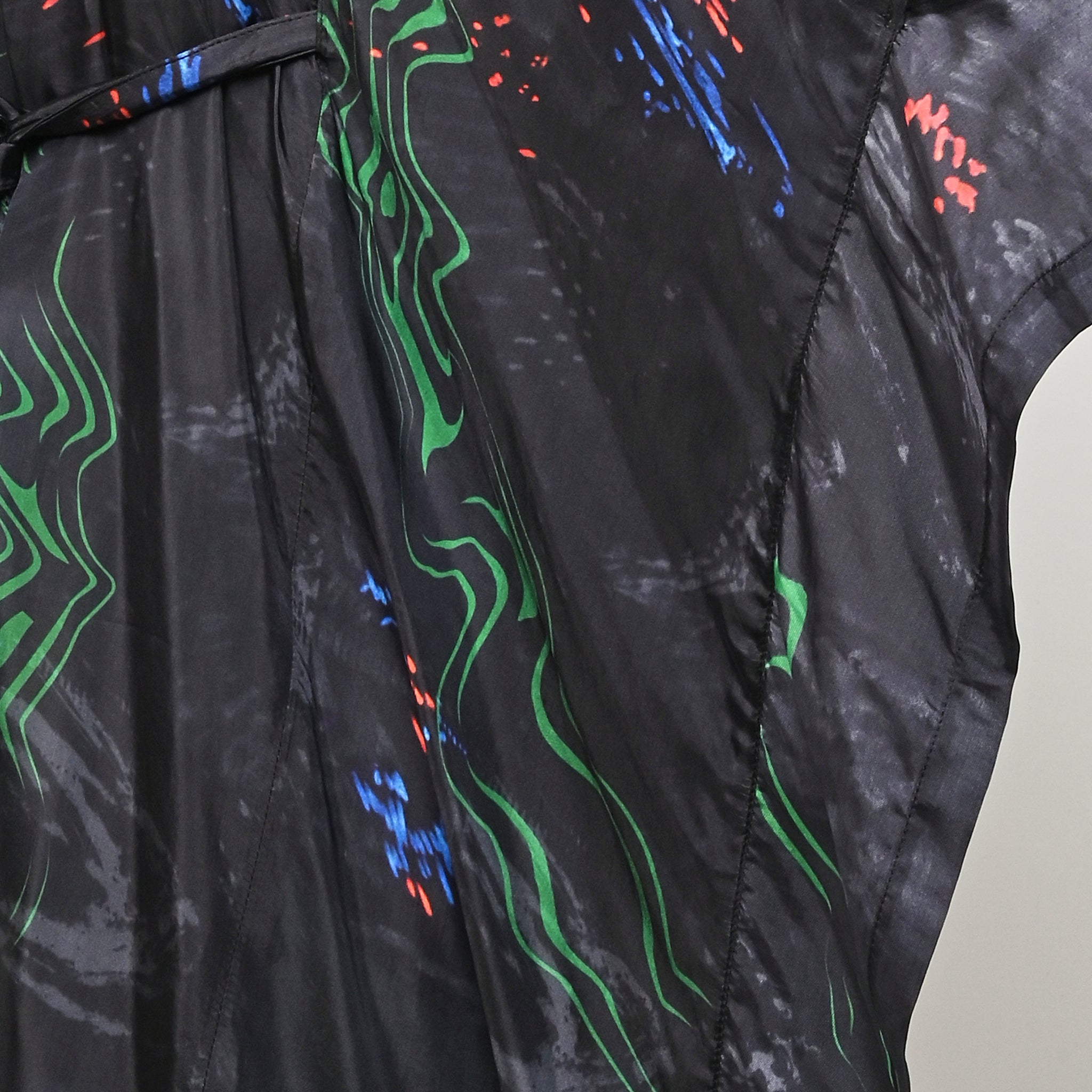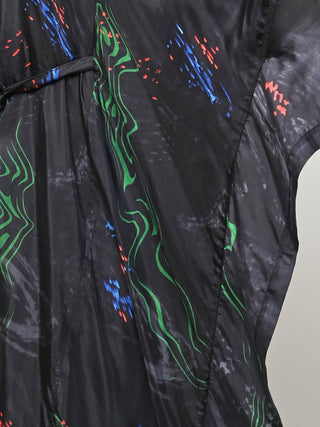 Henrik Vibskov's Uncut Kaftan is a loose v-neck style featuring short sleeves, a multicolor firework pattern, and an adjustable tie around waist.