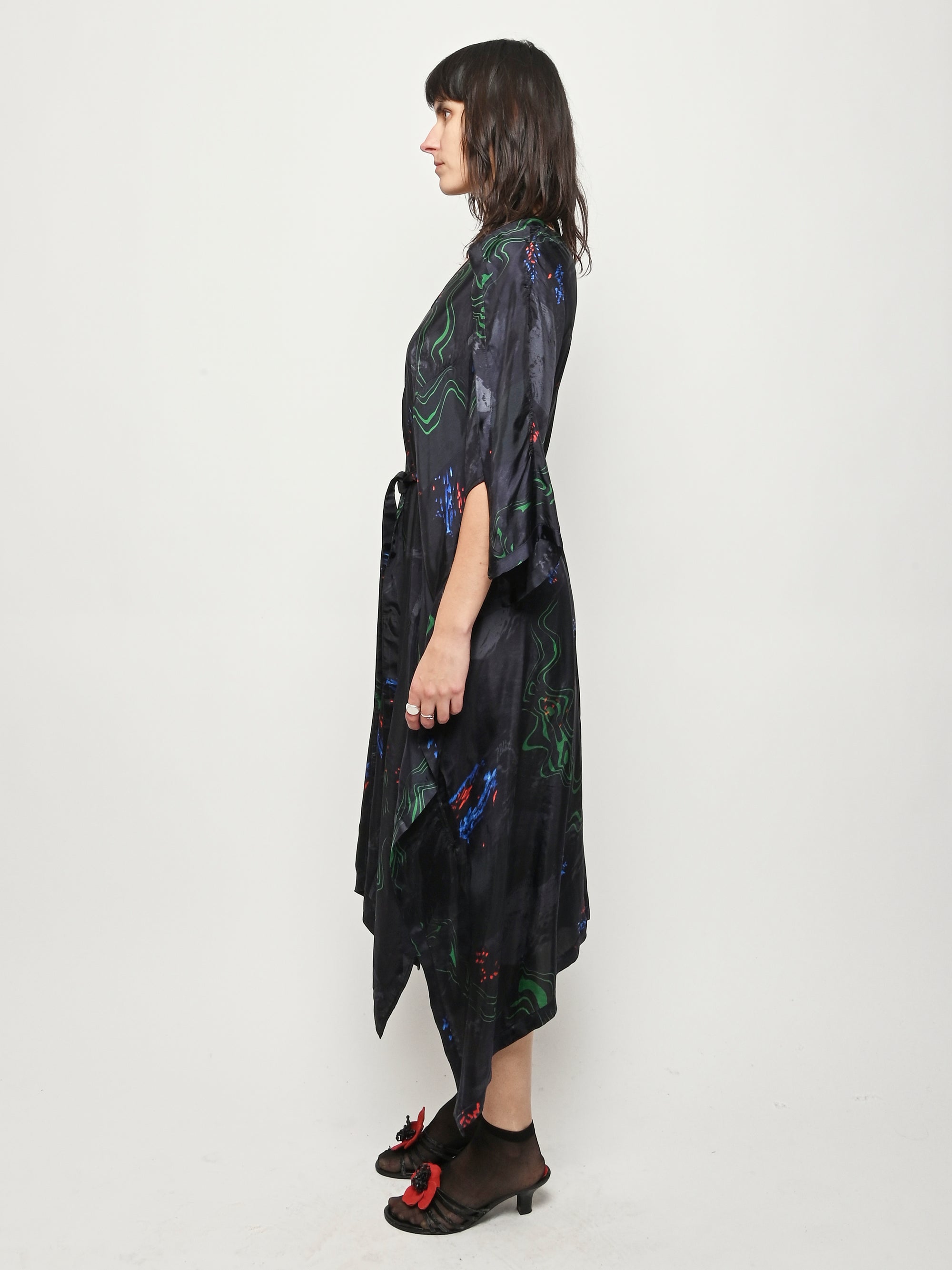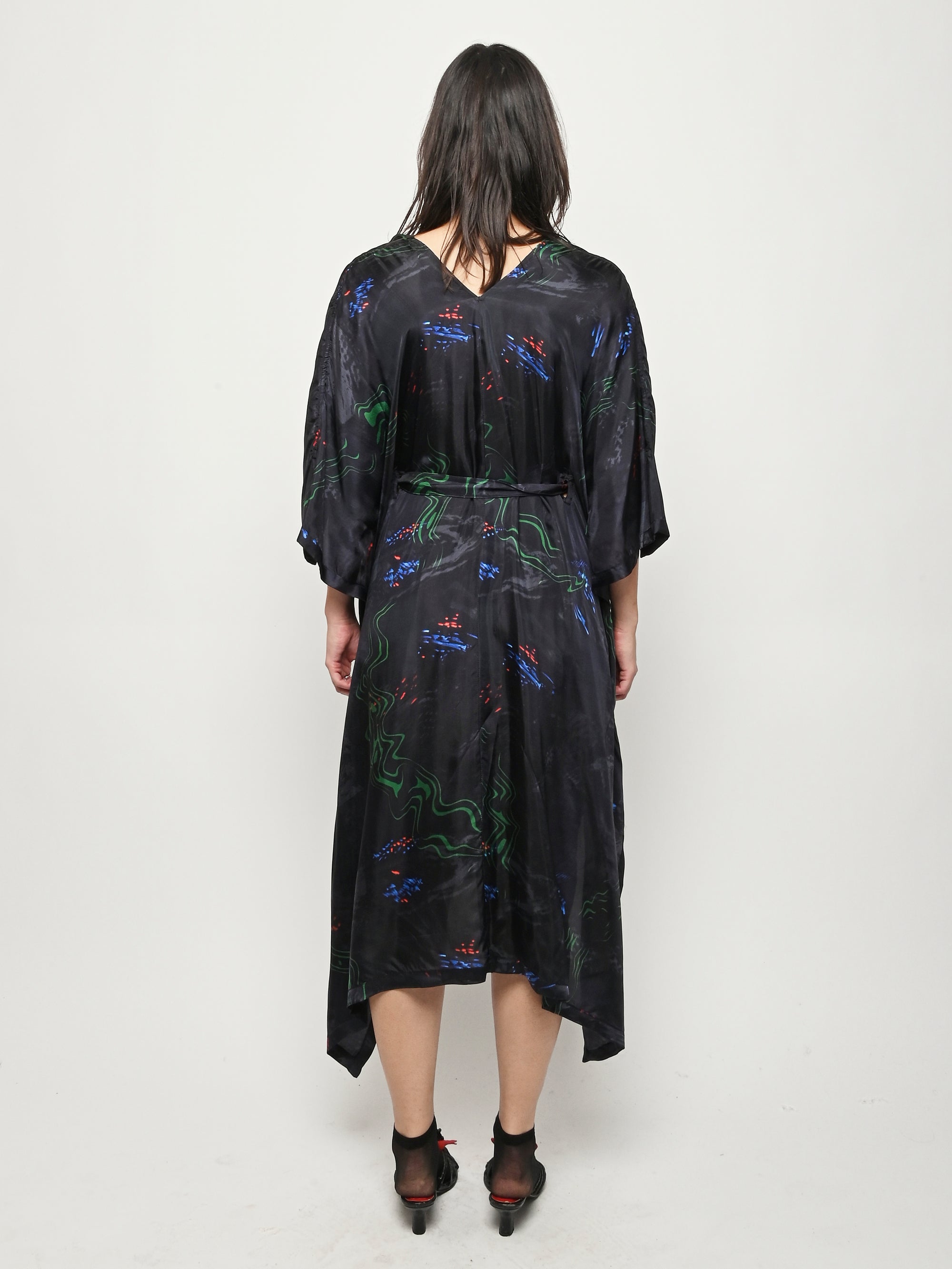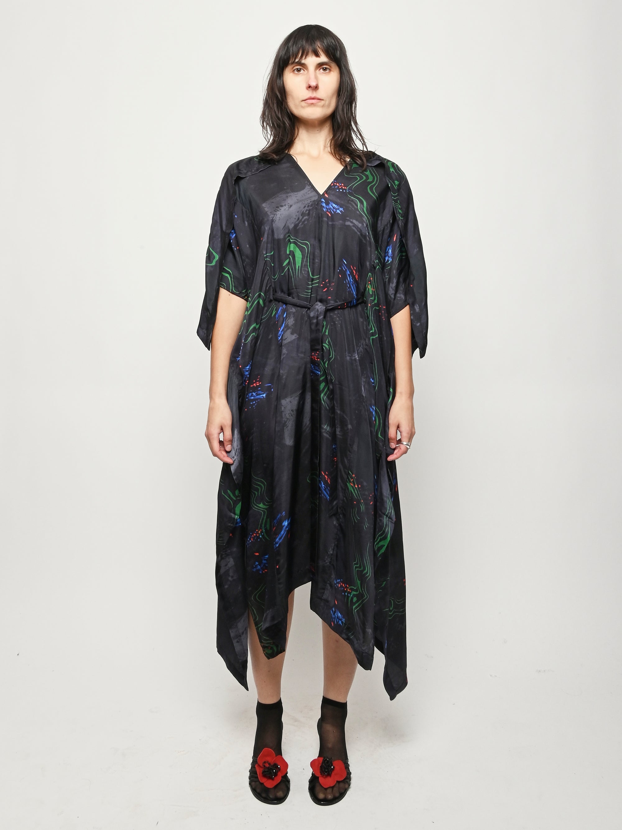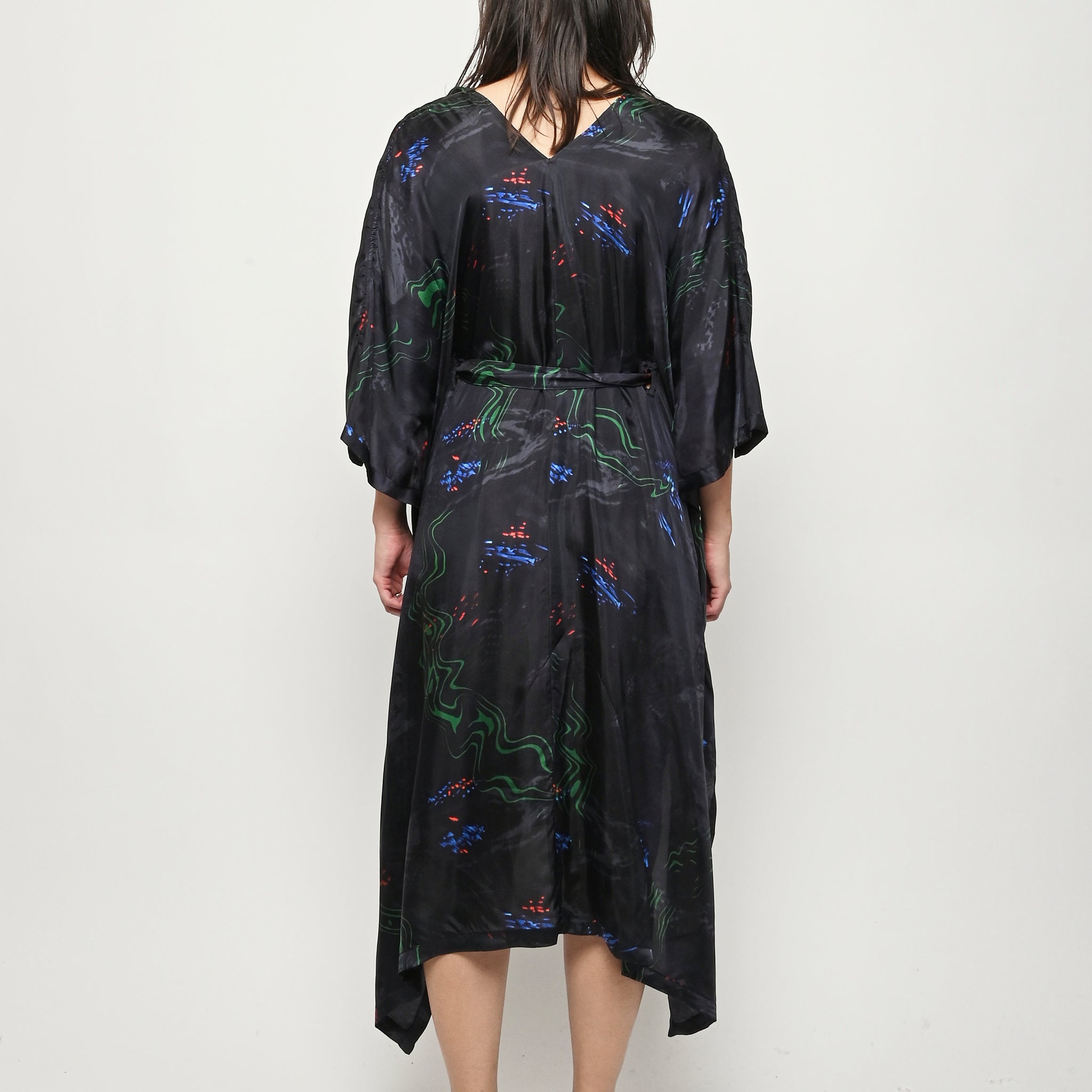 Henrik Vibskov's Uncut Kaftan is a loose v-neck style featuring short sleeves, a multicolor firework pattern, and an adjustable tie around waist.